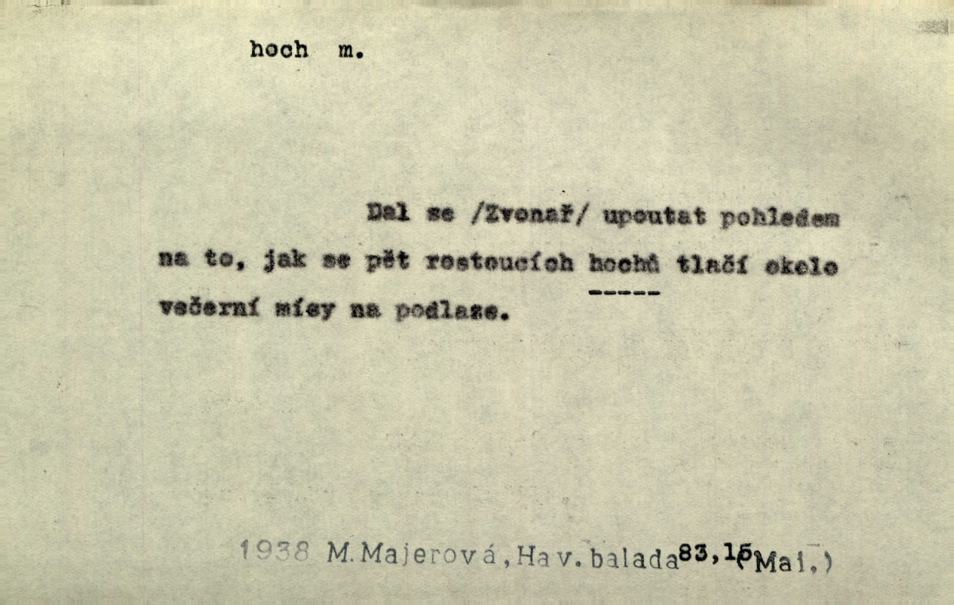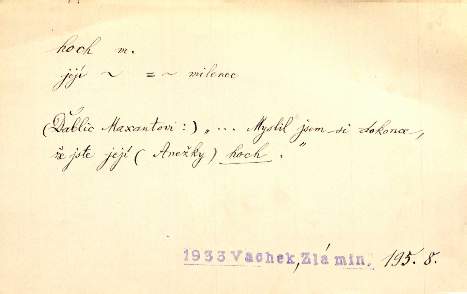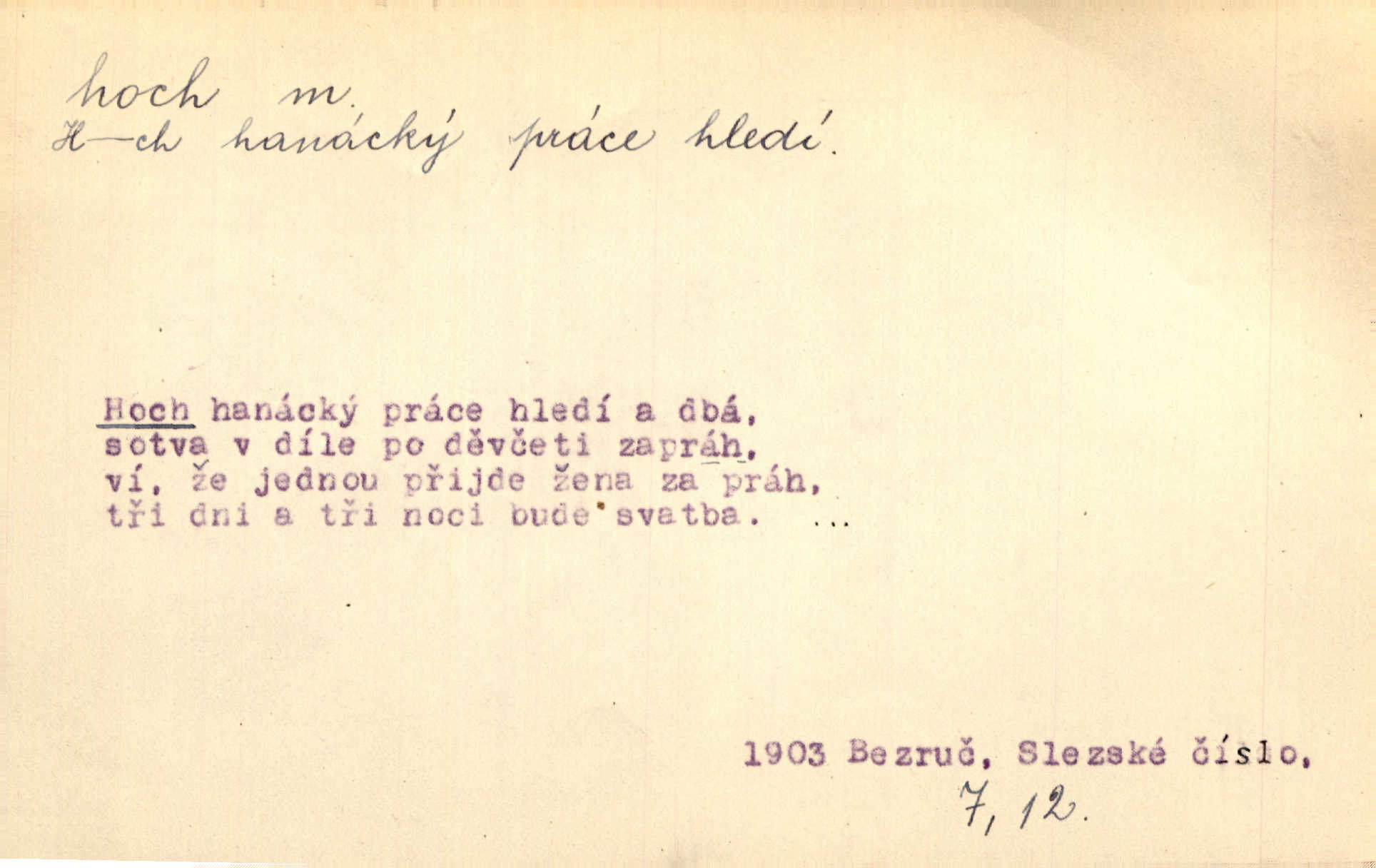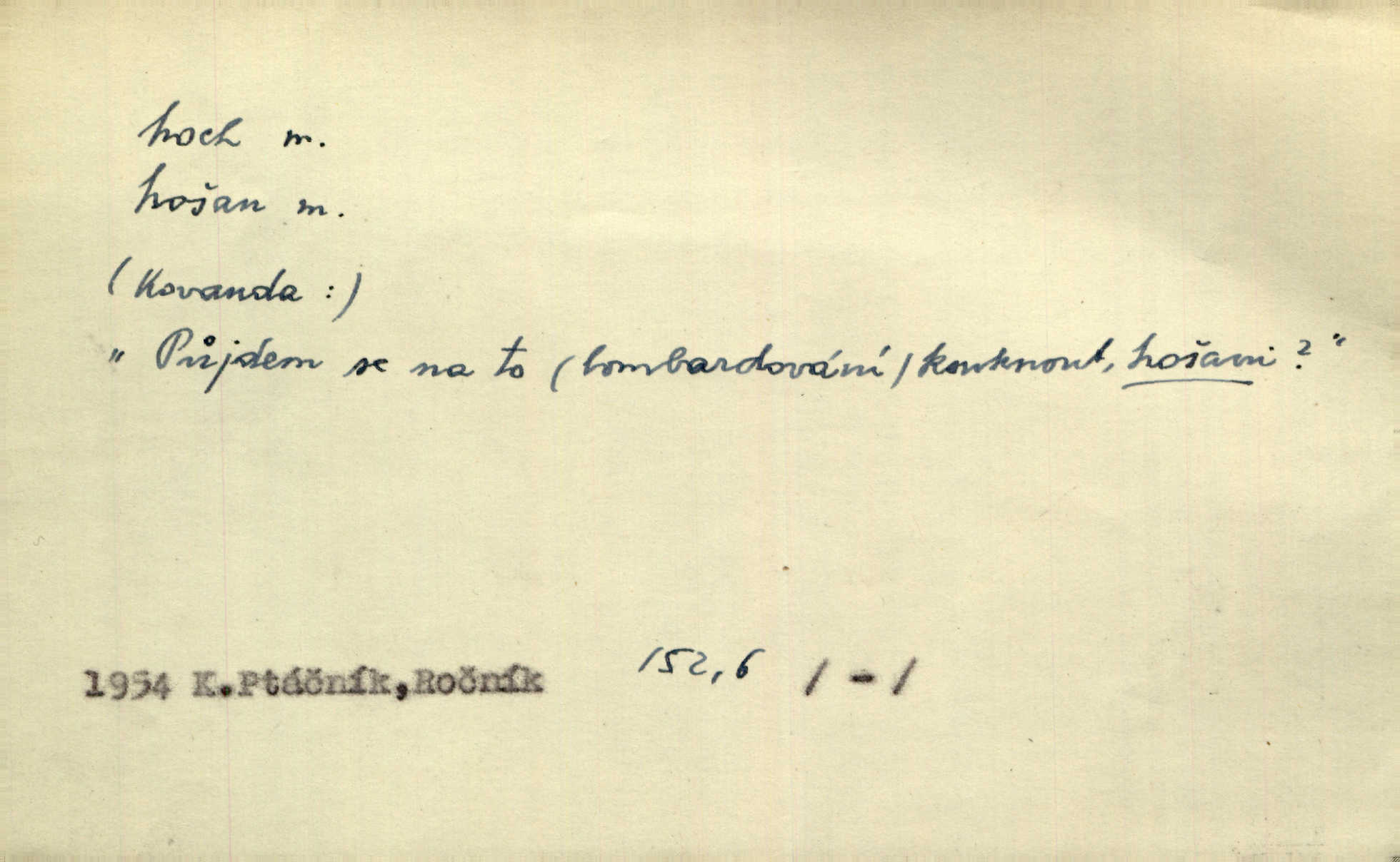 - hoch, -a m. nedospělý člověk mužského pohlaví, chlapec. V levém [šiku]‚ hledíc ode dveří, sedala [ve škole] děvčata, v pravém hoši. Jir. D důvěrně pojmenování n. oslovení milých osob mužských. Ten hoch není ani po nebožtíkovi, ani po mně syn. Jir. [Tchyně o zeti:] Ten můj hoch tuze rád spí. Něm. Stařenka povídala [manželovi]: „Stárnu, hochu.“ Rais. „Hoši, císař bude míti radost,“ zvolal vůdce [k vojákům]. Kou. [Farář ke kantorovi:] Mám ti starost, hochu. Jir. D milenec. „Nech, můj hochu, těch svých písní!“ ondy milá pošeptala. Slád. Holka bez hocha, ryba bez vody. Pořek. D ostrý hoch veselý chlapík, kumpán. U professorův platil Josef za kvítko z čertovy zahrádky, u lidí lehkovážných za ostrého hocha. Šmil. Nejsou zde ostří hoši, kteří jindy mžikem vytáčejí máz nebo dva. Lum. Jizba byla plna hochů z mokré čtvrti pijáků, mazavků. Jir.