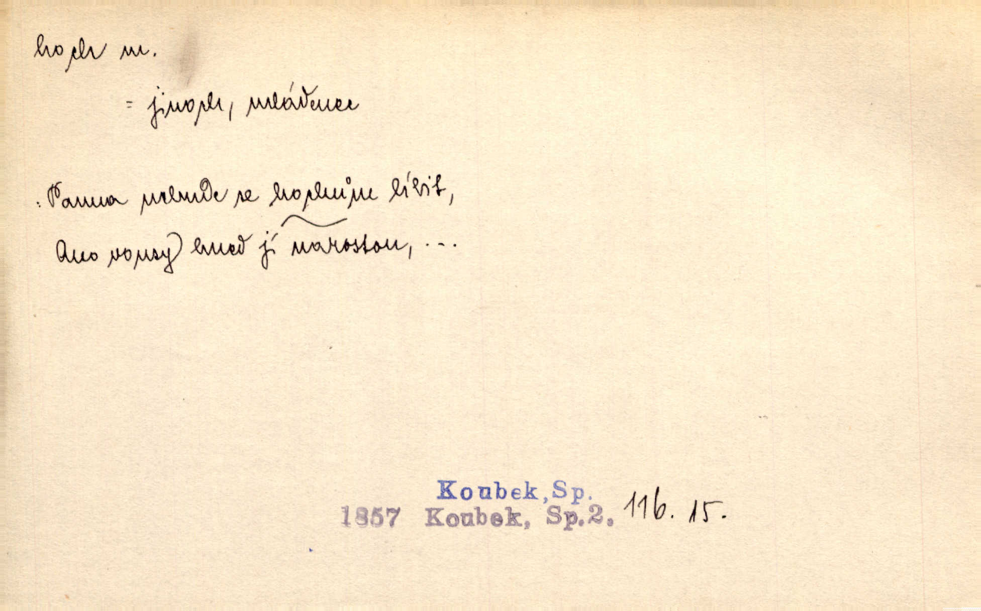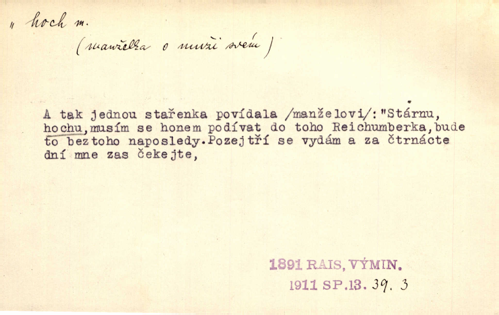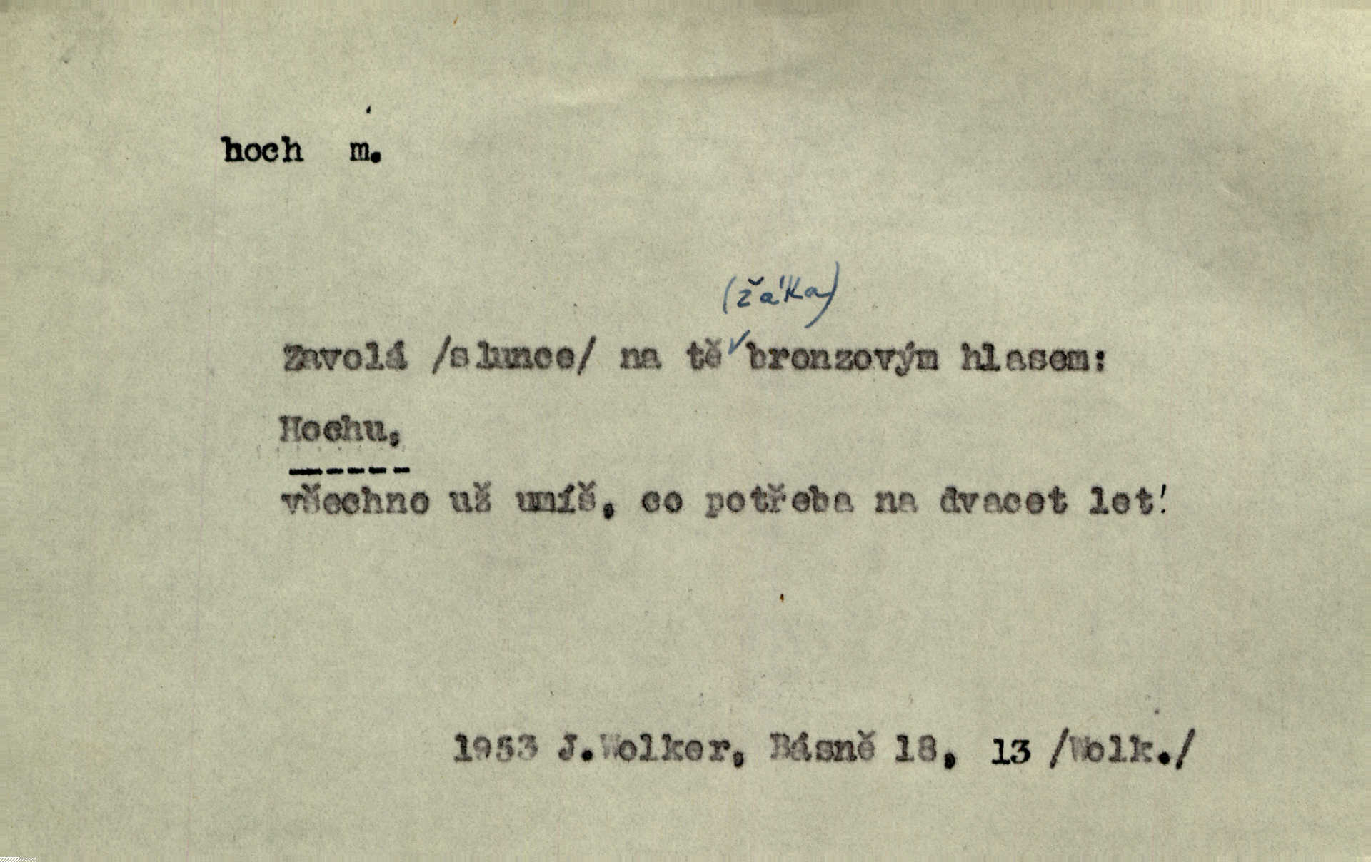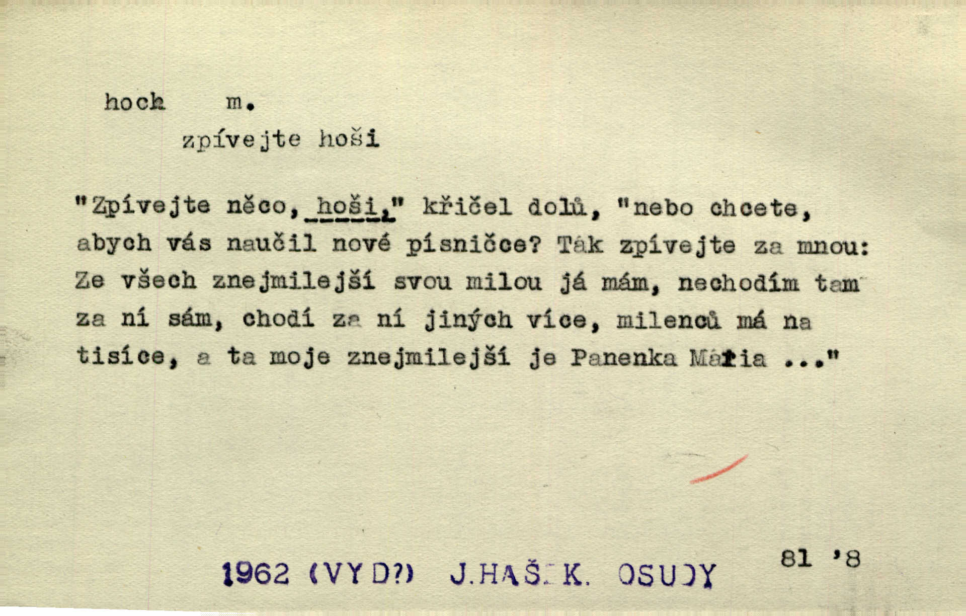 - hoch, -a m. nedospělý člověk mužského pohlaví, chlapec. V levém [šiku]‚ hledíc ode dveří, sedala [ve škole] děvčata, v pravém hoši. Jir. D důvěrně pojmenování n. oslovení milých osob mužských. Ten hoch není ani po nebožtíkovi, ani po mně syn. Jir. [Tchyně o zeti:] Ten můj hoch tuze rád spí. Něm. Stařenka povídala [manželovi]: „Stárnu, hochu.“ Rais. „Hoši, císař bude míti radost,“ zvolal vůdce [k vojákům]. Kou. [Farář ke kantorovi:] Mám ti starost, hochu. Jir. D milenec. „Nech, můj hochu, těch svých písní!“ ondy milá pošeptala. Slád. Holka bez hocha, ryba bez vody. Pořek. D ostrý hoch veselý chlapík, kumpán. U professorův platil Josef za kvítko z čertovy zahrádky, u lidí lehkovážných za ostrého hocha. Šmil. Nejsou zde ostří hoši, kteří jindy mžikem vytáčejí máz nebo dva. Lum. Jizba byla plna hochů z mokré čtvrti pijáků, mazavků. Jir.