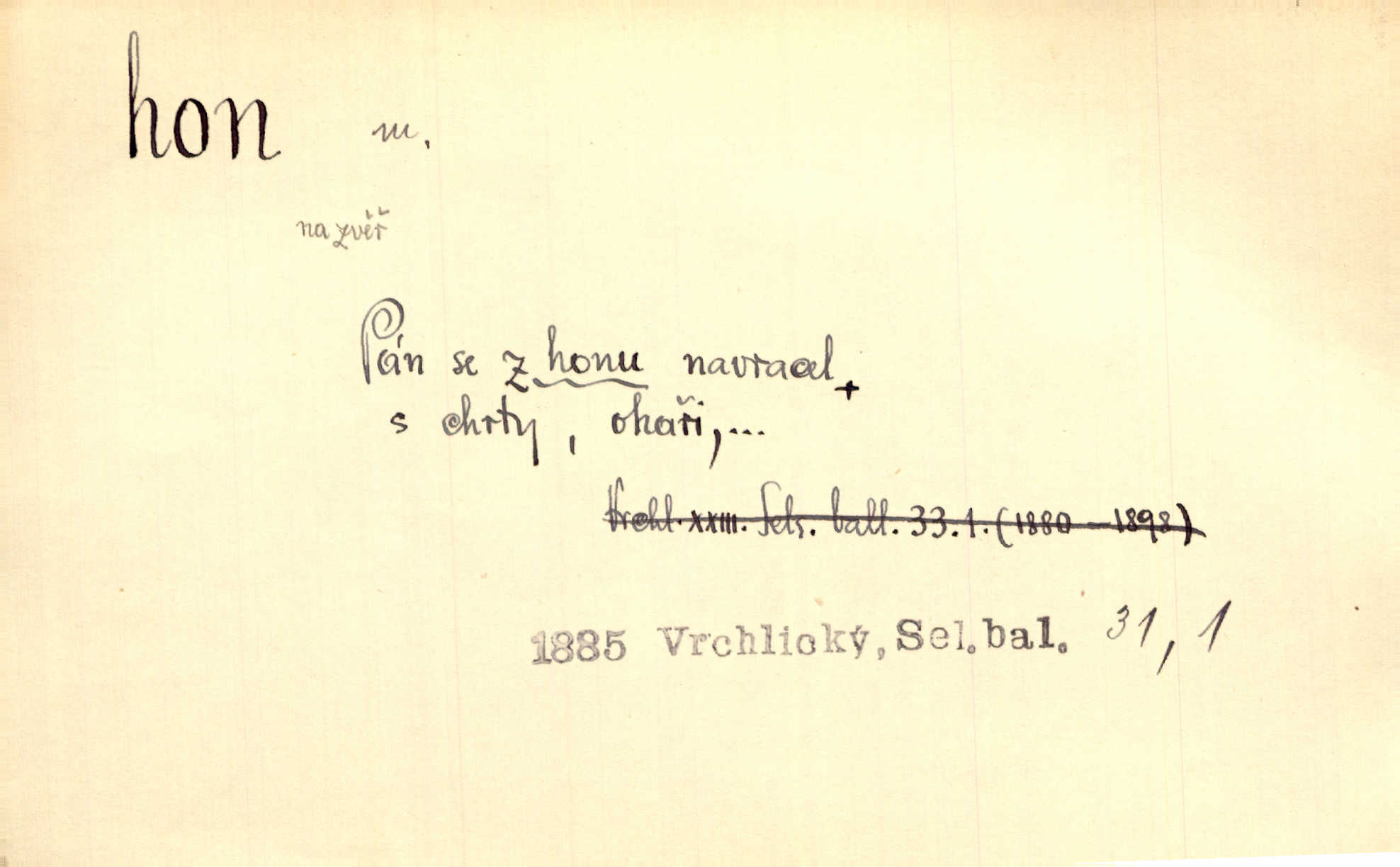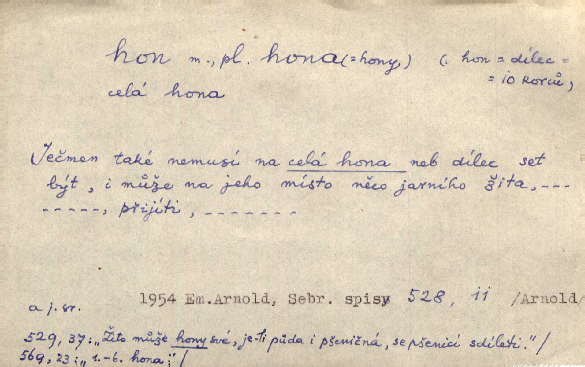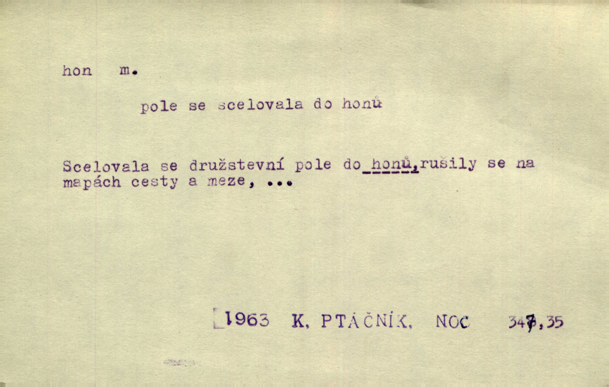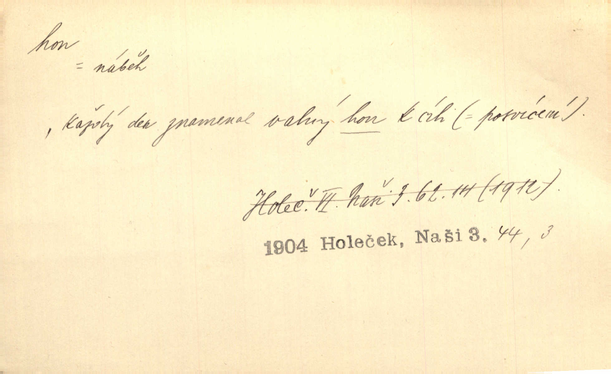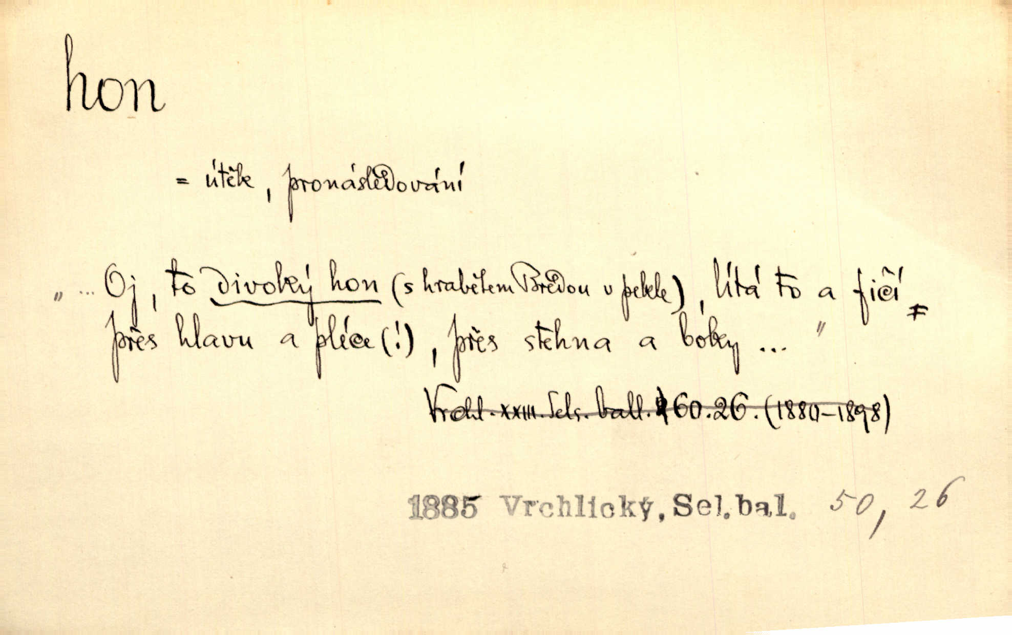 - hon, -u m. běh, úprk. Na Vítkově hoře divoký hon. Žižkova posádka vyrazila na Mišňany. Jir. Psi leželi u nohou babiččiných, a jako by po divém honu bývali, rychle oddychovali. Něm. Snad čas, jenž honem kvapným kol se žene, se zastaví. Vrch. D shon, chvat, ruch. Vichr v divém honu rve v cáry fantastické mračen clonu. Čech. Škoda, že jsi se [na besedu] nevybral v neděli, všední den je u nás hon. Rais. Byli by zůstali v honu a ruchu světa na podřízených místech úředníčků. Vrba. Arch. Pracovali [cihláři] chvatně jako do honu překotně. Vlč. Krejčí, ševci šili co do honu jako o závod. Ehrenb. Held v honu svého povolání nevzpomínal. Jir. D překotné úsilí, sháňka. Když pomněl na nekonečný ten hon za kariérou, na věčné to soupeření a předstihování, klesala pod ním kolena. Herrm. Ráno počal hon po penězích zas na novo. Do cukrovaru běhal pro zálohu na řepu, vymetal záložny. A. Mrš. D lovení zvěře, lov. Na ten den byl ustanoven hon v habrůvských polích. A. Mrš. Dvůr hučíval veselím, jakmile se sjelo okolní zemanstvo na hony. Jir. Hon na koroptve. D stará délková míra 125 kroků. Také vzdálenost udávali naši staří předkové na hony. Pek. Země se rozsedla na tři hony. Erb. Větší [hoši] už na kolik honů vyběhli po silnici poutníkům vstříc. A. Mrš. Lešetínské zvony slyšet valné hony. Čech. Kde se měla setkat s nějakou živou duší, na deset honů se vyhnula zdaleka. Nor. Vyhněme se na sto honů násilí co nejdále. Dyk. Její [pěvkyně] přednes byl na hony vzdálen toho naříkavého, slabošského tónu velice, daleko. Smet. D hon, -u m., zvl. pomn. hony (hona), -ů m. díl, kus n. skupina pozemků. Vyhnal brázdu tam a zpátky přes celý hon. Rozl. Pozemky byly rozděleny nejprve podle jakosti na t. zv. hony. Dobiáš. Mezi velkými hony vinuly se červenavé pruhy, úhory. Třeb. Pouští dobytek na naše hony. Ehrenb.
