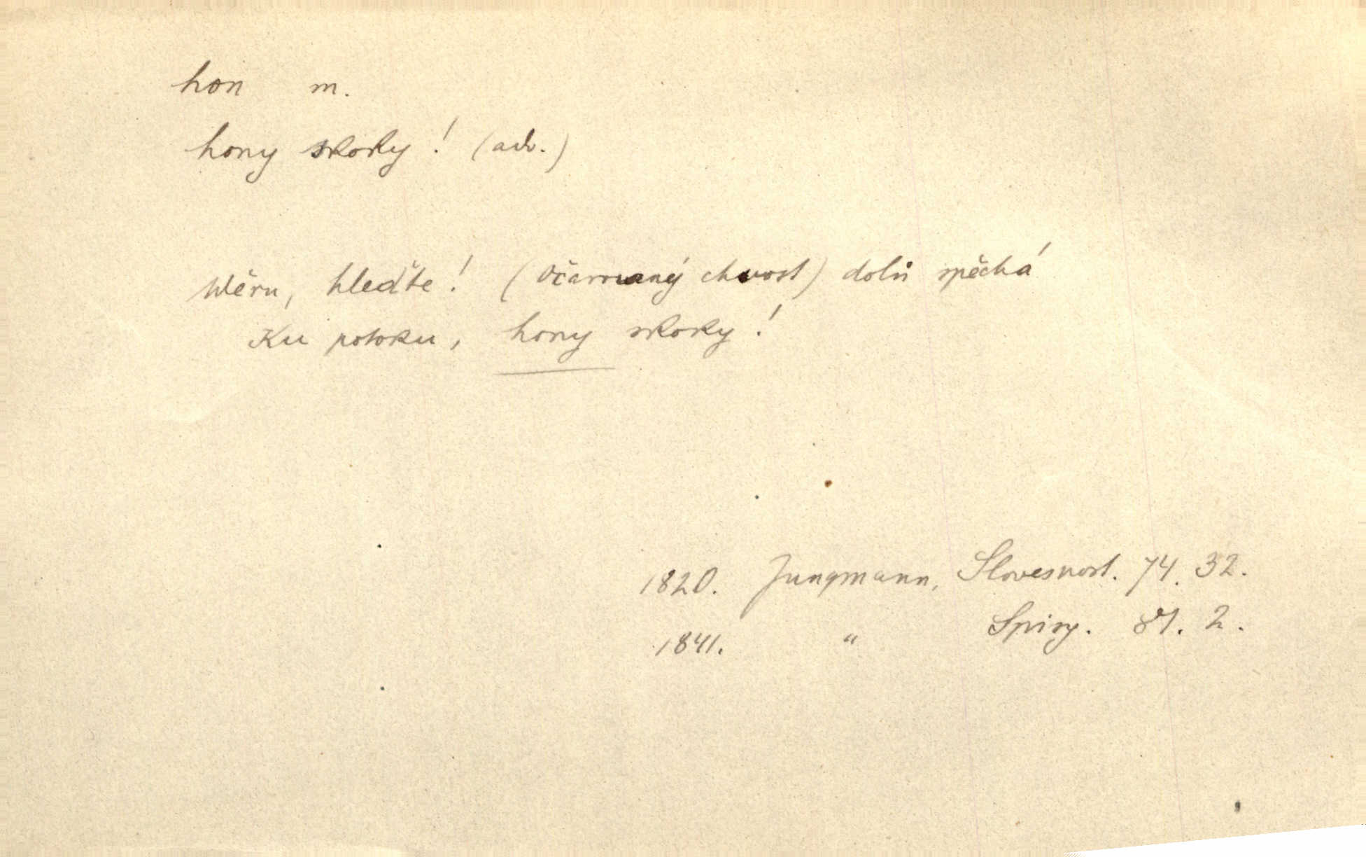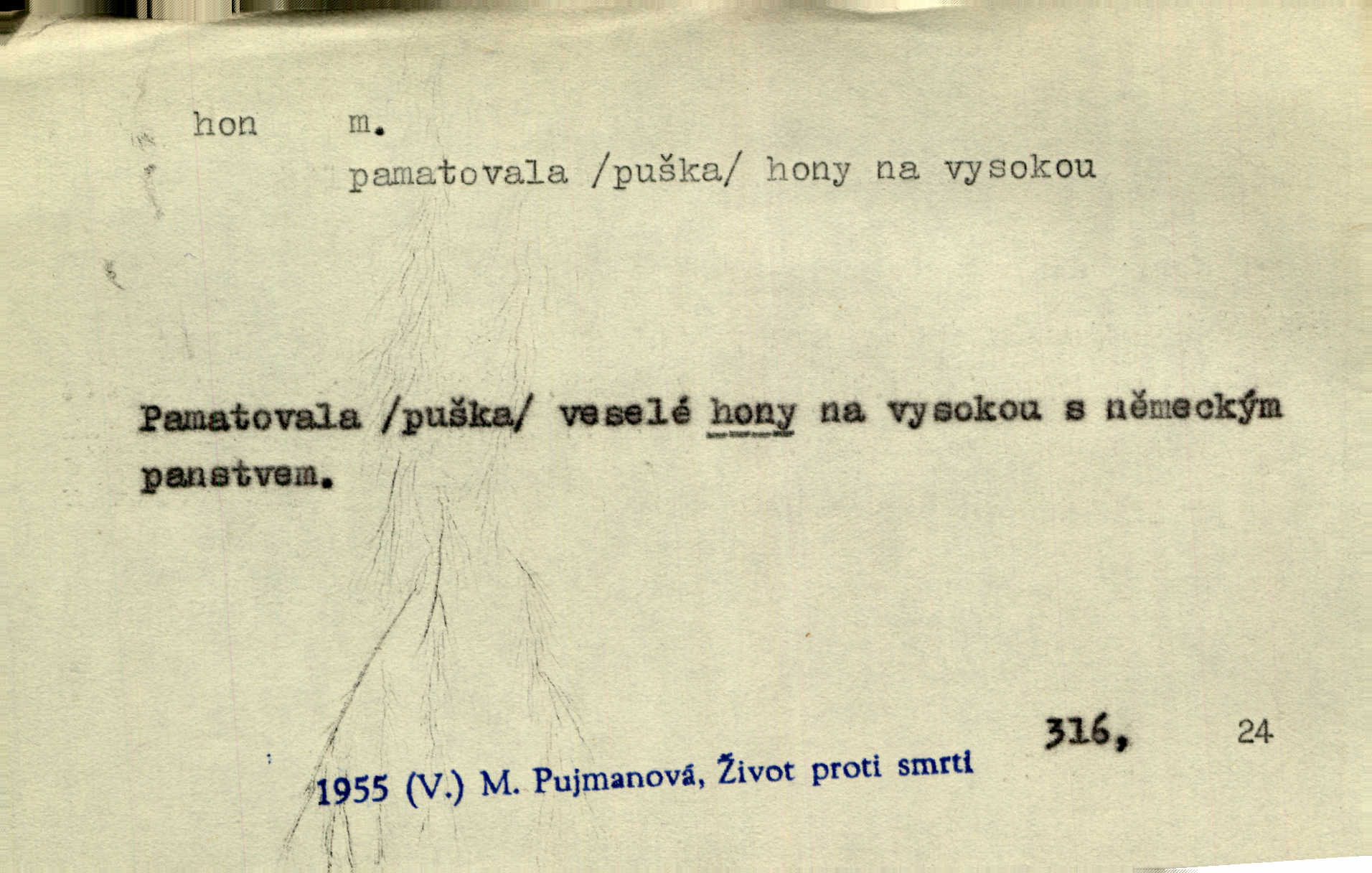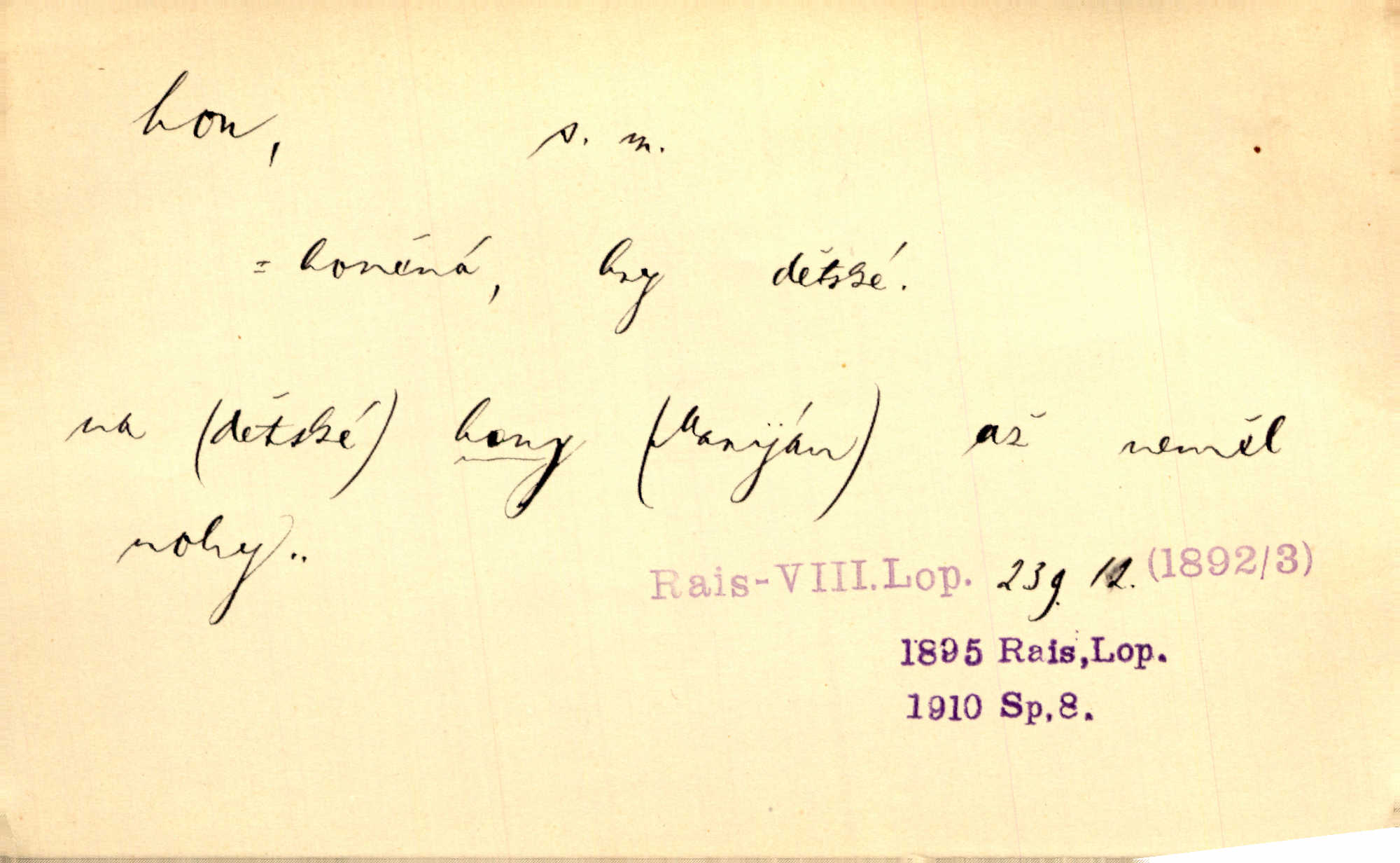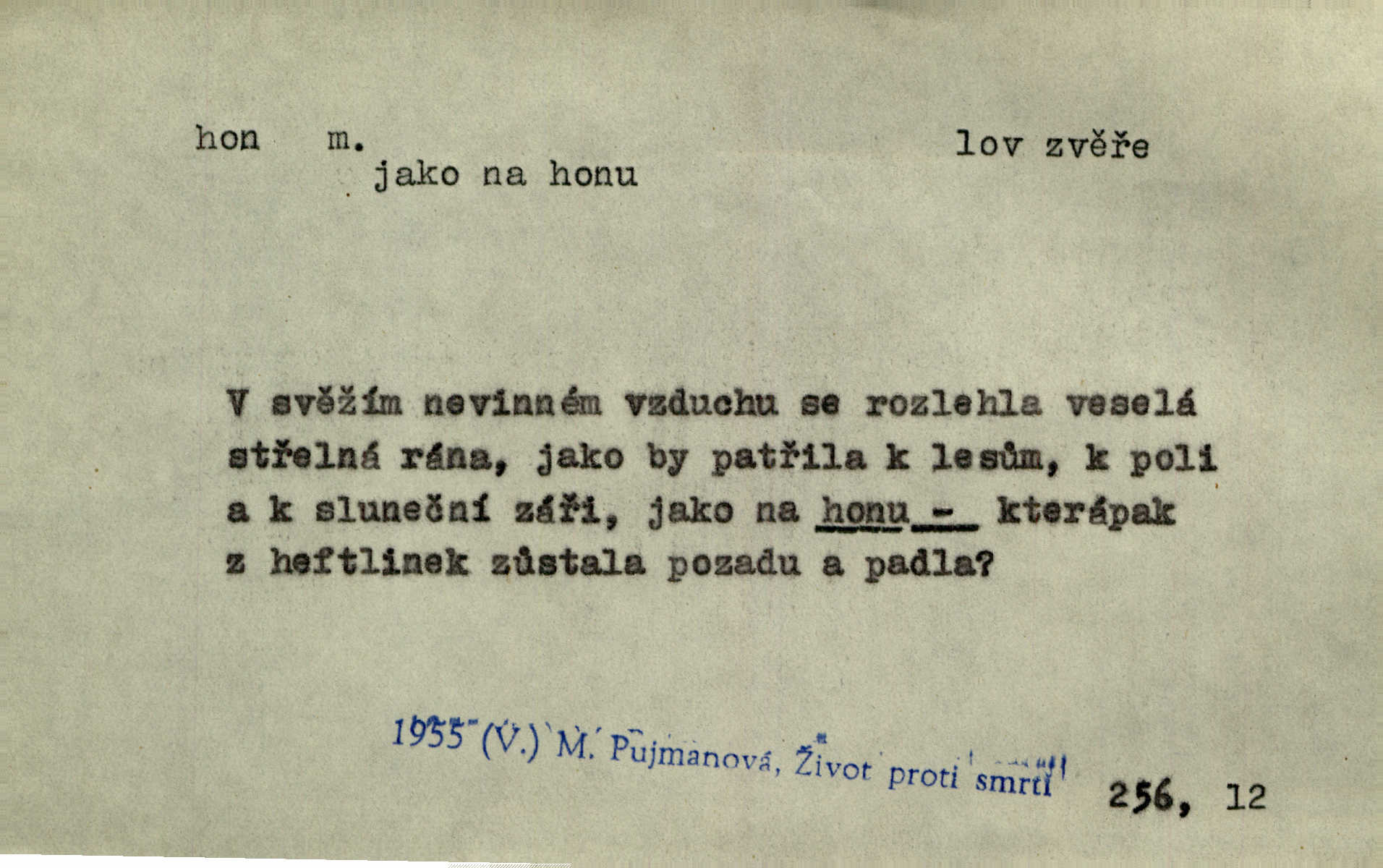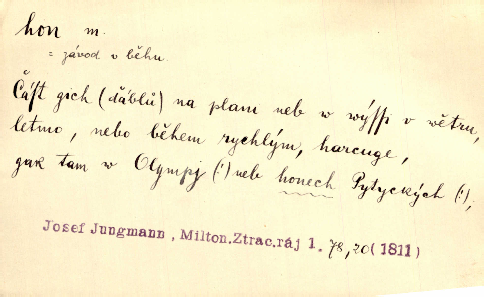 - hon, -u m. běh, úprk. Na Vítkově hoře divoký hon. Žižkova posádka vyrazila na Mišňany. Jir. Psi leželi u nohou babiččiných, a jako by po divém honu bývali, rychle oddychovali. Něm. Snad čas, jenž honem kvapným kol se žene, se zastaví. Vrch. D shon, chvat, ruch. Vichr v divém honu rve v cáry fantastické mračen clonu. Čech. Škoda, že jsi se [na besedu] nevybral v neděli, všední den je u nás hon. Rais. Byli by zůstali v honu a ruchu světa na podřízených místech úředníčků. Vrba. Arch. Pracovali [cihláři] chvatně jako do honu překotně. Vlč. Krejčí, ševci šili co do honu jako o závod. Ehrenb. Held v honu svého povolání nevzpomínal. Jir. D překotné úsilí, sháňka. Když pomněl na nekonečný ten hon za kariérou, na věčné to soupeření a předstihování, klesala pod ním kolena. Herrm. Ráno počal hon po penězích zas na novo. Do cukrovaru běhal pro zálohu na řepu, vymetal záložny. A. Mrš. D lovení zvěře, lov. Na ten den byl ustanoven hon v habrůvských polích. A. Mrš. Dvůr hučíval veselím, jakmile se sjelo okolní zemanstvo na hony. Jir. Hon na koroptve. D stará délková míra 125 kroků. Také vzdálenost udávali naši staří předkové na hony. Pek. Země se rozsedla na tři hony. Erb. Větší [hoši] už na kolik honů vyběhli po silnici poutníkům vstříc. A. Mrš. Lešetínské zvony slyšet valné hony. Čech. Kde se měla setkat s nějakou živou duší, na deset honů se vyhnula zdaleka. Nor. Vyhněme se na sto honů násilí co nejdále. Dyk. Její [pěvkyně] přednes byl na hony vzdálen toho naříkavého, slabošského tónu velice, daleko. Smet. D hon, -u m., zvl. pomn. hony (hona), -ů m. díl, kus n. skupina pozemků. Vyhnal brázdu tam a zpátky přes celý hon. Rozl. Pozemky byly rozděleny nejprve podle jakosti na t. zv. hony. Dobiáš. Mezi velkými hony vinuly se červenavé pruhy, úhory. Třeb. Pouští dobytek na naše hony. Ehrenb.