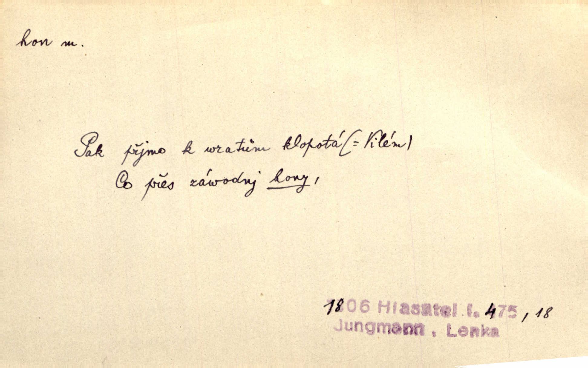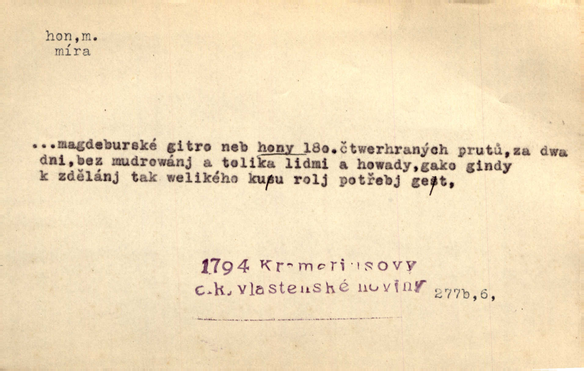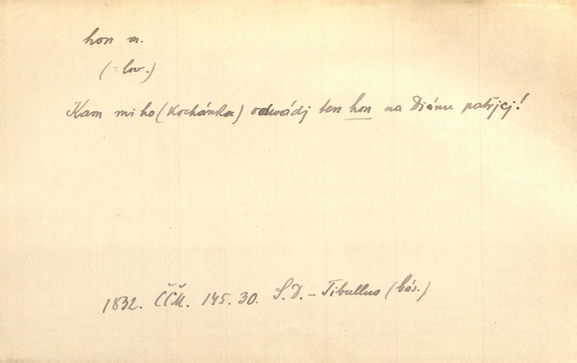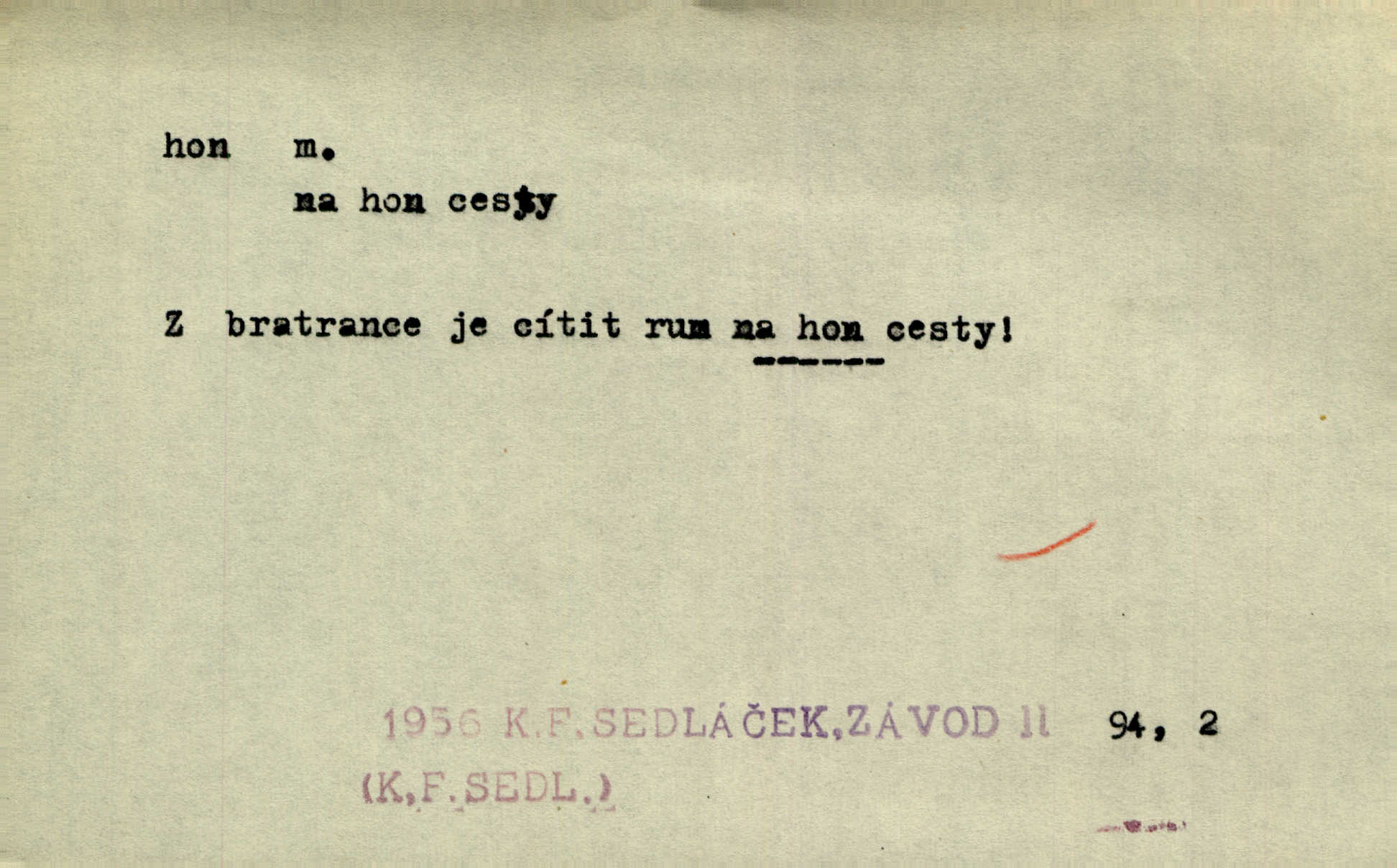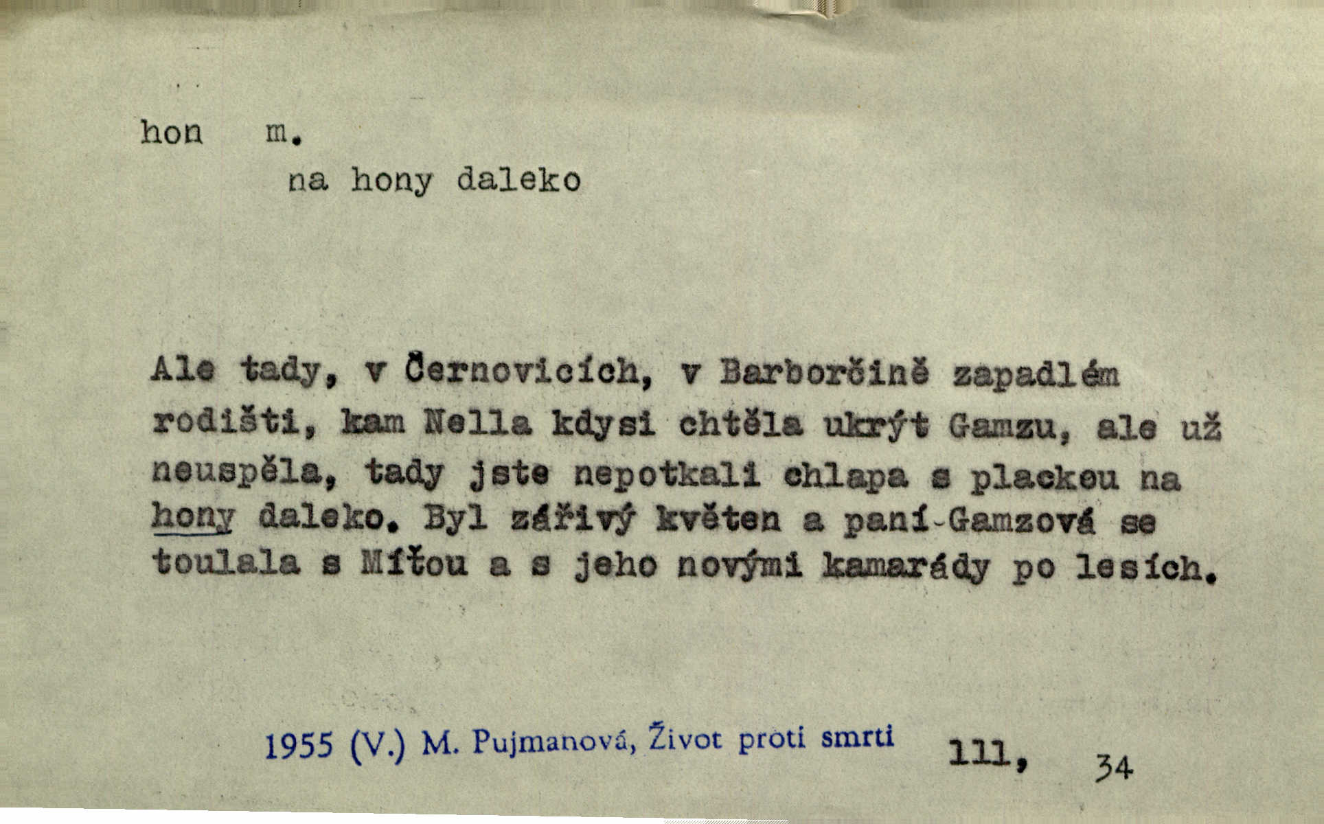 - hon, -u m. běh, úprk. Na Vítkově hoře divoký hon. Žižkova posádka vyrazila na Mišňany. Jir. Psi leželi u nohou babiččiných, a jako by po divém honu bývali, rychle oddychovali. Něm. Snad čas, jenž honem kvapným kol se žene, se zastaví. Vrch. D shon, chvat, ruch. Vichr v divém honu rve v cáry fantastické mračen clonu. Čech. Škoda, že jsi se [na besedu] nevybral v neděli, všední den je u nás hon. Rais. Byli by zůstali v honu a ruchu světa na podřízených místech úředníčků. Vrba. Arch. Pracovali [cihláři] chvatně jako do honu překotně. Vlč. Krejčí, ševci šili co do honu jako o závod. Ehrenb. Held v honu svého povolání nevzpomínal. Jir. D překotné úsilí, sháňka. Když pomněl na nekonečný ten hon za kariérou, na věčné to soupeření a předstihování, klesala pod ním kolena. Herrm. Ráno počal hon po penězích zas na novo. Do cukrovaru běhal pro zálohu na řepu, vymetal záložny. A. Mrš. D lovení zvěře, lov. Na ten den byl ustanoven hon v habrůvských polích. A. Mrš. Dvůr hučíval veselím, jakmile se sjelo okolní zemanstvo na hony. Jir. Hon na koroptve. D stará délková míra 125 kroků. Také vzdálenost udávali naši staří předkové na hony. Pek. Země se rozsedla na tři hony. Erb. Větší [hoši] už na kolik honů vyběhli po silnici poutníkům vstříc. A. Mrš. Lešetínské zvony slyšet valné hony. Čech. Kde se měla setkat s nějakou živou duší, na deset honů se vyhnula zdaleka. Nor. Vyhněme se na sto honů násilí co nejdále. Dyk. Její [pěvkyně] přednes byl na hony vzdálen toho naříkavého, slabošského tónu velice, daleko. Smet. D hon, -u m., zvl. pomn. hony (hona), -ů m. díl, kus n. skupina pozemků. Vyhnal brázdu tam a zpátky přes celý hon. Rozl. Pozemky byly rozděleny nejprve podle jakosti na t. zv. hony. Dobiáš. Mezi velkými hony vinuly se červenavé pruhy, úhory. Třeb. Pouští dobytek na naše hony. Ehrenb.