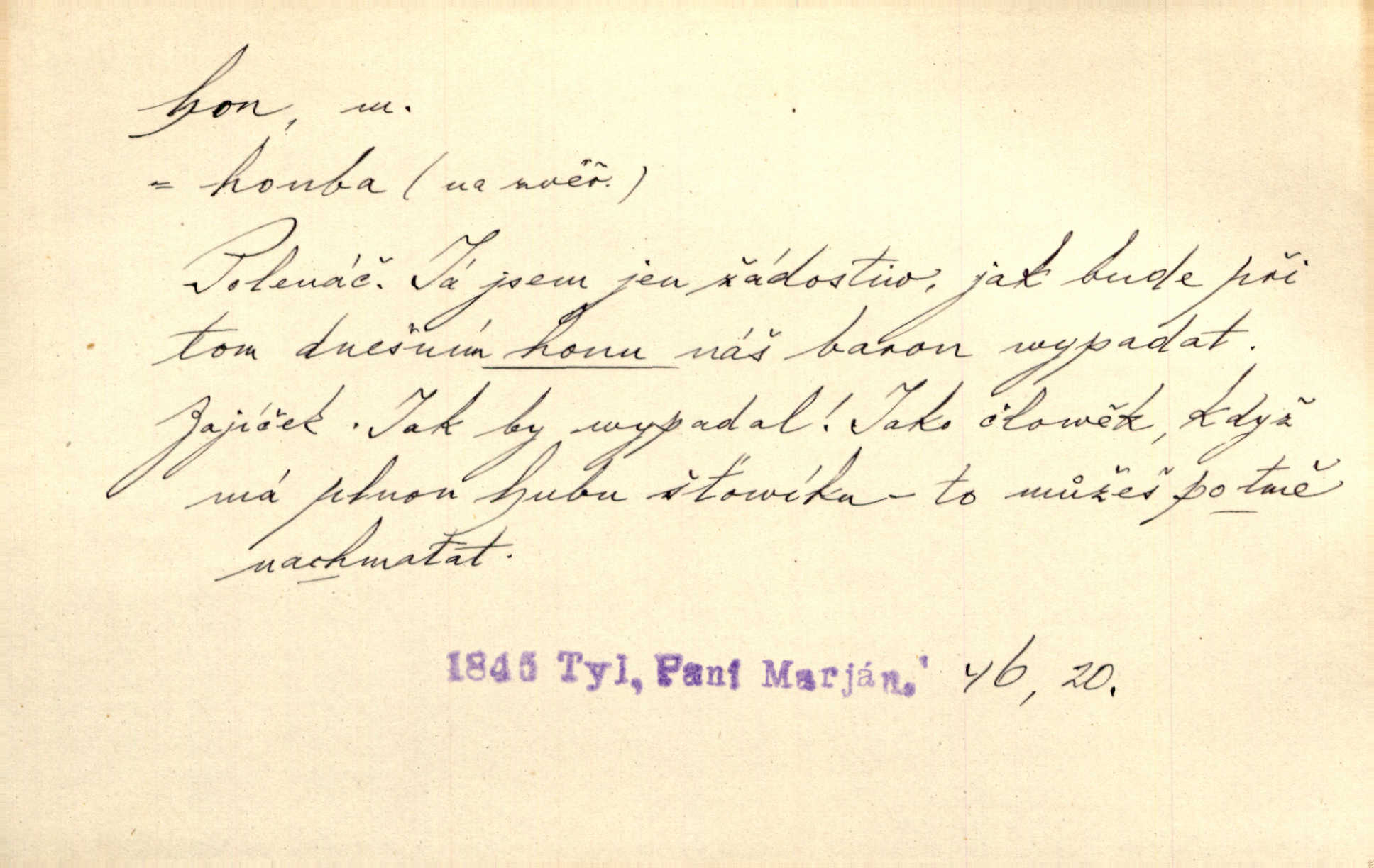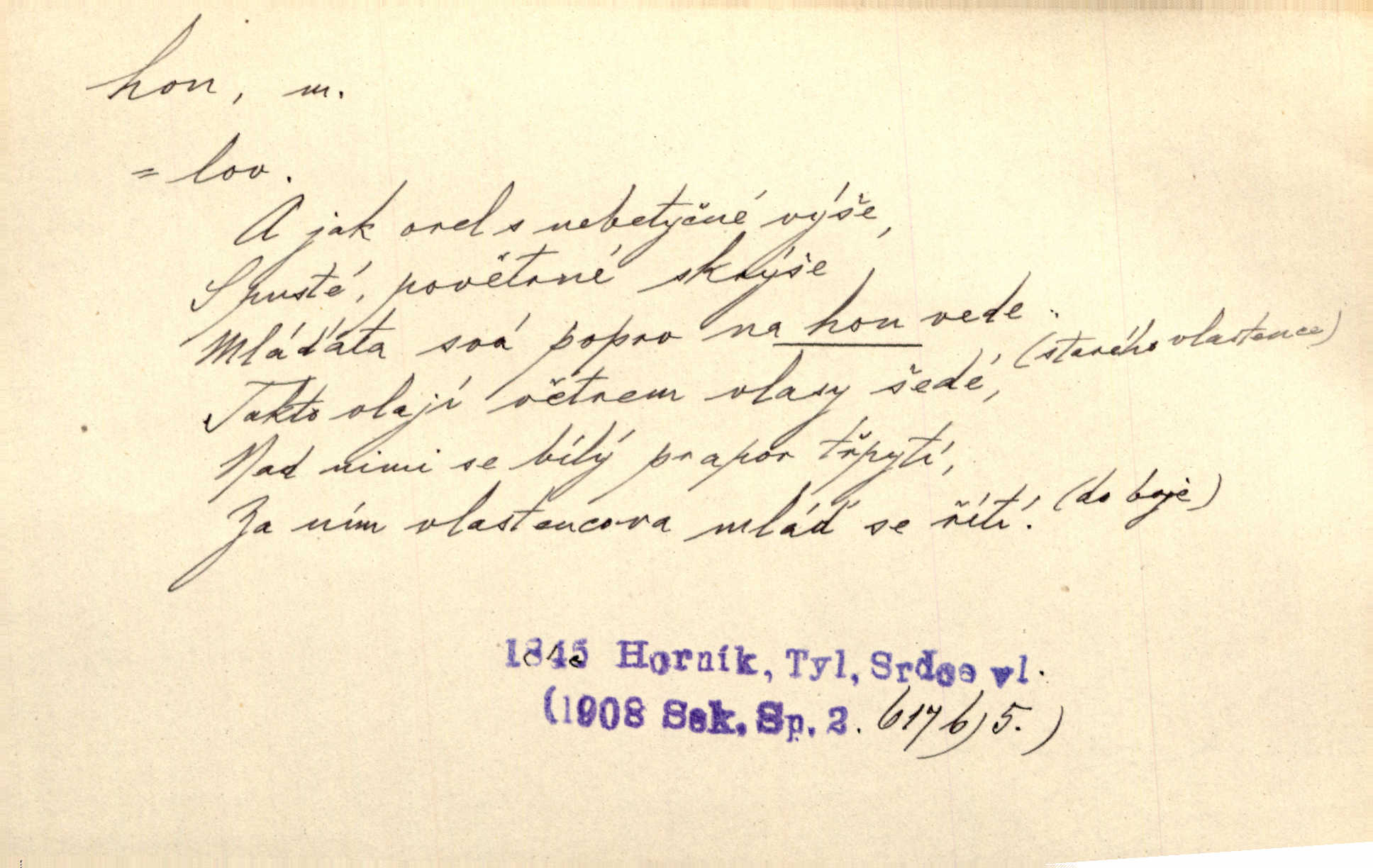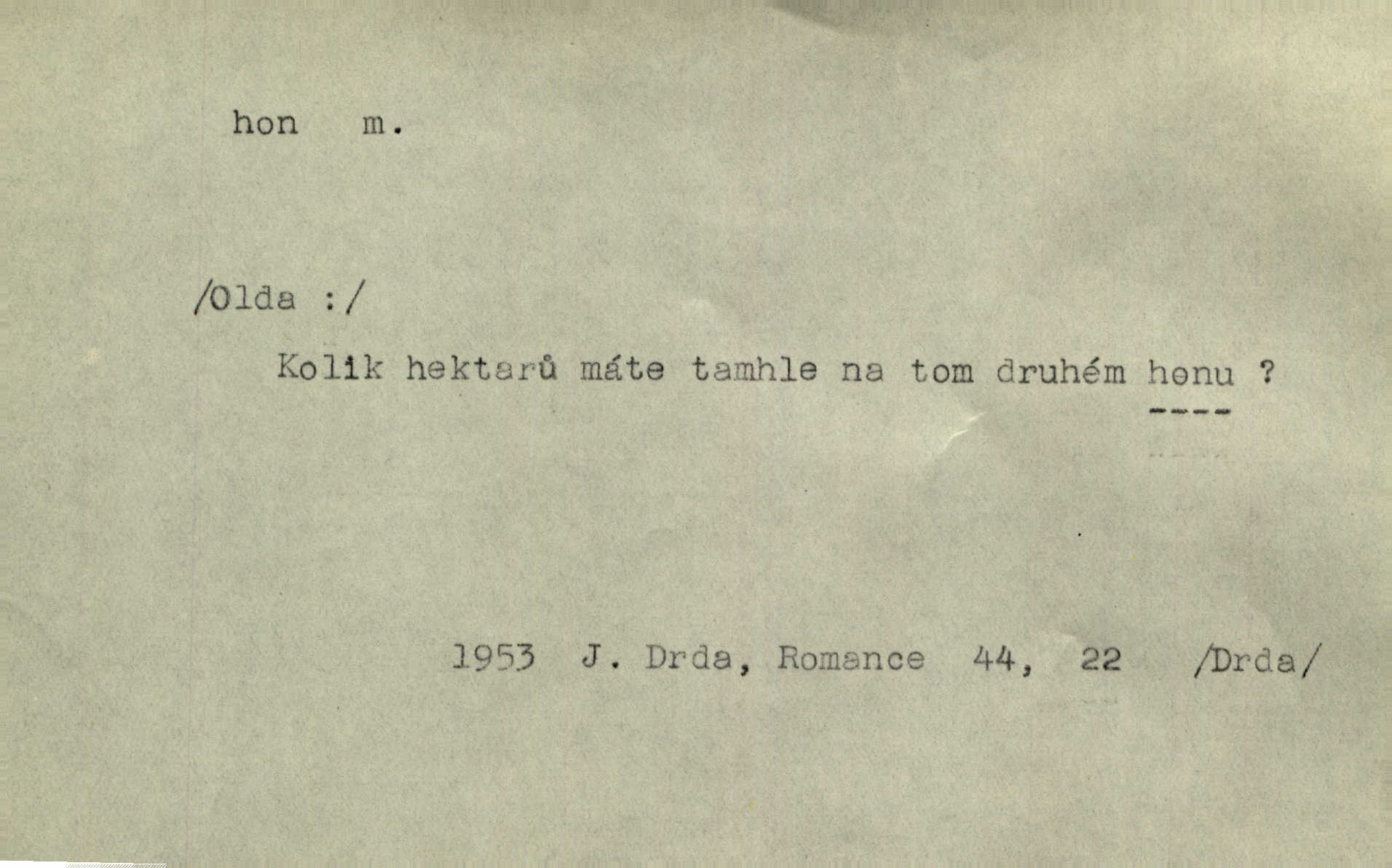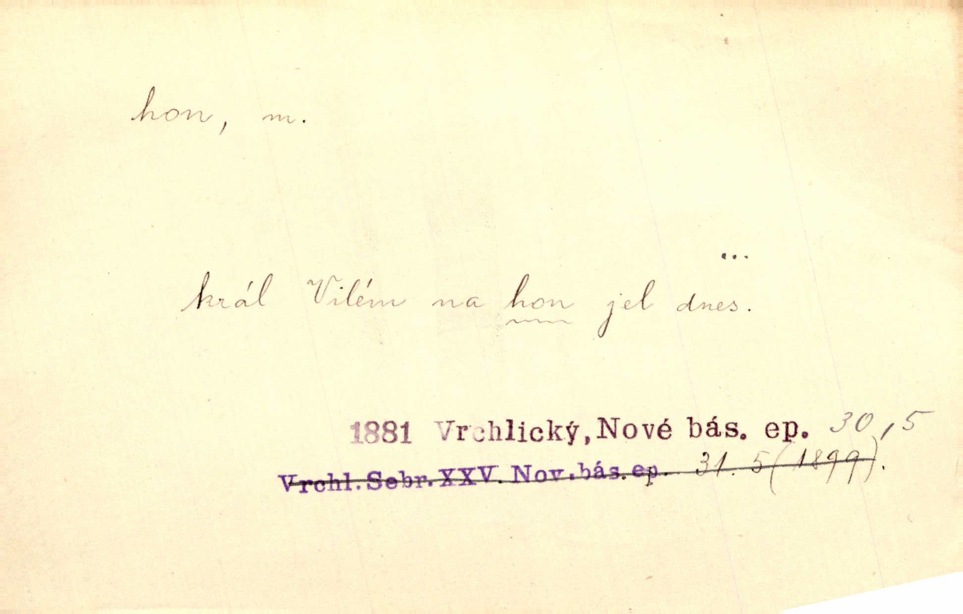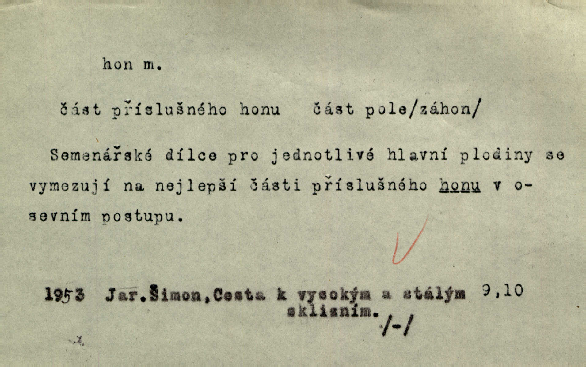 - hon, -u m. běh, úprk. Na Vítkově hoře divoký hon. Žižkova posádka vyrazila na Mišňany. Jir. Psi leželi u nohou babiččiných, a jako by po divém honu bývali, rychle oddychovali. Něm. Snad čas, jenž honem kvapným kol se žene, se zastaví. Vrch. D shon, chvat, ruch. Vichr v divém honu rve v cáry fantastické mračen clonu. Čech. Škoda, že jsi se [na besedu] nevybral v neděli, všední den je u nás hon. Rais. Byli by zůstali v honu a ruchu světa na podřízených místech úředníčků. Vrba. Arch. Pracovali [cihláři] chvatně jako do honu překotně. Vlč. Krejčí, ševci šili co do honu jako o závod. Ehrenb. Held v honu svého povolání nevzpomínal. Jir. D překotné úsilí, sháňka. Když pomněl na nekonečný ten hon za kariérou, na věčné to soupeření a předstihování, klesala pod ním kolena. Herrm. Ráno počal hon po penězích zas na novo. Do cukrovaru běhal pro zálohu na řepu, vymetal záložny. A. Mrš. D lovení zvěře, lov. Na ten den byl ustanoven hon v habrůvských polích. A. Mrš. Dvůr hučíval veselím, jakmile se sjelo okolní zemanstvo na hony. Jir. Hon na koroptve. D stará délková míra 125 kroků. Také vzdálenost udávali naši staří předkové na hony. Pek. Země se rozsedla na tři hony. Erb. Větší [hoši] už na kolik honů vyběhli po silnici poutníkům vstříc. A. Mrš. Lešetínské zvony slyšet valné hony. Čech. Kde se měla setkat s nějakou živou duší, na deset honů se vyhnula zdaleka. Nor. Vyhněme se na sto honů násilí co nejdále. Dyk. Její [pěvkyně] přednes byl na hony vzdálen toho naříkavého, slabošského tónu velice, daleko. Smet. D hon, -u m., zvl. pomn. hony (hona), -ů m. díl, kus n. skupina pozemků. Vyhnal brázdu tam a zpátky přes celý hon. Rozl. Pozemky byly rozděleny nejprve podle jakosti na t. zv. hony. Dobiáš. Mezi velkými hony vinuly se červenavé pruhy, úhory. Třeb. Pouští dobytek na naše hony. Ehrenb.