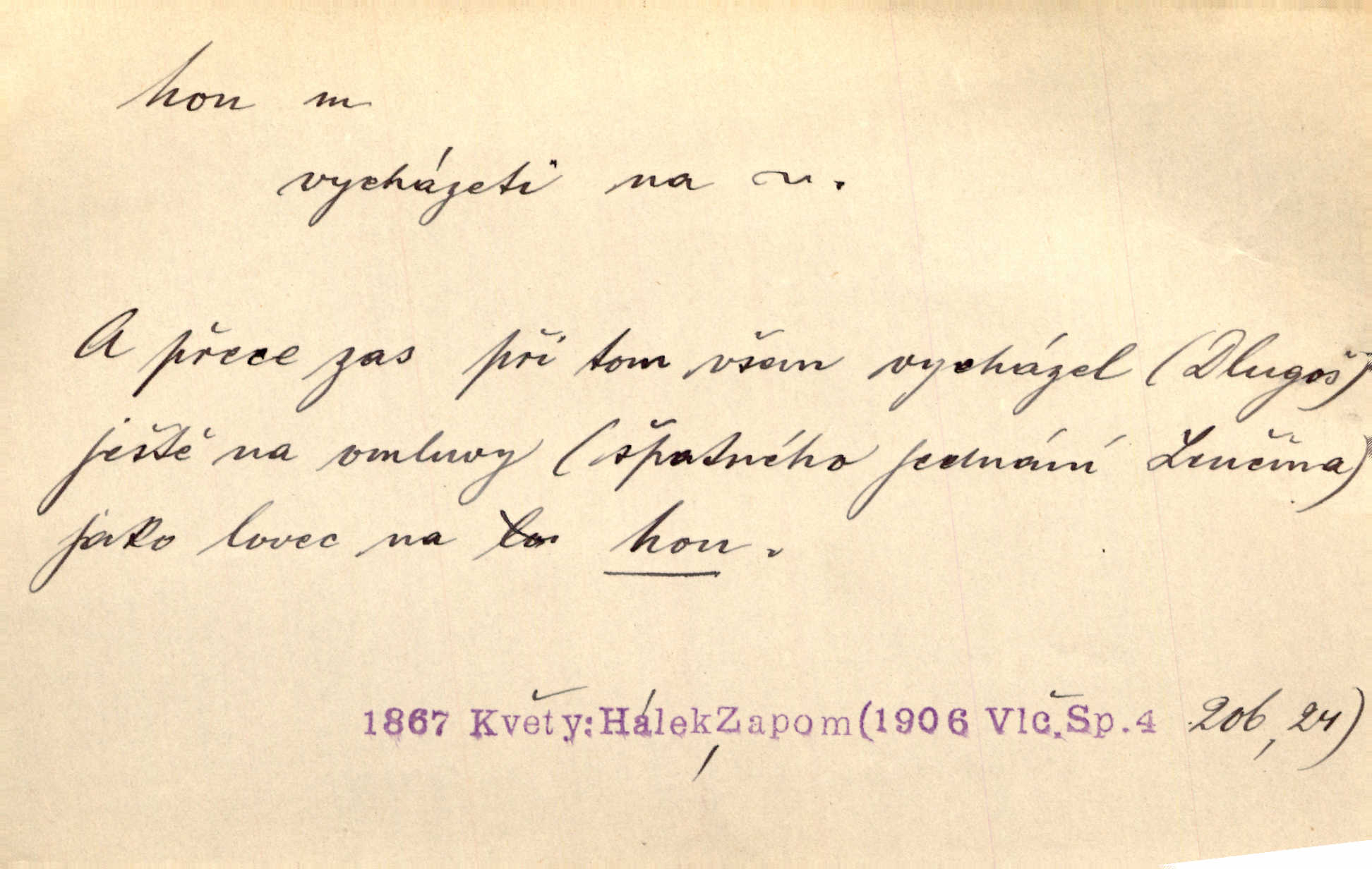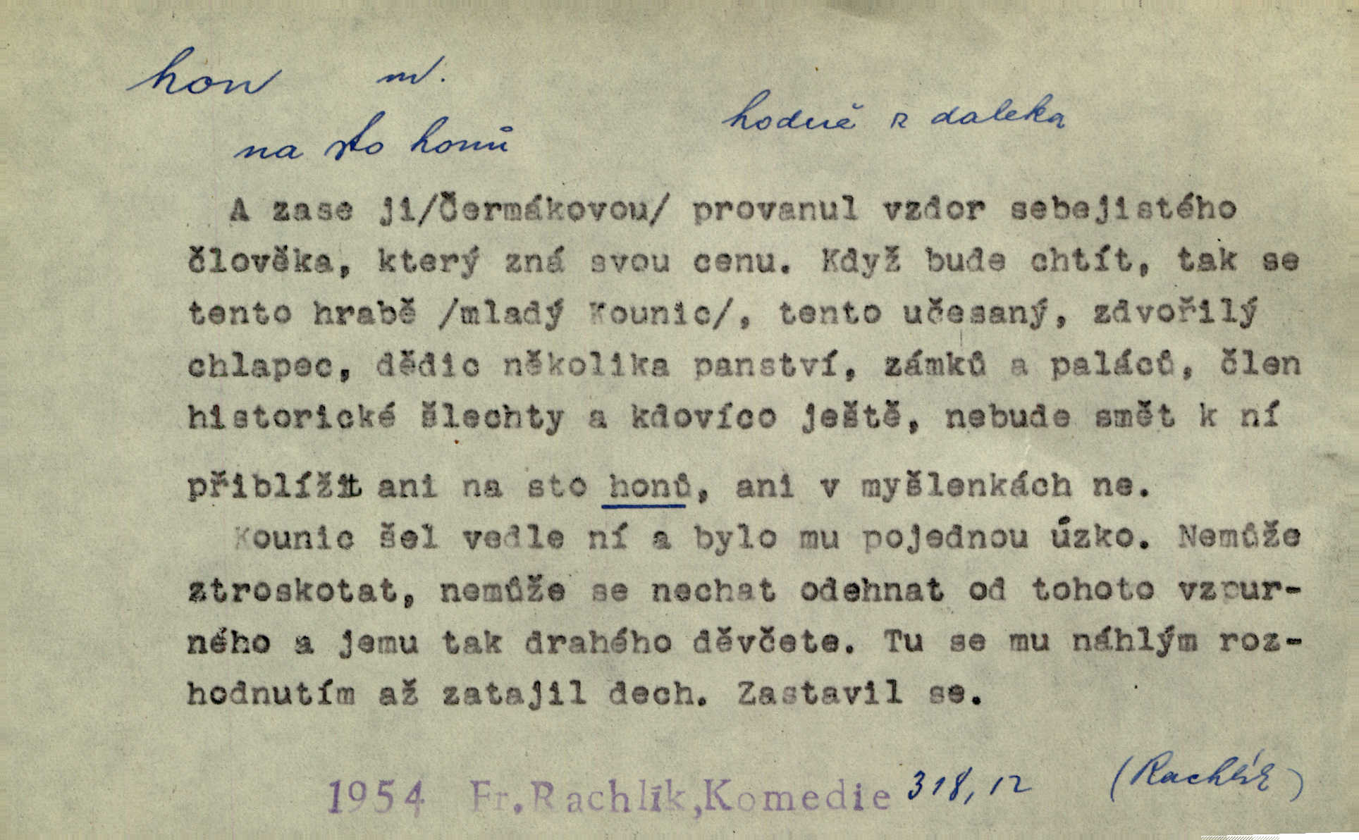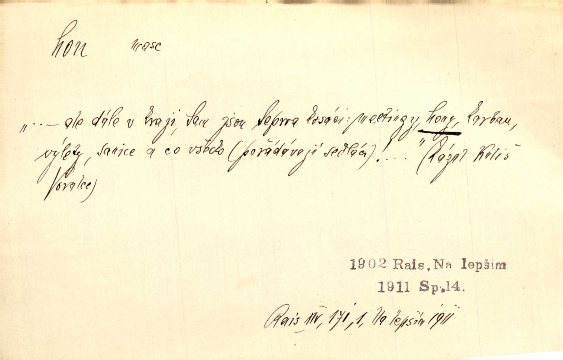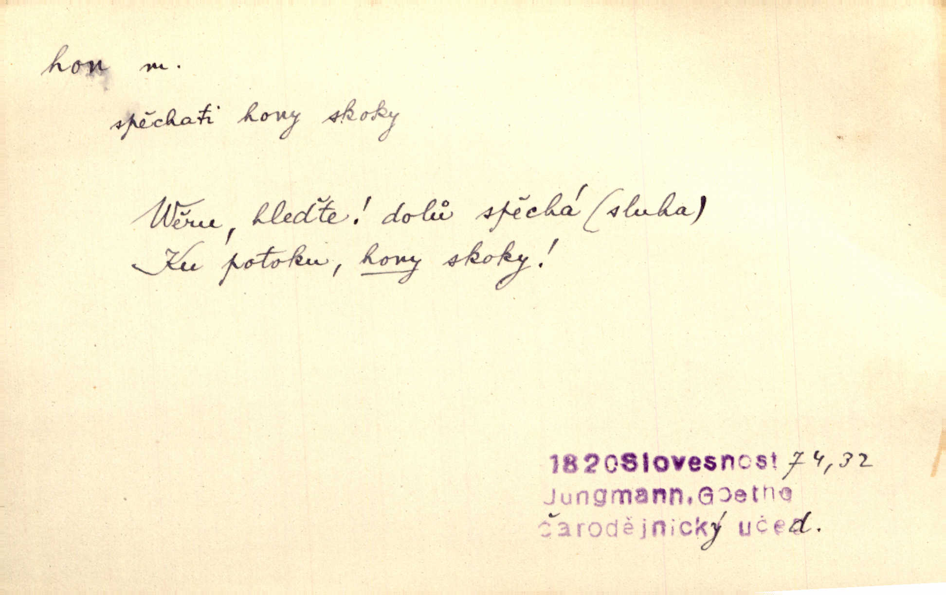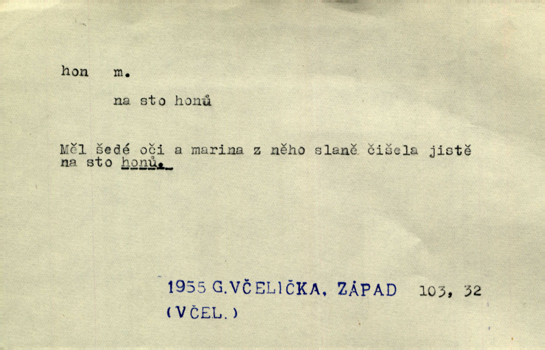 - hon, -u m. běh, úprk. Na Vítkově hoře divoký hon. Žižkova posádka vyrazila na Mišňany. Jir. Psi leželi u nohou babiččiných, a jako by po divém honu bývali, rychle oddychovali. Něm. Snad čas, jenž honem kvapným kol se žene, se zastaví. Vrch. D shon, chvat, ruch. Vichr v divém honu rve v cáry fantastické mračen clonu. Čech. Škoda, že jsi se [na besedu] nevybral v neděli, všední den je u nás hon. Rais. Byli by zůstali v honu a ruchu světa na podřízených místech úředníčků. Vrba. Arch. Pracovali [cihláři] chvatně jako do honu překotně. Vlč. Krejčí, ševci šili co do honu jako o závod. Ehrenb. Held v honu svého povolání nevzpomínal. Jir. D překotné úsilí, sháňka. Když pomněl na nekonečný ten hon za kariérou, na věčné to soupeření a předstihování, klesala pod ním kolena. Herrm. Ráno počal hon po penězích zas na novo. Do cukrovaru běhal pro zálohu na řepu, vymetal záložny. A. Mrš. D lovení zvěře, lov. Na ten den byl ustanoven hon v habrůvských polích. A. Mrš. Dvůr hučíval veselím, jakmile se sjelo okolní zemanstvo na hony. Jir. Hon na koroptve. D stará délková míra 125 kroků. Také vzdálenost udávali naši staří předkové na hony. Pek. Země se rozsedla na tři hony. Erb. Větší [hoši] už na kolik honů vyběhli po silnici poutníkům vstříc. A. Mrš. Lešetínské zvony slyšet valné hony. Čech. Kde se měla setkat s nějakou živou duší, na deset honů se vyhnula zdaleka. Nor. Vyhněme se na sto honů násilí co nejdále. Dyk. Její [pěvkyně] přednes byl na hony vzdálen toho naříkavého, slabošského tónu velice, daleko. Smet. D hon, -u m., zvl. pomn. hony (hona), -ů m. díl, kus n. skupina pozemků. Vyhnal brázdu tam a zpátky přes celý hon. Rozl. Pozemky byly rozděleny nejprve podle jakosti na t. zv. hony. Dobiáš. Mezi velkými hony vinuly se červenavé pruhy, úhory. Třeb. Pouští dobytek na naše hony. Ehrenb.