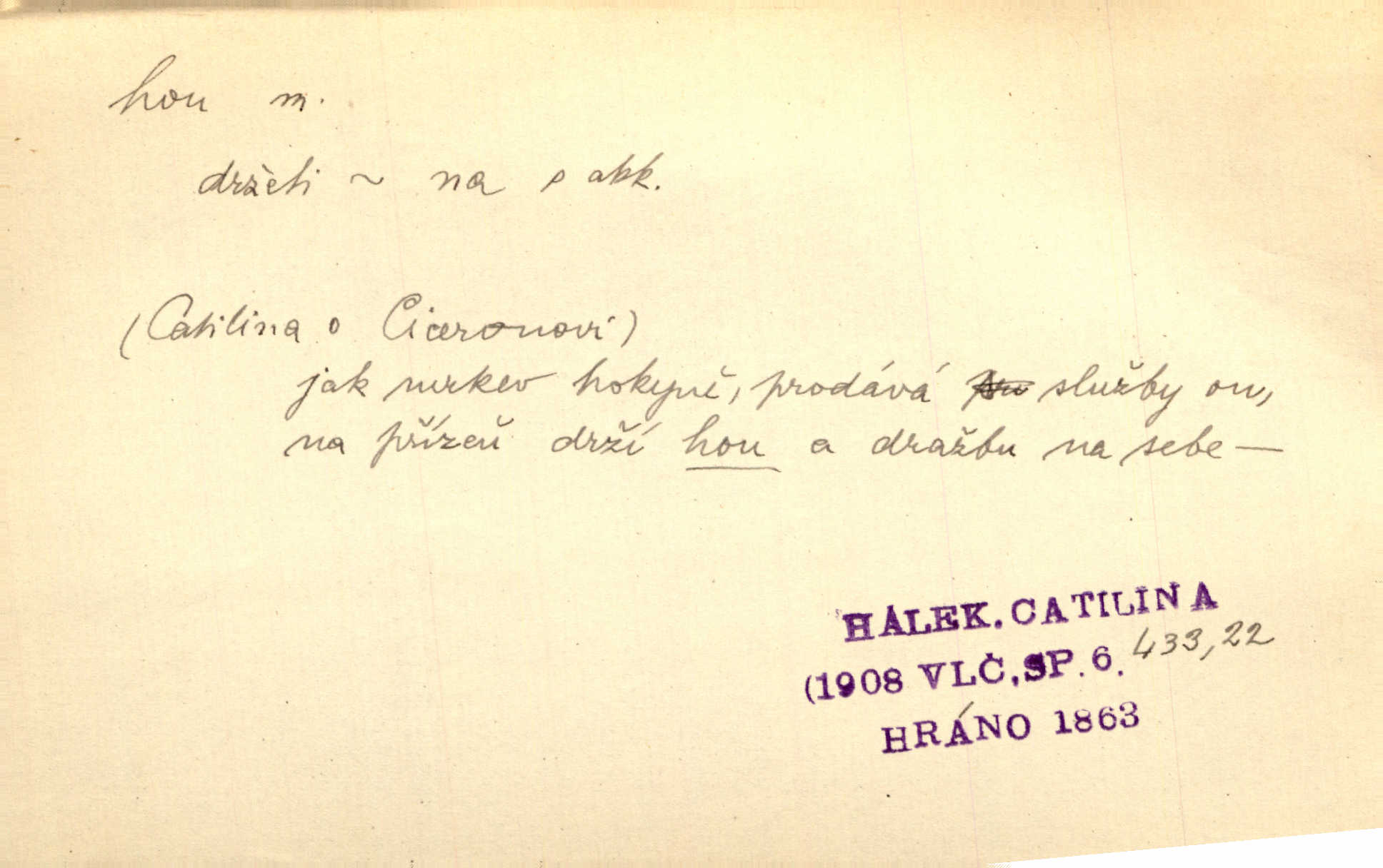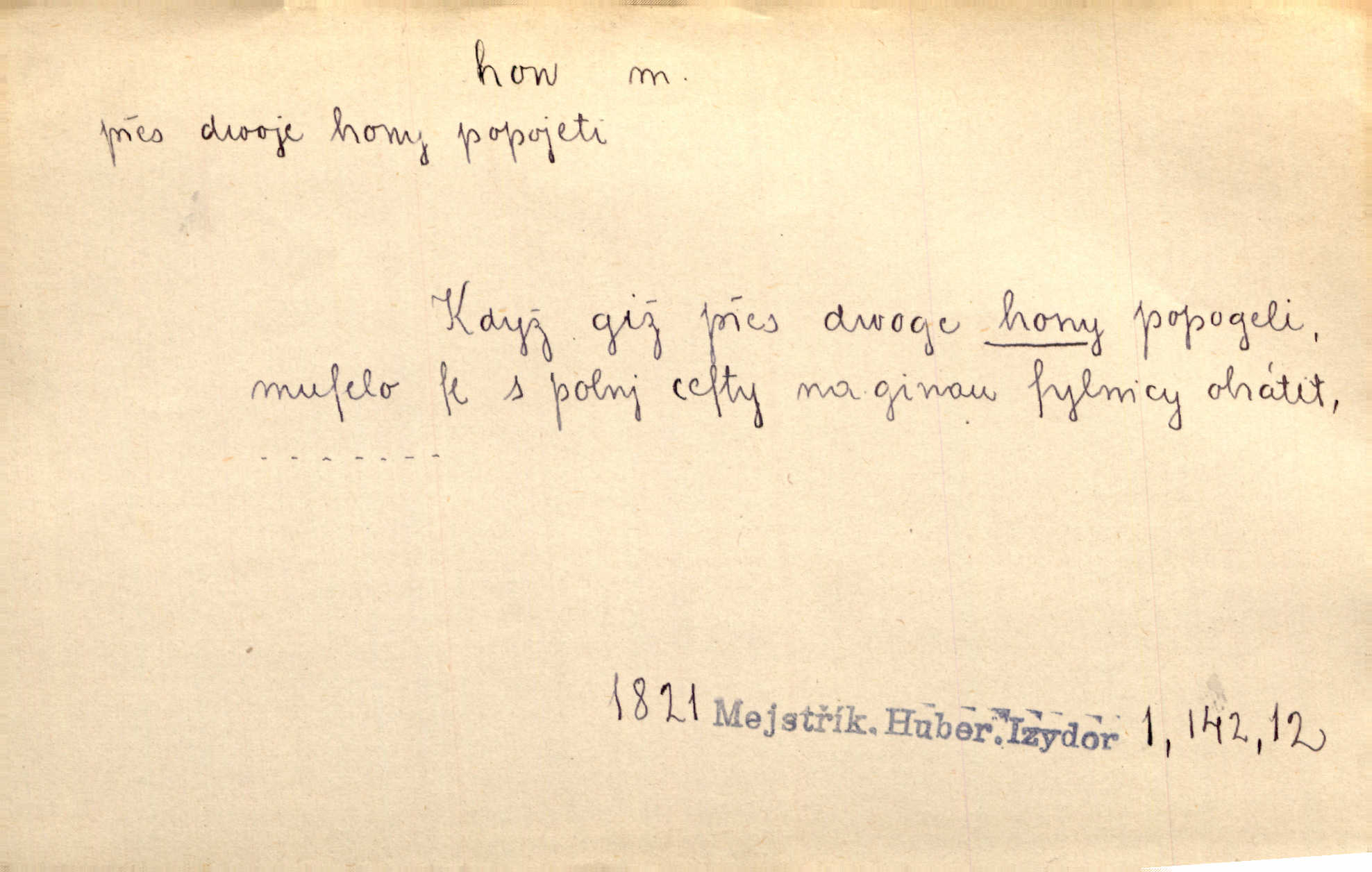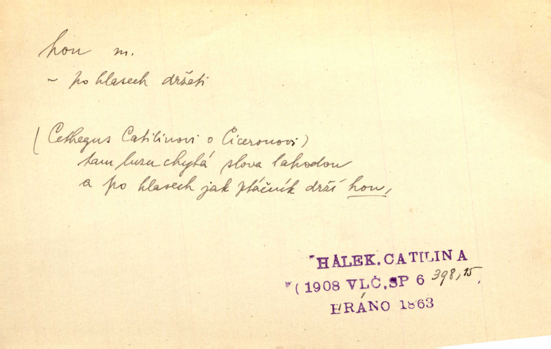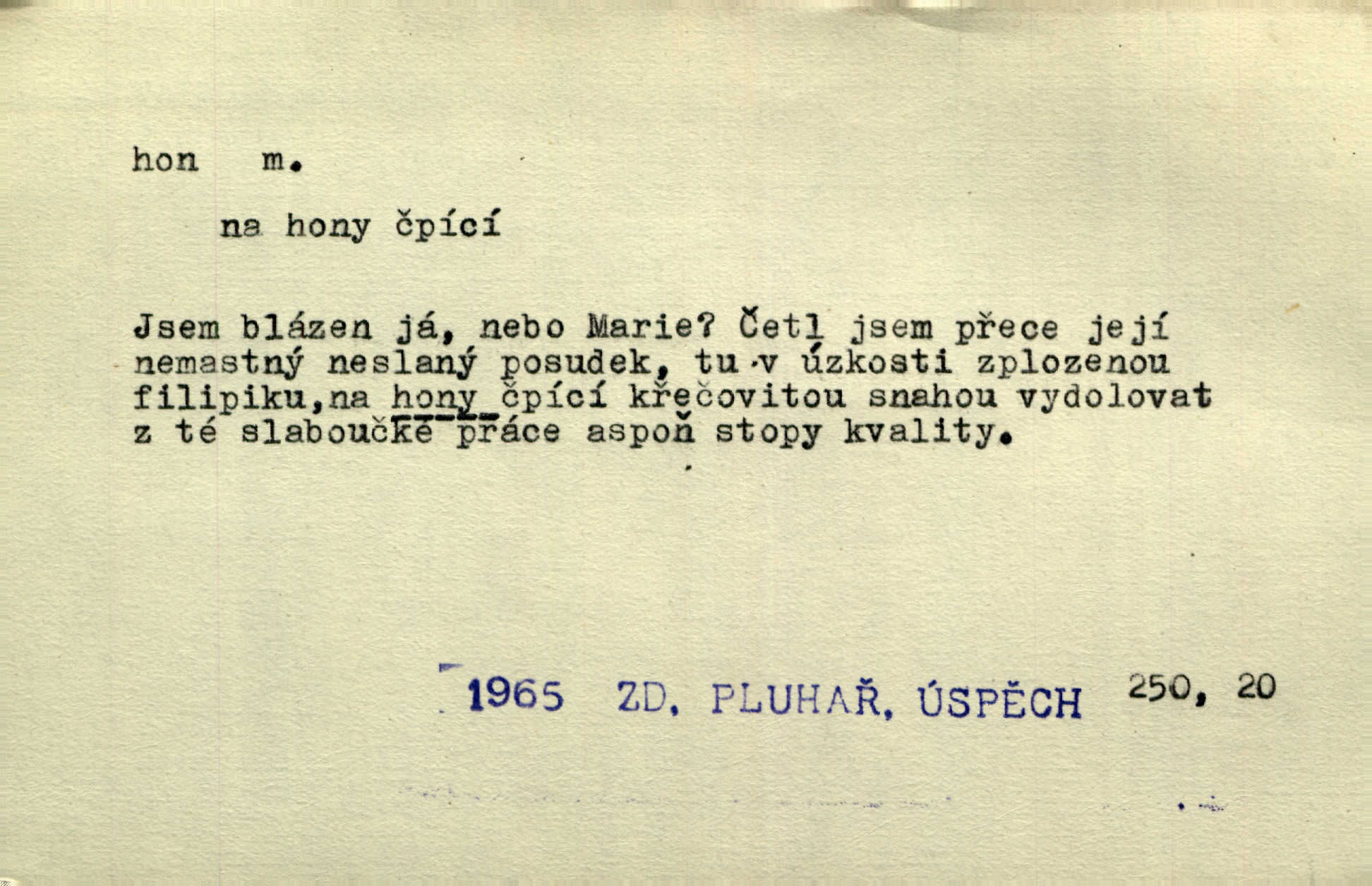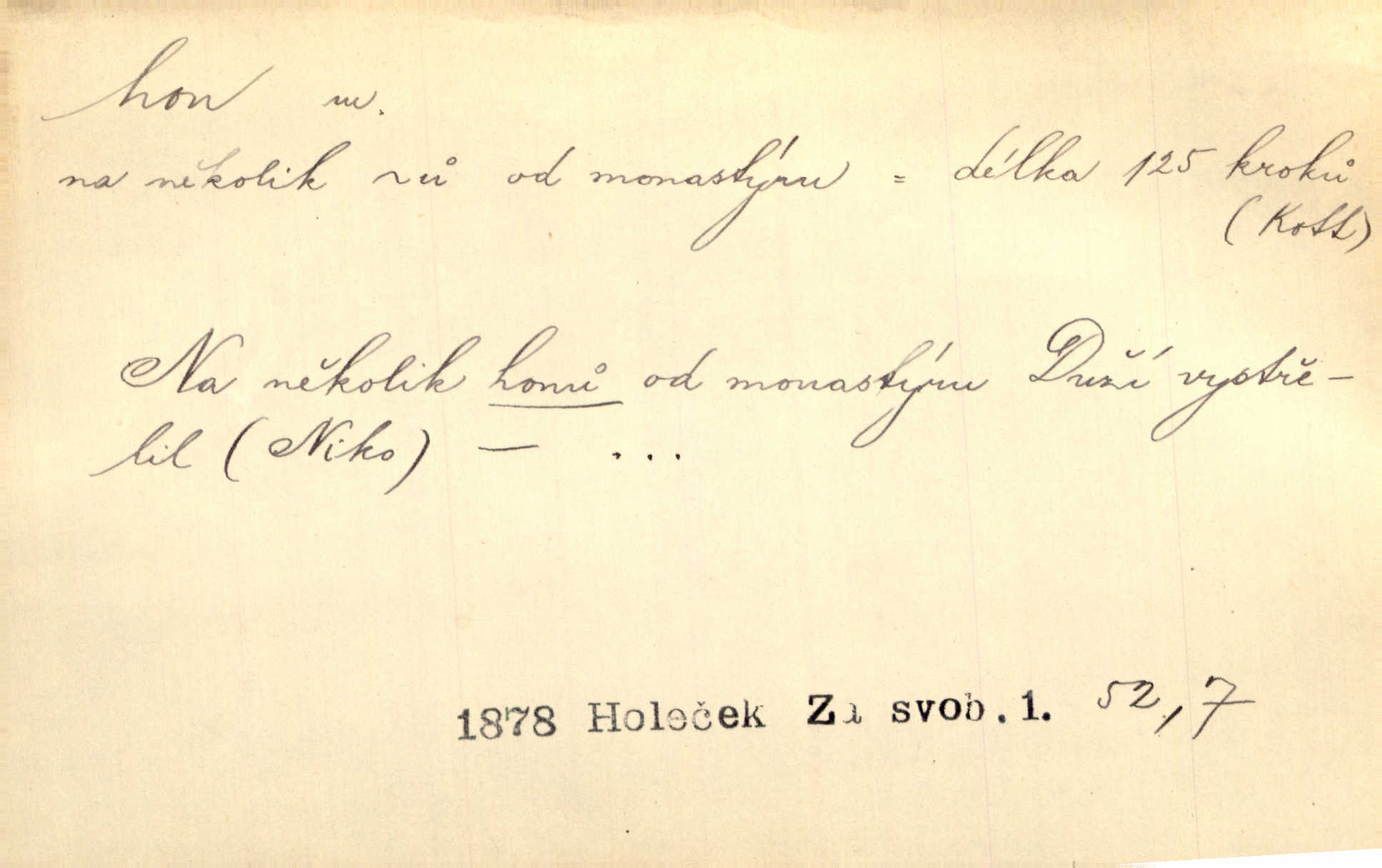 - hon, -u m. běh, úprk. Na Vítkově hoře divoký hon. Žižkova posádka vyrazila na Mišňany. Jir. Psi leželi u nohou babiččiných, a jako by po divém honu bývali, rychle oddychovali. Něm. Snad čas, jenž honem kvapným kol se žene, se zastaví. Vrch. D shon, chvat, ruch. Vichr v divém honu rve v cáry fantastické mračen clonu. Čech. Škoda, že jsi se [na besedu] nevybral v neděli, všední den je u nás hon. Rais. Byli by zůstali v honu a ruchu světa na podřízených místech úředníčků. Vrba. Arch. Pracovali [cihláři] chvatně jako do honu překotně. Vlč. Krejčí, ševci šili co do honu jako o závod. Ehrenb. Held v honu svého povolání nevzpomínal. Jir. D překotné úsilí, sháňka. Když pomněl na nekonečný ten hon za kariérou, na věčné to soupeření a předstihování, klesala pod ním kolena. Herrm. Ráno počal hon po penězích zas na novo. Do cukrovaru běhal pro zálohu na řepu, vymetal záložny. A. Mrš. D lovení zvěře, lov. Na ten den byl ustanoven hon v habrůvských polích. A. Mrš. Dvůr hučíval veselím, jakmile se sjelo okolní zemanstvo na hony. Jir. Hon na koroptve. D stará délková míra 125 kroků. Také vzdálenost udávali naši staří předkové na hony. Pek. Země se rozsedla na tři hony. Erb. Větší [hoši] už na kolik honů vyběhli po silnici poutníkům vstříc. A. Mrš. Lešetínské zvony slyšet valné hony. Čech. Kde se měla setkat s nějakou živou duší, na deset honů se vyhnula zdaleka. Nor. Vyhněme se na sto honů násilí co nejdále. Dyk. Její [pěvkyně] přednes byl na hony vzdálen toho naříkavého, slabošského tónu velice, daleko. Smet. D hon, -u m., zvl. pomn. hony (hona), -ů m. díl, kus n. skupina pozemků. Vyhnal brázdu tam a zpátky přes celý hon. Rozl. Pozemky byly rozděleny nejprve podle jakosti na t. zv. hony. Dobiáš. Mezi velkými hony vinuly se červenavé pruhy, úhory. Třeb. Pouští dobytek na naše hony. Ehrenb.