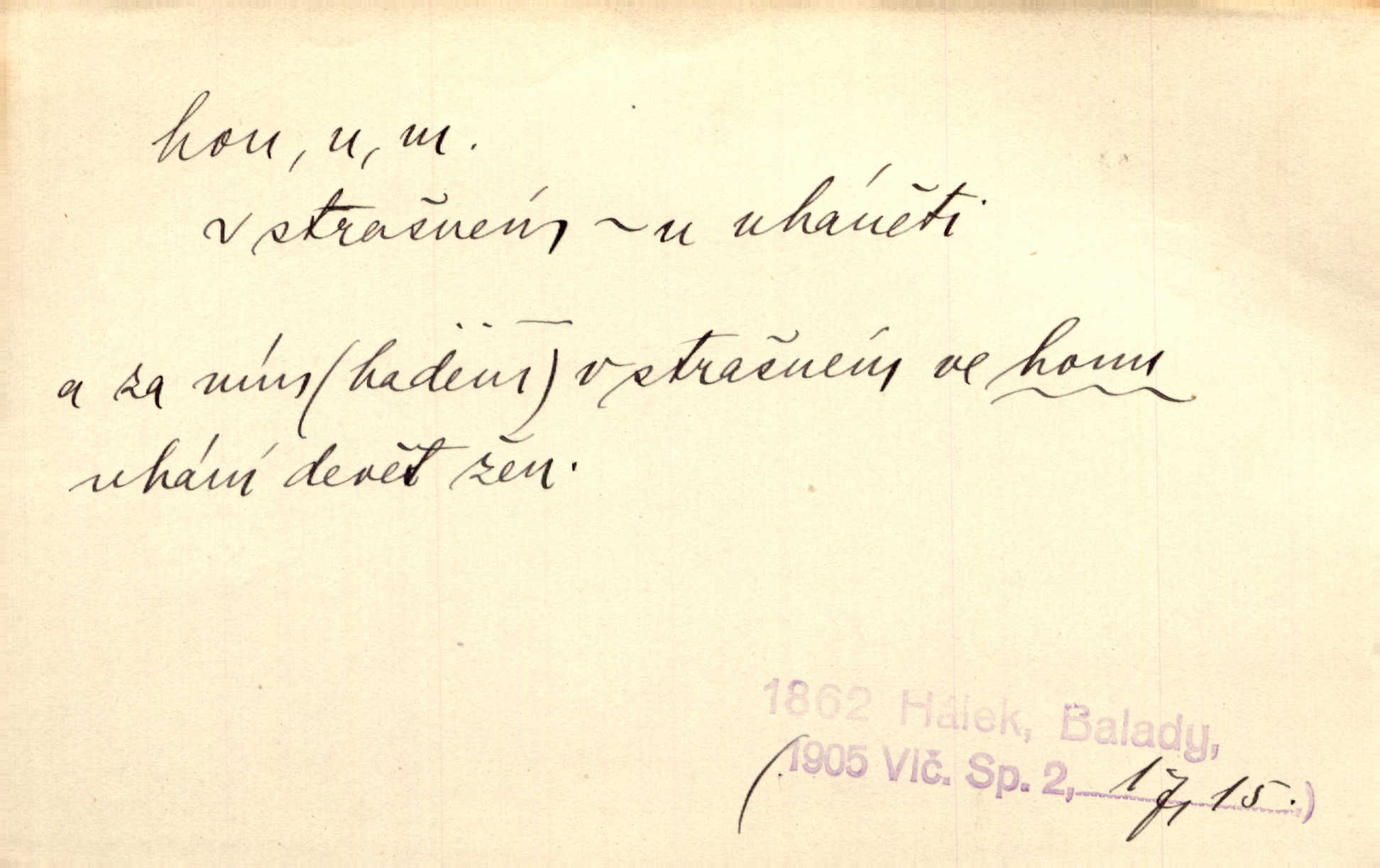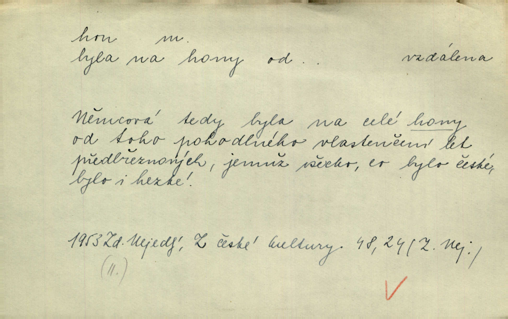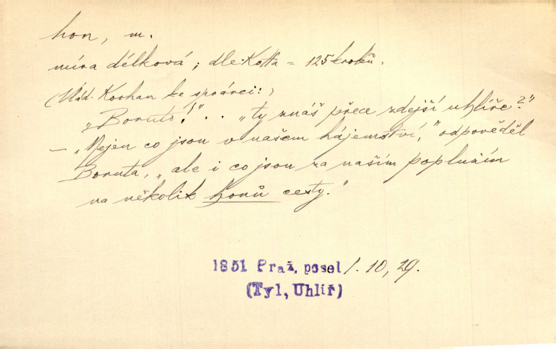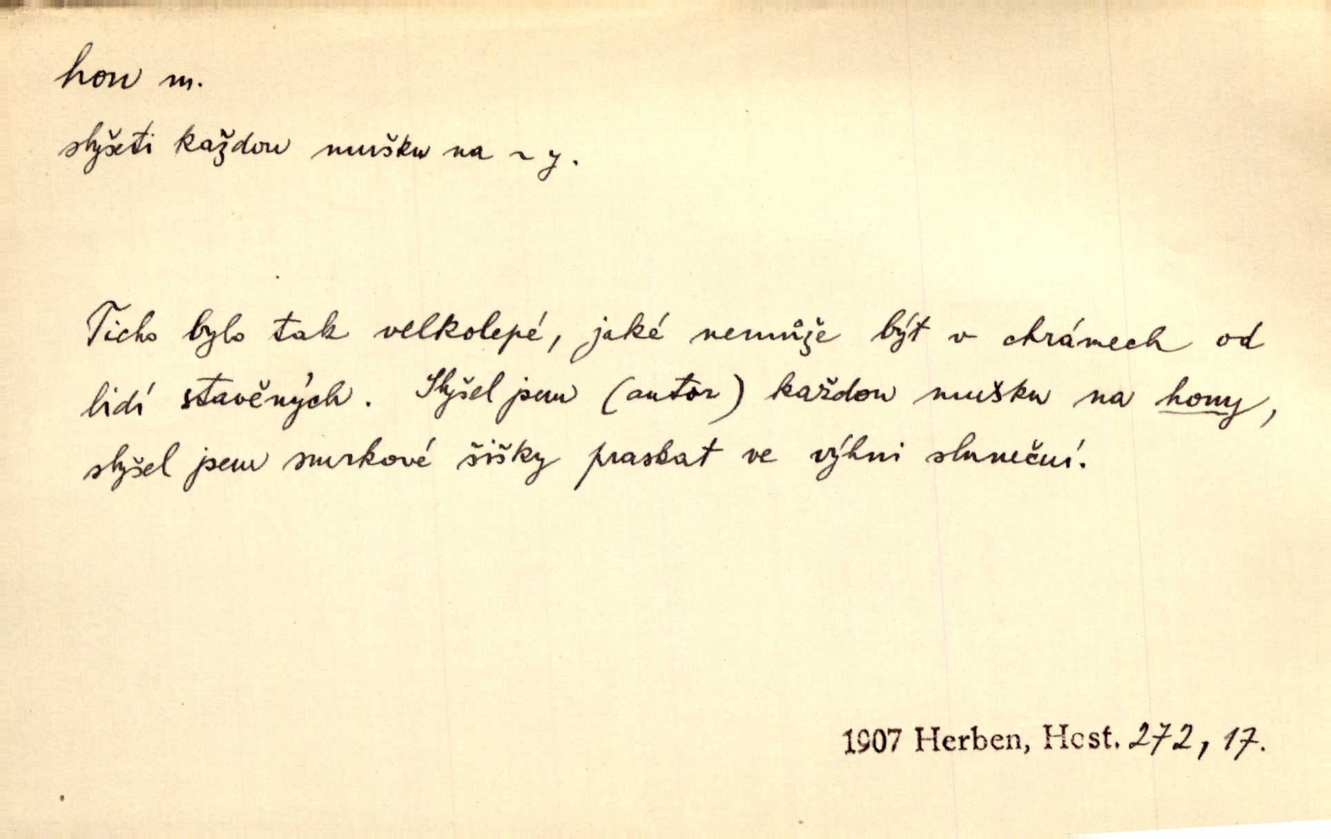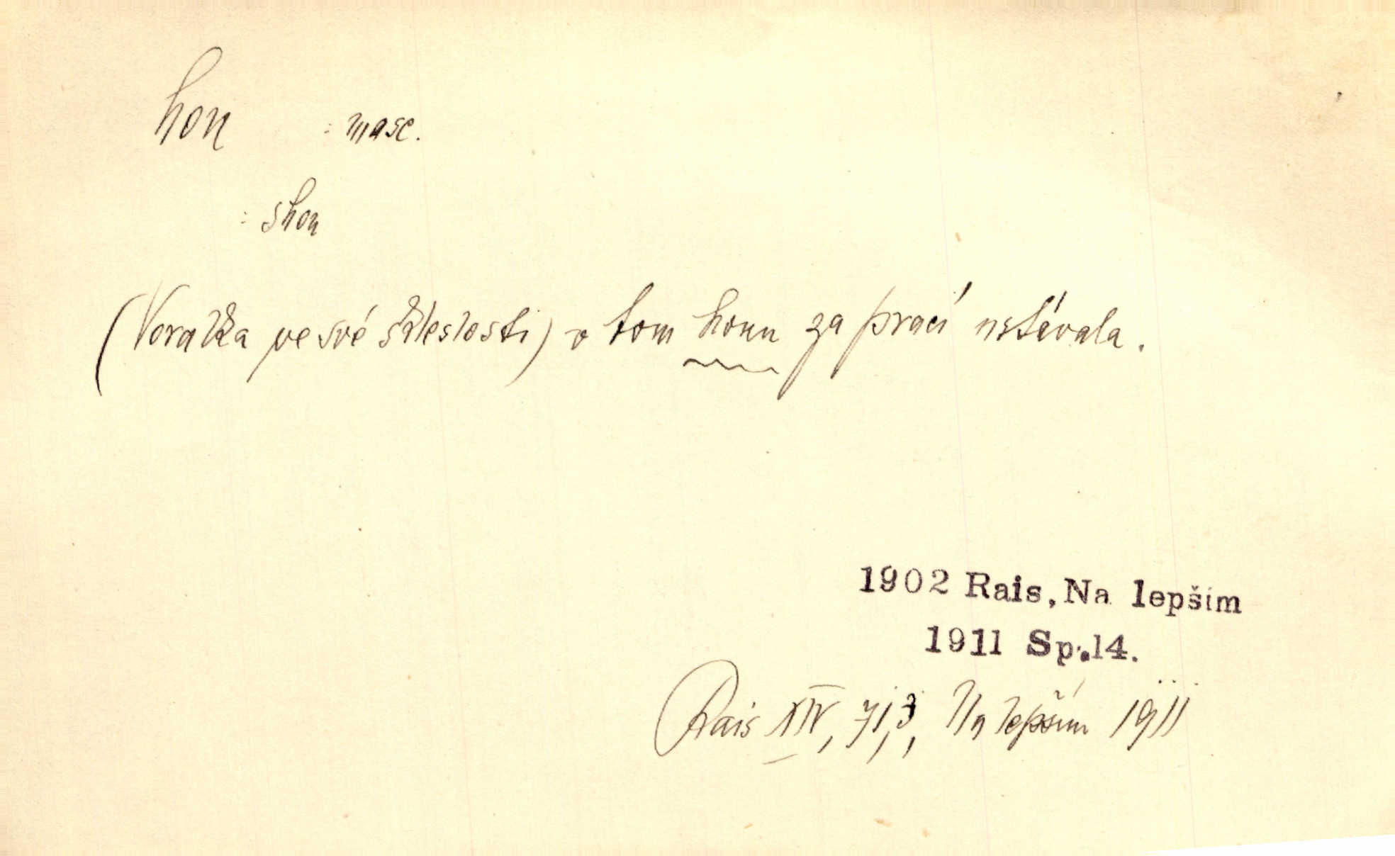 - hon, -u m. běh, úprk. Na Vítkově hoře divoký hon. Žižkova posádka vyrazila na Mišňany. Jir. Psi leželi u nohou babiččiných, a jako by po divém honu bývali, rychle oddychovali. Něm. Snad čas, jenž honem kvapným kol se žene, se zastaví. Vrch. D shon, chvat, ruch. Vichr v divém honu rve v cáry fantastické mračen clonu. Čech. Škoda, že jsi se [na besedu] nevybral v neděli, všední den je u nás hon. Rais. Byli by zůstali v honu a ruchu světa na podřízených místech úředníčků. Vrba. Arch. Pracovali [cihláři] chvatně jako do honu překotně. Vlč. Krejčí, ševci šili co do honu jako o závod. Ehrenb. Held v honu svého povolání nevzpomínal. Jir. D překotné úsilí, sháňka. Když pomněl na nekonečný ten hon za kariérou, na věčné to soupeření a předstihování, klesala pod ním kolena. Herrm. Ráno počal hon po penězích zas na novo. Do cukrovaru běhal pro zálohu na řepu, vymetal záložny. A. Mrš. D lovení zvěře, lov. Na ten den byl ustanoven hon v habrůvských polích. A. Mrš. Dvůr hučíval veselím, jakmile se sjelo okolní zemanstvo na hony. Jir. Hon na koroptve. D stará délková míra 125 kroků. Také vzdálenost udávali naši staří předkové na hony. Pek. Země se rozsedla na tři hony. Erb. Větší [hoši] už na kolik honů vyběhli po silnici poutníkům vstříc. A. Mrš. Lešetínské zvony slyšet valné hony. Čech. Kde se měla setkat s nějakou živou duší, na deset honů se vyhnula zdaleka. Nor. Vyhněme se na sto honů násilí co nejdále. Dyk. Její [pěvkyně] přednes byl na hony vzdálen toho naříkavého, slabošského tónu velice, daleko. Smet. D hon, -u m., zvl. pomn. hony (hona), -ů m. díl, kus n. skupina pozemků. Vyhnal brázdu tam a zpátky přes celý hon. Rozl. Pozemky byly rozděleny nejprve podle jakosti na t. zv. hony. Dobiáš. Mezi velkými hony vinuly se červenavé pruhy, úhory. Třeb. Pouští dobytek na naše hony. Ehrenb.