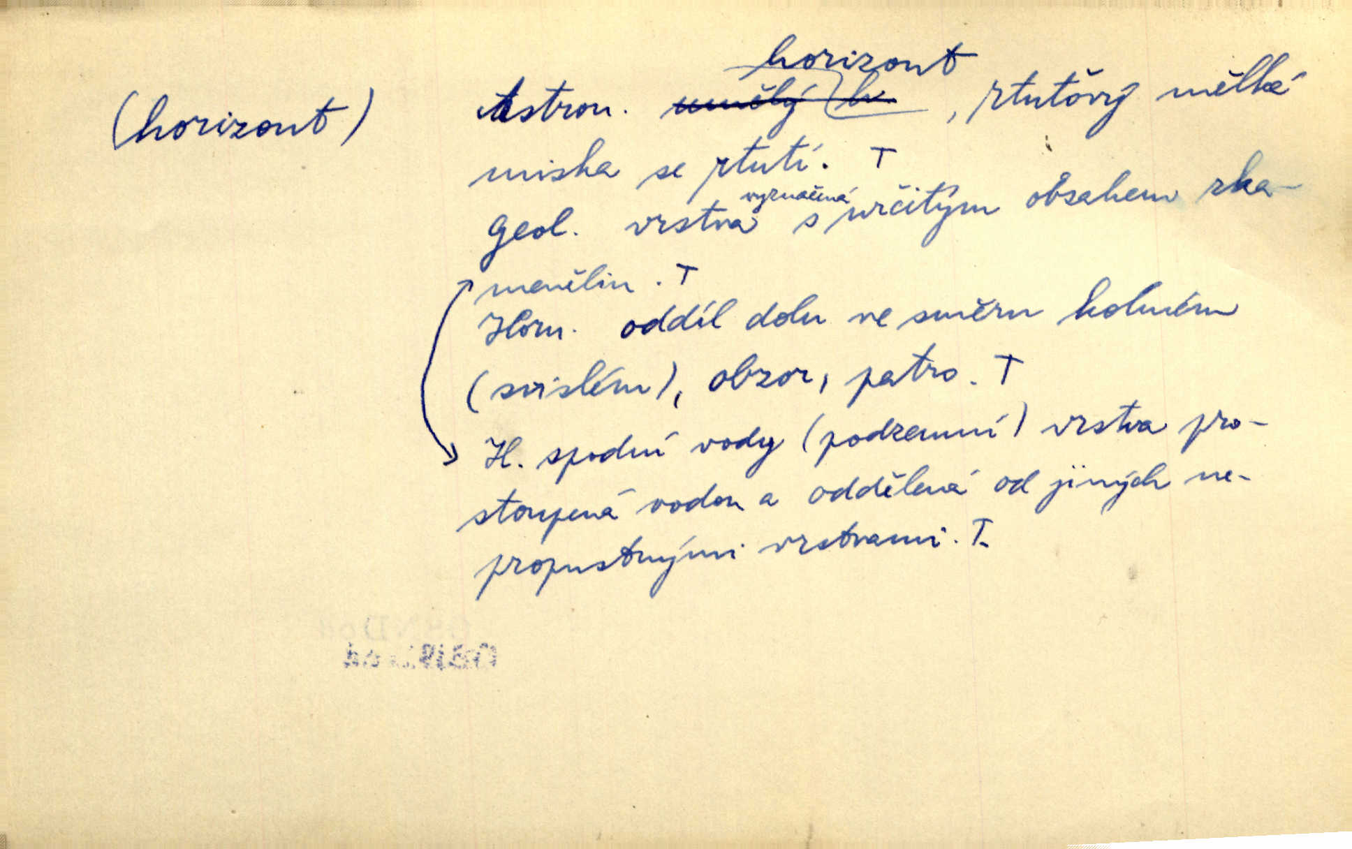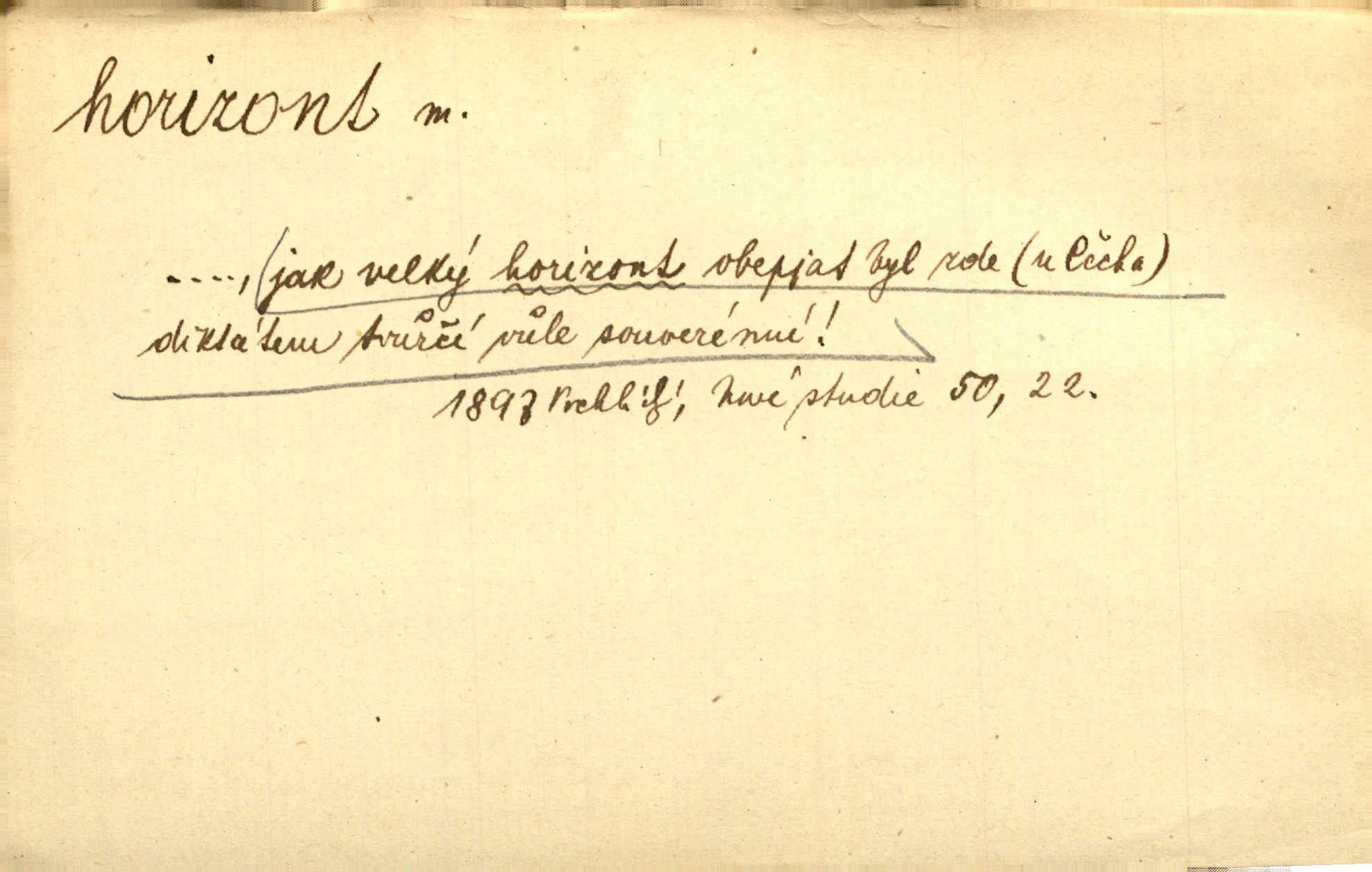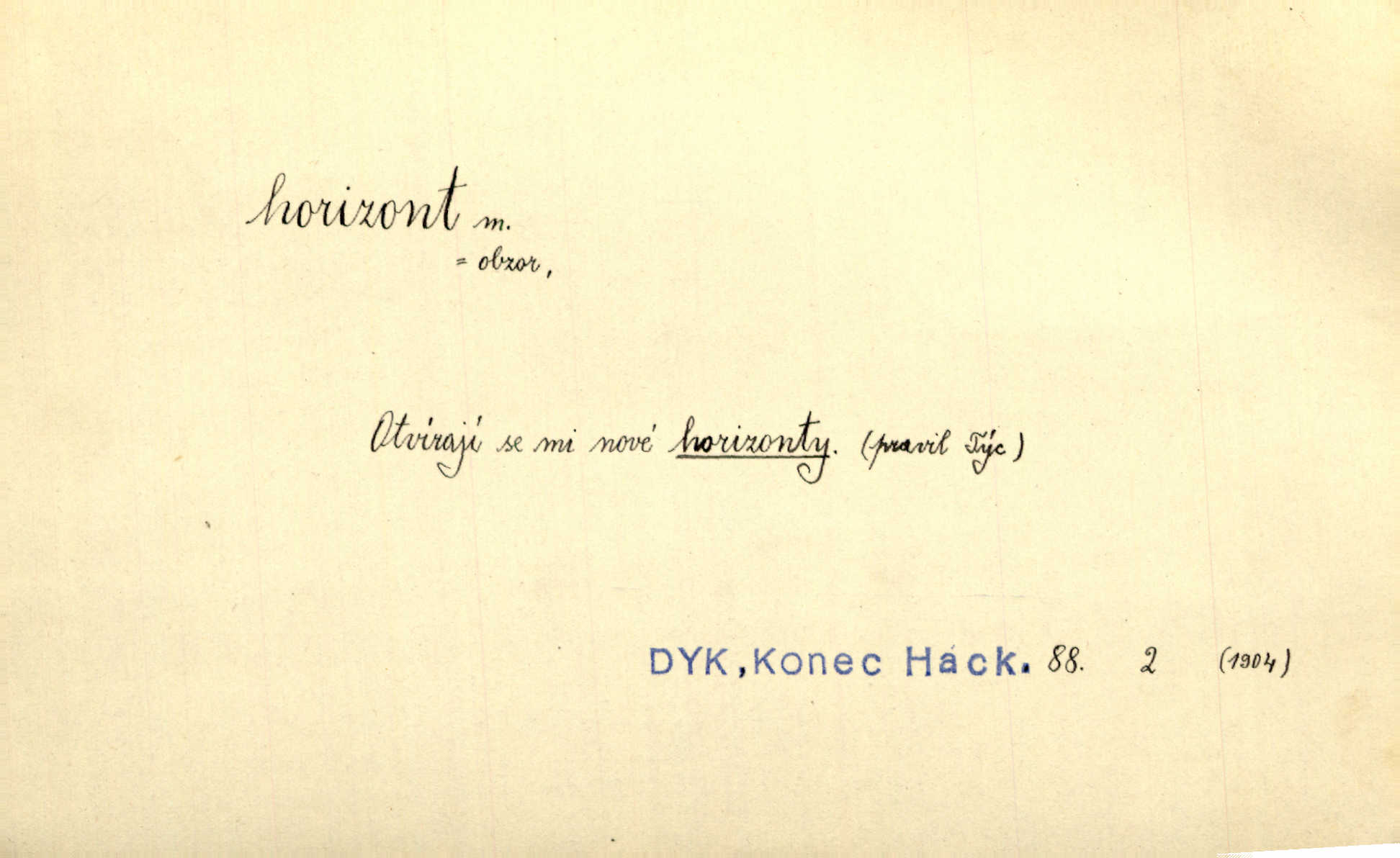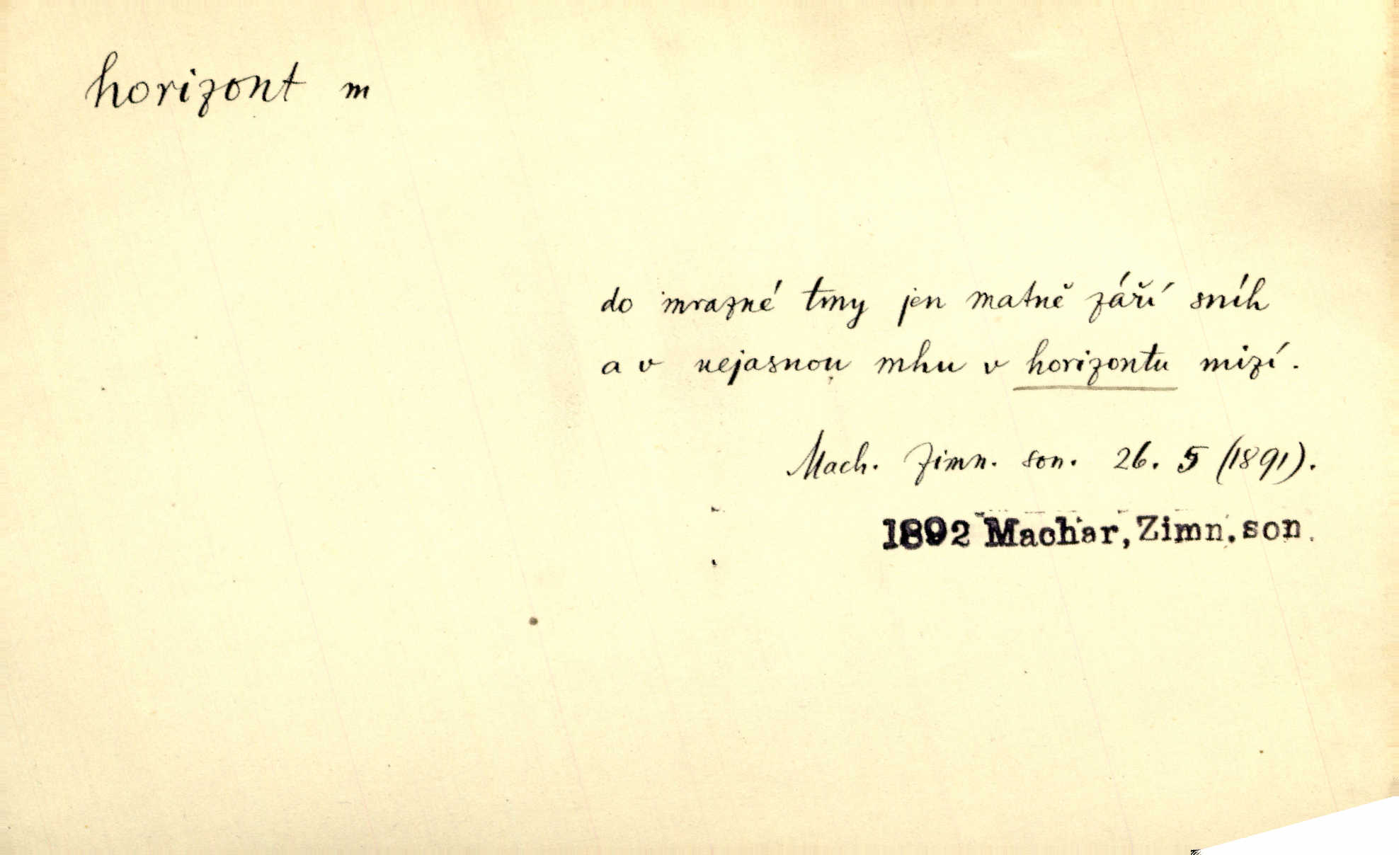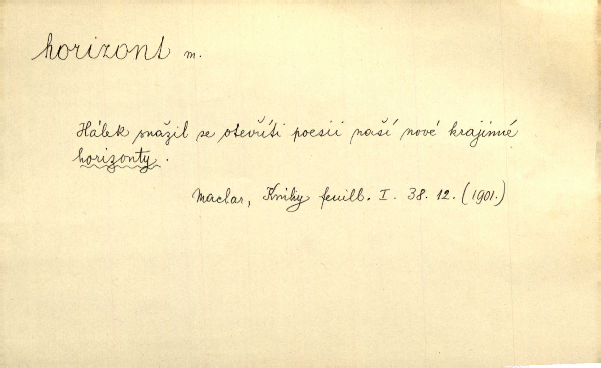 - horizont, -u m. povrch země a oblohy, který s nějakého stanoviska přehlížíme, obzor. Slunce stoupající výš a výše na horizontu. Her. Naposled člověk už neví, co je hora a co lehký oblak nahoře v horizontu. Mach. Za zdí a sloupořadím je viděti palestýnskou krajinu s velkým horizontem. Zey. Přen. Hálek snažil se otevříti poesii naší nové krajinné horizonty. Mach. Geol. vrstva hornin charakterisovaná přesně jistými zkamenělinami. Geom. v perspektivním zobrazování průsečík vodorovné roviny jdoucí okem se svislou rovinou obrazu. Geod. malá zrcadlící plocha k stanovení vodorovné roviny. Horizont umělý zrcadlo opatřené stavěcími šrouby a vodováhou. Horizont rtuťový zařízení, při němž se využívá vodorovné zrcadlící hladiny rtuti k stanovení vodorovné roviny. Horn. patro. Div. kulisy uzavírající pohled do hloubky jeviště. Kruhový horizont. D souhrn, soustava vědomostí a názorů, duševní obzor, duševní rozhled. Úředníci jsou lidé s náramně úzkým horizontem. Štech. No, no, mladíku, nesmíte hned ztratit horizont pozbýti rozvahy. Herrm. Jak velký horizont obepjat byl zde [u Sv. Čecha] diktátem tvůrčí vůle souverénní! Vrch. D výhled do budoucnosti. Změna děje se dle toho, jak politický horizont vypadá. Čas.