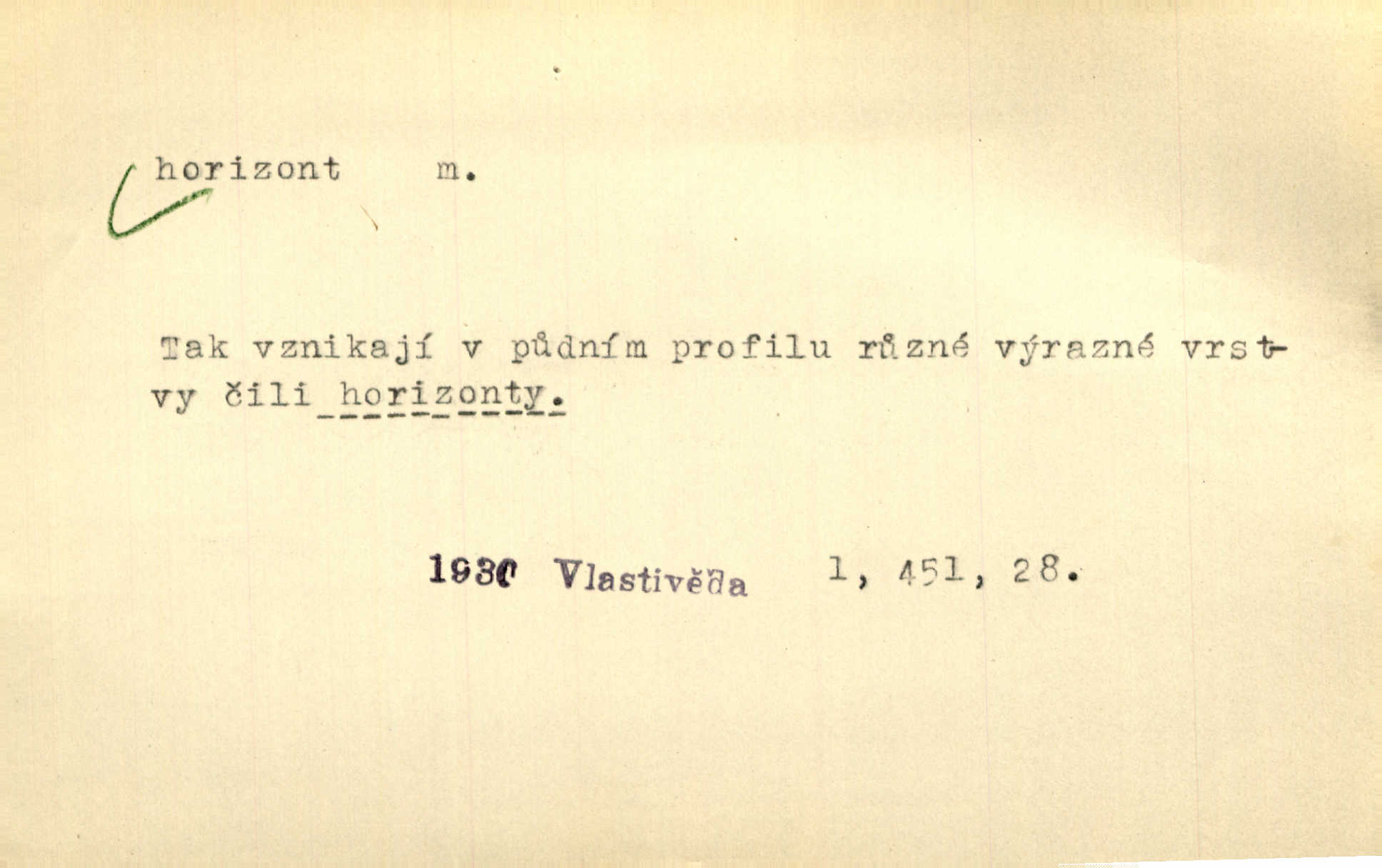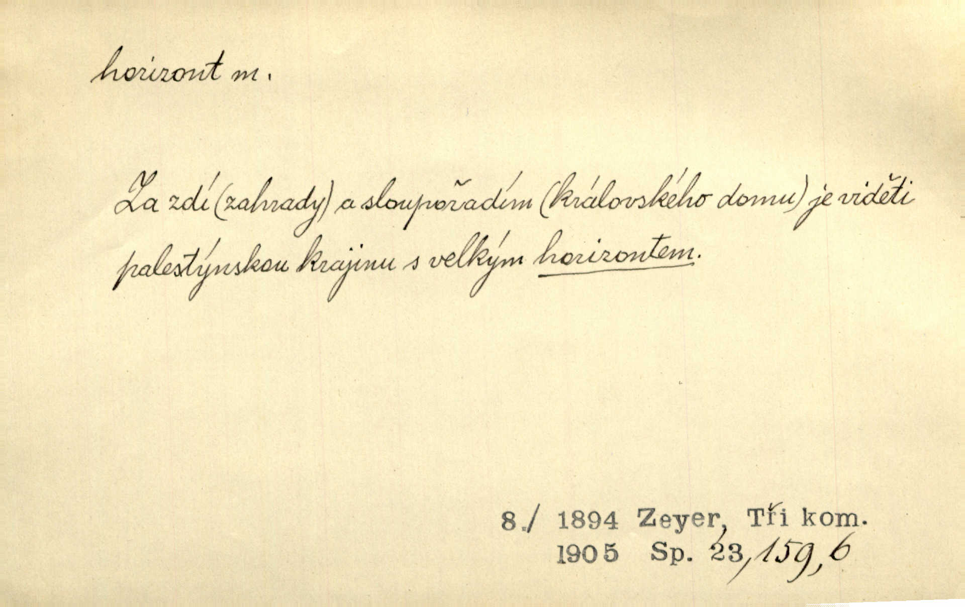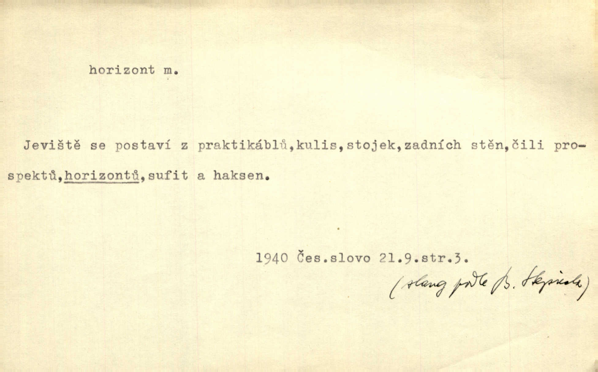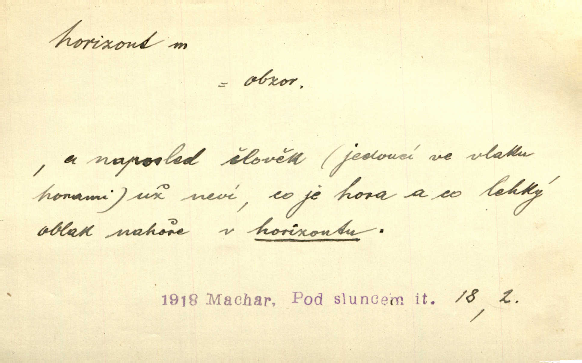 - horizont, -u m. povrch země a oblohy, který s nějakého stanoviska přehlížíme, obzor. Slunce stoupající výš a výše na horizontu. Her. Naposled člověk už neví, co je hora a co lehký oblak nahoře v horizontu. Mach. Za zdí a sloupořadím je viděti palestýnskou krajinu s velkým horizontem. Zey. Přen. Hálek snažil se otevříti poesii naší nové krajinné horizonty. Mach. Geol. vrstva hornin charakterisovaná přesně jistými zkamenělinami. Geom. v perspektivním zobrazování průsečík vodorovné roviny jdoucí okem se svislou rovinou obrazu. Geod. malá zrcadlící plocha k stanovení vodorovné roviny. Horizont umělý zrcadlo opatřené stavěcími šrouby a vodováhou. Horizont rtuťový zařízení, při němž se využívá vodorovné zrcadlící hladiny rtuti k stanovení vodorovné roviny. Horn. patro. Div. kulisy uzavírající pohled do hloubky jeviště. Kruhový horizont. D souhrn, soustava vědomostí a názorů, duševní obzor, duševní rozhled. Úředníci jsou lidé s náramně úzkým horizontem. Štech. No, no, mladíku, nesmíte hned ztratit horizont pozbýti rozvahy. Herrm. Jak velký horizont obepjat byl zde [u Sv. Čecha] diktátem tvůrčí vůle souverénní! Vrch. D výhled do budoucnosti. Změna děje se dle toho, jak politický horizont vypadá. Čas.