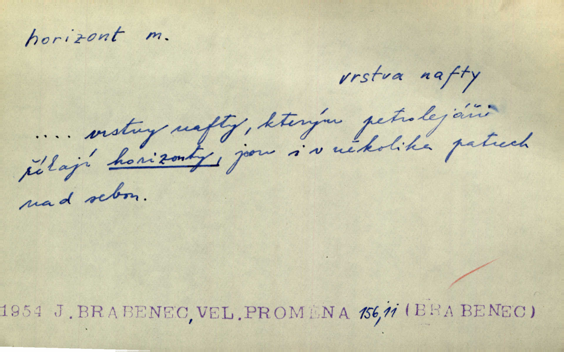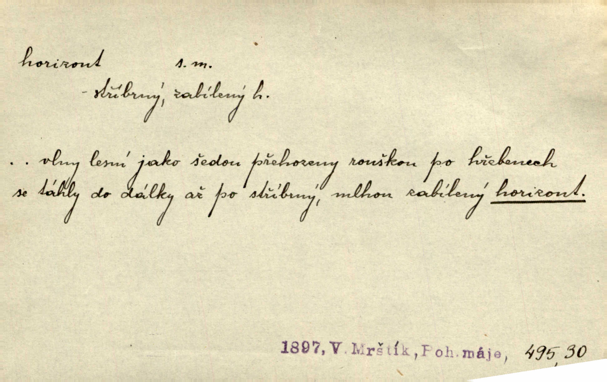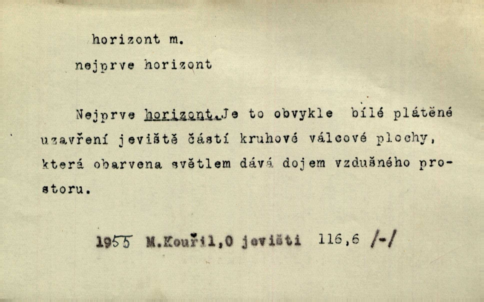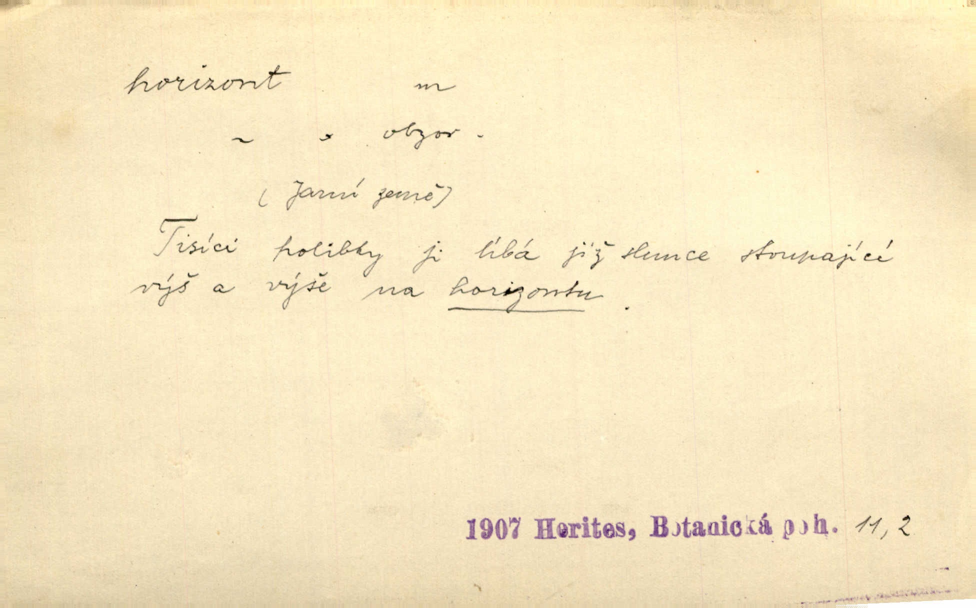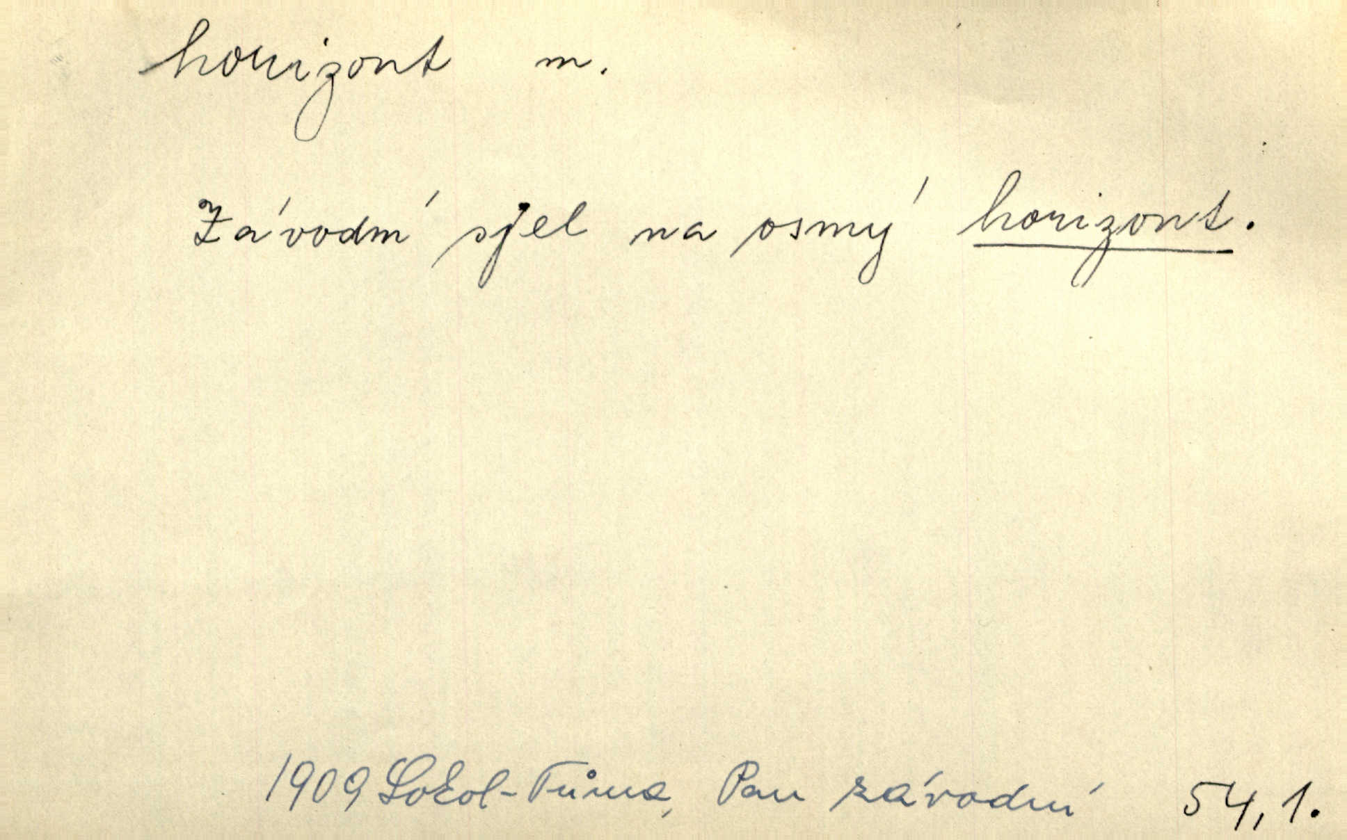 - horizont, -u m. povrch země a oblohy, který s nějakého stanoviska přehlížíme, obzor. Slunce stoupající výš a výše na horizontu. Her. Naposled člověk už neví, co je hora a co lehký oblak nahoře v horizontu. Mach. Za zdí a sloupořadím je viděti palestýnskou krajinu s velkým horizontem. Zey. Přen. Hálek snažil se otevříti poesii naší nové krajinné horizonty. Mach. Geol. vrstva hornin charakterisovaná přesně jistými zkamenělinami. Geom. v perspektivním zobrazování průsečík vodorovné roviny jdoucí okem se svislou rovinou obrazu. Geod. malá zrcadlící plocha k stanovení vodorovné roviny. Horizont umělý zrcadlo opatřené stavěcími šrouby a vodováhou. Horizont rtuťový zařízení, při němž se využívá vodorovné zrcadlící hladiny rtuti k stanovení vodorovné roviny. Horn. patro. Div. kulisy uzavírající pohled do hloubky jeviště. Kruhový horizont. D souhrn, soustava vědomostí a názorů, duševní obzor, duševní rozhled. Úředníci jsou lidé s náramně úzkým horizontem. Štech. No, no, mladíku, nesmíte hned ztratit horizont pozbýti rozvahy. Herrm. Jak velký horizont obepjat byl zde [u Sv. Čecha] diktátem tvůrčí vůle souverénní! Vrch. D výhled do budoucnosti. Změna děje se dle toho, jak politický horizont vypadá. Čas.