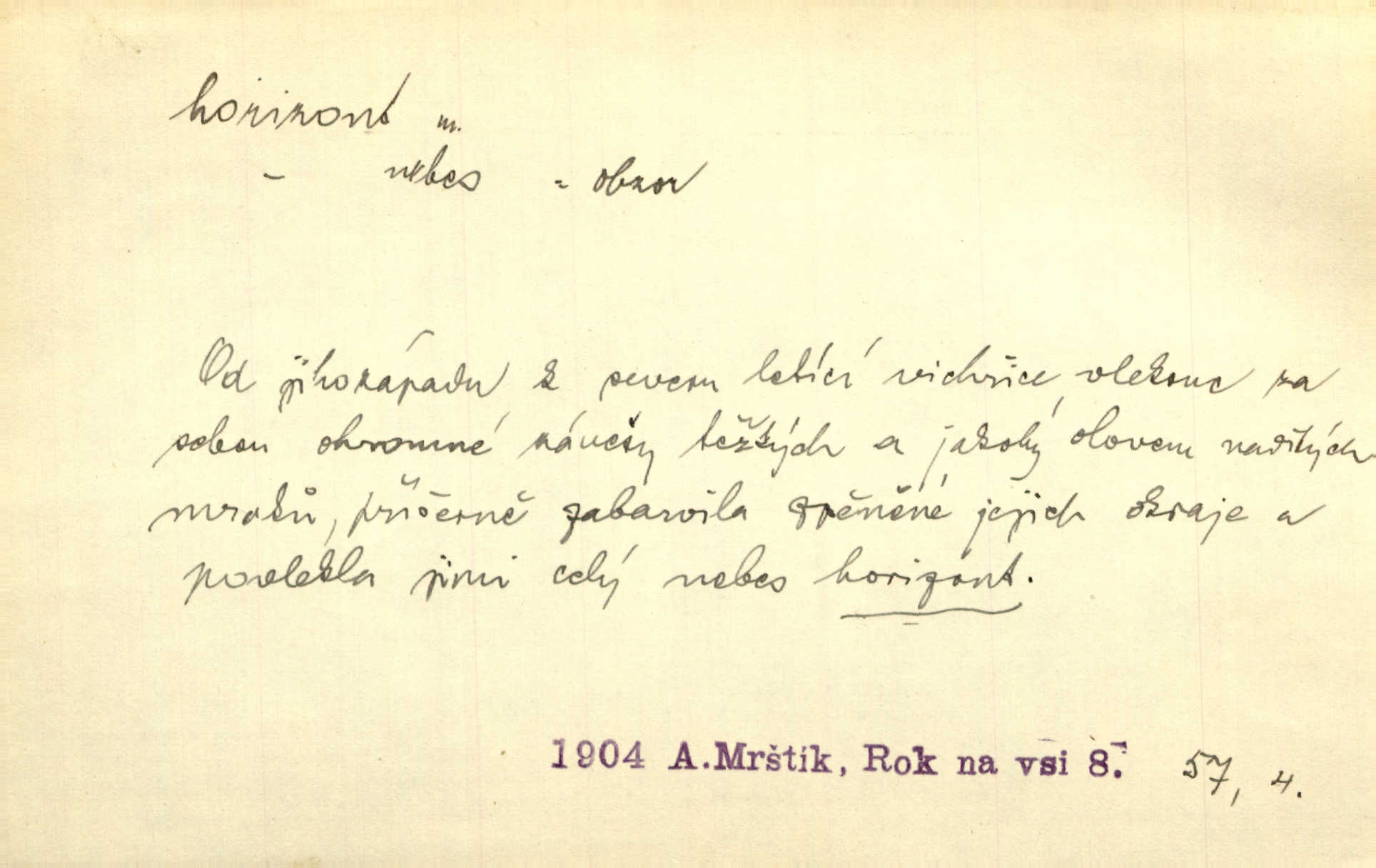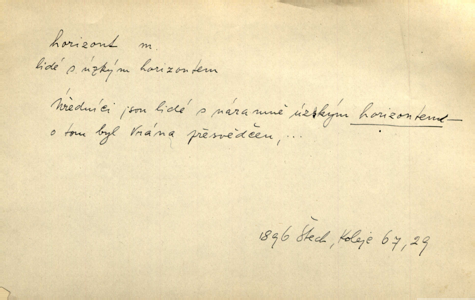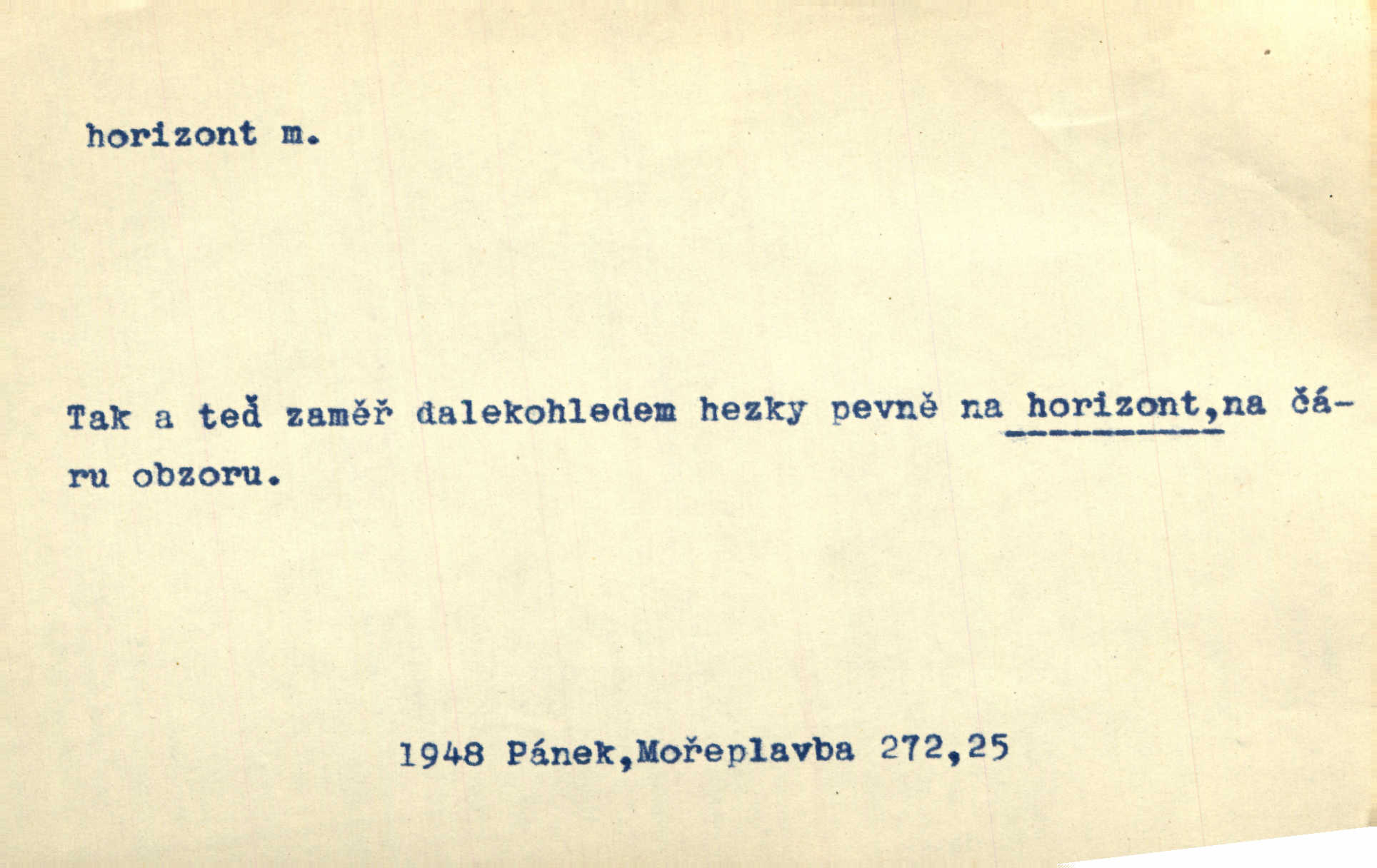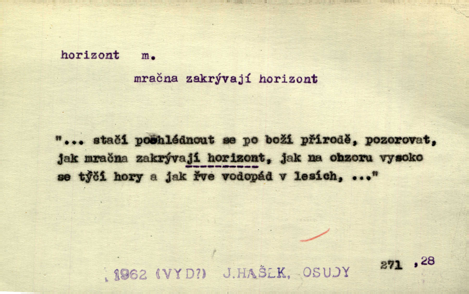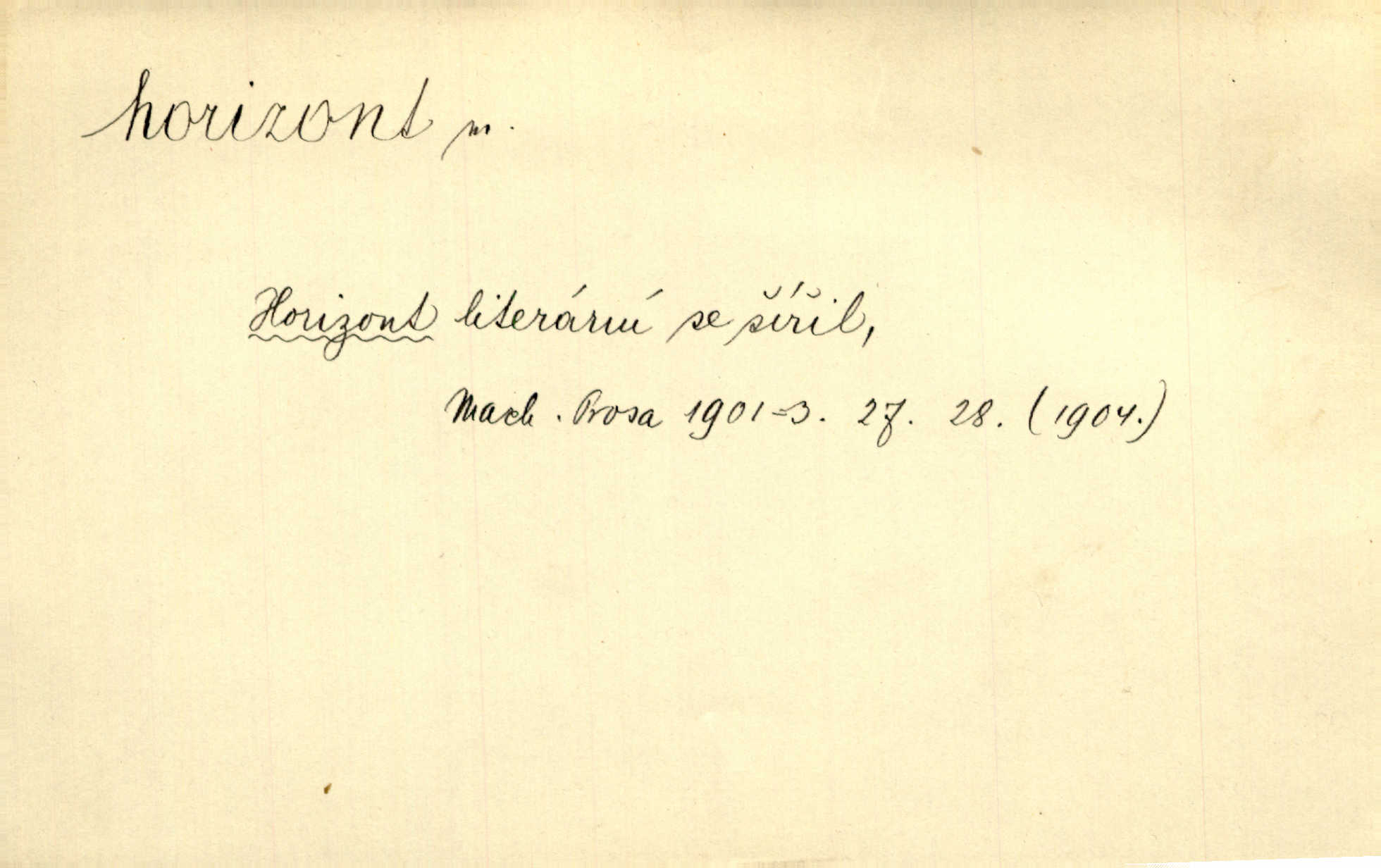 - horizont, -u m. povrch země a oblohy, který s nějakého stanoviska přehlížíme, obzor. Slunce stoupající výš a výše na horizontu. Her. Naposled člověk už neví, co je hora a co lehký oblak nahoře v horizontu. Mach. Za zdí a sloupořadím je viděti palestýnskou krajinu s velkým horizontem. Zey. Přen. Hálek snažil se otevříti poesii naší nové krajinné horizonty. Mach. Geol. vrstva hornin charakterisovaná přesně jistými zkamenělinami. Geom. v perspektivním zobrazování průsečík vodorovné roviny jdoucí okem se svislou rovinou obrazu. Geod. malá zrcadlící plocha k stanovení vodorovné roviny. Horizont umělý zrcadlo opatřené stavěcími šrouby a vodováhou. Horizont rtuťový zařízení, při němž se využívá vodorovné zrcadlící hladiny rtuti k stanovení vodorovné roviny. Horn. patro. Div. kulisy uzavírající pohled do hloubky jeviště. Kruhový horizont. D souhrn, soustava vědomostí a názorů, duševní obzor, duševní rozhled. Úředníci jsou lidé s náramně úzkým horizontem. Štech. No, no, mladíku, nesmíte hned ztratit horizont pozbýti rozvahy. Herrm. Jak velký horizont obepjat byl zde [u Sv. Čecha] diktátem tvůrčí vůle souverénní! Vrch. D výhled do budoucnosti. Změna děje se dle toho, jak politický horizont vypadá. Čas.