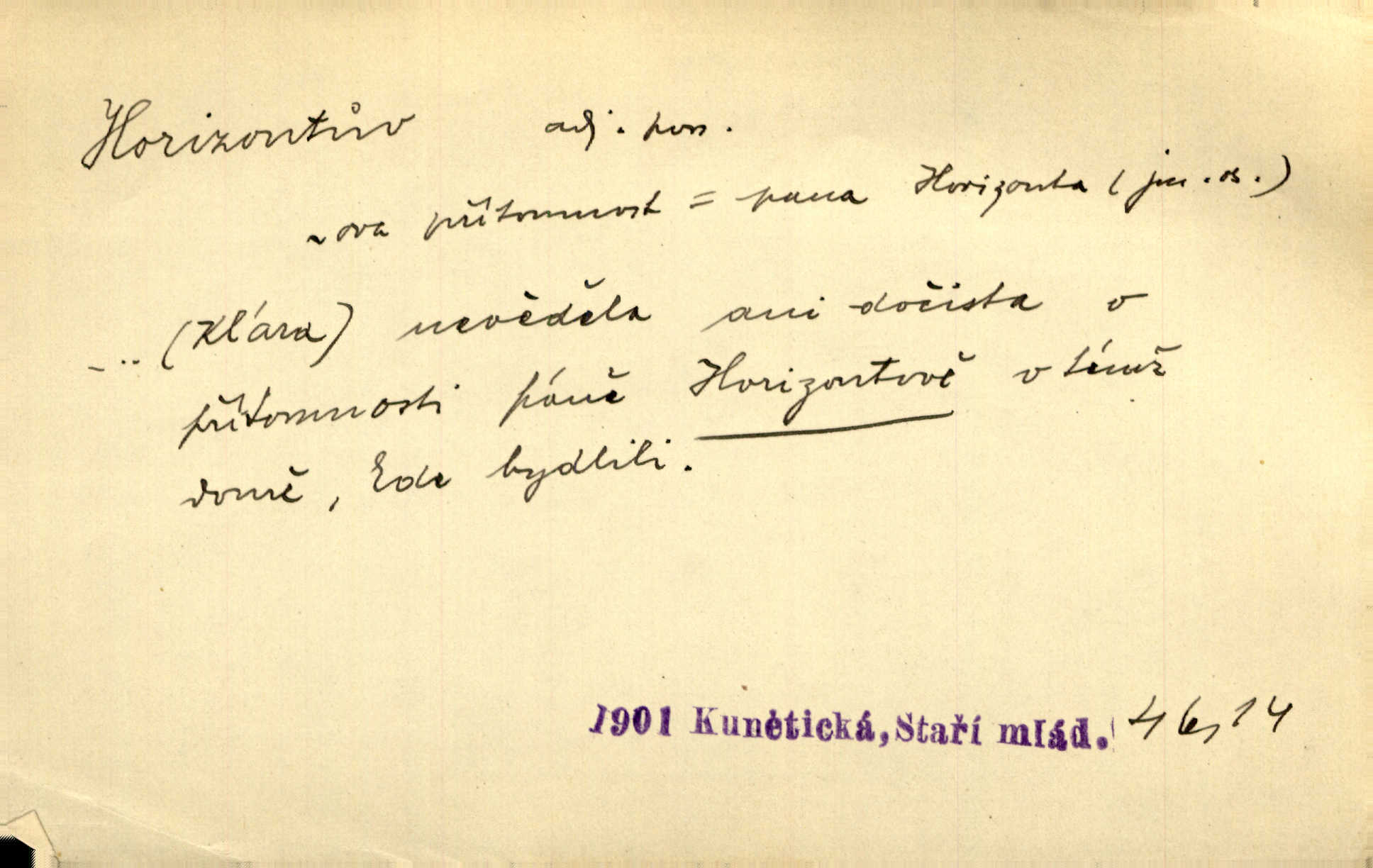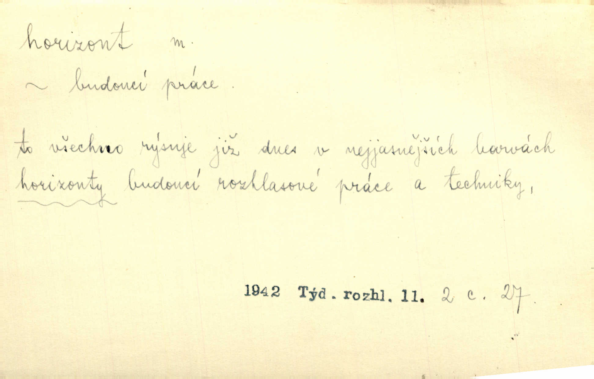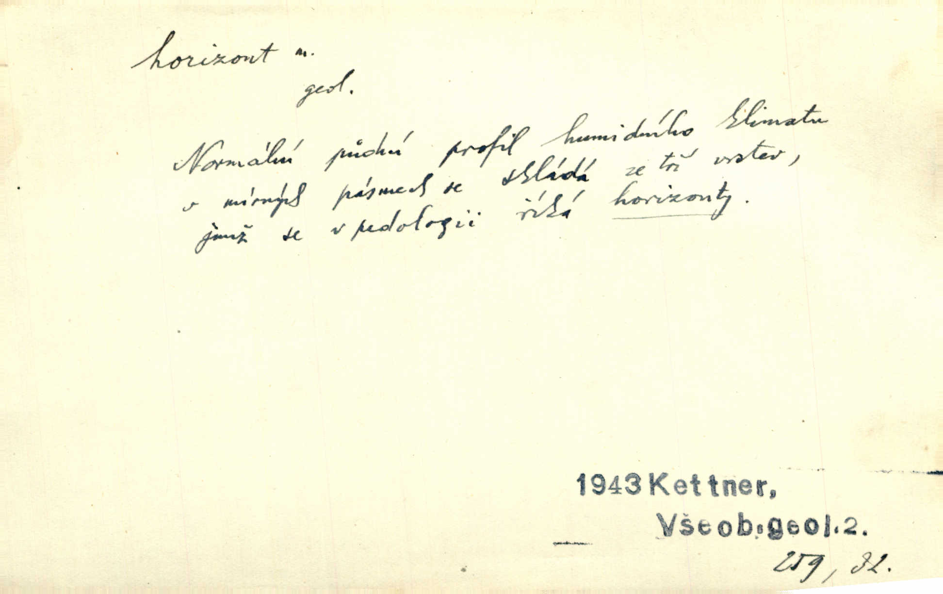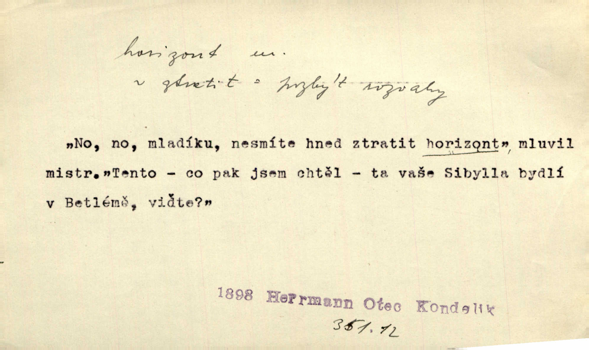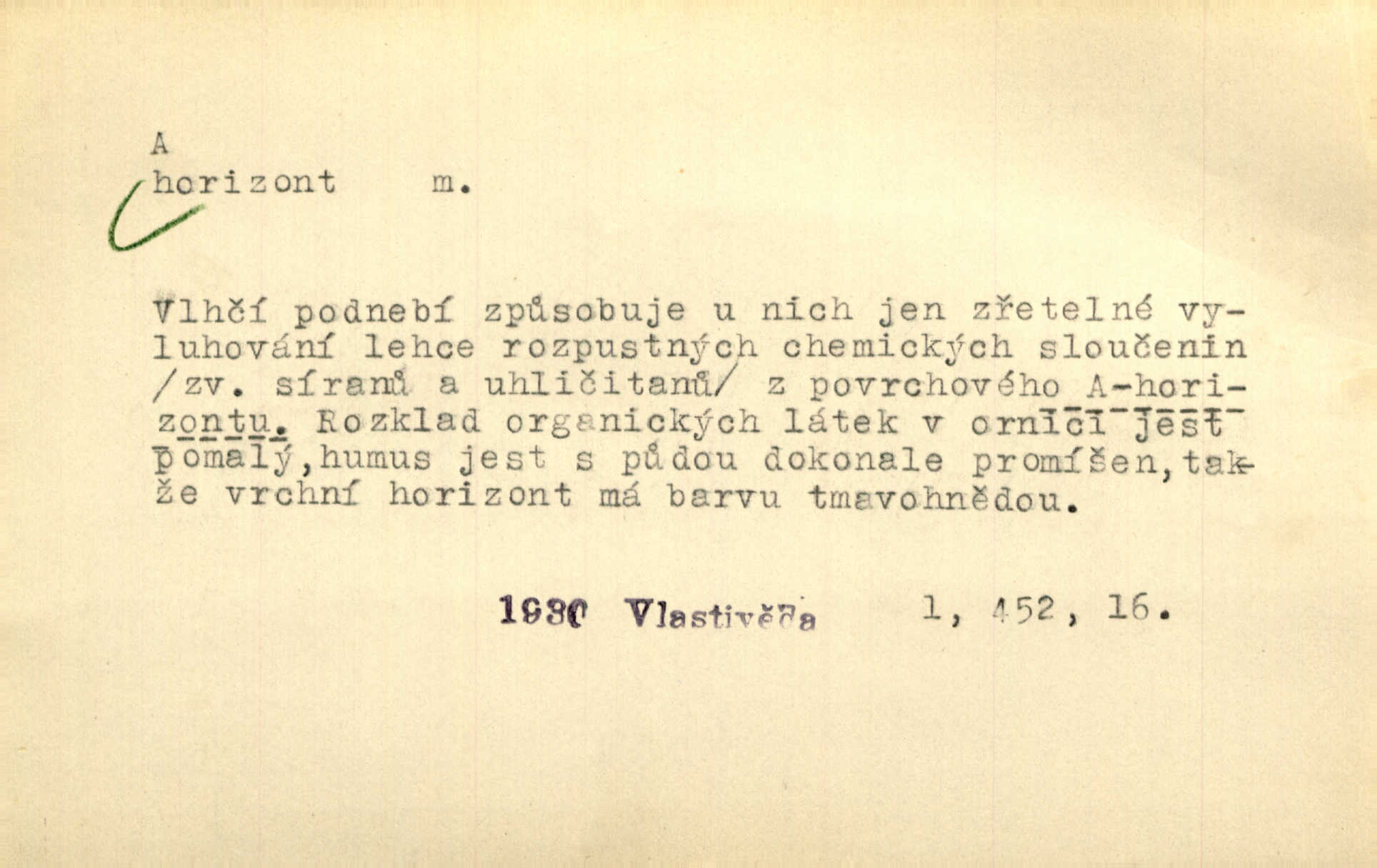 - horizont, -u m. povrch země a oblohy, který s nějakého stanoviska přehlížíme, obzor. Slunce stoupající výš a výše na horizontu. Her. Naposled člověk už neví, co je hora a co lehký oblak nahoře v horizontu. Mach. Za zdí a sloupořadím je viděti palestýnskou krajinu s velkým horizontem. Zey. Přen. Hálek snažil se otevříti poesii naší nové krajinné horizonty. Mach. Geol. vrstva hornin charakterisovaná přesně jistými zkamenělinami. Geom. v perspektivním zobrazování průsečík vodorovné roviny jdoucí okem se svislou rovinou obrazu. Geod. malá zrcadlící plocha k stanovení vodorovné roviny. Horizont umělý zrcadlo opatřené stavěcími šrouby a vodováhou. Horizont rtuťový zařízení, při němž se využívá vodorovné zrcadlící hladiny rtuti k stanovení vodorovné roviny. Horn. patro. Div. kulisy uzavírající pohled do hloubky jeviště. Kruhový horizont. D souhrn, soustava vědomostí a názorů, duševní obzor, duševní rozhled. Úředníci jsou lidé s náramně úzkým horizontem. Štech. No, no, mladíku, nesmíte hned ztratit horizont pozbýti rozvahy. Herrm. Jak velký horizont obepjat byl zde [u Sv. Čecha] diktátem tvůrčí vůle souverénní! Vrch. D výhled do budoucnosti. Změna děje se dle toho, jak politický horizont vypadá. Čas.
