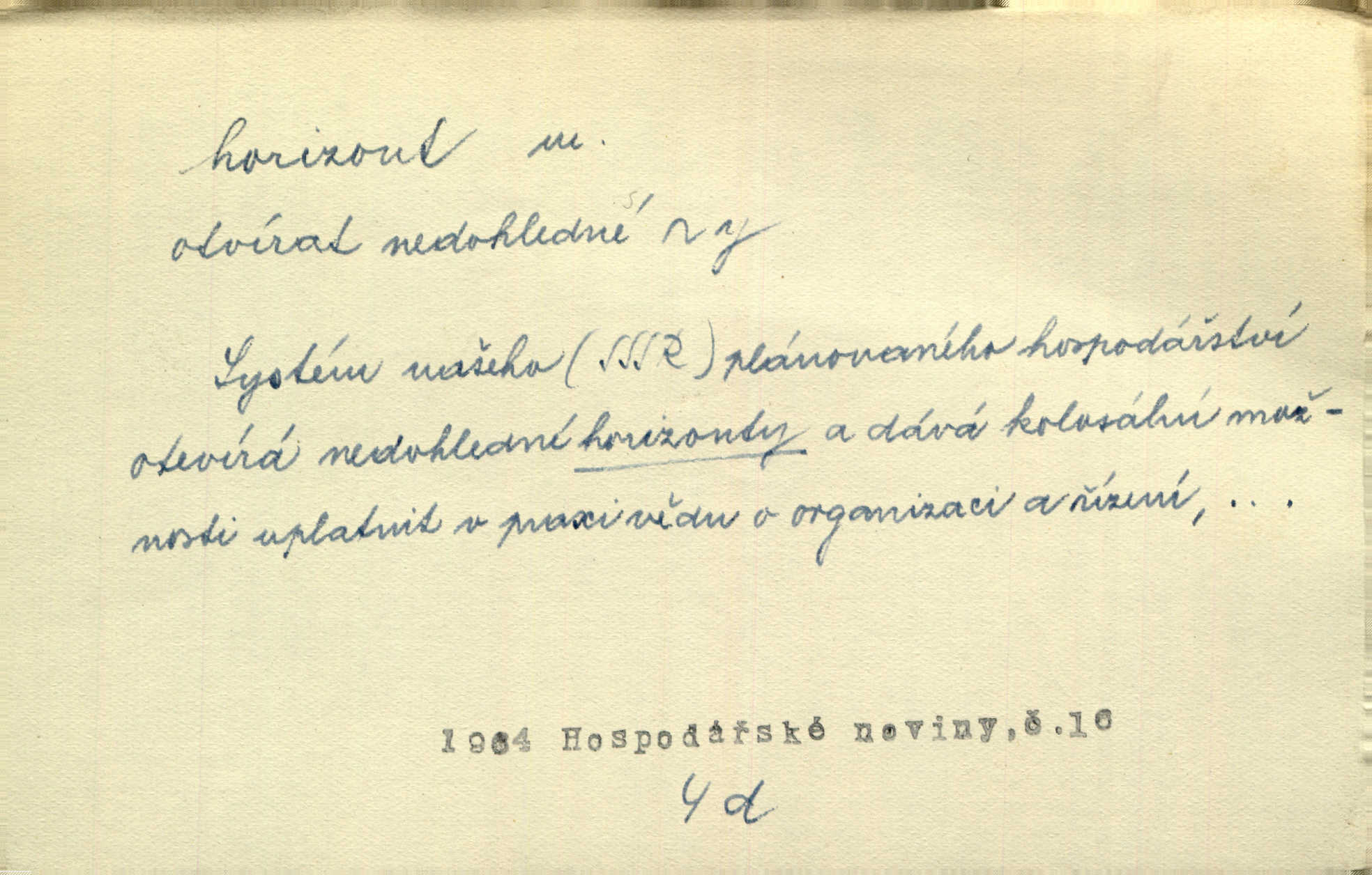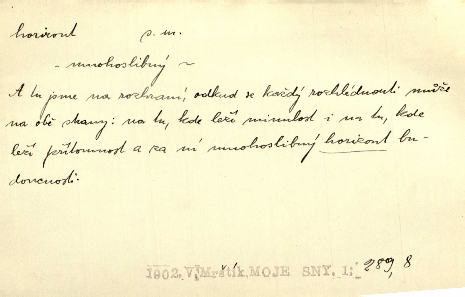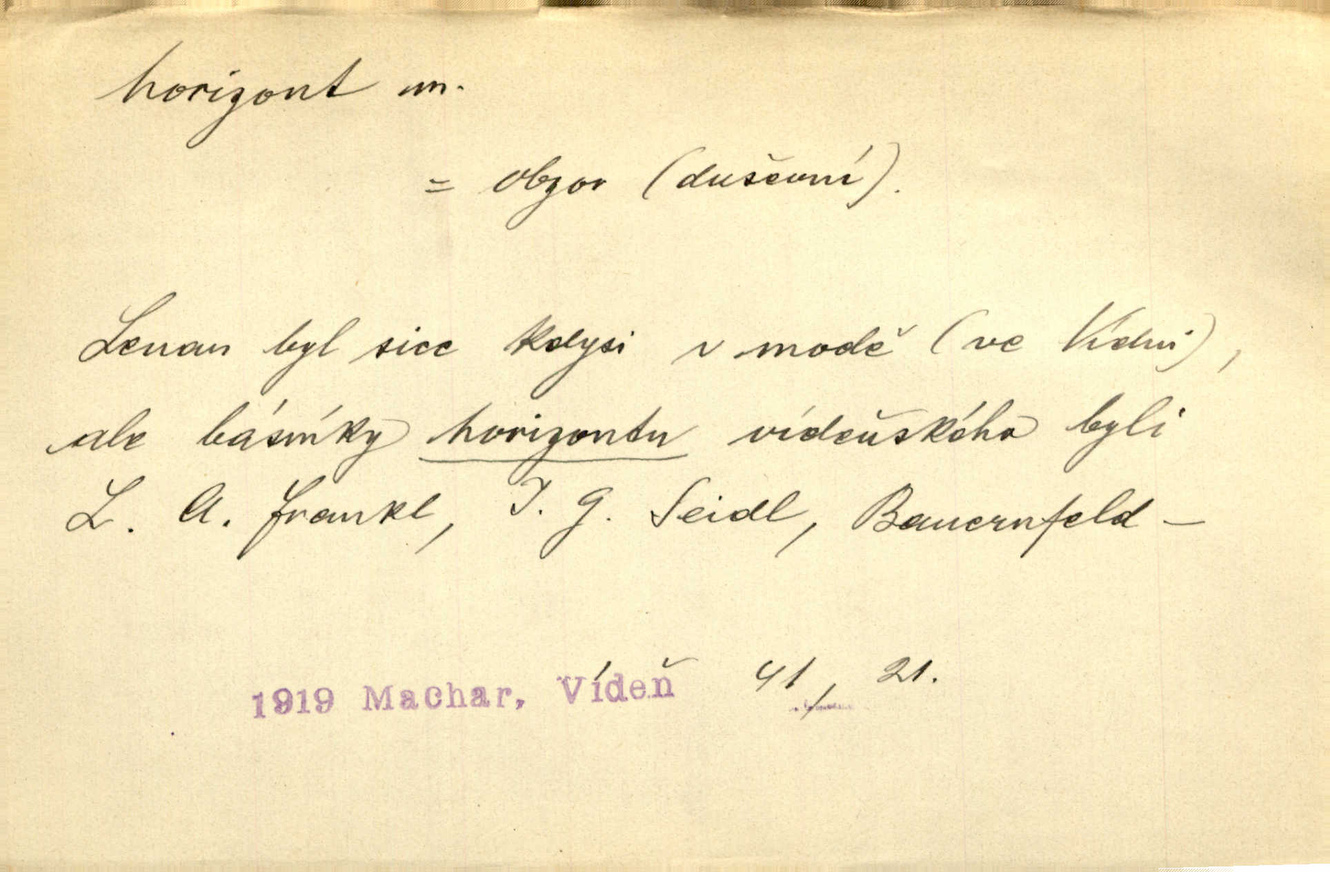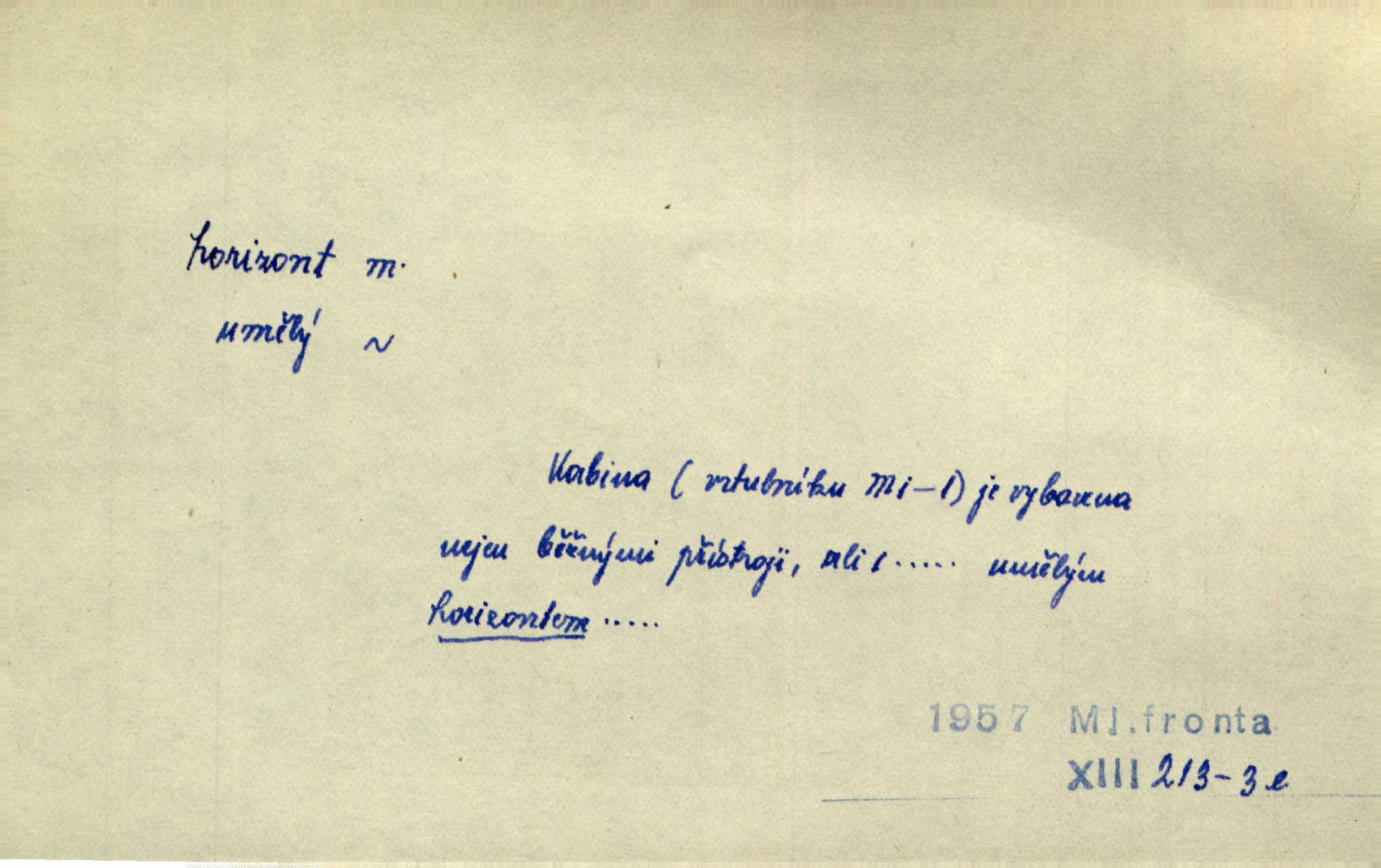 - horizont, -u m. povrch země a oblohy, který s nějakého stanoviska přehlížíme, obzor. Slunce stoupající výš a výše na horizontu. Her. Naposled člověk už neví, co je hora a co lehký oblak nahoře v horizontu. Mach. Za zdí a sloupořadím je viděti palestýnskou krajinu s velkým horizontem. Zey. Přen. Hálek snažil se otevříti poesii naší nové krajinné horizonty. Mach. Geol. vrstva hornin charakterisovaná přesně jistými zkamenělinami. Geom. v perspektivním zobrazování průsečík vodorovné roviny jdoucí okem se svislou rovinou obrazu. Geod. malá zrcadlící plocha k stanovení vodorovné roviny. Horizont umělý zrcadlo opatřené stavěcími šrouby a vodováhou. Horizont rtuťový zařízení, při němž se využívá vodorovné zrcadlící hladiny rtuti k stanovení vodorovné roviny. Horn. patro. Div. kulisy uzavírající pohled do hloubky jeviště. Kruhový horizont. D souhrn, soustava vědomostí a názorů, duševní obzor, duševní rozhled. Úředníci jsou lidé s náramně úzkým horizontem. Štech. No, no, mladíku, nesmíte hned ztratit horizont pozbýti rozvahy. Herrm. Jak velký horizont obepjat byl zde [u Sv. Čecha] diktátem tvůrčí vůle souverénní! Vrch. D výhled do budoucnosti. Změna děje se dle toho, jak politický horizont vypadá. Čas.