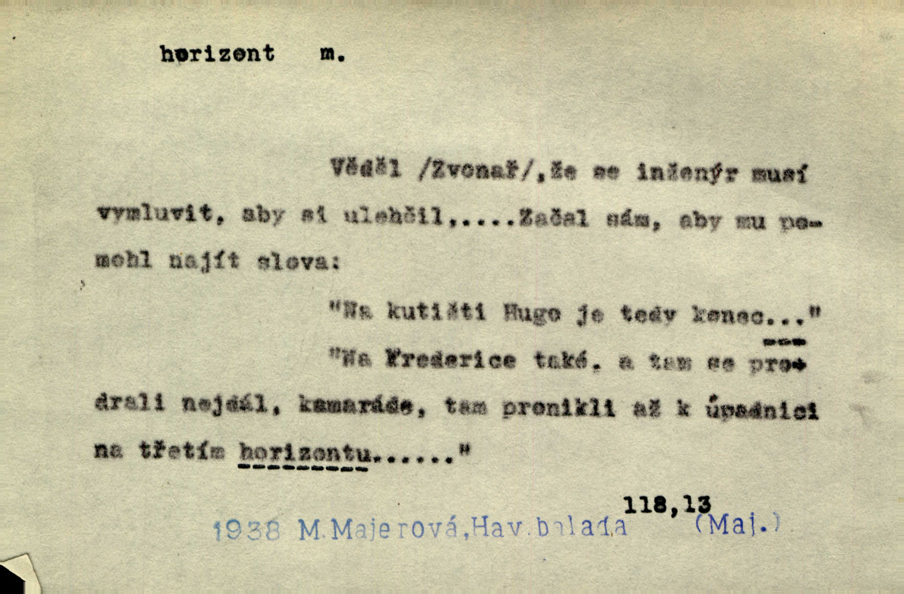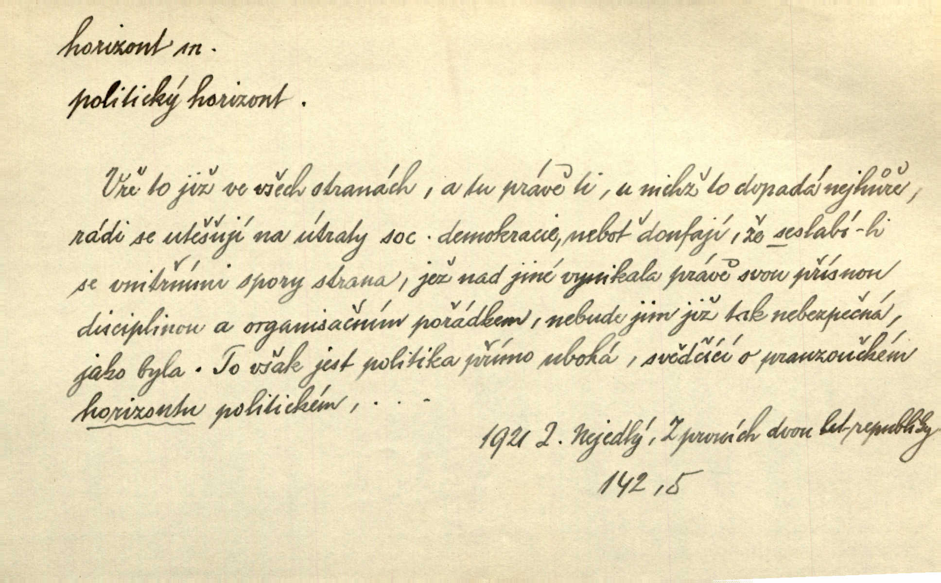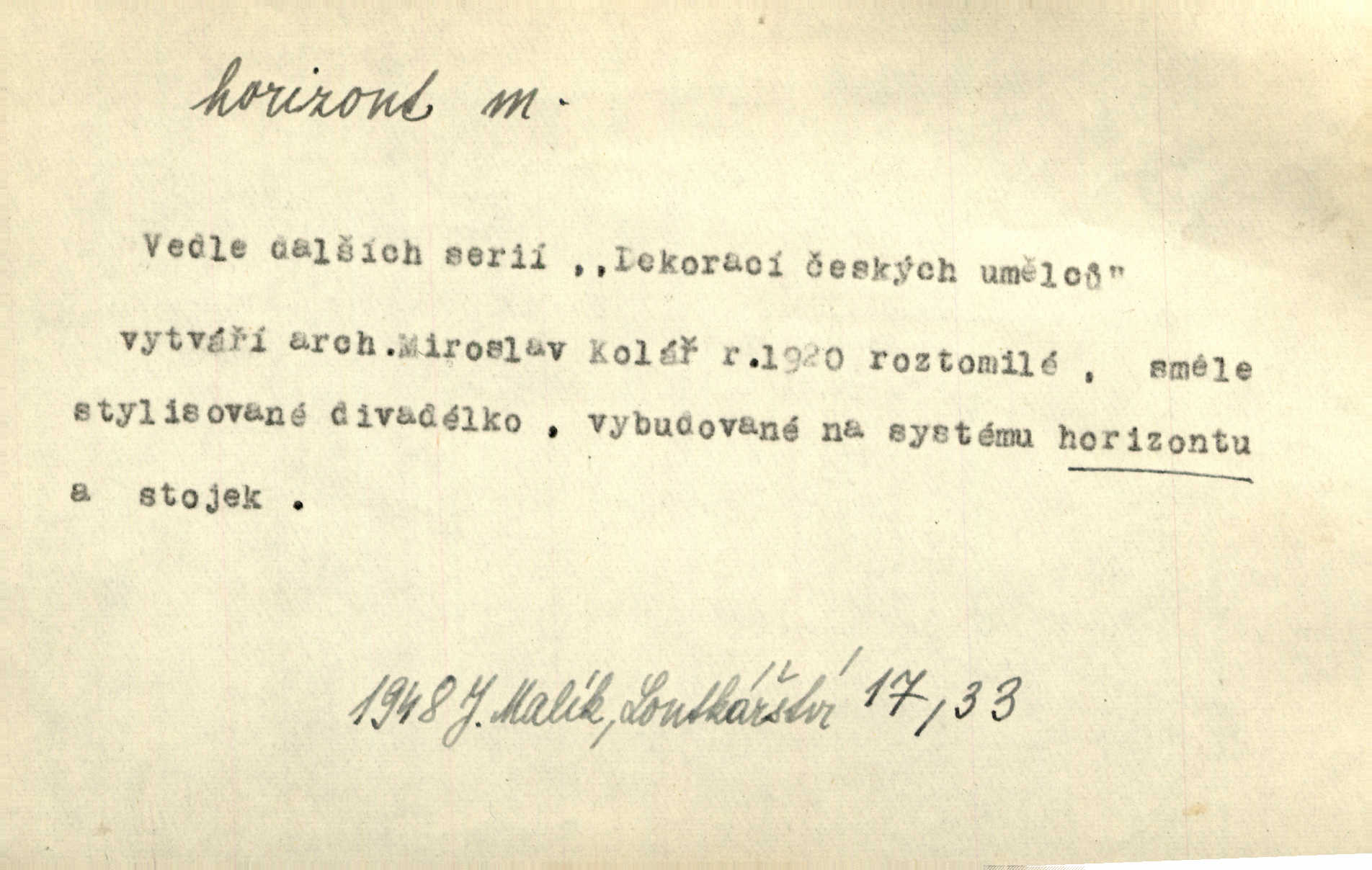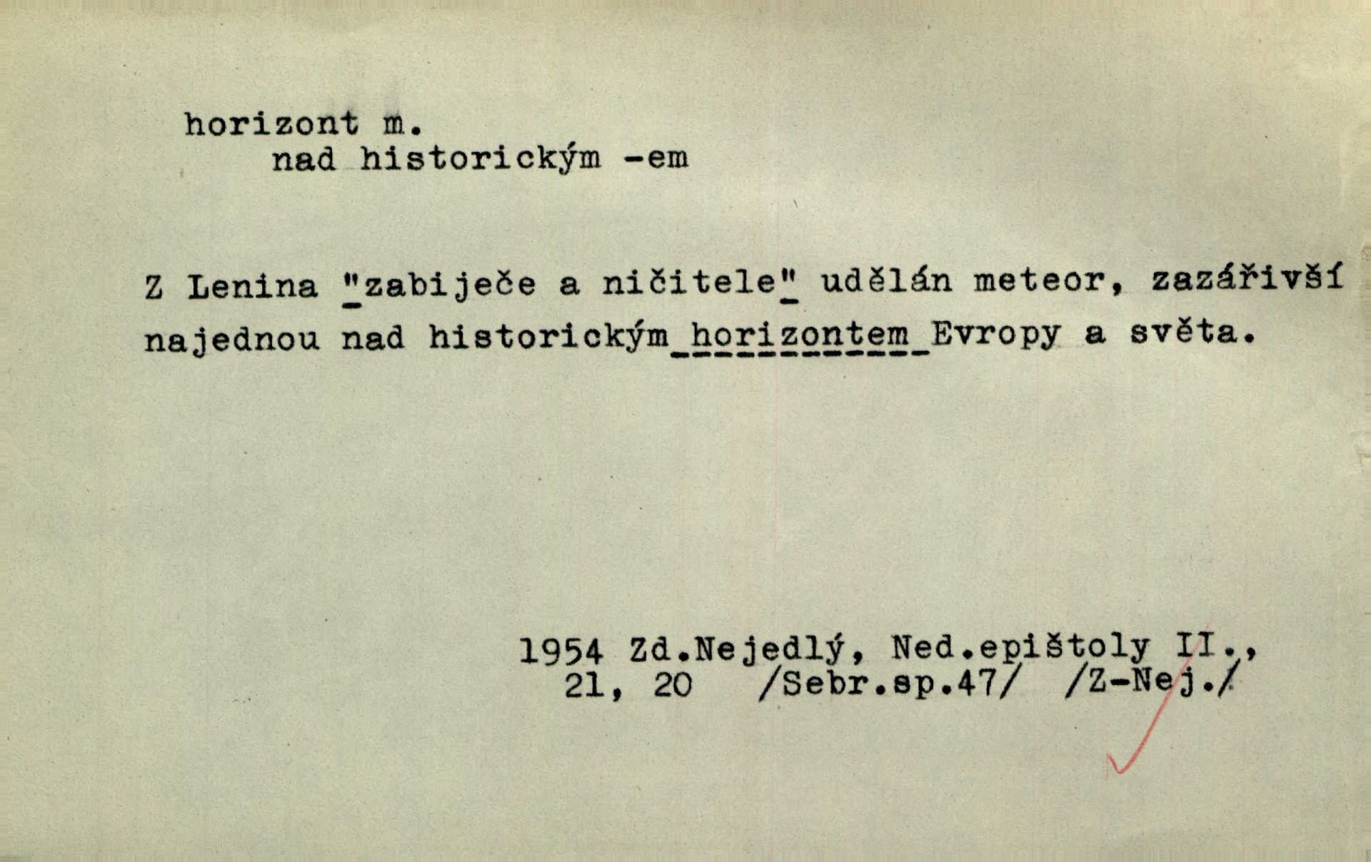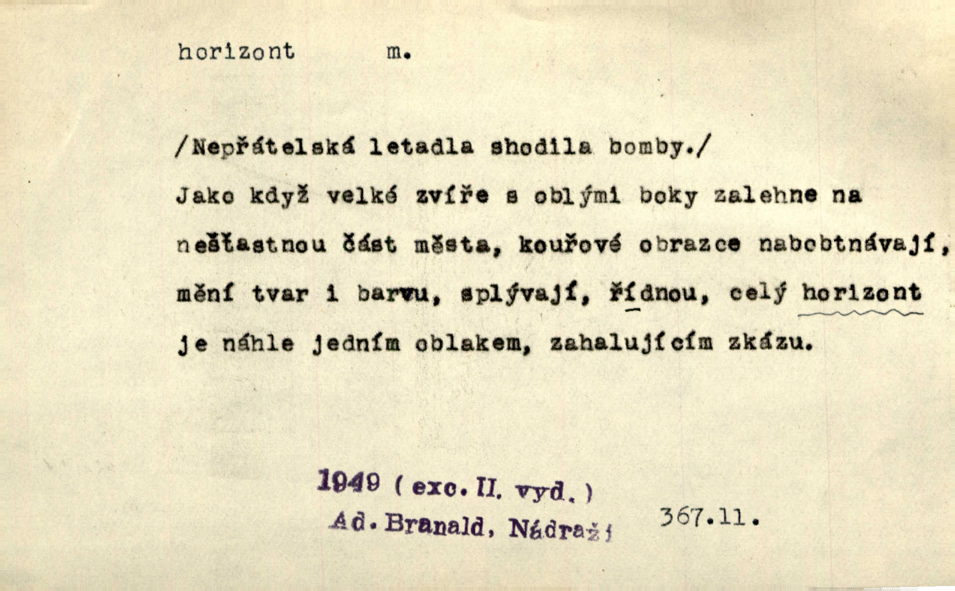 - horizont, -u m. povrch země a oblohy, který s nějakého stanoviska přehlížíme, obzor. Slunce stoupající výš a výše na horizontu. Her. Naposled člověk už neví, co je hora a co lehký oblak nahoře v horizontu. Mach. Za zdí a sloupořadím je viděti palestýnskou krajinu s velkým horizontem. Zey. Přen. Hálek snažil se otevříti poesii naší nové krajinné horizonty. Mach. Geol. vrstva hornin charakterisovaná přesně jistými zkamenělinami. Geom. v perspektivním zobrazování průsečík vodorovné roviny jdoucí okem se svislou rovinou obrazu. Geod. malá zrcadlící plocha k stanovení vodorovné roviny. Horizont umělý zrcadlo opatřené stavěcími šrouby a vodováhou. Horizont rtuťový zařízení, při němž se využívá vodorovné zrcadlící hladiny rtuti k stanovení vodorovné roviny. Horn. patro. Div. kulisy uzavírající pohled do hloubky jeviště. Kruhový horizont. D souhrn, soustava vědomostí a názorů, duševní obzor, duševní rozhled. Úředníci jsou lidé s náramně úzkým horizontem. Štech. No, no, mladíku, nesmíte hned ztratit horizont pozbýti rozvahy. Herrm. Jak velký horizont obepjat byl zde [u Sv. Čecha] diktátem tvůrčí vůle souverénní! Vrch. D výhled do budoucnosti. Změna děje se dle toho, jak politický horizont vypadá. Čas.