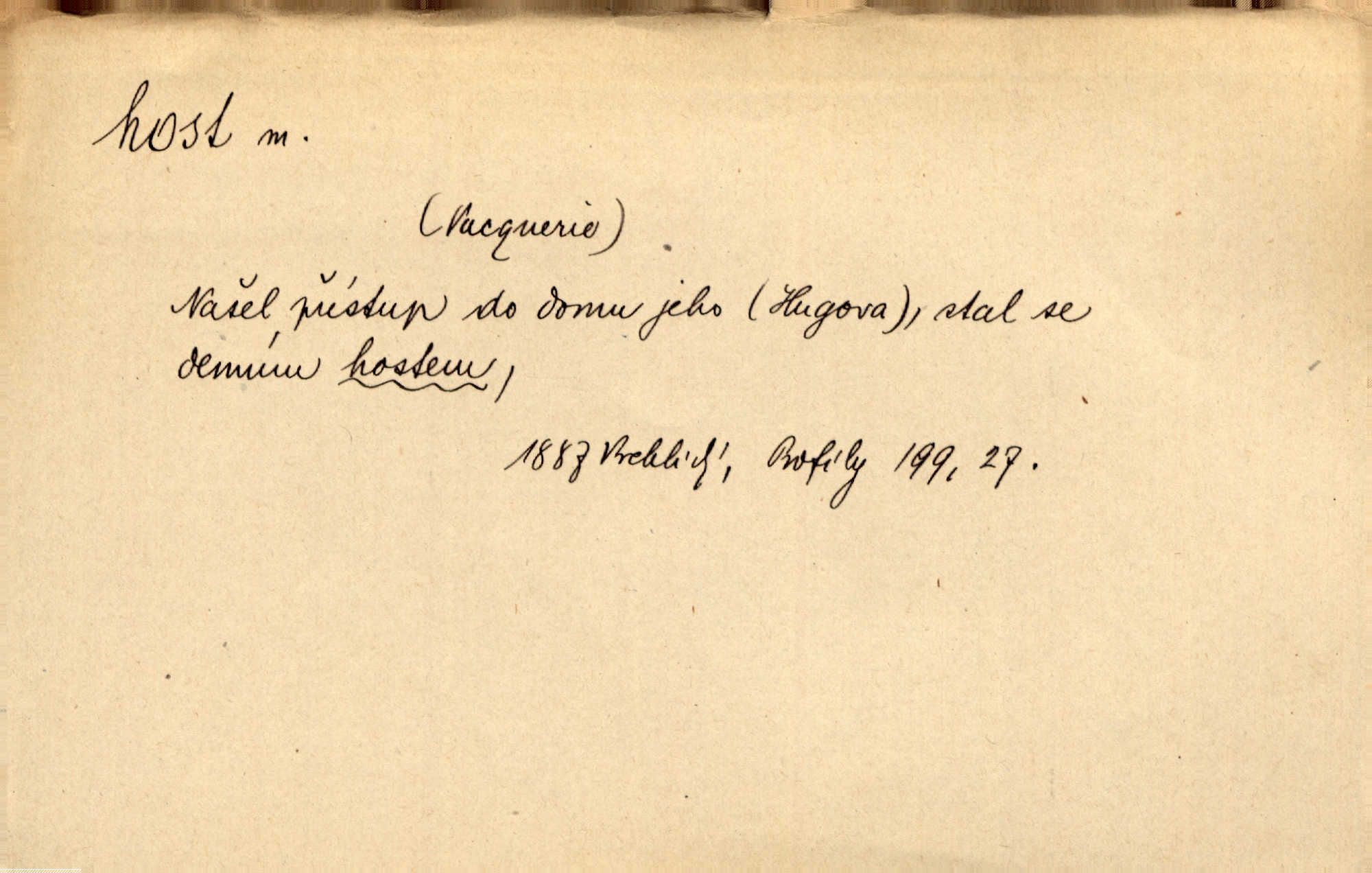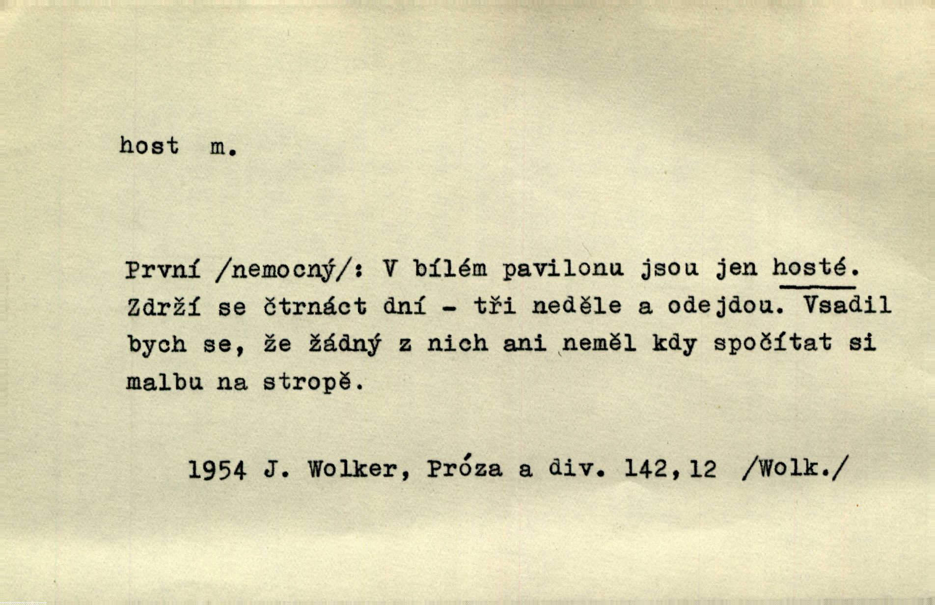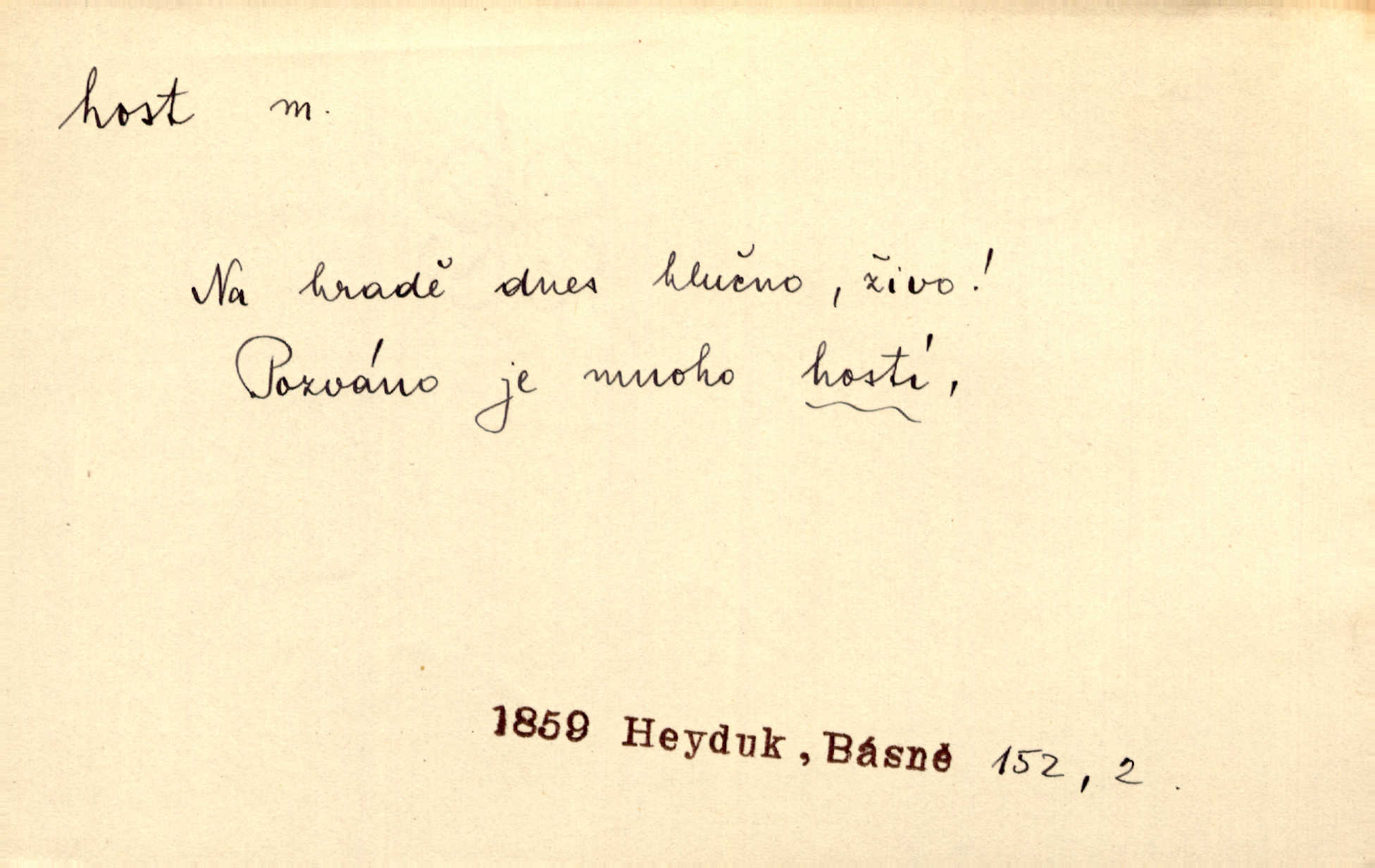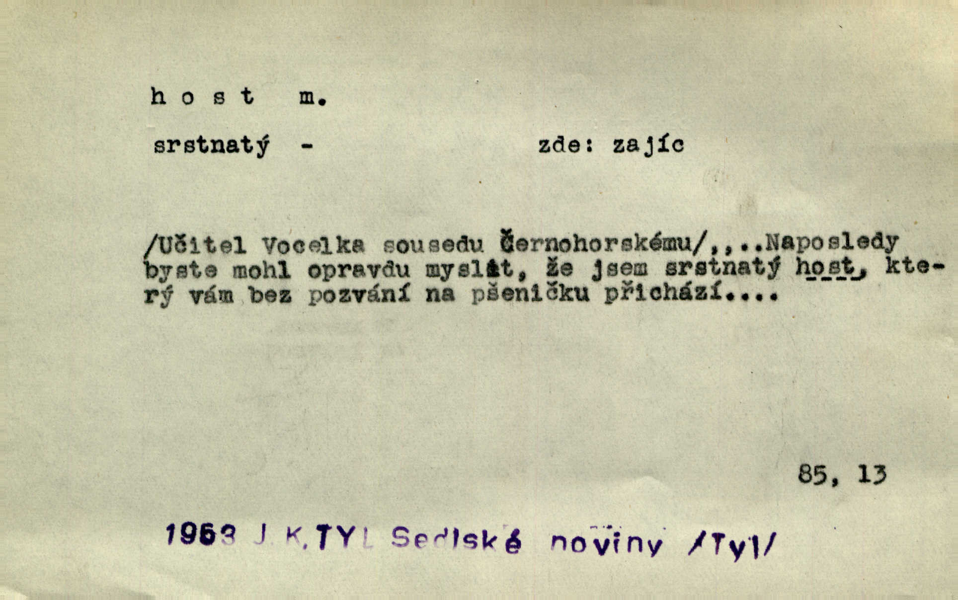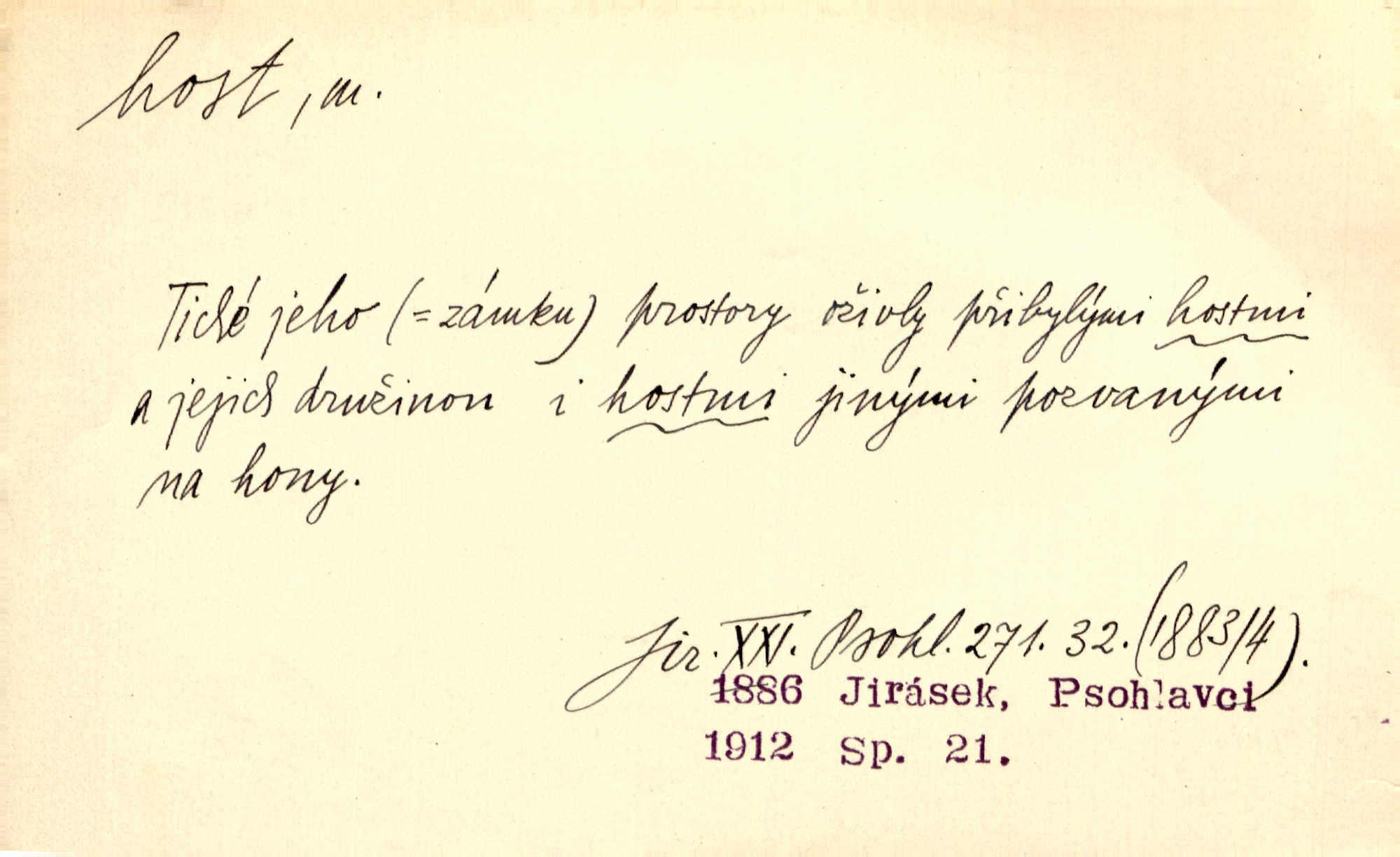 - host, -a m. (pl. hosté, ob. hosti, hostů, hostům, hosty, hostech, hosty; řidč. hostí, hosti, hostmi) příchozí na návštěvu, návštěvník, jemuž se obyčejně poskytuje na počest také pohostinství. Pan Prošek rád měl skleničku vína v domě pro hosta milého. Něm. Velmi rádi vidí [ruští kupci] u sebe hosty a přecpávají a přelívají je vším, co dům dá. Havl. Našel přístup [Vacquerie] do domu jeho [V. Huga], stal se denním hostem. Vrch. Kázal sezvati na třetí svatbu hosti. Havl. „Bože, to jsou k nám hosté, ženuško, náš nový pan domácí!“ Ner. V každé dobře vzdělané společnosti dává se hostům před domácími přednost. Havl. Host do domu, Bůh do domu. Host nezvaný nejmilejší. Staročeská byla ctnost: rád byl viděn v domě host. Host první den zlato, druhý stříbro, třetí měď. Ryba a host třetí den smrdí. Přísl. Přihlížel jsem právě co nezvaný host manipulaci se šatstvem [v zastavárně]. Ner. Býval doma pouze hostem a celé týdny trávil na cestách jako host, zřídka. Baar. Přednášky profesorů — hostů z jiné čsl. či cizí vysoké školy. Služ. min. škol. Div. umělec n. umělkyně účinkující v divadle, do jehož souboru nenáleží. V ústavě našem novém vystoupil první host. Ner. D příchozí, návštěvník v jistých výdělečných podnicích (kde se lze stravovati nebo i bydliti: v hostincích, hotelích, kavárnách, lázních). Nerad ublíží kuřeti [hostinský] a nerad si také hosty odrazí. Něm. Večer zasedali kol jediného dlouhého stolu [v hostinci] kmenoví hosté. Šim. V kavárně bylo málo hostů. Čech. Lázeňští hosté procházeli se. Pfleg. D Kniž. příchozí někam vůbec (často i nevítaný). Byli [studenti] zajisté vzácní hosté v těchto končinách [křivoklátských lesích]. Jir. Starý Petráš — Cihlářka a stará Rybářka — denní hosté svatého domu. A. Mrš. Jsme tu [na světě] každý jenom host pobudeme nakrátce. Obr. živ. Když uhodily mrazy, oživlo okolí osamělého dvora nevítanými hosty. Vlci se pouštěli až k jeho ohradě. Jir. Čeládce se neplatí [u Podivů] mzda, daně se neodvádějí pořádně, exekutor bývá u nich častým hostem. Prav. Hum. Vyhlídka omezovala se na zahradu, uzavřenou vysokou zdi proti nepovolaným hostům zlodějům. Svob. Dny nevýslovně smutné přišly na Vrbickou faru. Usadil se v ní zlý host: nemoc. Baar. Hlad, nejhorší to host všech obyvatelů horských. Pfleg. Sníh a mráz jsou tu [v Orlických horách] časným hostem. Jir. Uklidíme hned všecko zlému hostu [blížící se povodni] z cesty. Něm. Lyrika je řídkým hostem na venkově a děvčata rozumějí jí velmi málo. Vrba.
