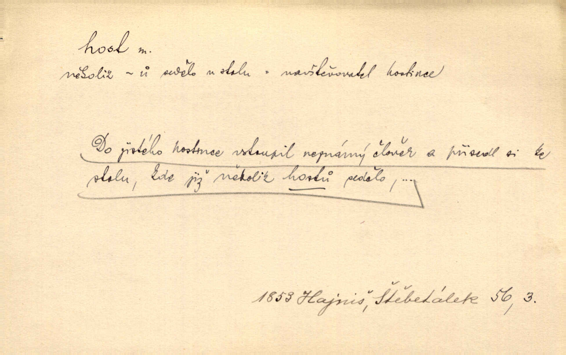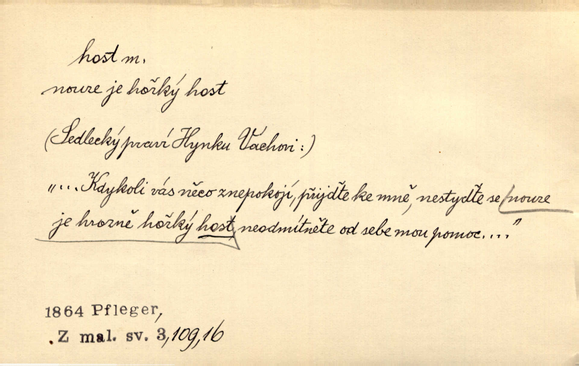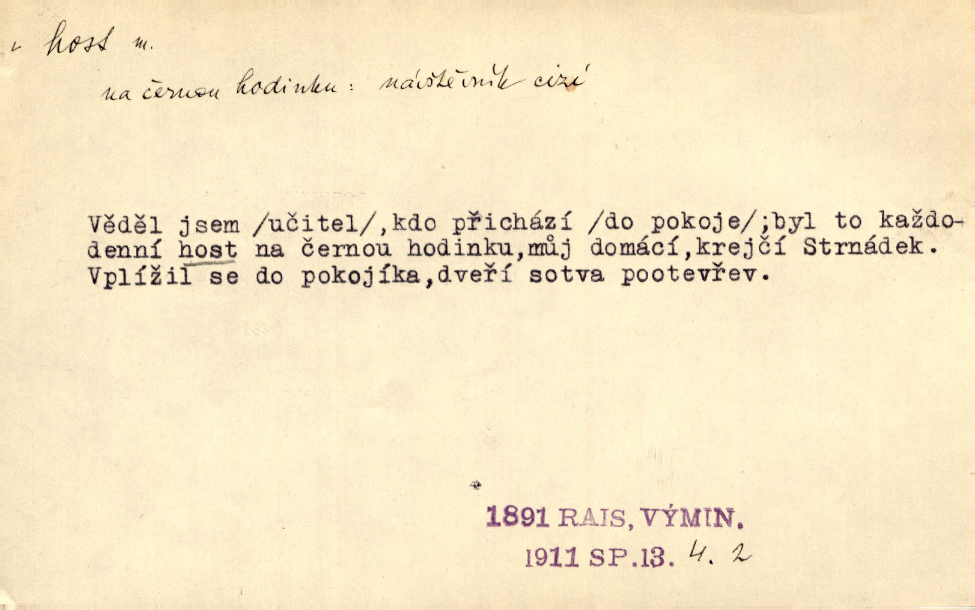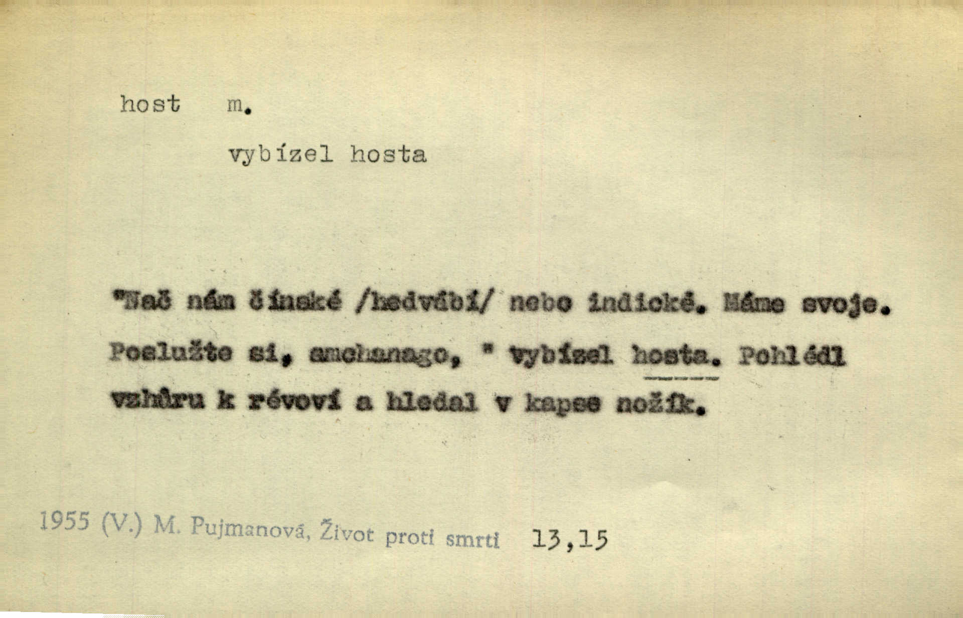 - host, -a m. (pl. hosté, ob. hosti, hostů, hostům, hosty, hostech, hosty; řidč. hostí, hosti, hostmi) příchozí na návštěvu, návštěvník, jemuž se obyčejně poskytuje na počest také pohostinství. Pan Prošek rád měl skleničku vína v domě pro hosta milého. Něm. Velmi rádi vidí [ruští kupci] u sebe hosty a přecpávají a přelívají je vším, co dům dá. Havl. Našel přístup [Vacquerie] do domu jeho [V. Huga], stal se denním hostem. Vrch. Kázal sezvati na třetí svatbu hosti. Havl. „Bože, to jsou k nám hosté, ženuško, náš nový pan domácí!“ Ner. V každé dobře vzdělané společnosti dává se hostům před domácími přednost. Havl. Host do domu, Bůh do domu. Host nezvaný nejmilejší. Staročeská byla ctnost: rád byl viděn v domě host. Host první den zlato, druhý stříbro, třetí měď. Ryba a host třetí den smrdí. Přísl. Přihlížel jsem právě co nezvaný host manipulaci se šatstvem [v zastavárně]. Ner. Býval doma pouze hostem a celé týdny trávil na cestách jako host, zřídka. Baar. Přednášky profesorů — hostů z jiné čsl. či cizí vysoké školy. Služ. min. škol. Div. umělec n. umělkyně účinkující v divadle, do jehož souboru nenáleží. V ústavě našem novém vystoupil první host. Ner. D příchozí, návštěvník v jistých výdělečných podnicích (kde se lze stravovati nebo i bydliti: v hostincích, hotelích, kavárnách, lázních). Nerad ublíží kuřeti [hostinský] a nerad si také hosty odrazí. Něm. Večer zasedali kol jediného dlouhého stolu [v hostinci] kmenoví hosté. Šim. V kavárně bylo málo hostů. Čech. Lázeňští hosté procházeli se. Pfleg. D Kniž. příchozí někam vůbec (často i nevítaný). Byli [studenti] zajisté vzácní hosté v těchto končinách [křivoklátských lesích]. Jir. Starý Petráš — Cihlářka a stará Rybářka — denní hosté svatého domu. A. Mrš. Jsme tu [na světě] každý jenom host pobudeme nakrátce. Obr. živ. Když uhodily mrazy, oživlo okolí osamělého dvora nevítanými hosty. Vlci se pouštěli až k jeho ohradě. Jir. Čeládce se neplatí [u Podivů] mzda, daně se neodvádějí pořádně, exekutor bývá u nich častým hostem. Prav. Hum. Vyhlídka omezovala se na zahradu, uzavřenou vysokou zdi proti nepovolaným hostům zlodějům. Svob. Dny nevýslovně smutné přišly na Vrbickou faru. Usadil se v ní zlý host: nemoc. Baar. Hlad, nejhorší to host všech obyvatelů horských. Pfleg. Sníh a mráz jsou tu [v Orlických horách] časným hostem. Jir. Uklidíme hned všecko zlému hostu [blížící se povodni] z cesty. Něm. Lyrika je řídkým hostem na venkově a děvčata rozumějí jí velmi málo. Vrba.