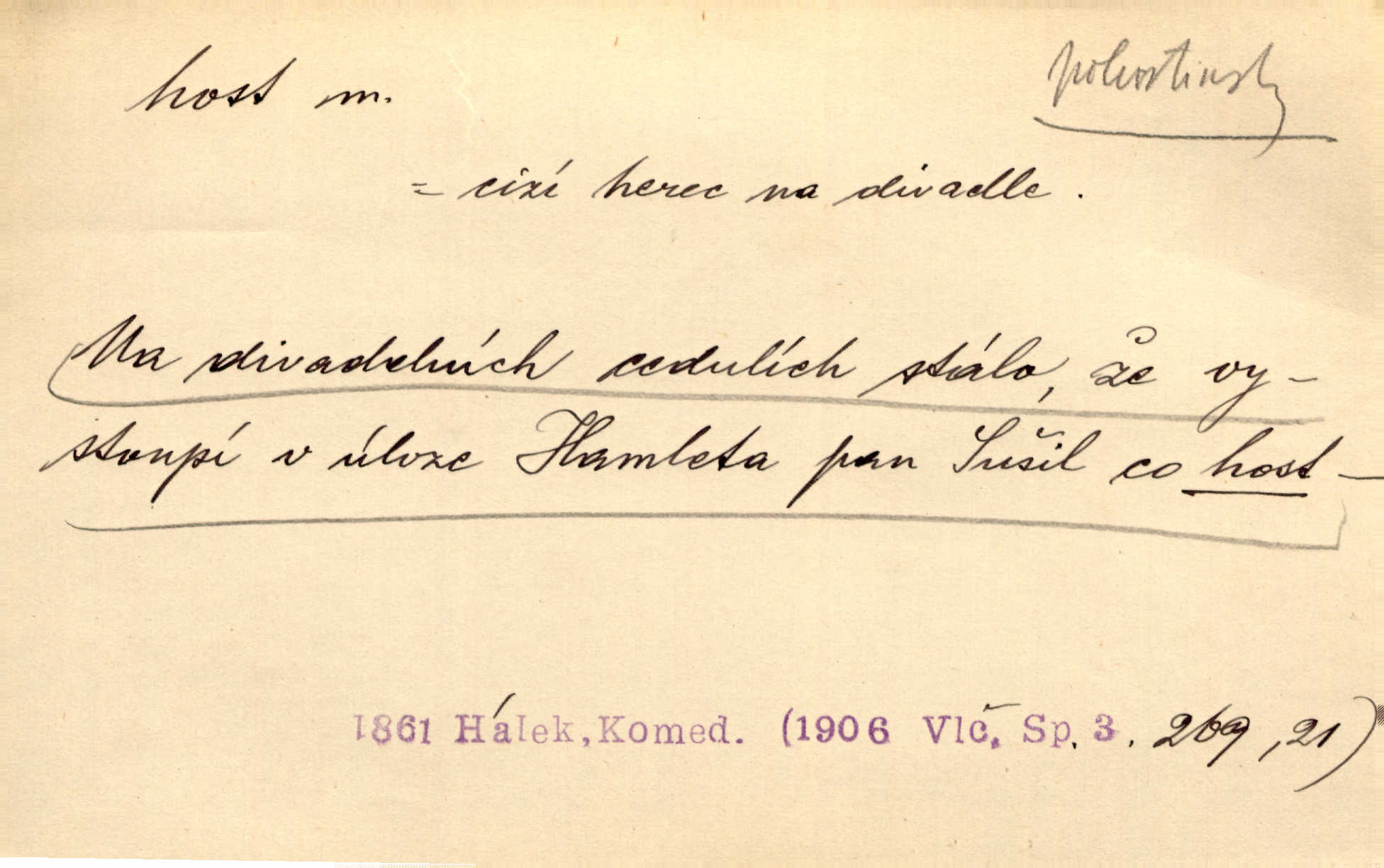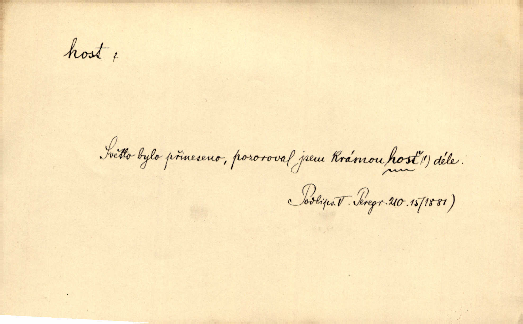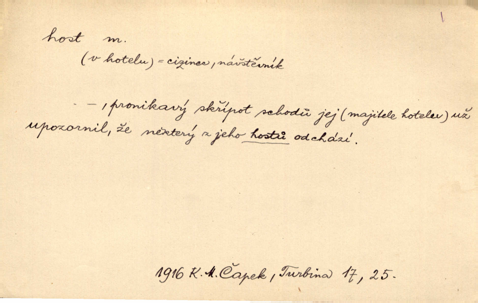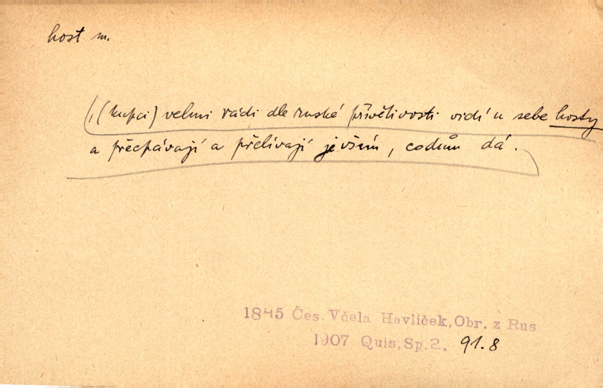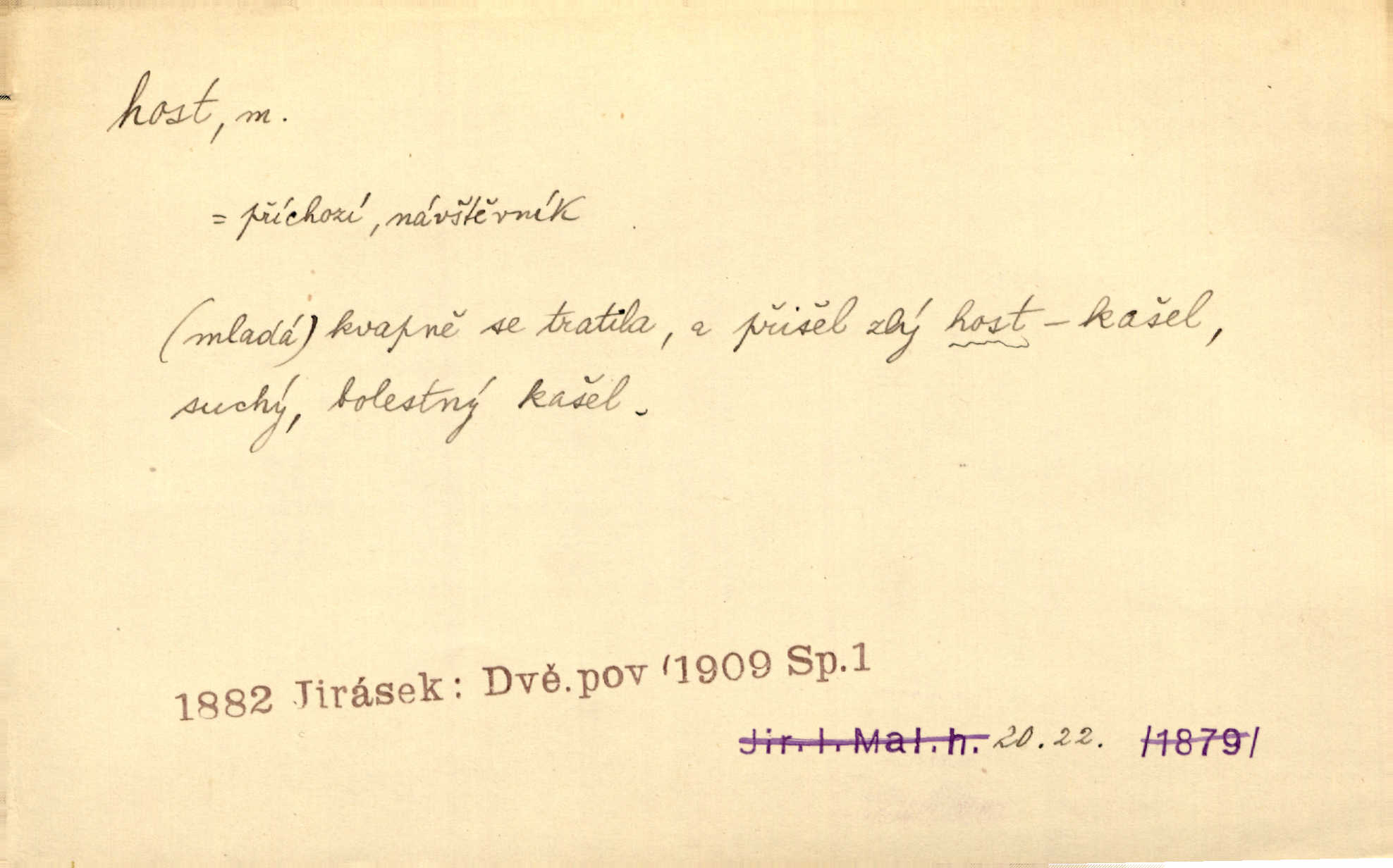 - host, -a m. (pl. hosté, ob. hosti, hostů, hostům, hosty, hostech, hosty; řidč. hostí, hosti, hostmi) příchozí na návštěvu, návštěvník, jemuž se obyčejně poskytuje na počest také pohostinství. Pan Prošek rád měl skleničku vína v domě pro hosta milého. Něm. Velmi rádi vidí [ruští kupci] u sebe hosty a přecpávají a přelívají je vším, co dům dá. Havl. Našel přístup [Vacquerie] do domu jeho [V. Huga], stal se denním hostem. Vrch. Kázal sezvati na třetí svatbu hosti. Havl. „Bože, to jsou k nám hosté, ženuško, náš nový pan domácí!“ Ner. V každé dobře vzdělané společnosti dává se hostům před domácími přednost. Havl. Host do domu, Bůh do domu. Host nezvaný nejmilejší. Staročeská byla ctnost: rád byl viděn v domě host. Host první den zlato, druhý stříbro, třetí měď. Ryba a host třetí den smrdí. Přísl. Přihlížel jsem právě co nezvaný host manipulaci se šatstvem [v zastavárně]. Ner. Býval doma pouze hostem a celé týdny trávil na cestách jako host, zřídka. Baar. Přednášky profesorů — hostů z jiné čsl. či cizí vysoké školy. Služ. min. škol. Div. umělec n. umělkyně účinkující v divadle, do jehož souboru nenáleží. V ústavě našem novém vystoupil první host. Ner. D příchozí, návštěvník v jistých výdělečných podnicích (kde se lze stravovati nebo i bydliti: v hostincích, hotelích, kavárnách, lázních). Nerad ublíží kuřeti [hostinský] a nerad si také hosty odrazí. Něm. Večer zasedali kol jediného dlouhého stolu [v hostinci] kmenoví hosté. Šim. V kavárně bylo málo hostů. Čech. Lázeňští hosté procházeli se. Pfleg. D Kniž. příchozí někam vůbec (často i nevítaný). Byli [studenti] zajisté vzácní hosté v těchto končinách [křivoklátských lesích]. Jir. Starý Petráš — Cihlářka a stará Rybářka — denní hosté svatého domu. A. Mrš. Jsme tu [na světě] každý jenom host pobudeme nakrátce. Obr. živ. Když uhodily mrazy, oživlo okolí osamělého dvora nevítanými hosty. Vlci se pouštěli až k jeho ohradě. Jir. Čeládce se neplatí [u Podivů] mzda, daně se neodvádějí pořádně, exekutor bývá u nich častým hostem. Prav. Hum. Vyhlídka omezovala se na zahradu, uzavřenou vysokou zdi proti nepovolaným hostům zlodějům. Svob. Dny nevýslovně smutné přišly na Vrbickou faru. Usadil se v ní zlý host: nemoc. Baar. Hlad, nejhorší to host všech obyvatelů horských. Pfleg. Sníh a mráz jsou tu [v Orlických horách] časným hostem. Jir. Uklidíme hned všecko zlému hostu [blížící se povodni] z cesty. Něm. Lyrika je řídkým hostem na venkově a děvčata rozumějí jí velmi málo. Vrba.