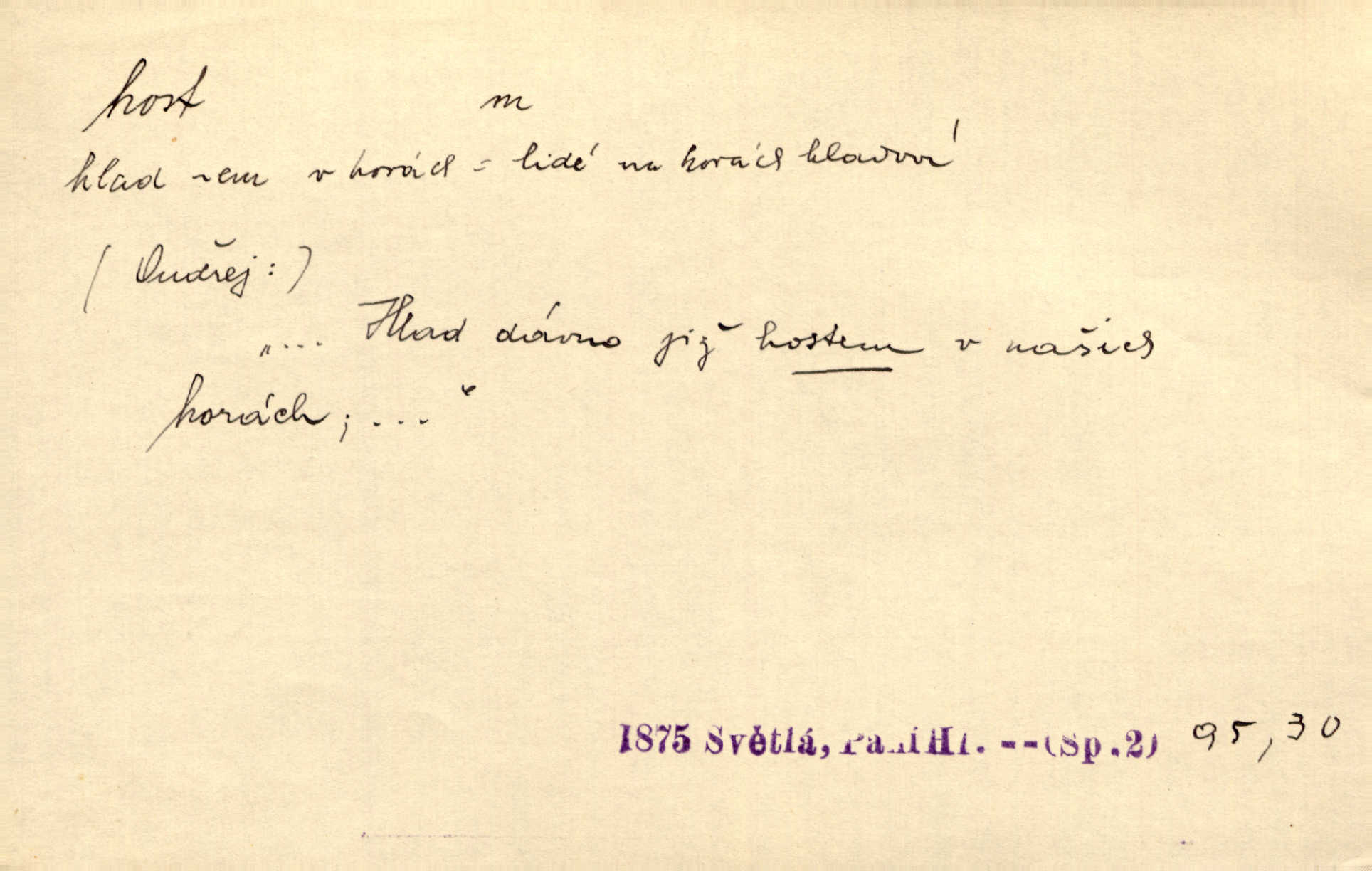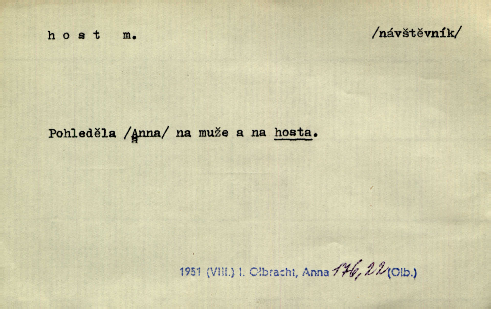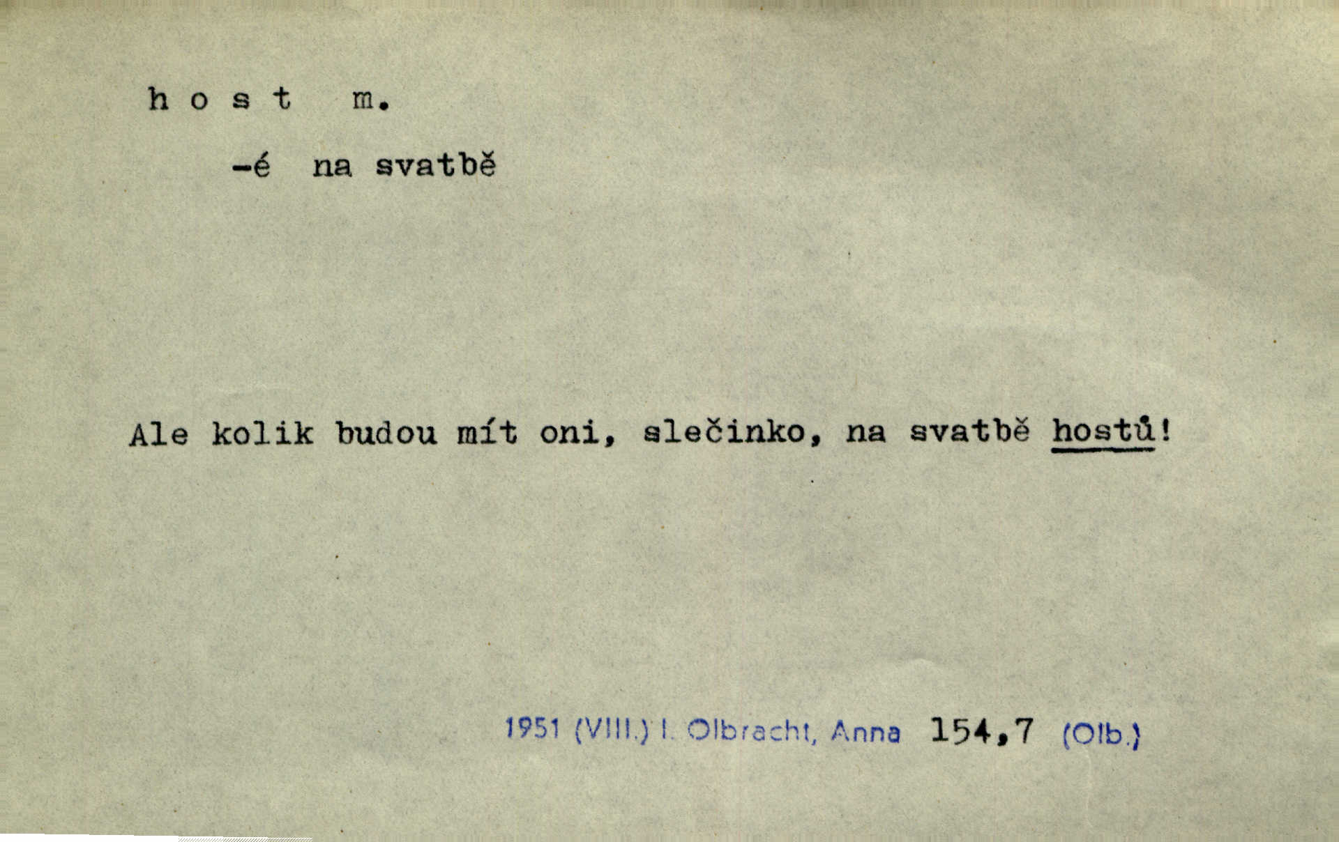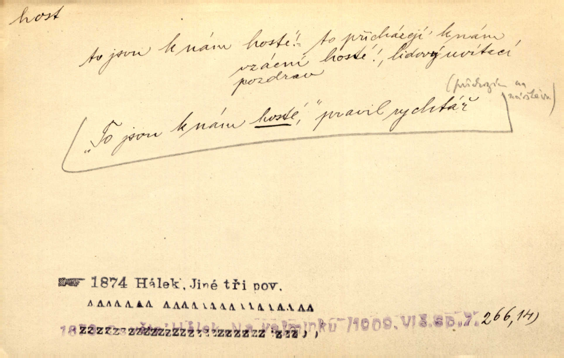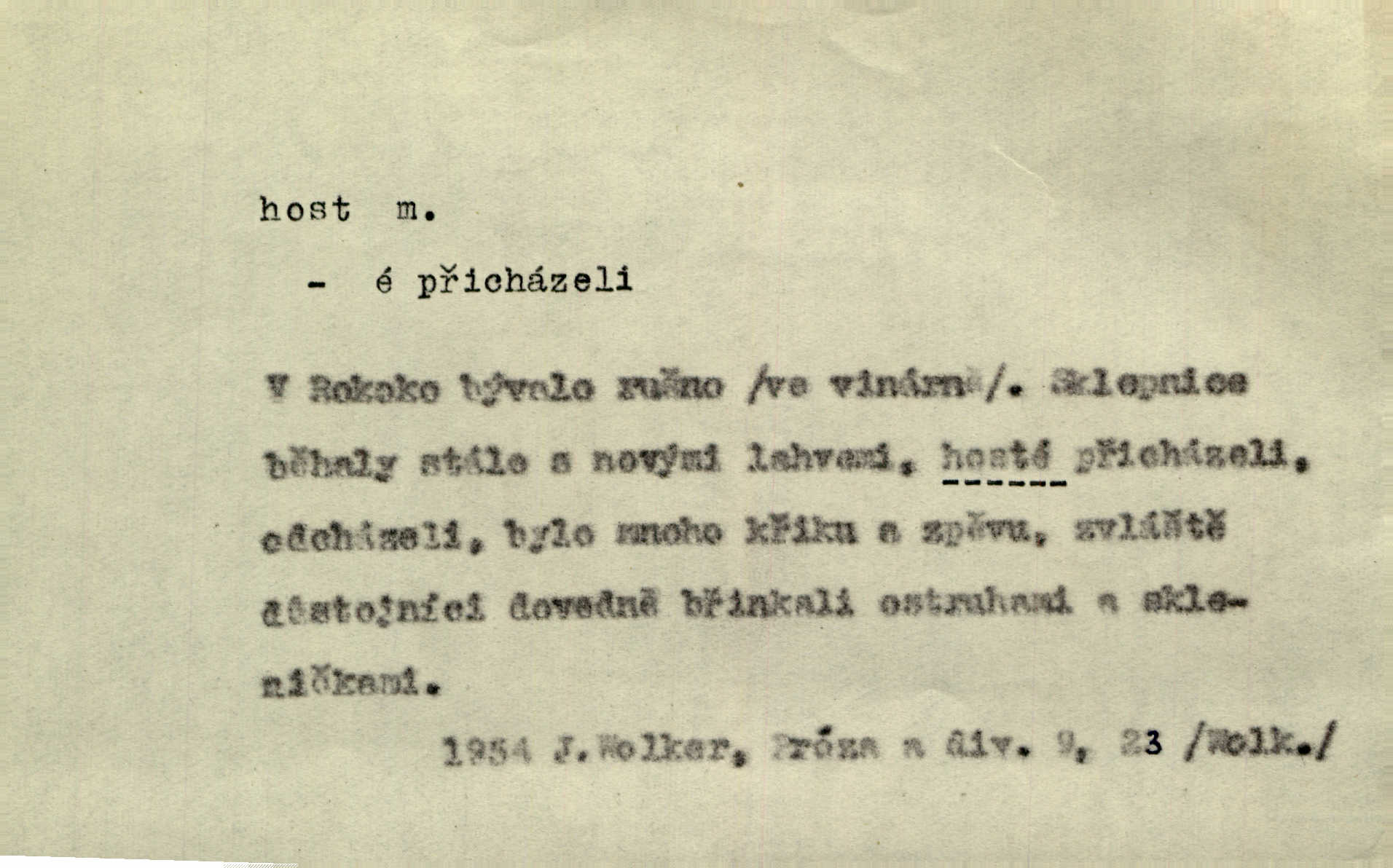 - host, -a m. (pl. hosté, ob. hosti, hostů, hostům, hosty, hostech, hosty; řidč. hostí, hosti, hostmi) příchozí na návštěvu, návštěvník, jemuž se obyčejně poskytuje na počest také pohostinství. Pan Prošek rád měl skleničku vína v domě pro hosta milého. Něm. Velmi rádi vidí [ruští kupci] u sebe hosty a přecpávají a přelívají je vším, co dům dá. Havl. Našel přístup [Vacquerie] do domu jeho [V. Huga], stal se denním hostem. Vrch. Kázal sezvati na třetí svatbu hosti. Havl. „Bože, to jsou k nám hosté, ženuško, náš nový pan domácí!“ Ner. V každé dobře vzdělané společnosti dává se hostům před domácími přednost. Havl. Host do domu, Bůh do domu. Host nezvaný nejmilejší. Staročeská byla ctnost: rád byl viděn v domě host. Host první den zlato, druhý stříbro, třetí měď. Ryba a host třetí den smrdí. Přísl. Přihlížel jsem právě co nezvaný host manipulaci se šatstvem [v zastavárně]. Ner. Býval doma pouze hostem a celé týdny trávil na cestách jako host, zřídka. Baar. Přednášky profesorů — hostů z jiné čsl. či cizí vysoké školy. Služ. min. škol. Div. umělec n. umělkyně účinkující v divadle, do jehož souboru nenáleží. V ústavě našem novém vystoupil první host. Ner. D příchozí, návštěvník v jistých výdělečných podnicích (kde se lze stravovati nebo i bydliti: v hostincích, hotelích, kavárnách, lázních). Nerad ublíží kuřeti [hostinský] a nerad si také hosty odrazí. Něm. Večer zasedali kol jediného dlouhého stolu [v hostinci] kmenoví hosté. Šim. V kavárně bylo málo hostů. Čech. Lázeňští hosté procházeli se. Pfleg. D Kniž. příchozí někam vůbec (často i nevítaný). Byli [studenti] zajisté vzácní hosté v těchto končinách [křivoklátských lesích]. Jir. Starý Petráš — Cihlářka a stará Rybářka — denní hosté svatého domu. A. Mrš. Jsme tu [na světě] každý jenom host pobudeme nakrátce. Obr. živ. Když uhodily mrazy, oživlo okolí osamělého dvora nevítanými hosty. Vlci se pouštěli až k jeho ohradě. Jir. Čeládce se neplatí [u Podivů] mzda, daně se neodvádějí pořádně, exekutor bývá u nich častým hostem. Prav. Hum. Vyhlídka omezovala se na zahradu, uzavřenou vysokou zdi proti nepovolaným hostům zlodějům. Svob. Dny nevýslovně smutné přišly na Vrbickou faru. Usadil se v ní zlý host: nemoc. Baar. Hlad, nejhorší to host všech obyvatelů horských. Pfleg. Sníh a mráz jsou tu [v Orlických horách] časným hostem. Jir. Uklidíme hned všecko zlému hostu [blížící se povodni] z cesty. Něm. Lyrika je řídkým hostem na venkově a děvčata rozumějí jí velmi málo. Vrba.
