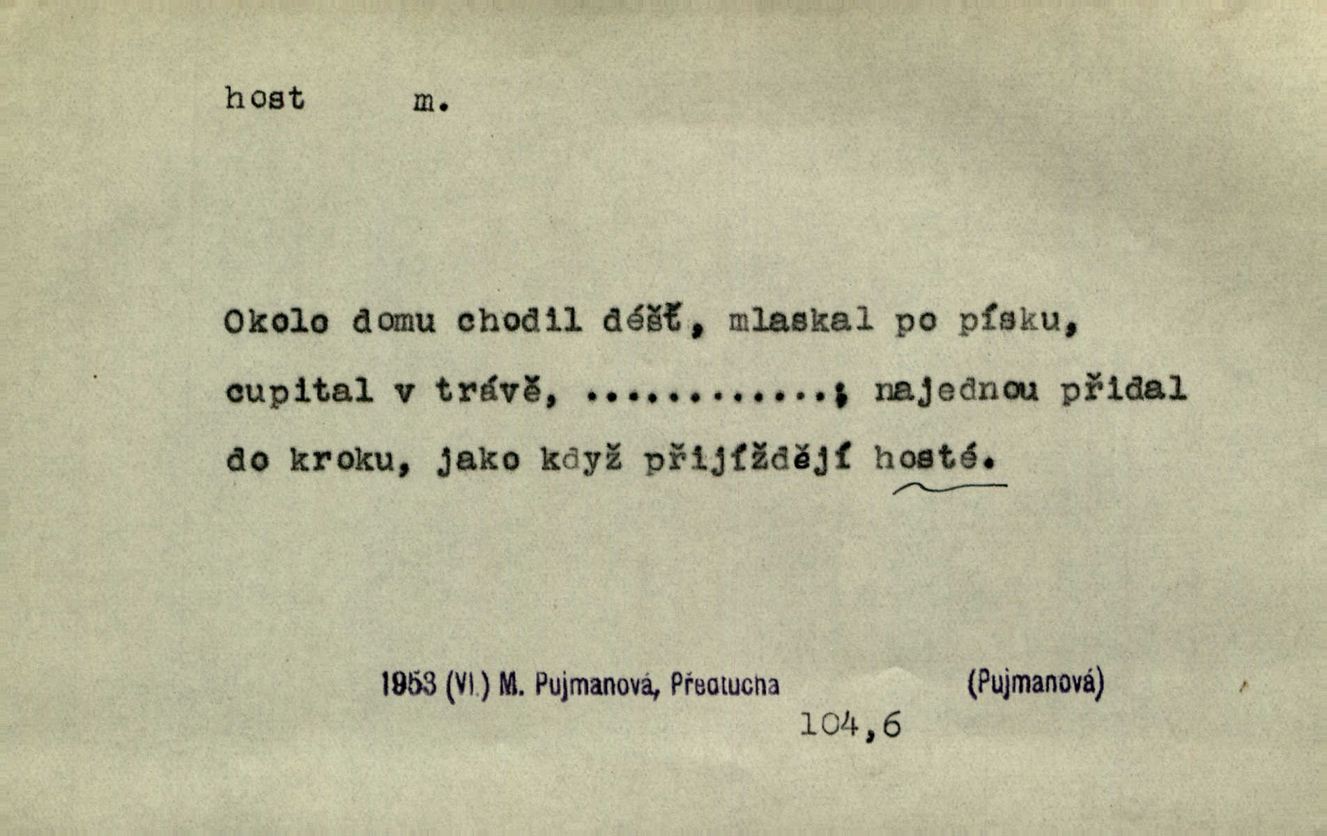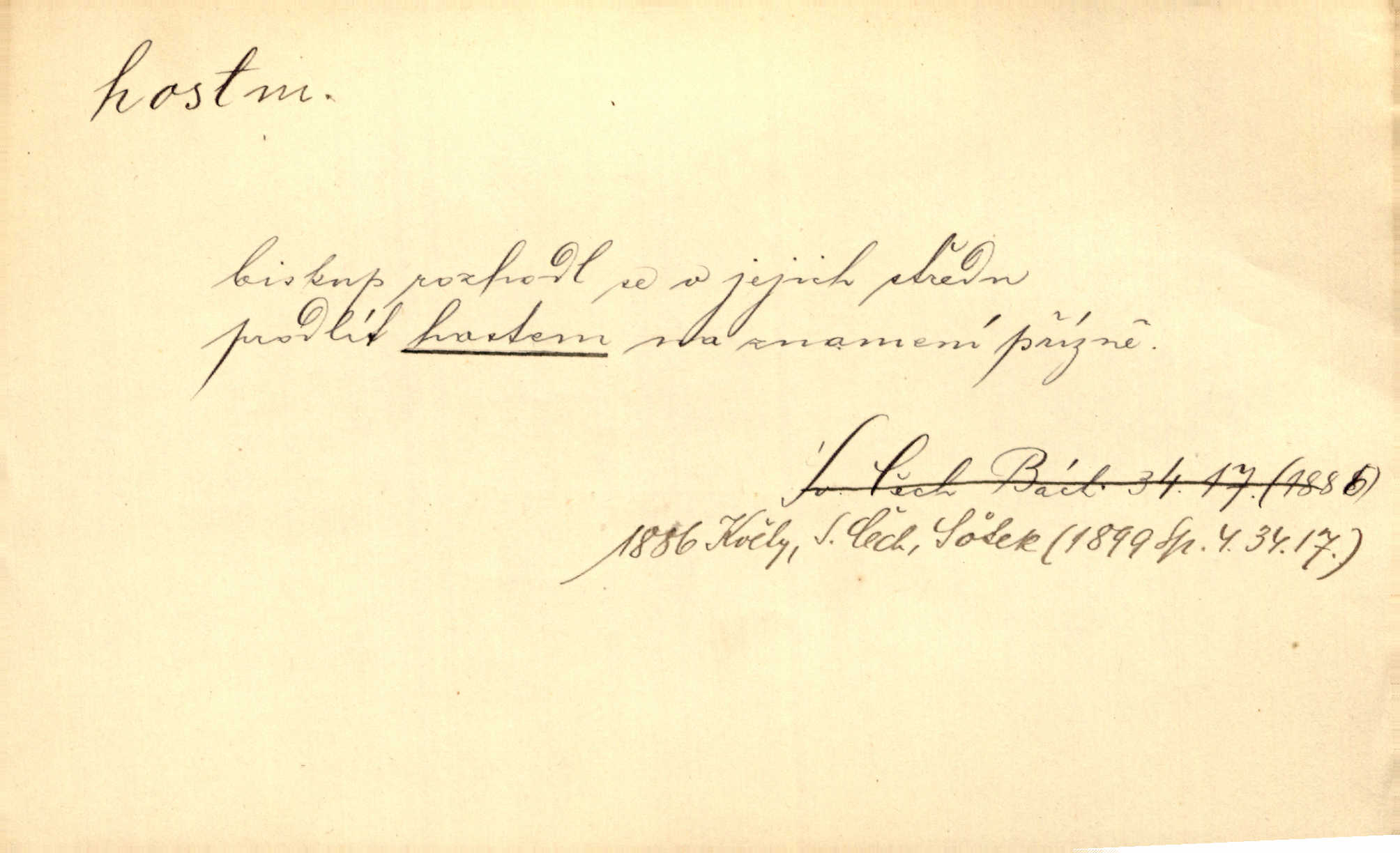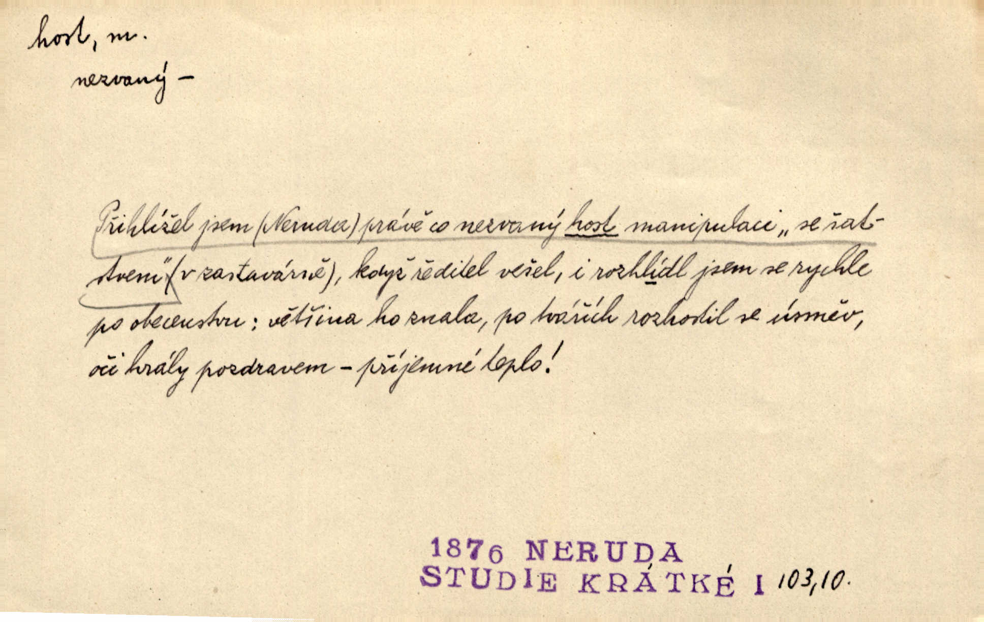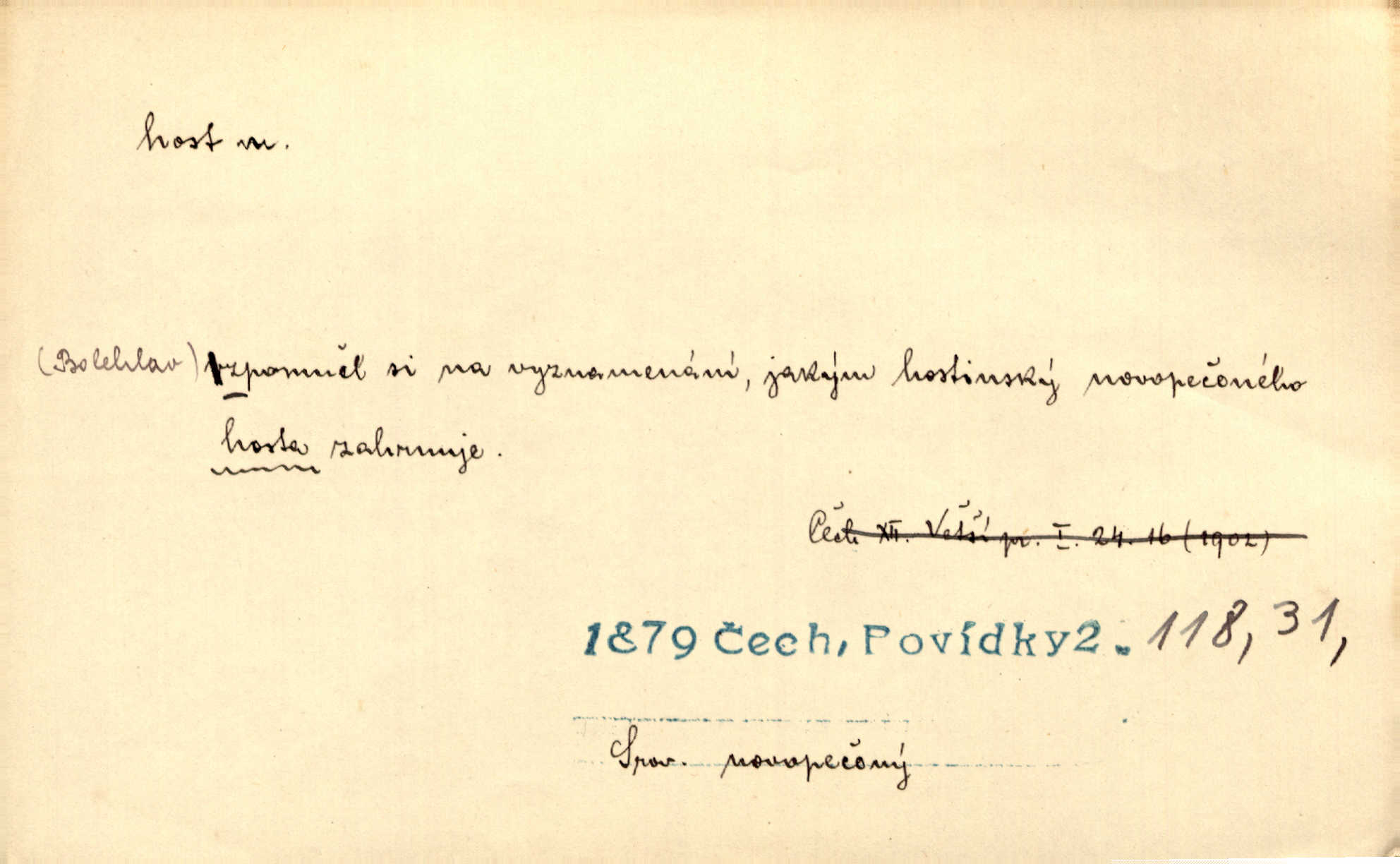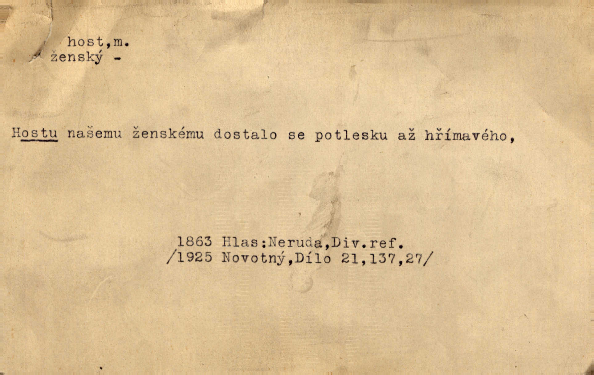 - host, -a m. (pl. hosté, ob. hosti, hostů, hostům, hosty, hostech, hosty; řidč. hostí, hosti, hostmi) příchozí na návštěvu, návštěvník, jemuž se obyčejně poskytuje na počest také pohostinství. Pan Prošek rád měl skleničku vína v domě pro hosta milého. Něm. Velmi rádi vidí [ruští kupci] u sebe hosty a přecpávají a přelívají je vším, co dům dá. Havl. Našel přístup [Vacquerie] do domu jeho [V. Huga], stal se denním hostem. Vrch. Kázal sezvati na třetí svatbu hosti. Havl. „Bože, to jsou k nám hosté, ženuško, náš nový pan domácí!“ Ner. V každé dobře vzdělané společnosti dává se hostům před domácími přednost. Havl. Host do domu, Bůh do domu. Host nezvaný nejmilejší. Staročeská byla ctnost: rád byl viděn v domě host. Host první den zlato, druhý stříbro, třetí měď. Ryba a host třetí den smrdí. Přísl. Přihlížel jsem právě co nezvaný host manipulaci se šatstvem [v zastavárně]. Ner. Býval doma pouze hostem a celé týdny trávil na cestách jako host, zřídka. Baar. Přednášky profesorů — hostů z jiné čsl. či cizí vysoké školy. Služ. min. škol. Div. umělec n. umělkyně účinkující v divadle, do jehož souboru nenáleží. V ústavě našem novém vystoupil první host. Ner. D příchozí, návštěvník v jistých výdělečných podnicích (kde se lze stravovati nebo i bydliti: v hostincích, hotelích, kavárnách, lázních). Nerad ublíží kuřeti [hostinský] a nerad si také hosty odrazí. Něm. Večer zasedali kol jediného dlouhého stolu [v hostinci] kmenoví hosté. Šim. V kavárně bylo málo hostů. Čech. Lázeňští hosté procházeli se. Pfleg. D Kniž. příchozí někam vůbec (často i nevítaný). Byli [studenti] zajisté vzácní hosté v těchto končinách [křivoklátských lesích]. Jir. Starý Petráš — Cihlářka a stará Rybářka — denní hosté svatého domu. A. Mrš. Jsme tu [na světě] každý jenom host pobudeme nakrátce. Obr. živ. Když uhodily mrazy, oživlo okolí osamělého dvora nevítanými hosty. Vlci se pouštěli až k jeho ohradě. Jir. Čeládce se neplatí [u Podivů] mzda, daně se neodvádějí pořádně, exekutor bývá u nich častým hostem. Prav. Hum. Vyhlídka omezovala se na zahradu, uzavřenou vysokou zdi proti nepovolaným hostům zlodějům. Svob. Dny nevýslovně smutné přišly na Vrbickou faru. Usadil se v ní zlý host: nemoc. Baar. Hlad, nejhorší to host všech obyvatelů horských. Pfleg. Sníh a mráz jsou tu [v Orlických horách] časným hostem. Jir. Uklidíme hned všecko zlému hostu [blížící se povodni] z cesty. Něm. Lyrika je řídkým hostem na venkově a děvčata rozumějí jí velmi málo. Vrba.