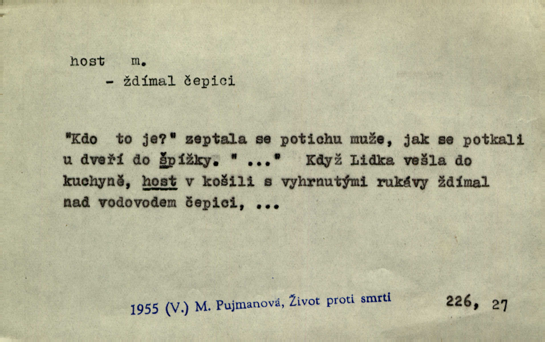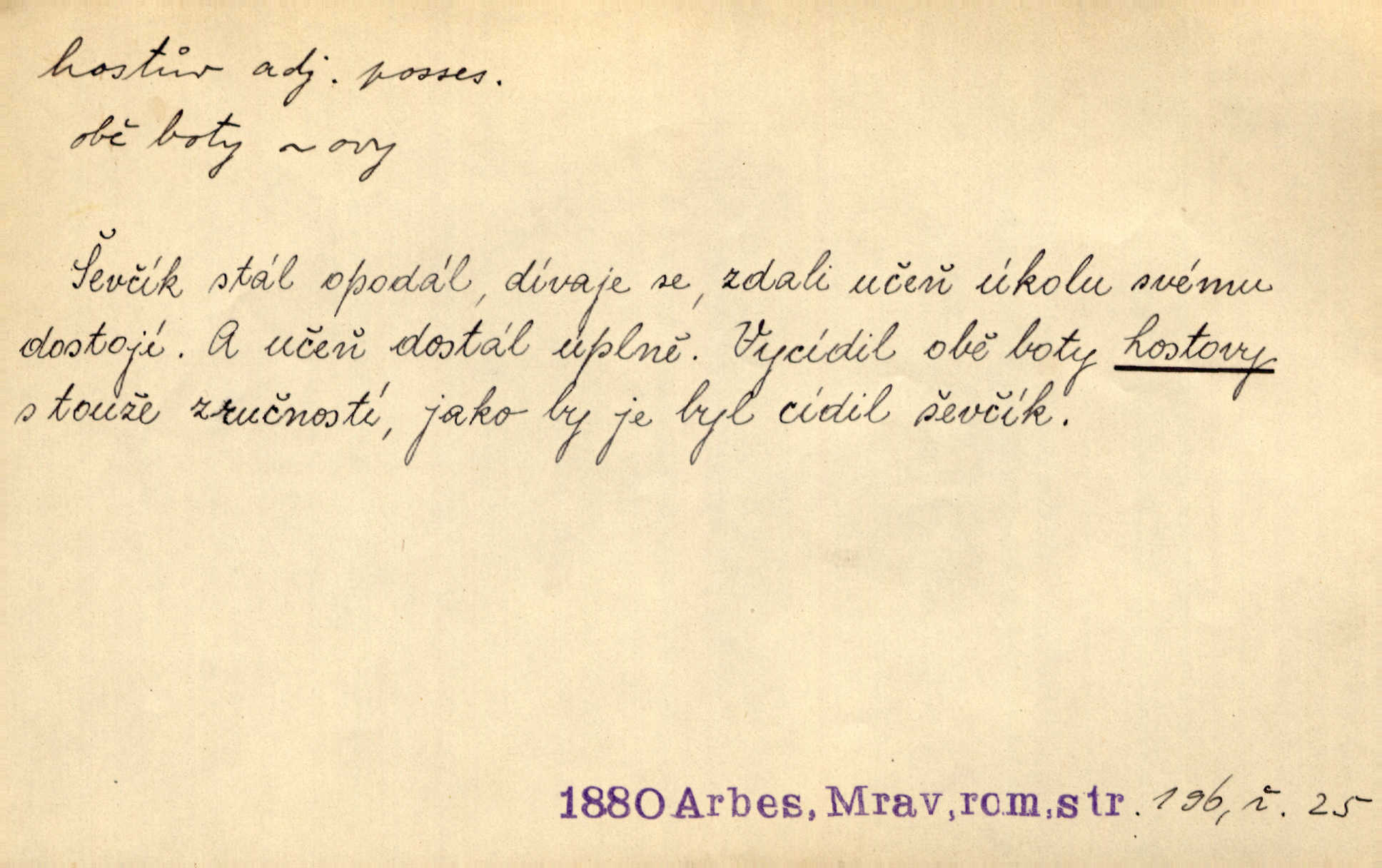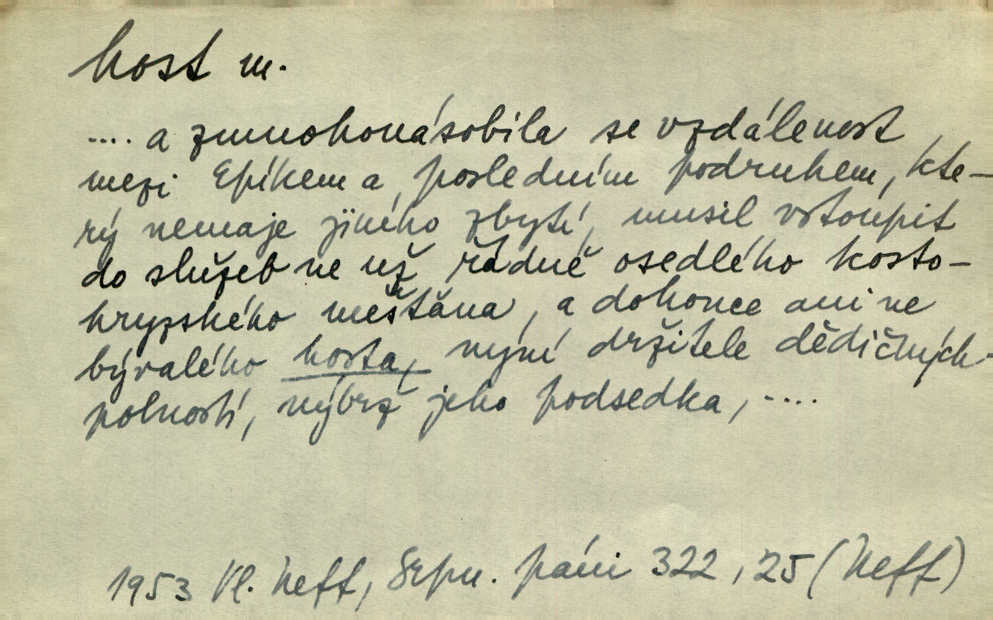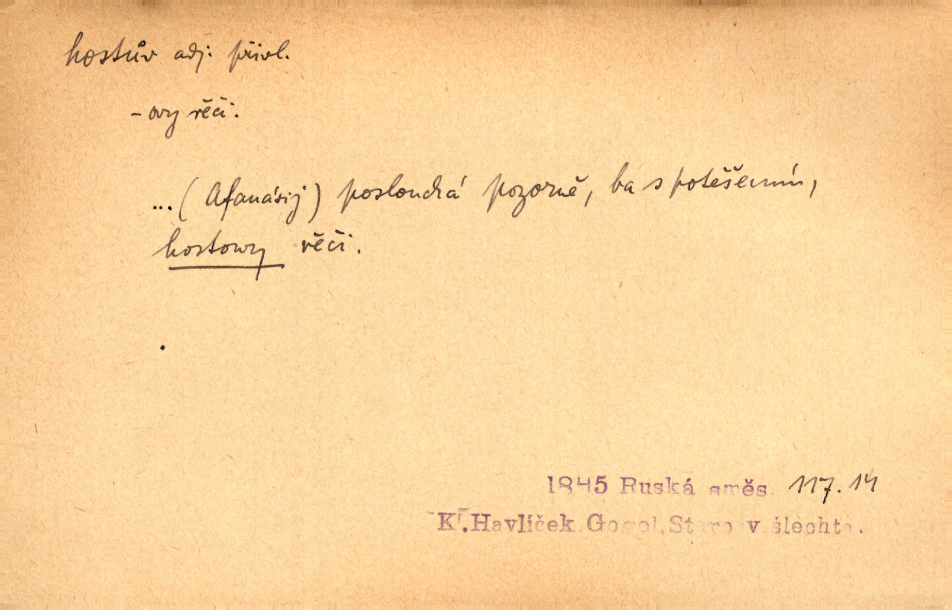 - host, -a m. (pl. hosté, ob. hosti, hostů, hostům, hosty, hostech, hosty; řidč. hostí, hosti, hostmi) příchozí na návštěvu, návštěvník, jemuž se obyčejně poskytuje na počest také pohostinství. Pan Prošek rád měl skleničku vína v domě pro hosta milého. Něm. Velmi rádi vidí [ruští kupci] u sebe hosty a přecpávají a přelívají je vším, co dům dá. Havl. Našel přístup [Vacquerie] do domu jeho [V. Huga], stal se denním hostem. Vrch. Kázal sezvati na třetí svatbu hosti. Havl. „Bože, to jsou k nám hosté, ženuško, náš nový pan domácí!“ Ner. V každé dobře vzdělané společnosti dává se hostům před domácími přednost. Havl. Host do domu, Bůh do domu. Host nezvaný nejmilejší. Staročeská byla ctnost: rád byl viděn v domě host. Host první den zlato, druhý stříbro, třetí měď. Ryba a host třetí den smrdí. Přísl. Přihlížel jsem právě co nezvaný host manipulaci se šatstvem [v zastavárně]. Ner. Býval doma pouze hostem a celé týdny trávil na cestách jako host, zřídka. Baar. Přednášky profesorů — hostů z jiné čsl. či cizí vysoké školy. Služ. min. škol. Div. umělec n. umělkyně účinkující v divadle, do jehož souboru nenáleží. V ústavě našem novém vystoupil první host. Ner. D příchozí, návštěvník v jistých výdělečných podnicích (kde se lze stravovati nebo i bydliti: v hostincích, hotelích, kavárnách, lázních). Nerad ublíží kuřeti [hostinský] a nerad si také hosty odrazí. Něm. Večer zasedali kol jediného dlouhého stolu [v hostinci] kmenoví hosté. Šim. V kavárně bylo málo hostů. Čech. Lázeňští hosté procházeli se. Pfleg. D Kniž. příchozí někam vůbec (často i nevítaný). Byli [studenti] zajisté vzácní hosté v těchto končinách [křivoklátských lesích]. Jir. Starý Petráš — Cihlářka a stará Rybářka — denní hosté svatého domu. A. Mrš. Jsme tu [na světě] každý jenom host pobudeme nakrátce. Obr. živ. Když uhodily mrazy, oživlo okolí osamělého dvora nevítanými hosty. Vlci se pouštěli až k jeho ohradě. Jir. Čeládce se neplatí [u Podivů] mzda, daně se neodvádějí pořádně, exekutor bývá u nich častým hostem. Prav. Hum. Vyhlídka omezovala se na zahradu, uzavřenou vysokou zdi proti nepovolaným hostům zlodějům. Svob. Dny nevýslovně smutné přišly na Vrbickou faru. Usadil se v ní zlý host: nemoc. Baar. Hlad, nejhorší to host všech obyvatelů horských. Pfleg. Sníh a mráz jsou tu [v Orlických horách] časným hostem. Jir. Uklidíme hned všecko zlému hostu [blížící se povodni] z cesty. Něm. Lyrika je řídkým hostem na venkově a děvčata rozumějí jí velmi málo. Vrba.