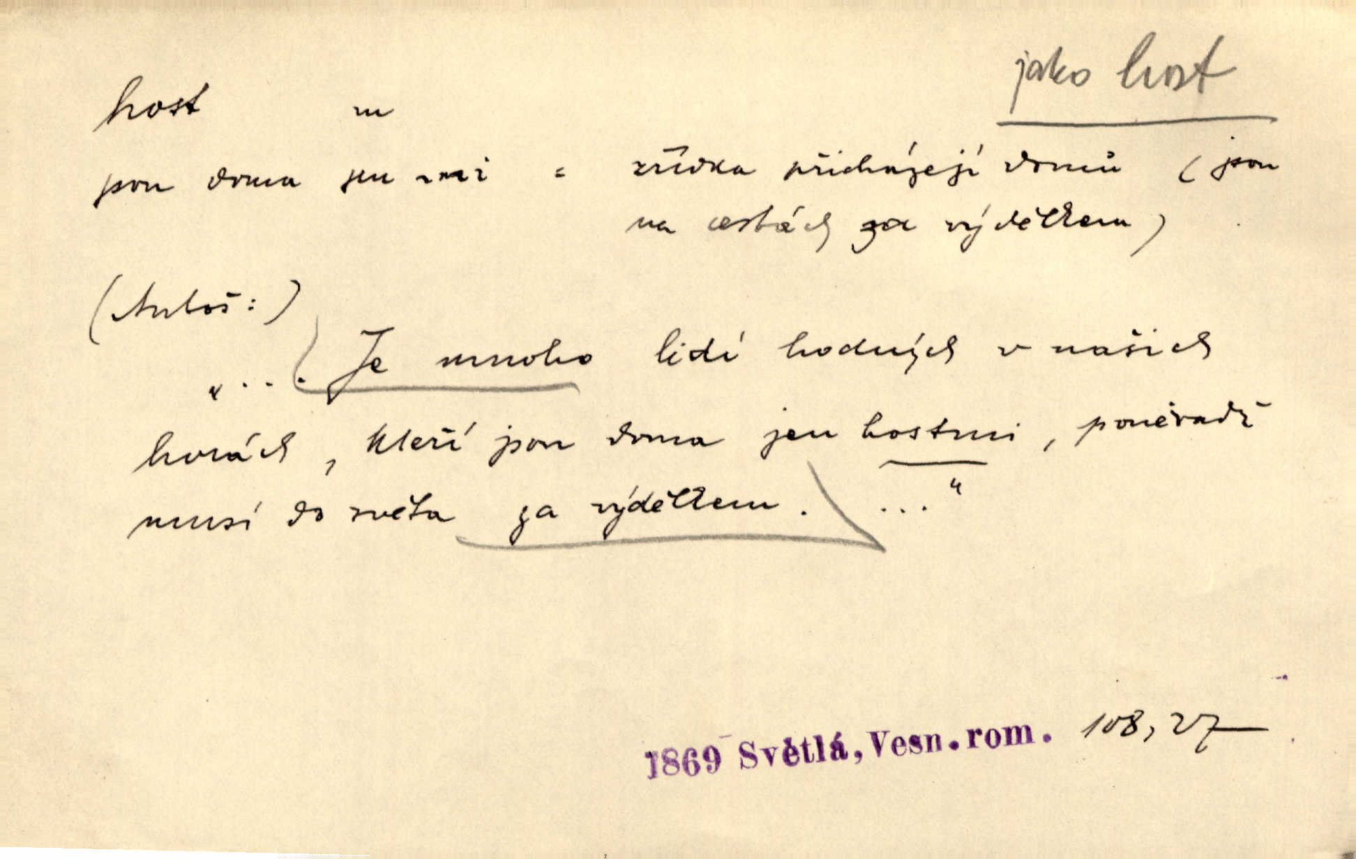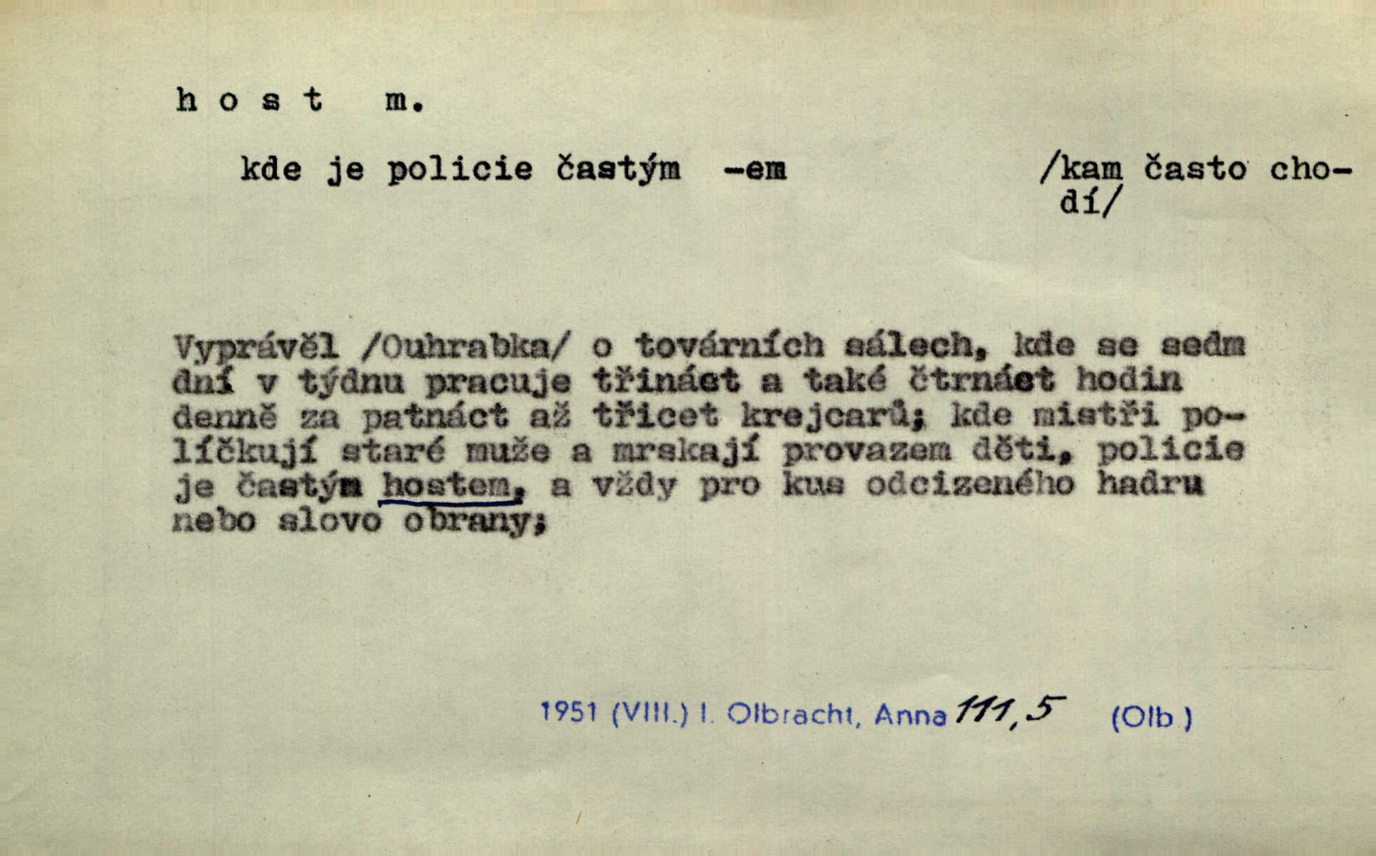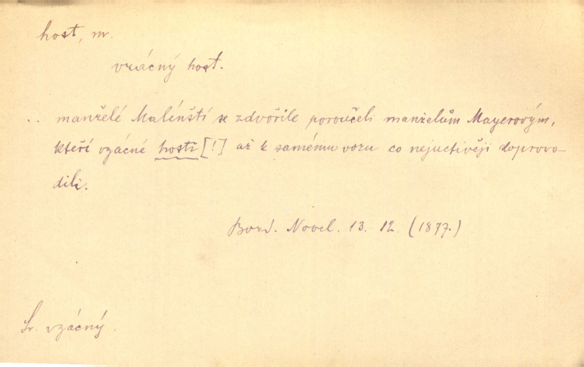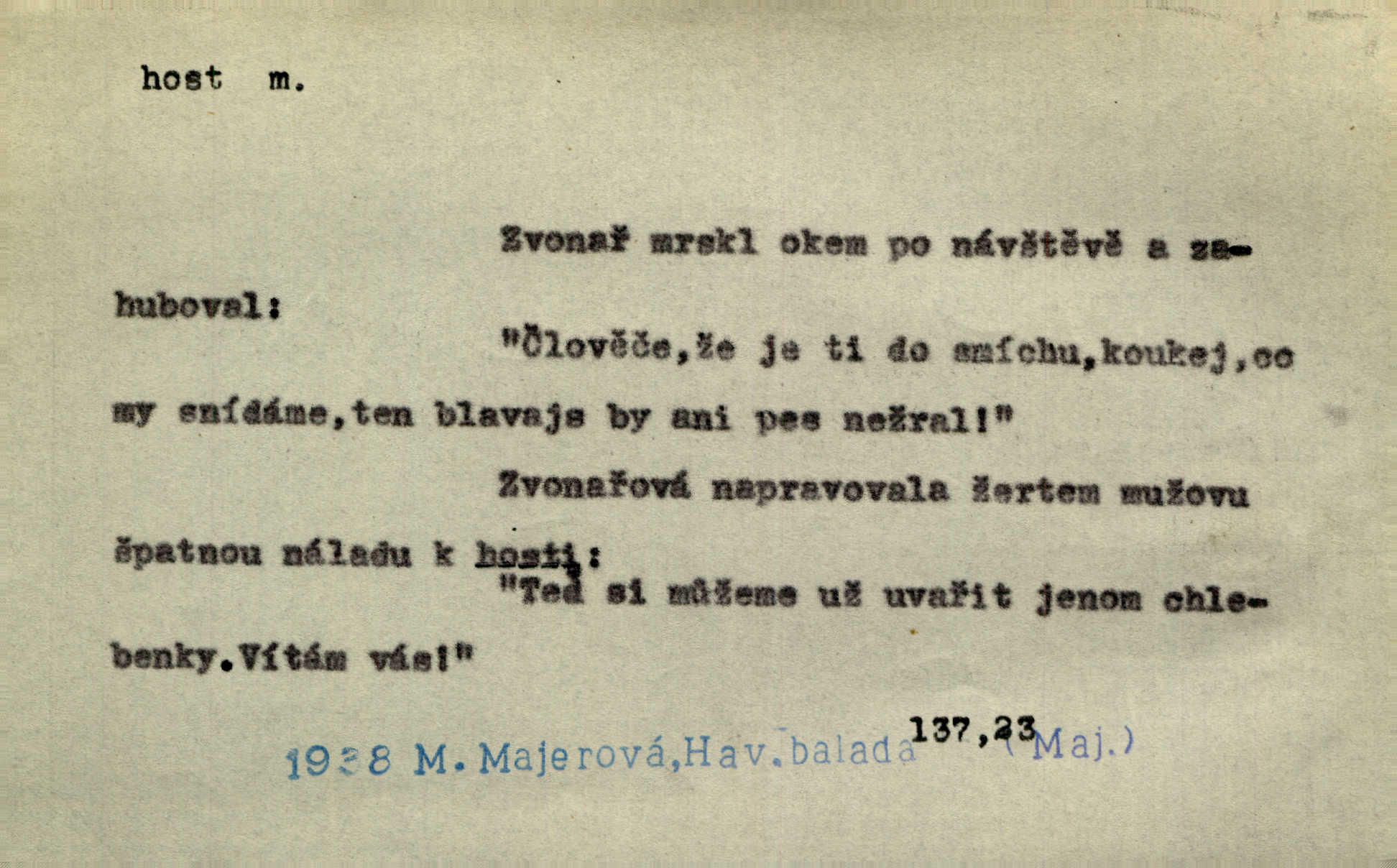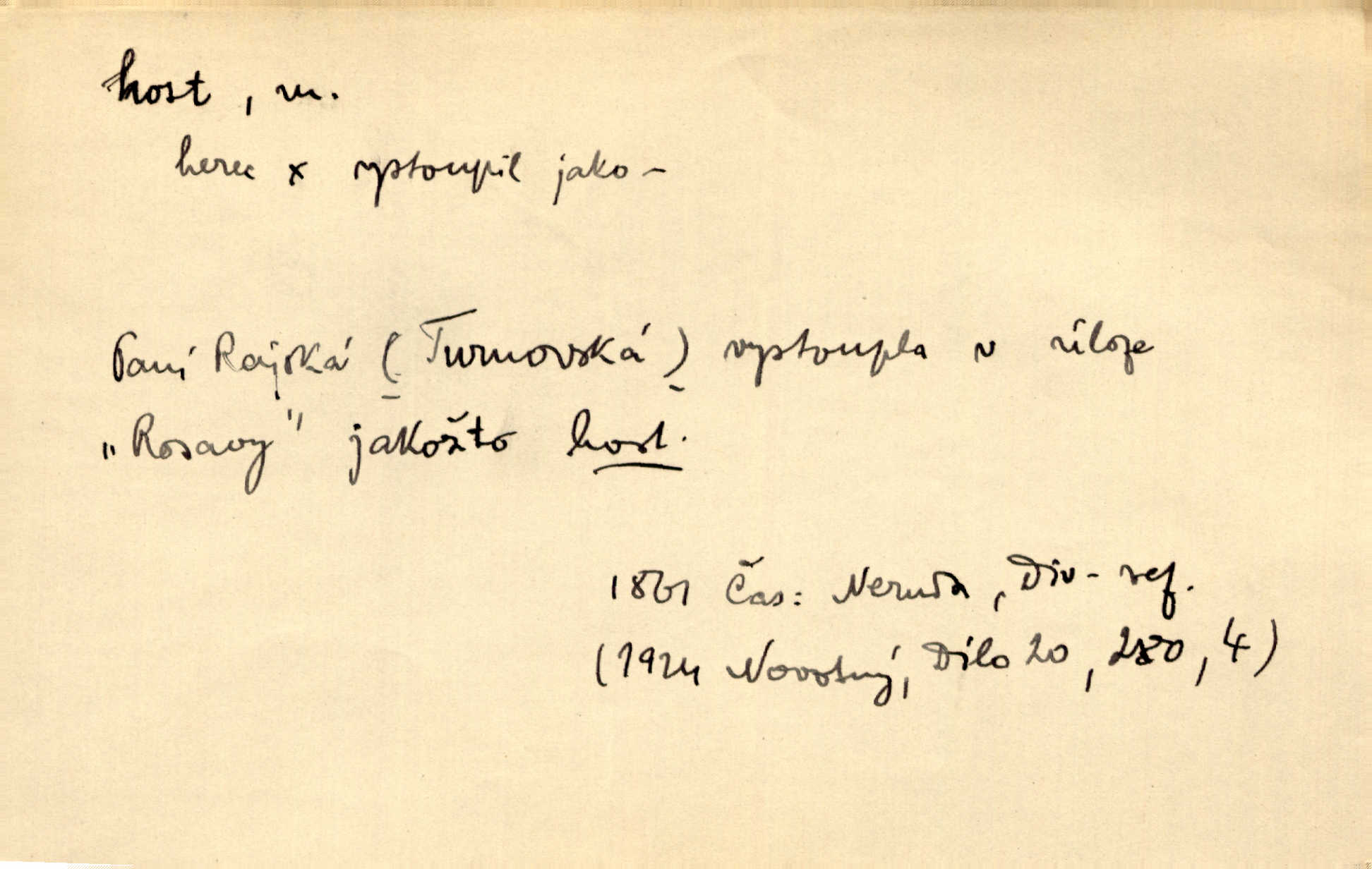 - host, -a m. (pl. hosté, ob. hosti, hostů, hostům, hosty, hostech, hosty; řidč. hostí, hosti, hostmi) příchozí na návštěvu, návštěvník, jemuž se obyčejně poskytuje na počest také pohostinství. Pan Prošek rád měl skleničku vína v domě pro hosta milého. Něm. Velmi rádi vidí [ruští kupci] u sebe hosty a přecpávají a přelívají je vším, co dům dá. Havl. Našel přístup [Vacquerie] do domu jeho [V. Huga], stal se denním hostem. Vrch. Kázal sezvati na třetí svatbu hosti. Havl. „Bože, to jsou k nám hosté, ženuško, náš nový pan domácí!“ Ner. V každé dobře vzdělané společnosti dává se hostům před domácími přednost. Havl. Host do domu, Bůh do domu. Host nezvaný nejmilejší. Staročeská byla ctnost: rád byl viděn v domě host. Host první den zlato, druhý stříbro, třetí měď. Ryba a host třetí den smrdí. Přísl. Přihlížel jsem právě co nezvaný host manipulaci se šatstvem [v zastavárně]. Ner. Býval doma pouze hostem a celé týdny trávil na cestách jako host, zřídka. Baar. Přednášky profesorů — hostů z jiné čsl. či cizí vysoké školy. Služ. min. škol. Div. umělec n. umělkyně účinkující v divadle, do jehož souboru nenáleží. V ústavě našem novém vystoupil první host. Ner. D příchozí, návštěvník v jistých výdělečných podnicích (kde se lze stravovati nebo i bydliti: v hostincích, hotelích, kavárnách, lázních). Nerad ublíží kuřeti [hostinský] a nerad si také hosty odrazí. Něm. Večer zasedali kol jediného dlouhého stolu [v hostinci] kmenoví hosté. Šim. V kavárně bylo málo hostů. Čech. Lázeňští hosté procházeli se. Pfleg. D Kniž. příchozí někam vůbec (často i nevítaný). Byli [studenti] zajisté vzácní hosté v těchto končinách [křivoklátských lesích]. Jir. Starý Petráš — Cihlářka a stará Rybářka — denní hosté svatého domu. A. Mrš. Jsme tu [na světě] každý jenom host pobudeme nakrátce. Obr. živ. Když uhodily mrazy, oživlo okolí osamělého dvora nevítanými hosty. Vlci se pouštěli až k jeho ohradě. Jir. Čeládce se neplatí [u Podivů] mzda, daně se neodvádějí pořádně, exekutor bývá u nich častým hostem. Prav. Hum. Vyhlídka omezovala se na zahradu, uzavřenou vysokou zdi proti nepovolaným hostům zlodějům. Svob. Dny nevýslovně smutné přišly na Vrbickou faru. Usadil se v ní zlý host: nemoc. Baar. Hlad, nejhorší to host všech obyvatelů horských. Pfleg. Sníh a mráz jsou tu [v Orlických horách] časným hostem. Jir. Uklidíme hned všecko zlému hostu [blížící se povodni] z cesty. Něm. Lyrika je řídkým hostem na venkově a děvčata rozumějí jí velmi málo. Vrba.