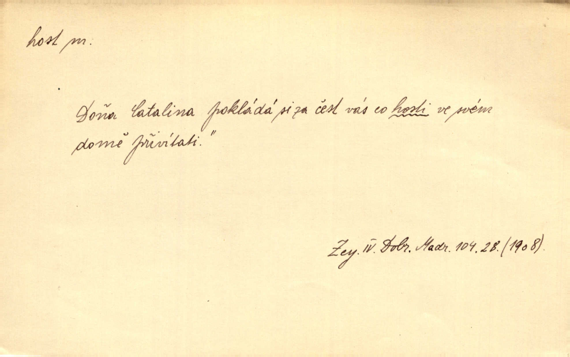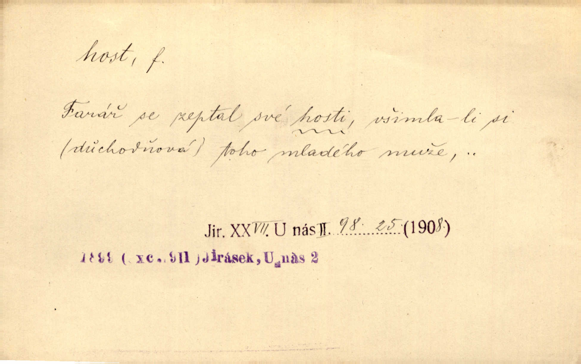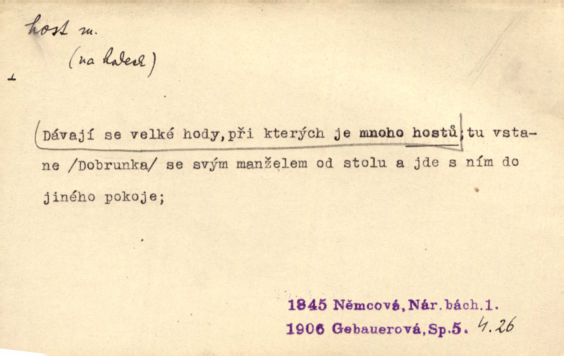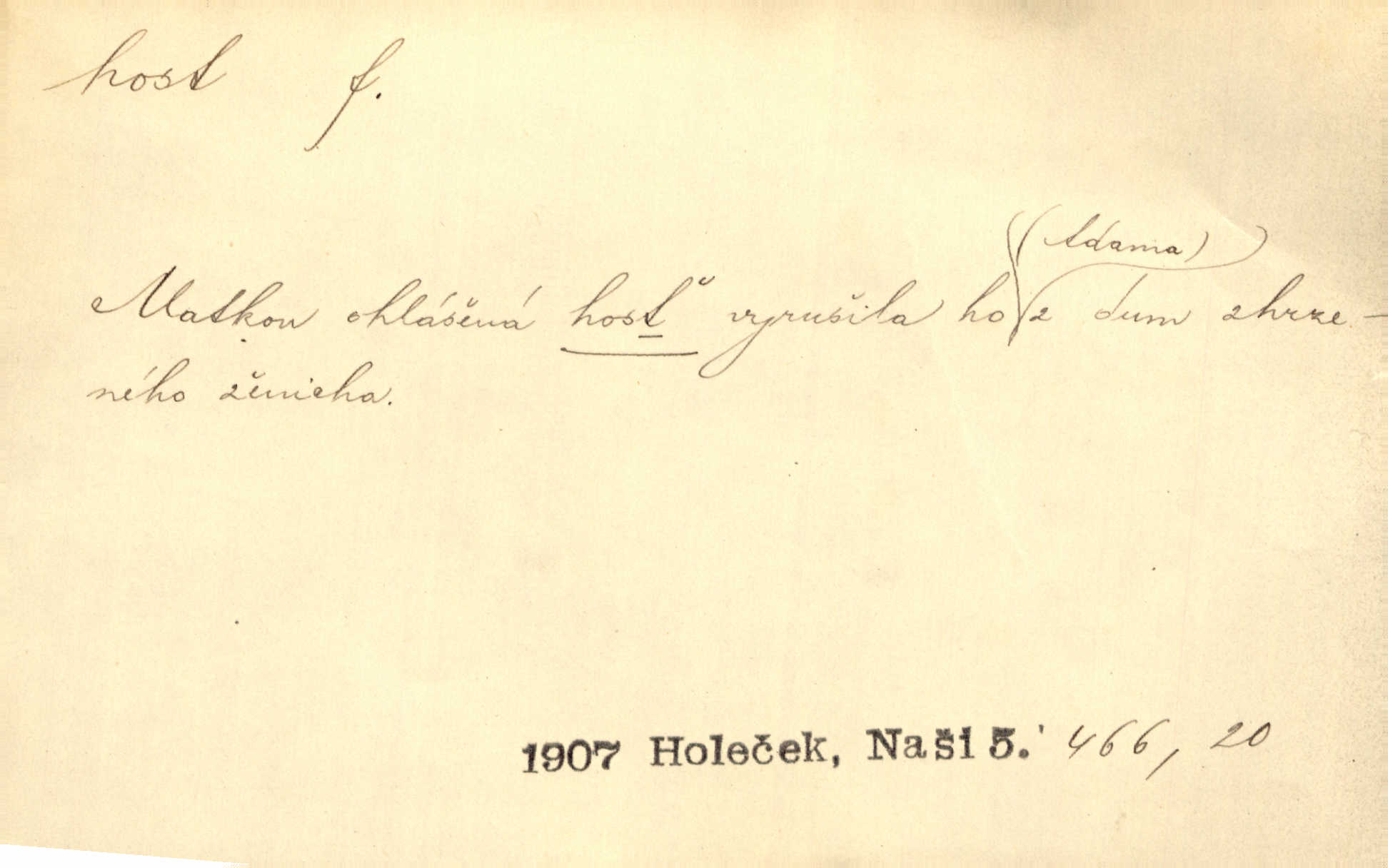 - †host, -i f. žena příchozí na návštěvu. Přijal ji [Šalamoun Sibylu] s milým vítáním a s velikou ctí, řka: „Vítej, milá hosti!“ Jir. Mnohá chata otvírala se, by přijala ji [princeznu] jako vzácnou hosť. Zey.