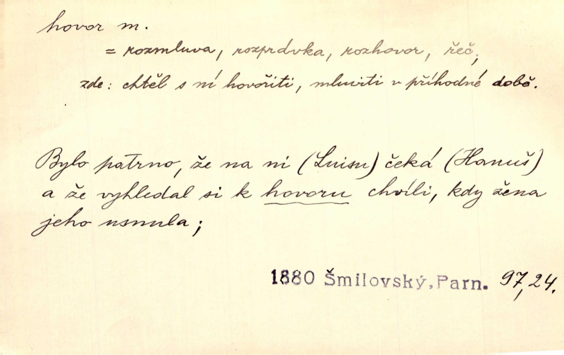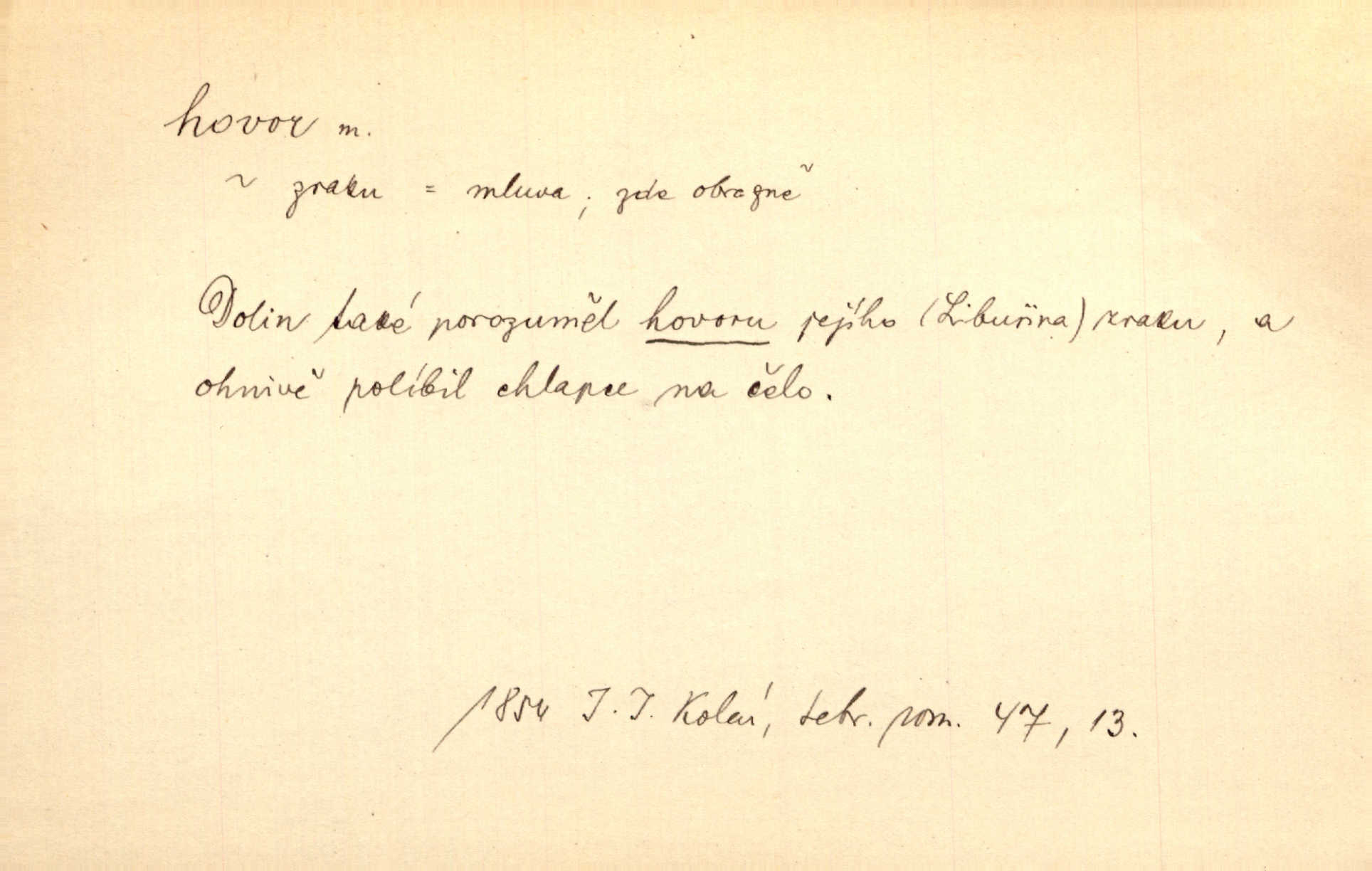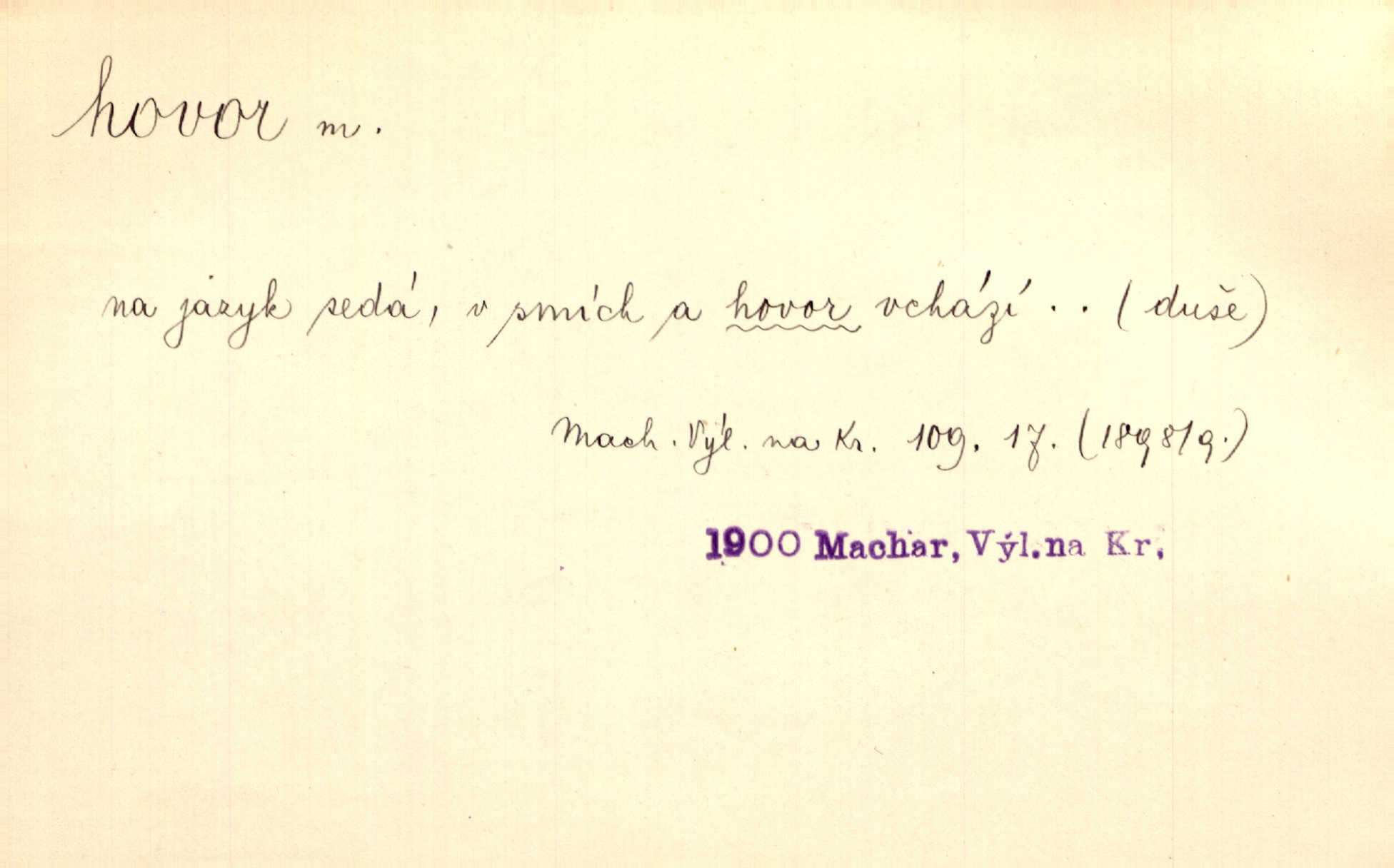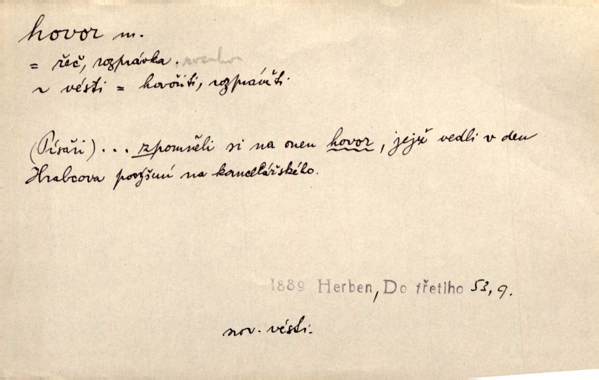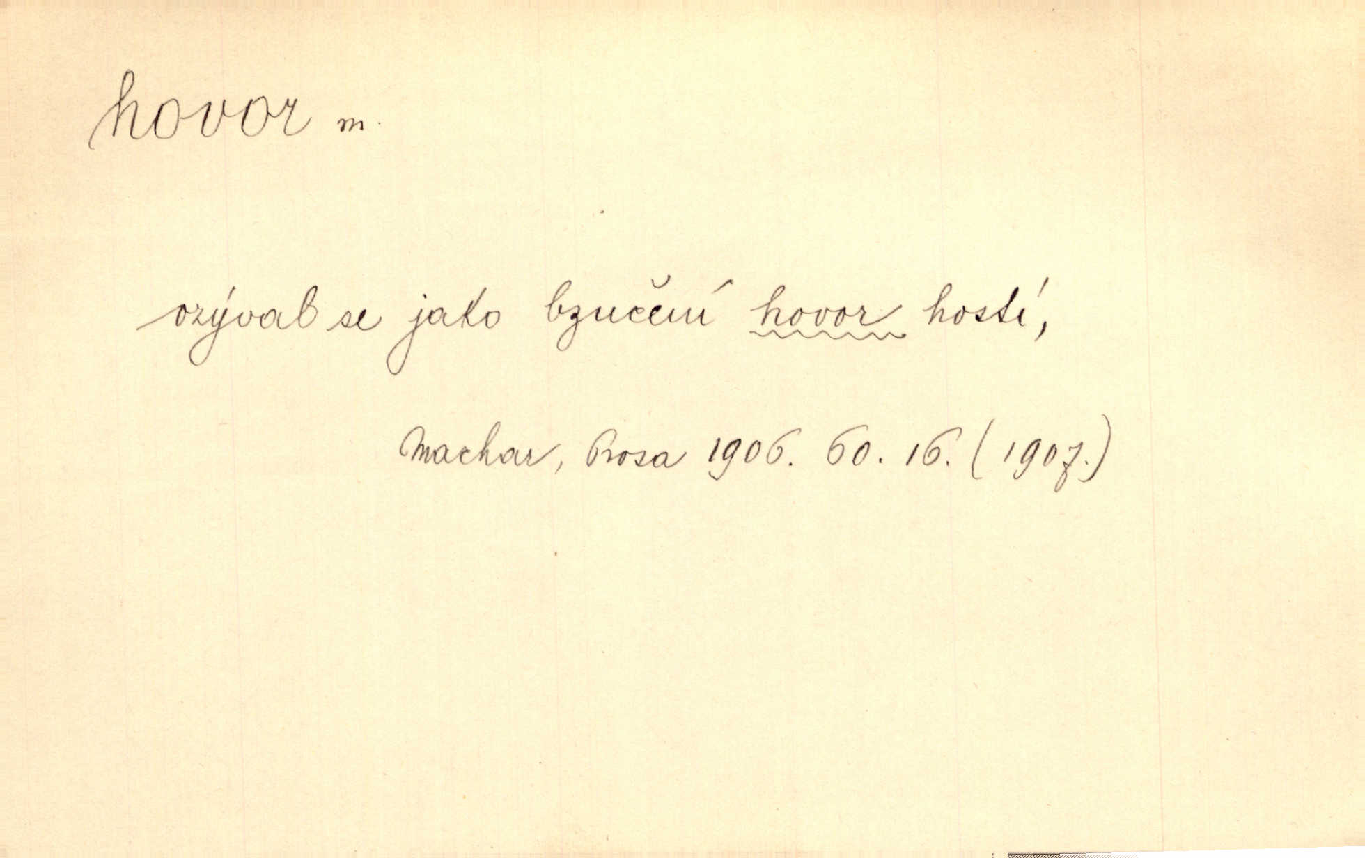 - hovor, -u m. rozprávka, rozmluva, konversace. Bylo slyšeti přitlumený hovor. Rais. Zpomněli si na onen hovor, jejž vedli v den Hrabcova povýšení. Herb. Hovor vázne. Není mi do hovoru. Přen. Turci nechávali hovor našich děl bez odpovědi střelbu. Hol. Telef. rozmluva telefonem. Hovor obyčejný, nutný, místní, meziměstský, státní.