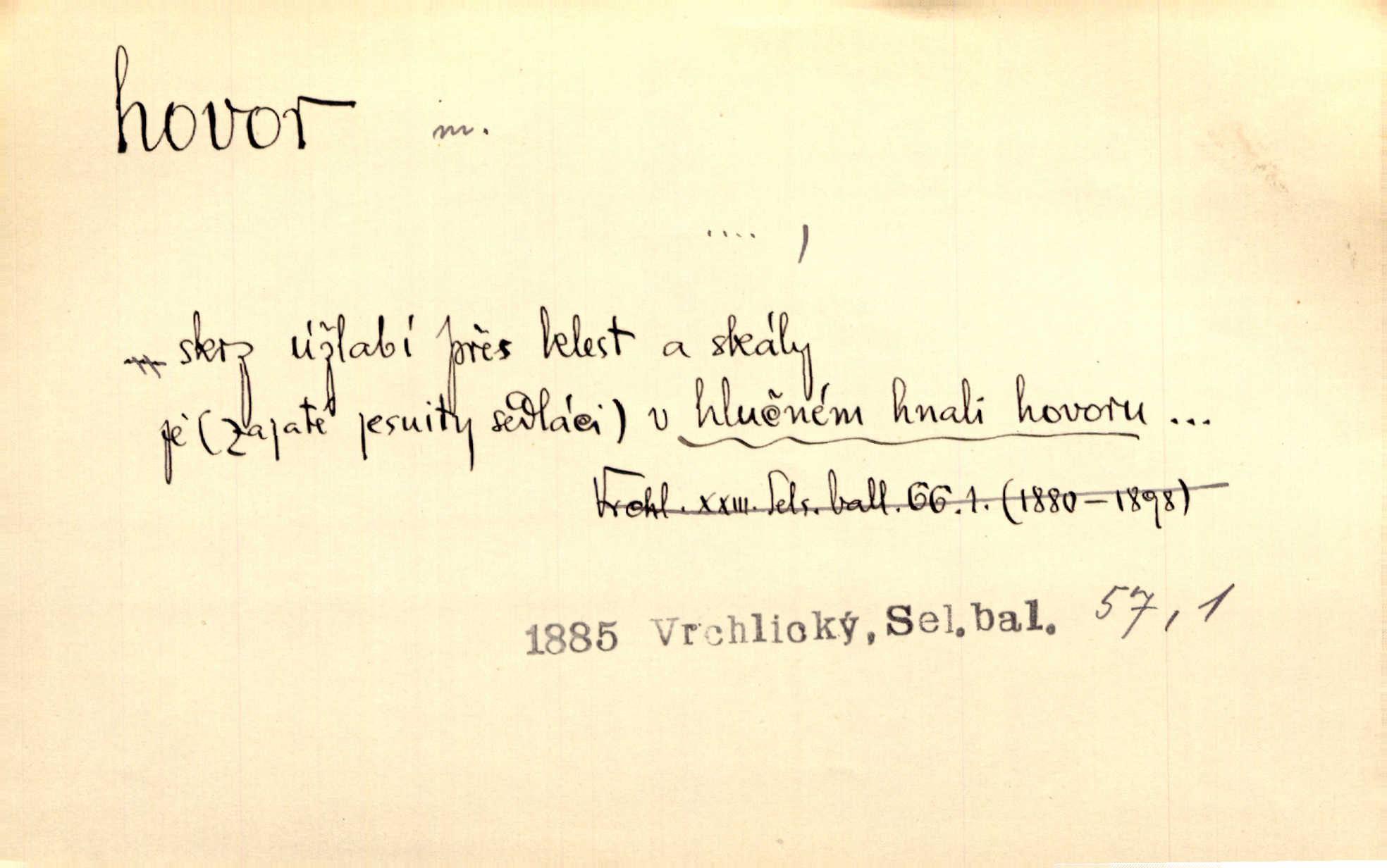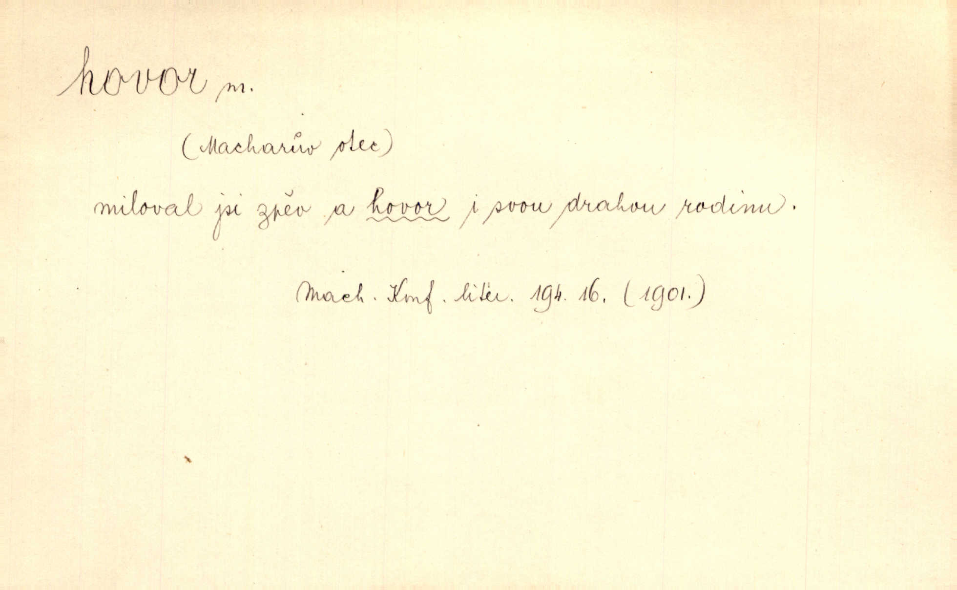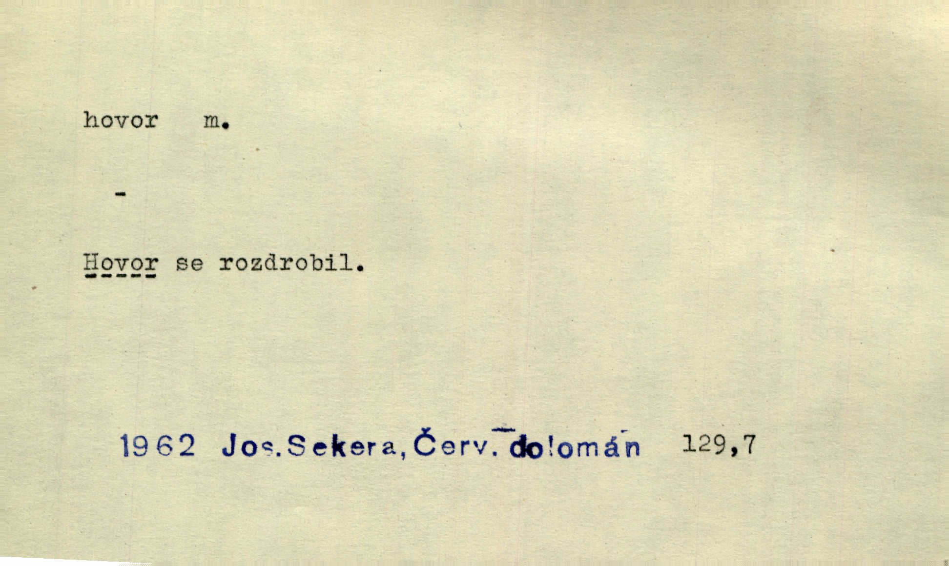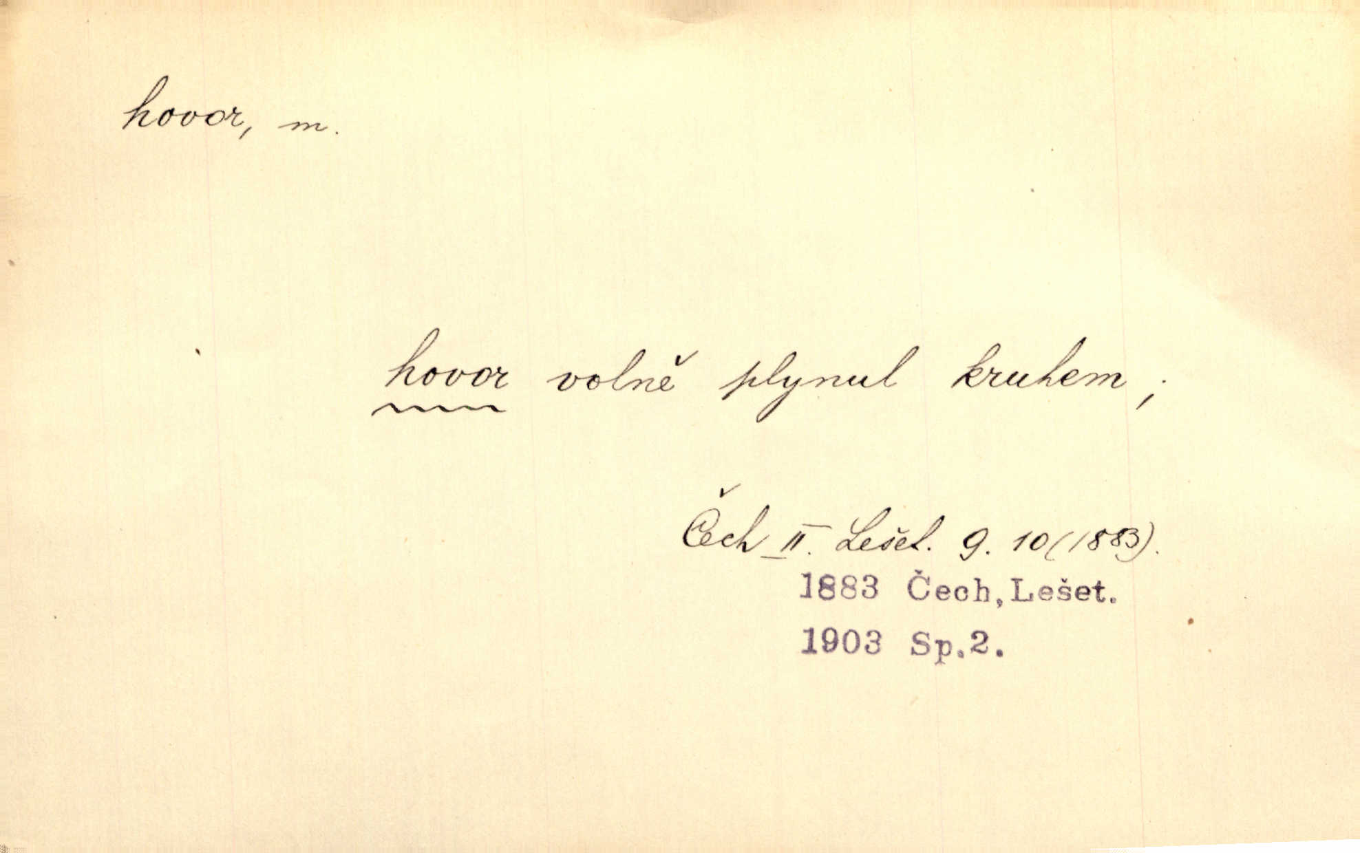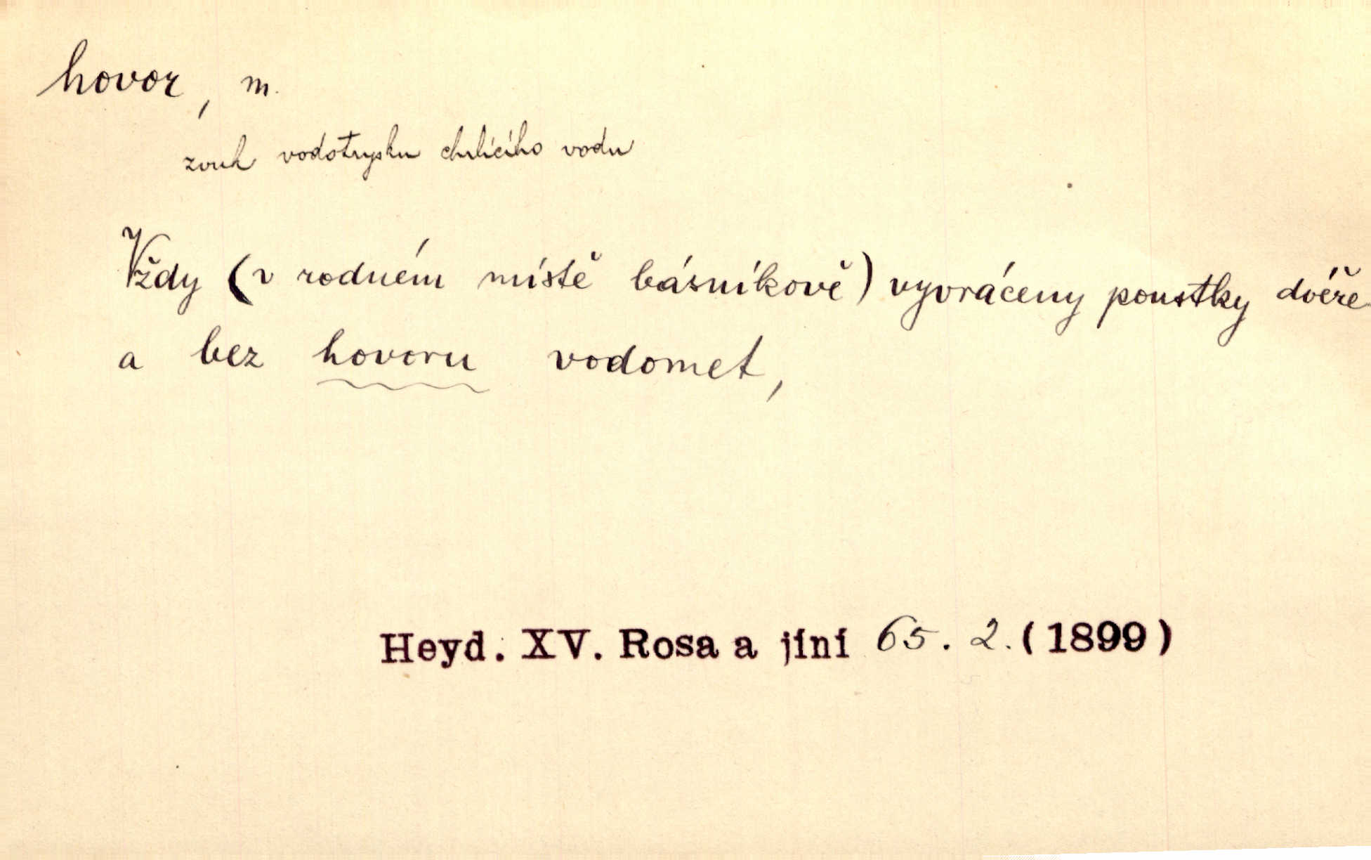 - hovor, -u m. rozprávka, rozmluva, konversace. Bylo slyšeti přitlumený hovor. Rais. Zpomněli si na onen hovor, jejž vedli v den Hrabcova povýšení. Herb. Hovor vázne. Není mi do hovoru. Přen. Turci nechávali hovor našich děl bez odpovědi střelbu. Hol. Telef. rozmluva telefonem. Hovor obyčejný, nutný, místní, meziměstský, státní.