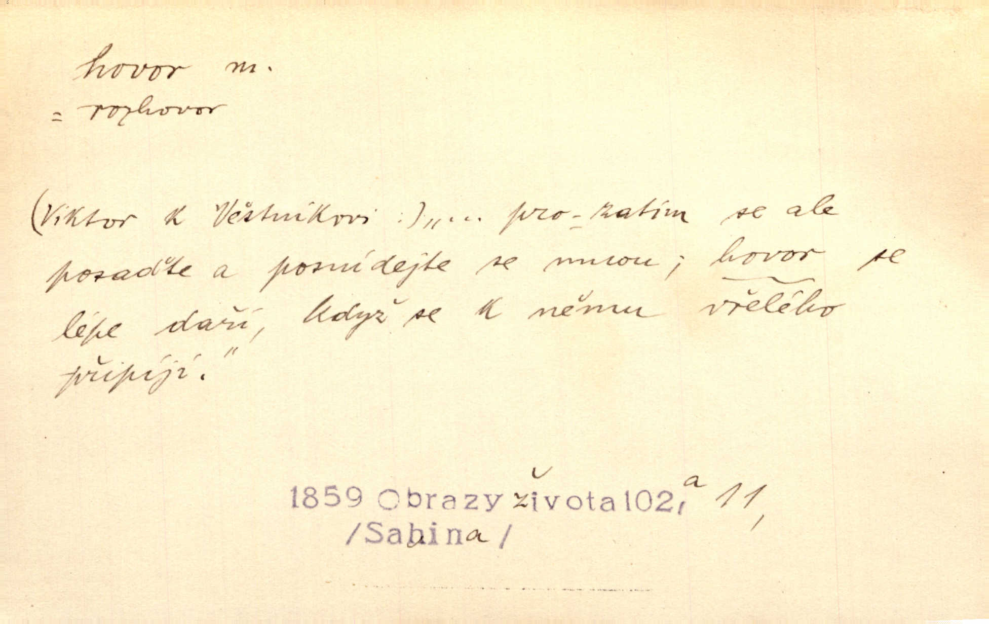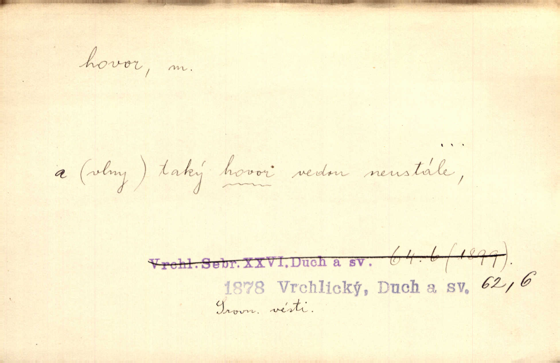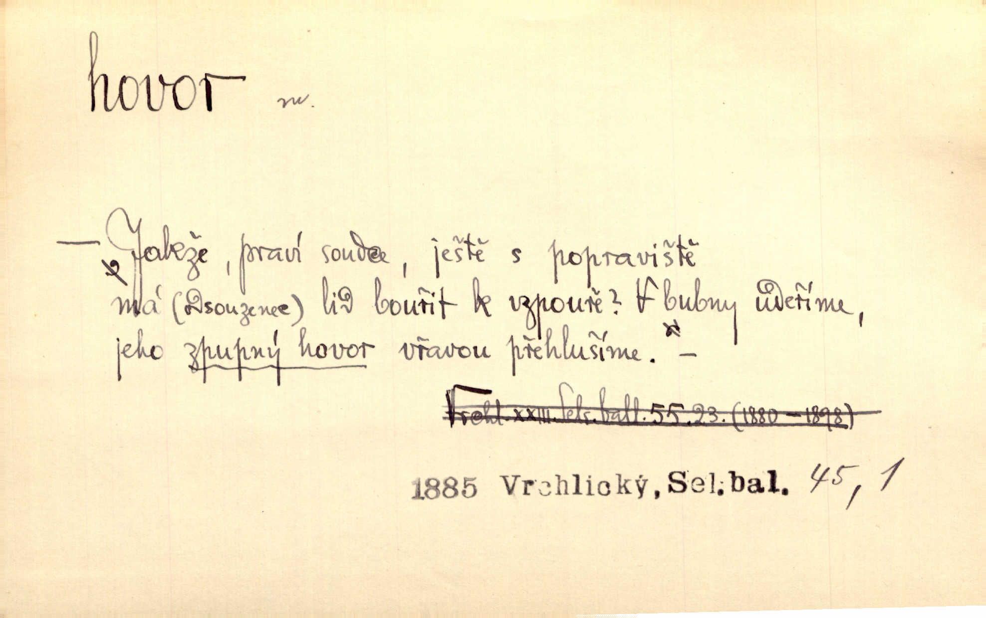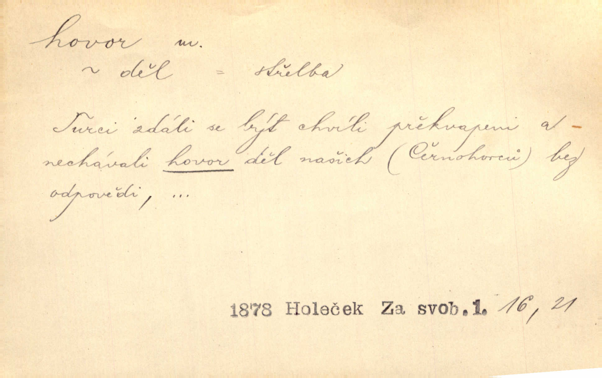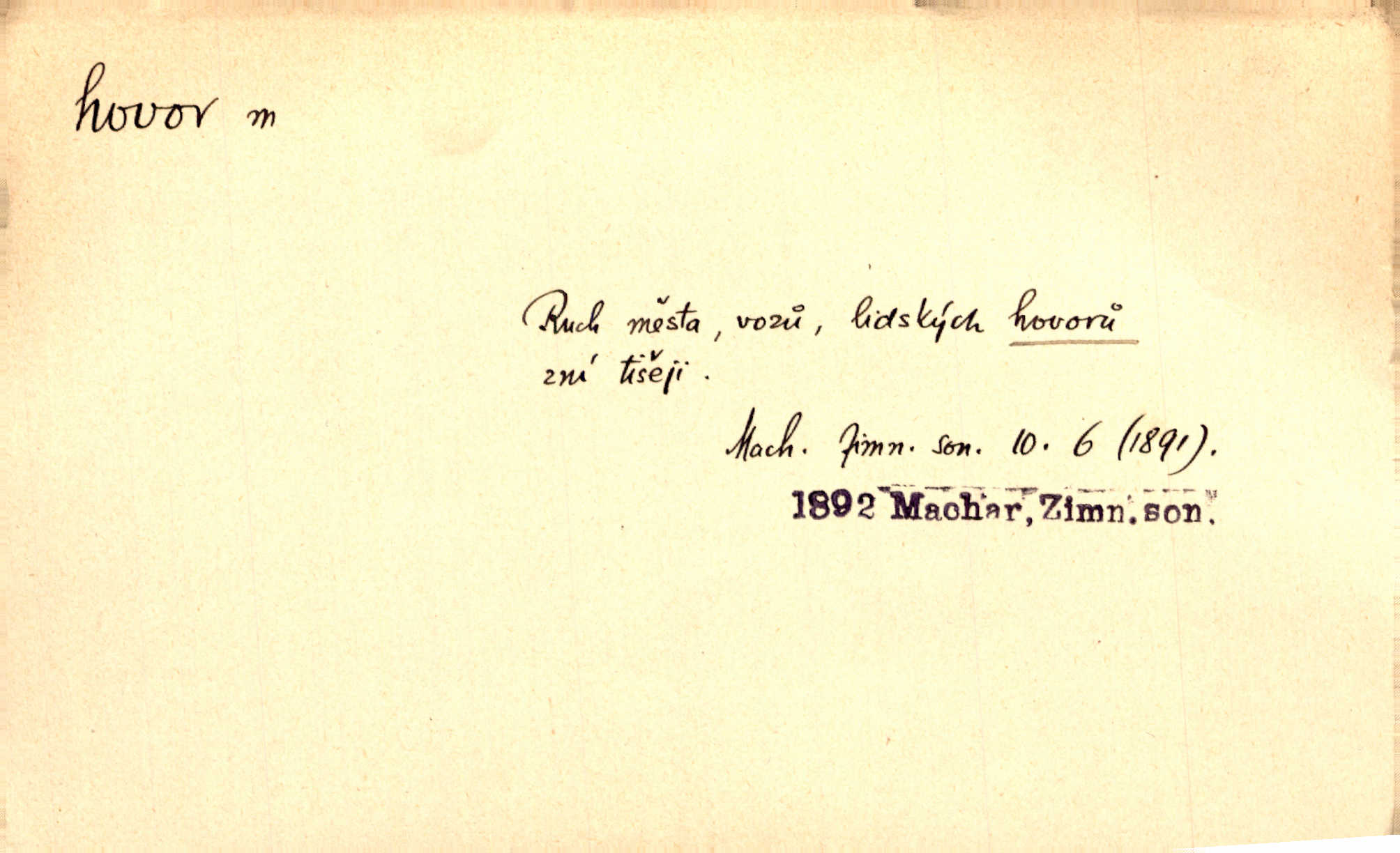 - hovor, -u m. rozprávka, rozmluva, konversace. Bylo slyšeti přitlumený hovor. Rais. Zpomněli si na onen hovor, jejž vedli v den Hrabcova povýšení. Herb. Hovor vázne. Není mi do hovoru. Přen. Turci nechávali hovor našich děl bez odpovědi střelbu. Hol. Telef. rozmluva telefonem. Hovor obyčejný, nutný, místní, meziměstský, státní.