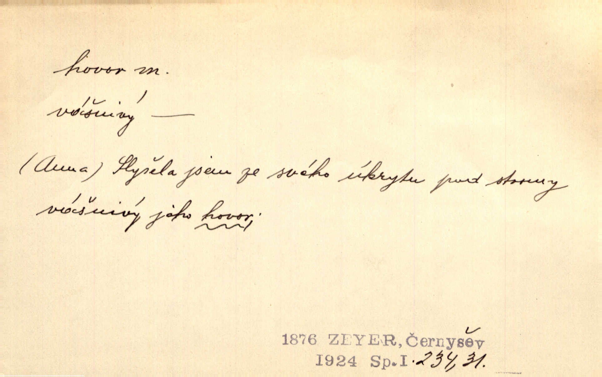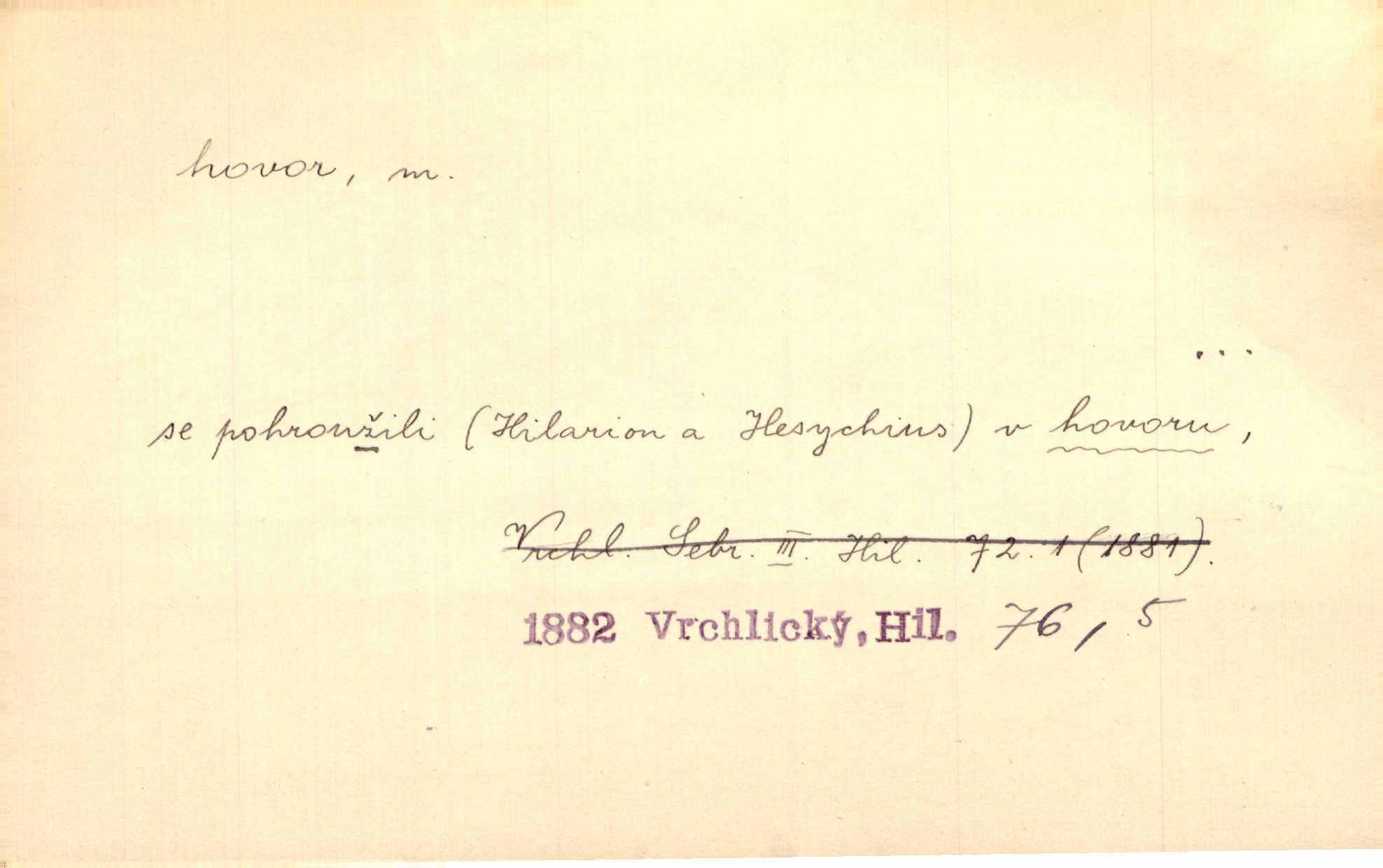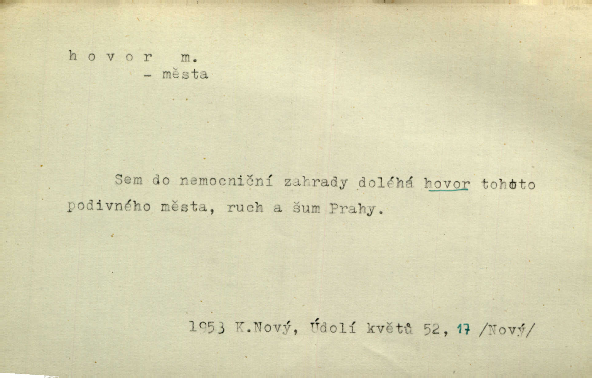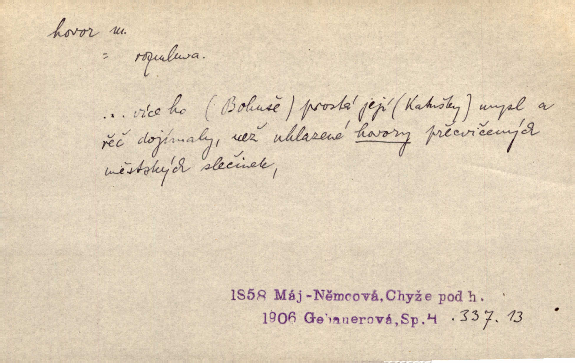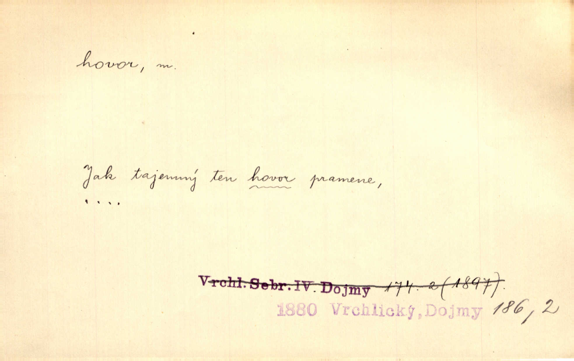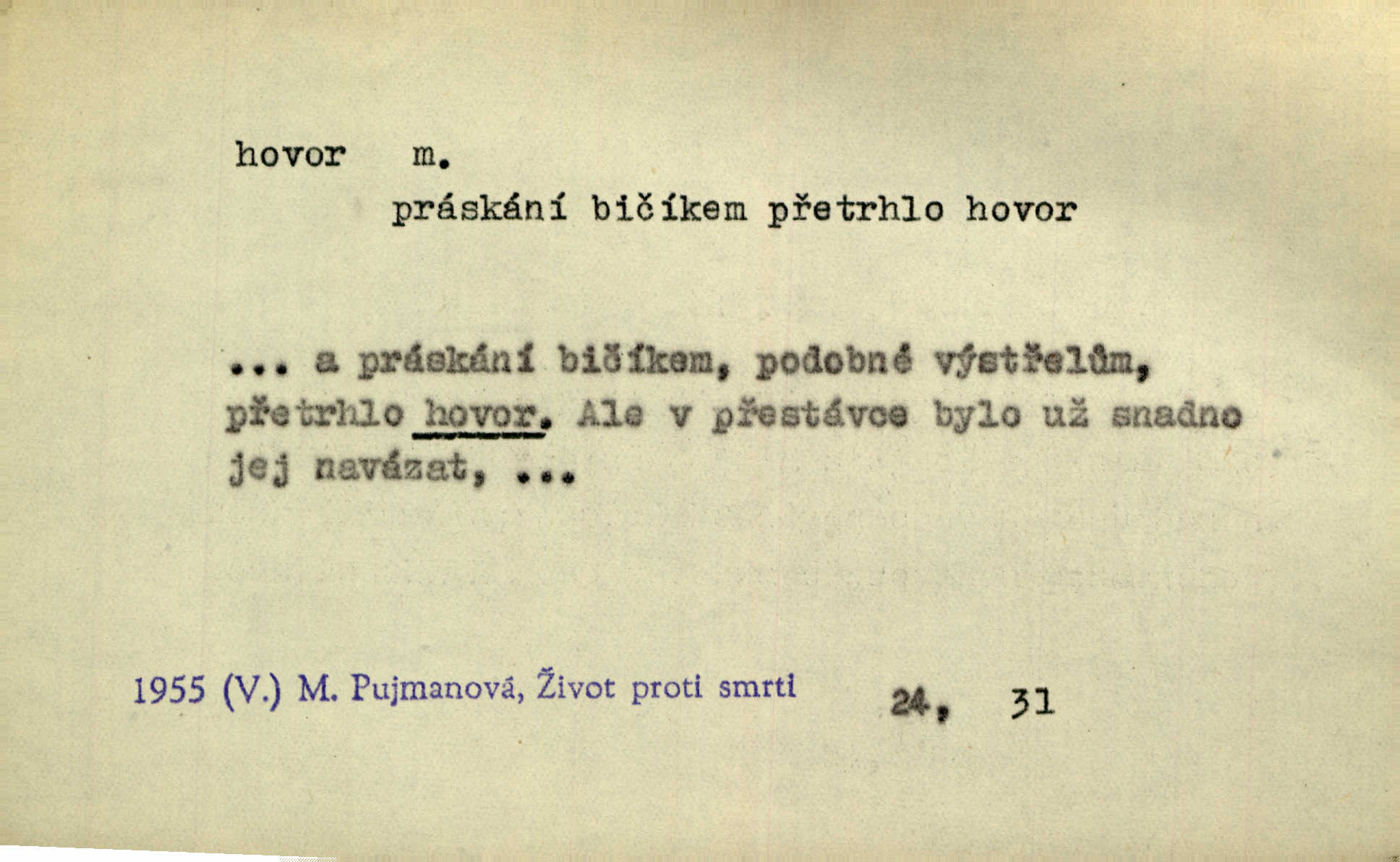 - hovor, -u m. rozprávka, rozmluva, konversace. Bylo slyšeti přitlumený hovor. Rais. Zpomněli si na onen hovor, jejž vedli v den Hrabcova povýšení. Herb. Hovor vázne. Není mi do hovoru. Přen. Turci nechávali hovor našich děl bez odpovědi střelbu. Hol. Telef. rozmluva telefonem. Hovor obyčejný, nutný, místní, meziměstský, státní.