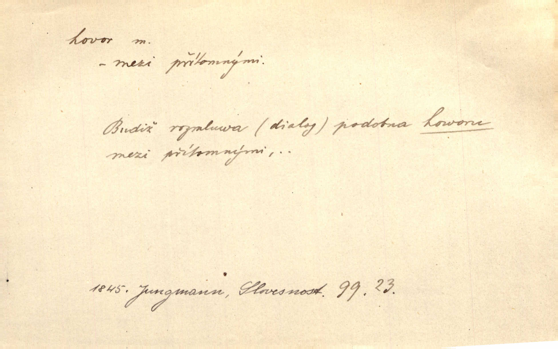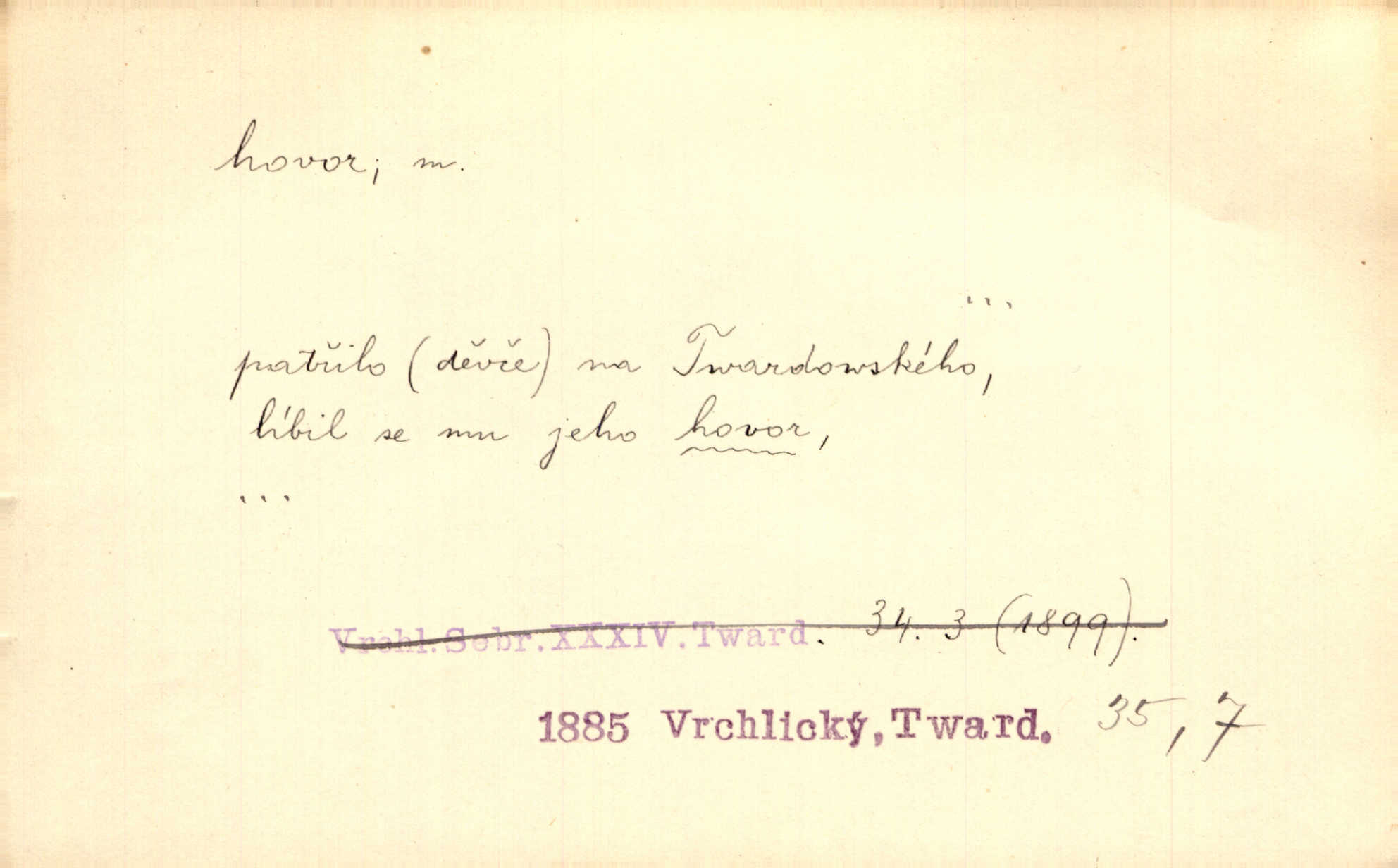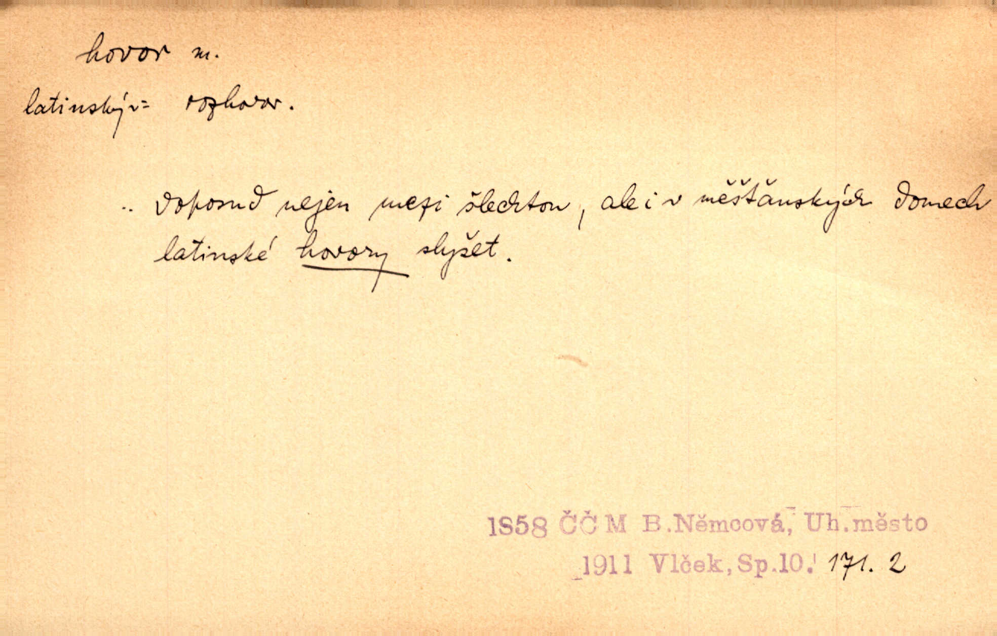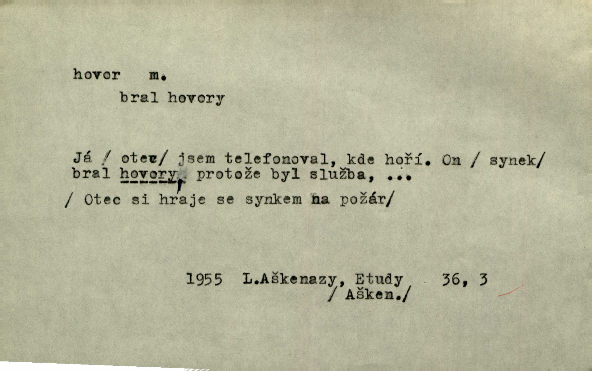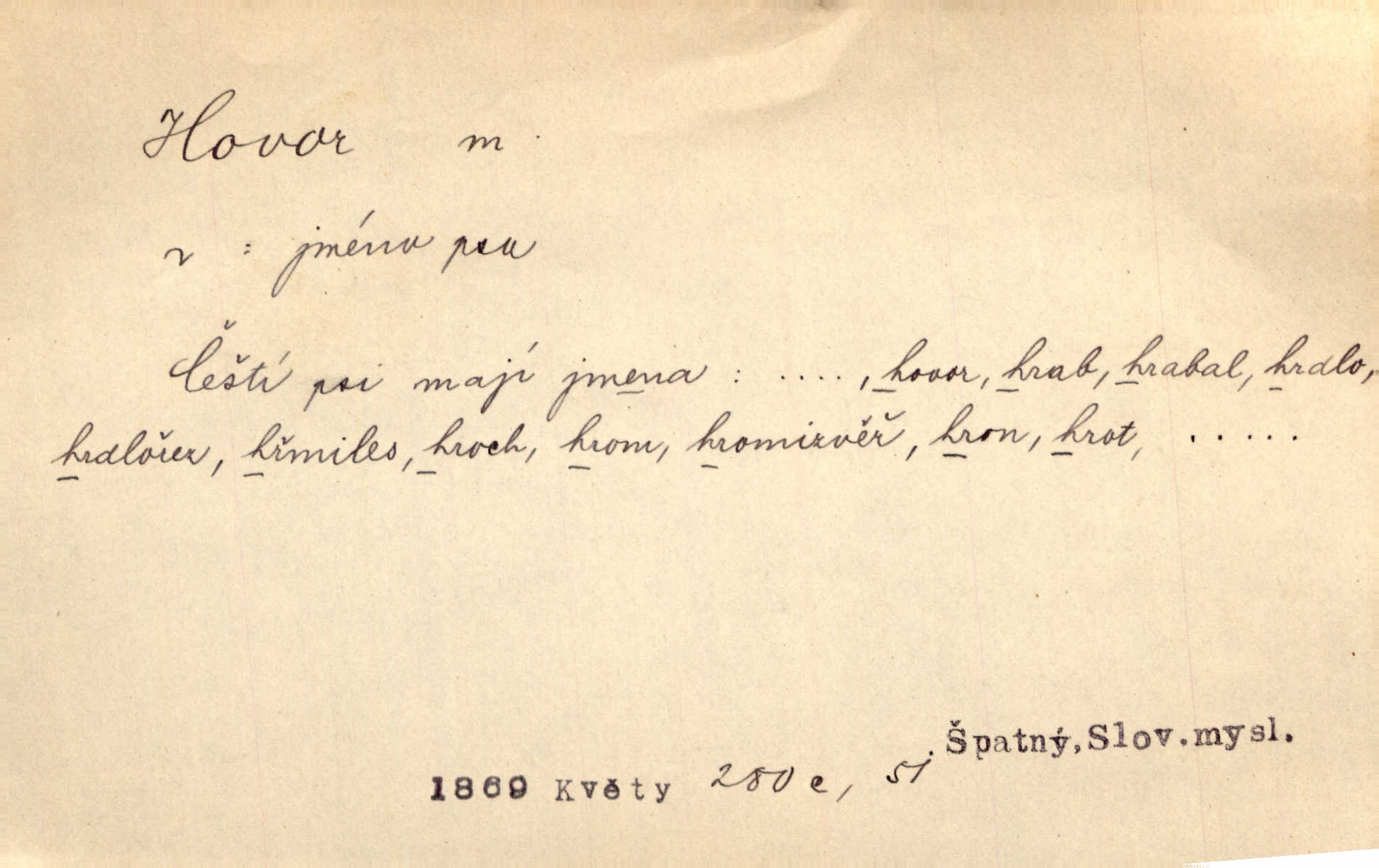 - hovor, -u m. rozprávka, rozmluva, konversace. Bylo slyšeti přitlumený hovor. Rais. Zpomněli si na onen hovor, jejž vedli v den Hrabcova povýšení. Herb. Hovor vázne. Není mi do hovoru. Přen. Turci nechávali hovor našich děl bez odpovědi střelbu. Hol. Telef. rozmluva telefonem. Hovor obyčejný, nutný, místní, meziměstský, státní.