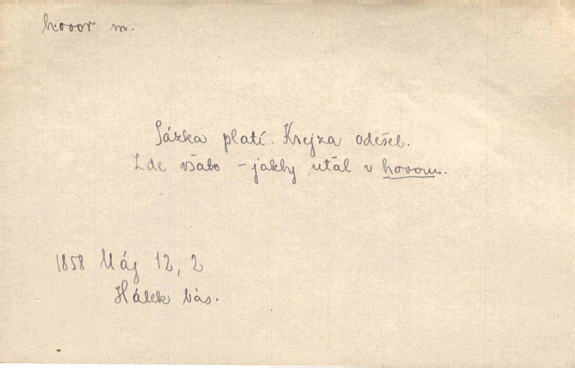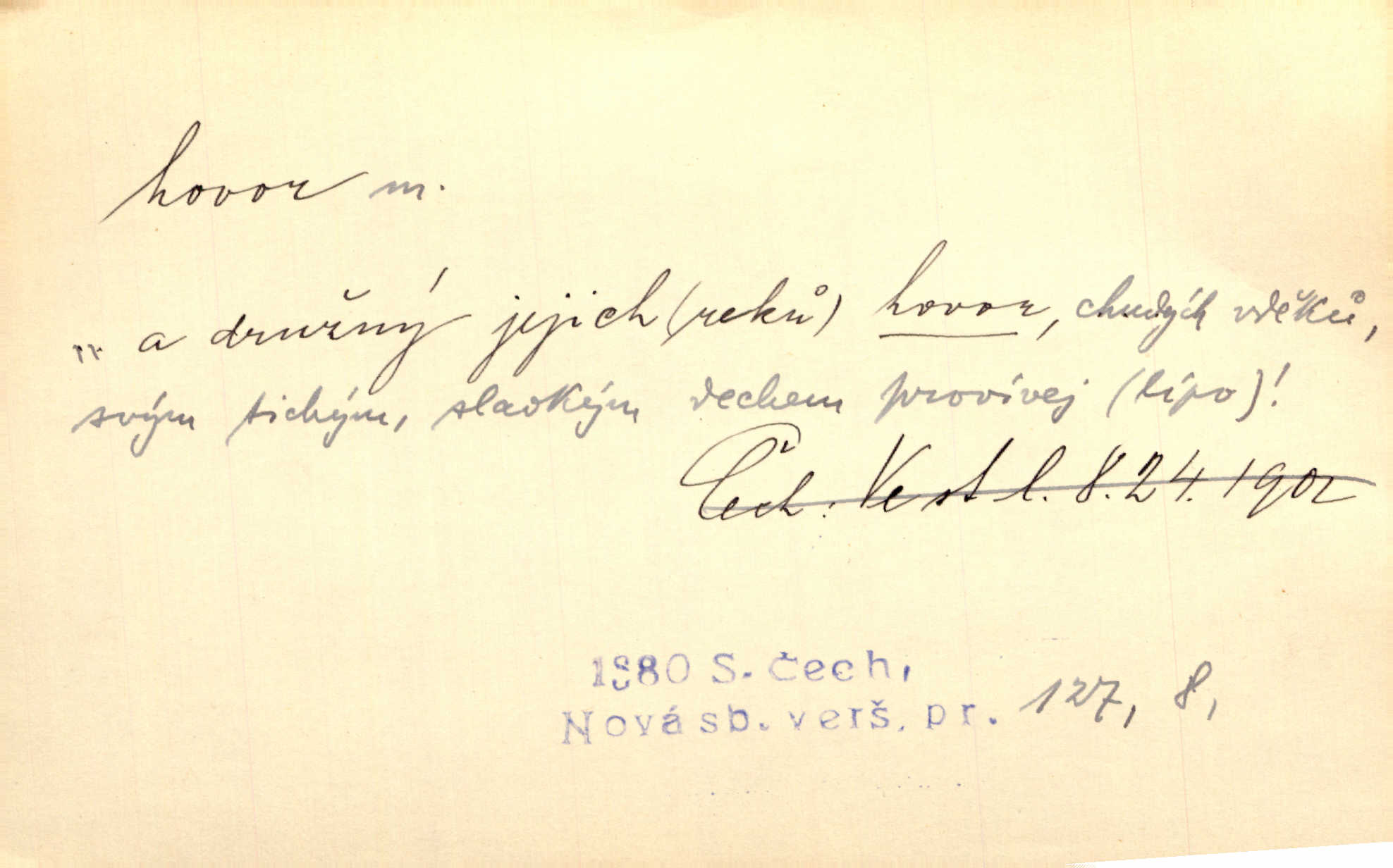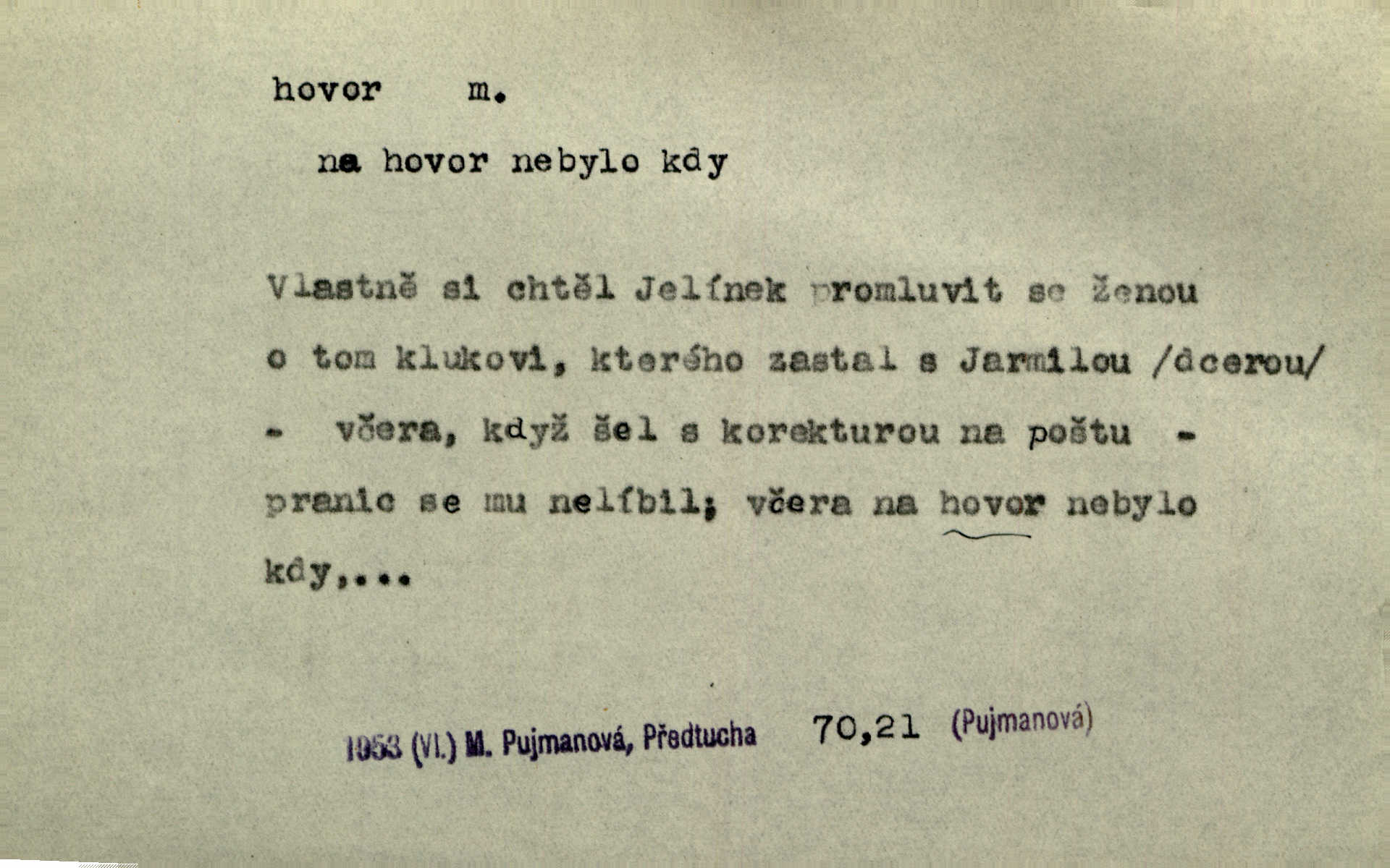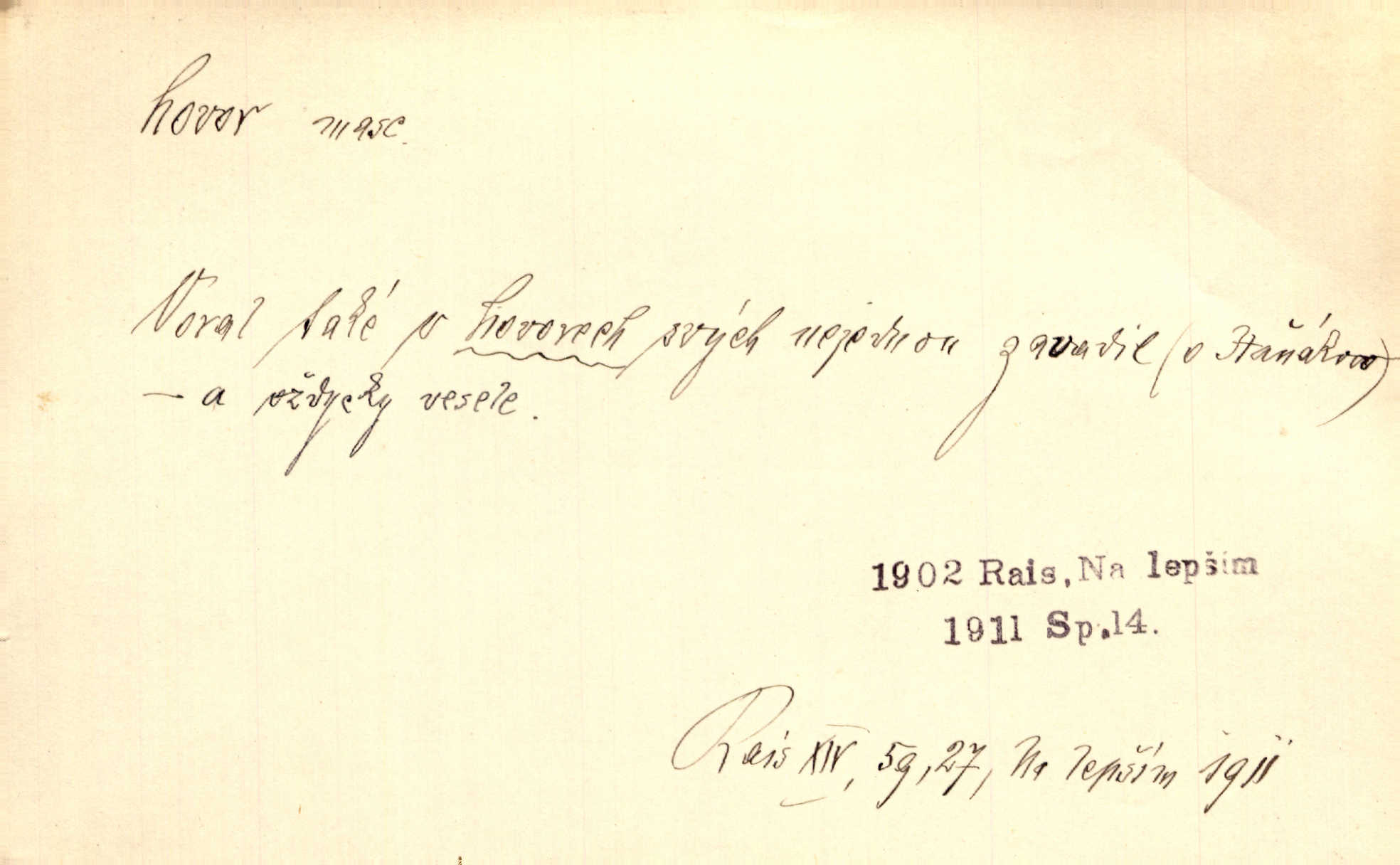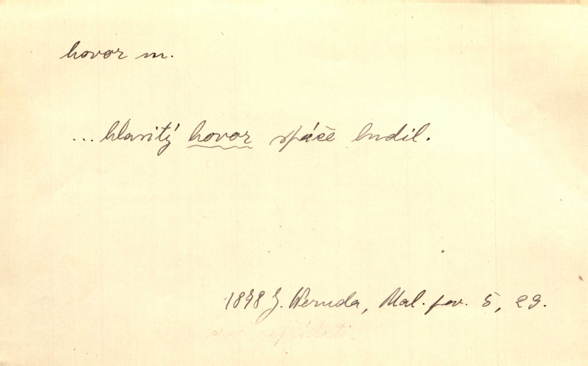 - hovor, -u m. rozprávka, rozmluva, konversace. Bylo slyšeti přitlumený hovor. Rais. Zpomněli si na onen hovor, jejž vedli v den Hrabcova povýšení. Herb. Hovor vázne. Není mi do hovoru. Přen. Turci nechávali hovor našich děl bez odpovědi střelbu. Hol. Telef. rozmluva telefonem. Hovor obyčejný, nutný, místní, meziměstský, státní.