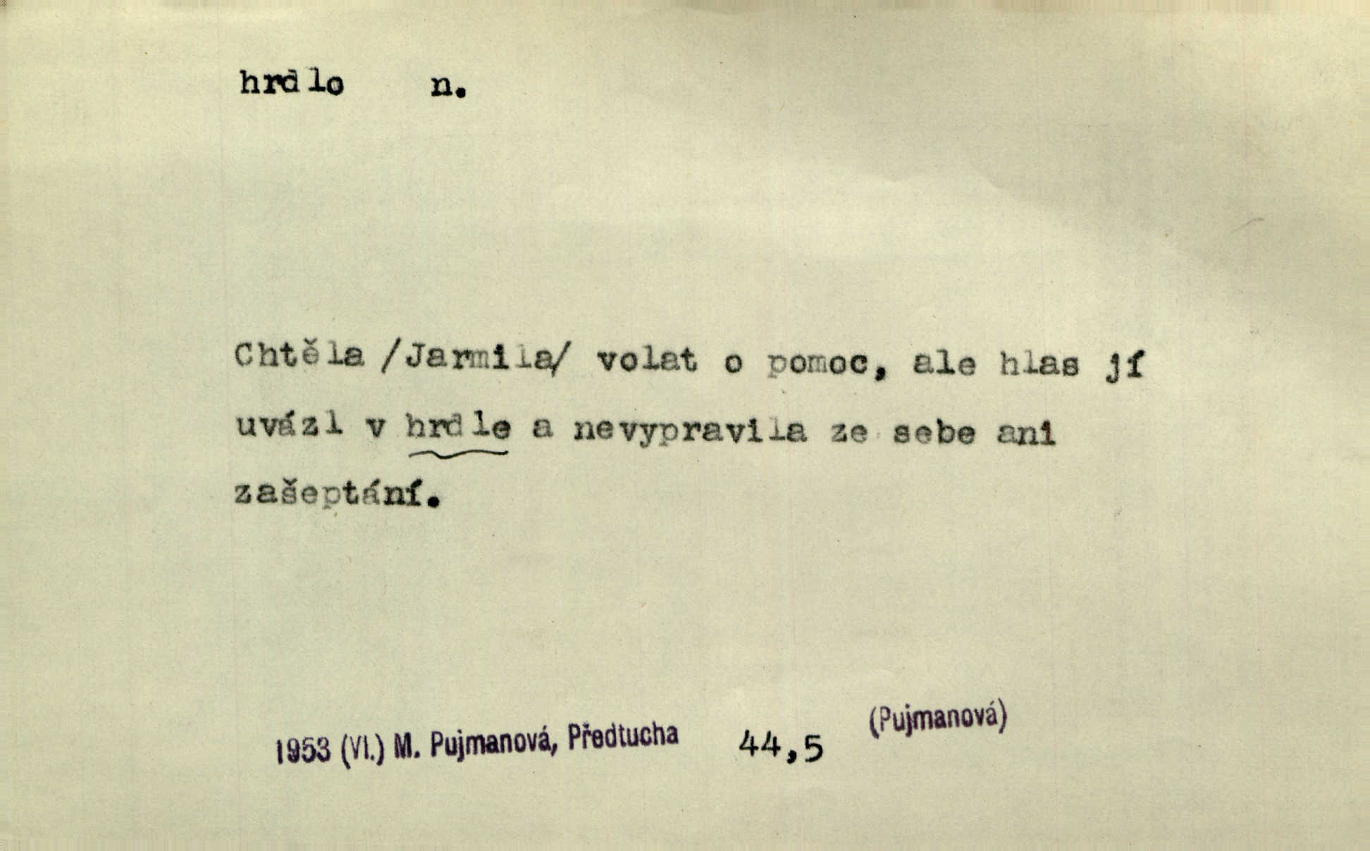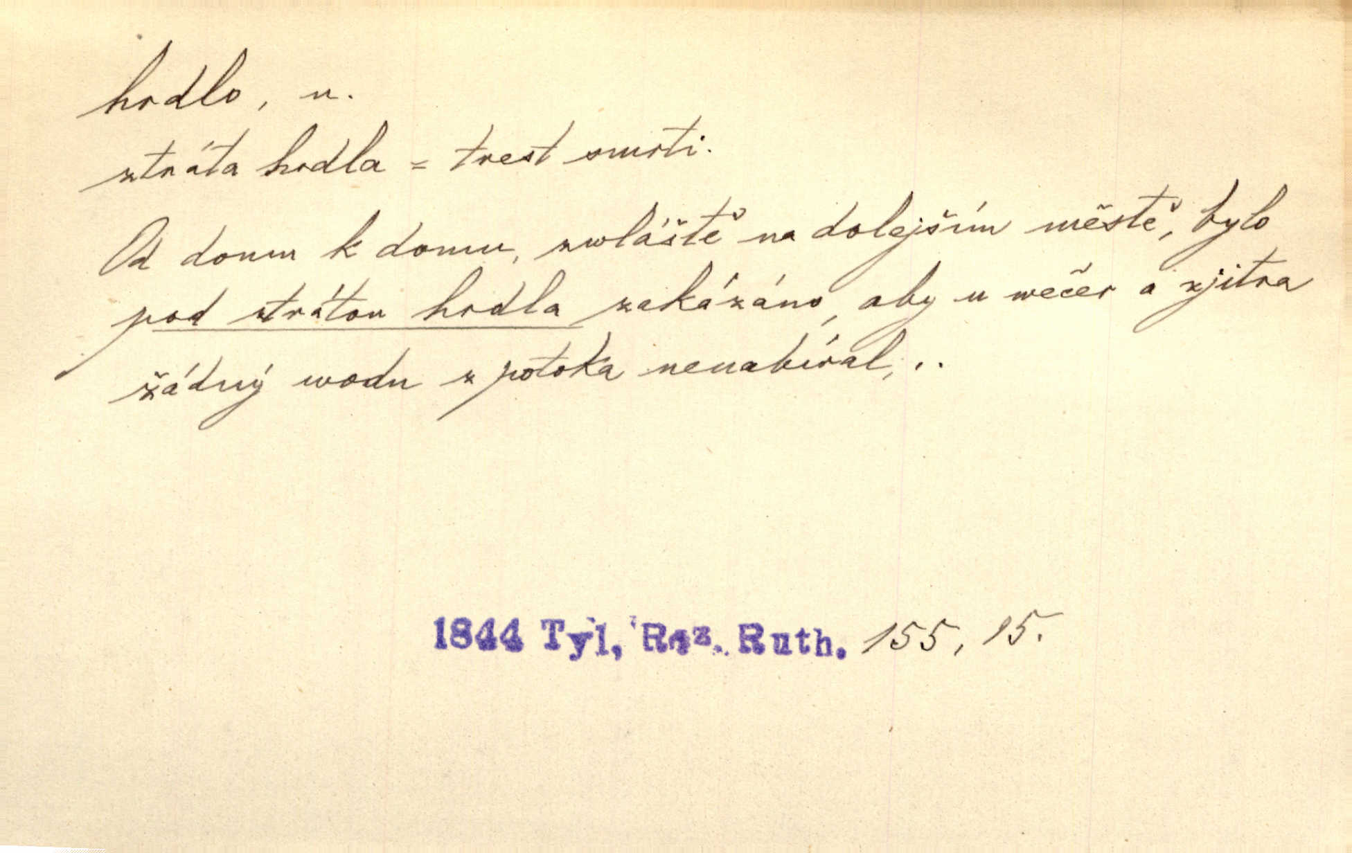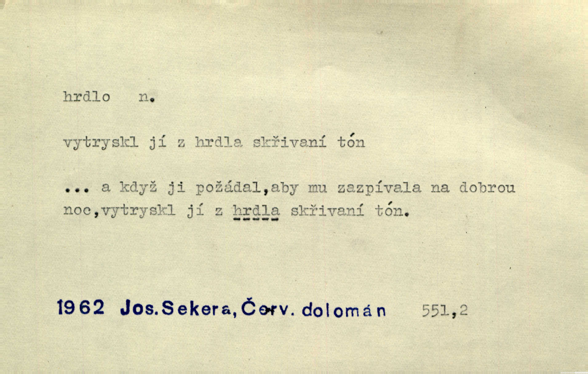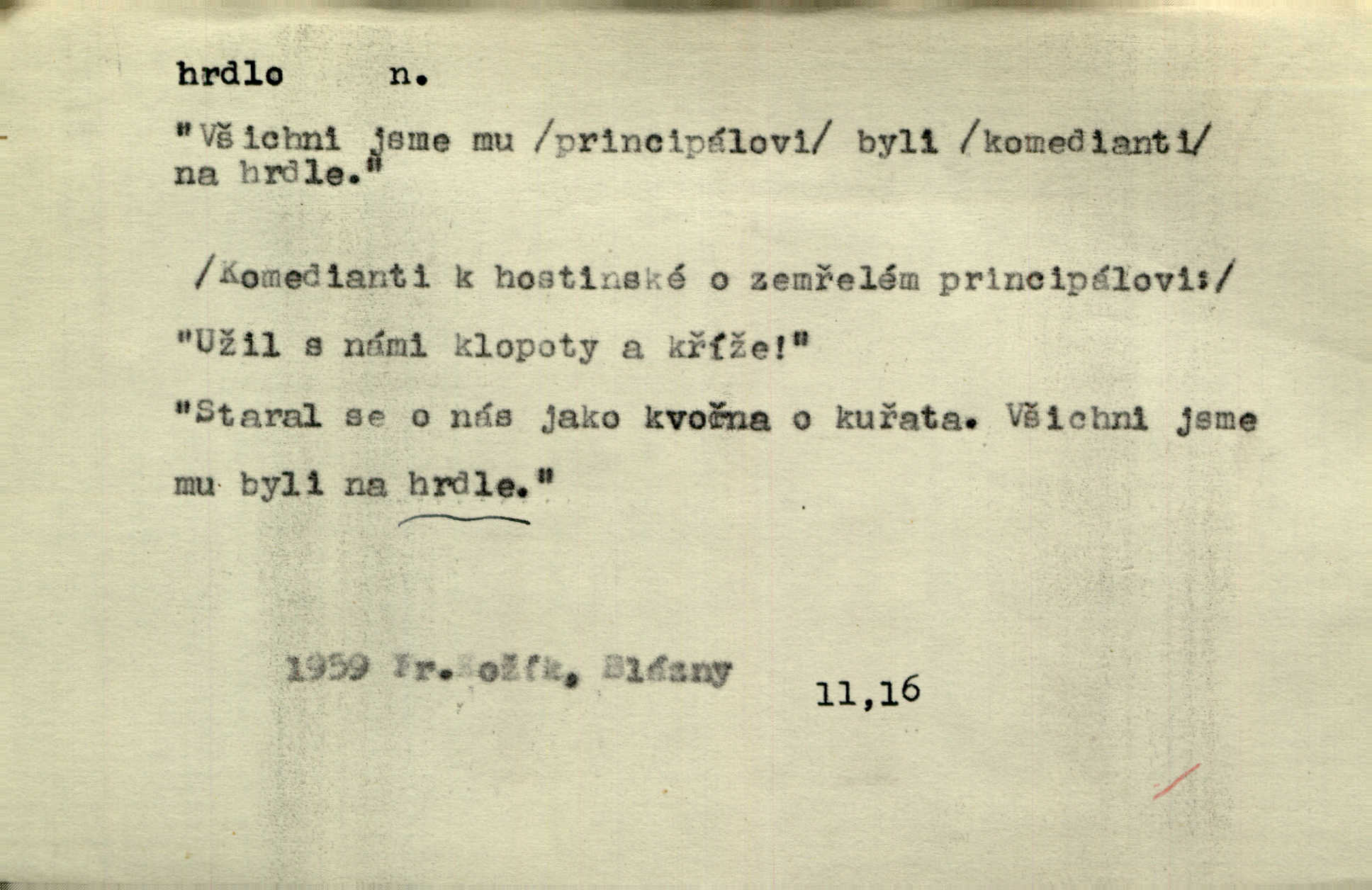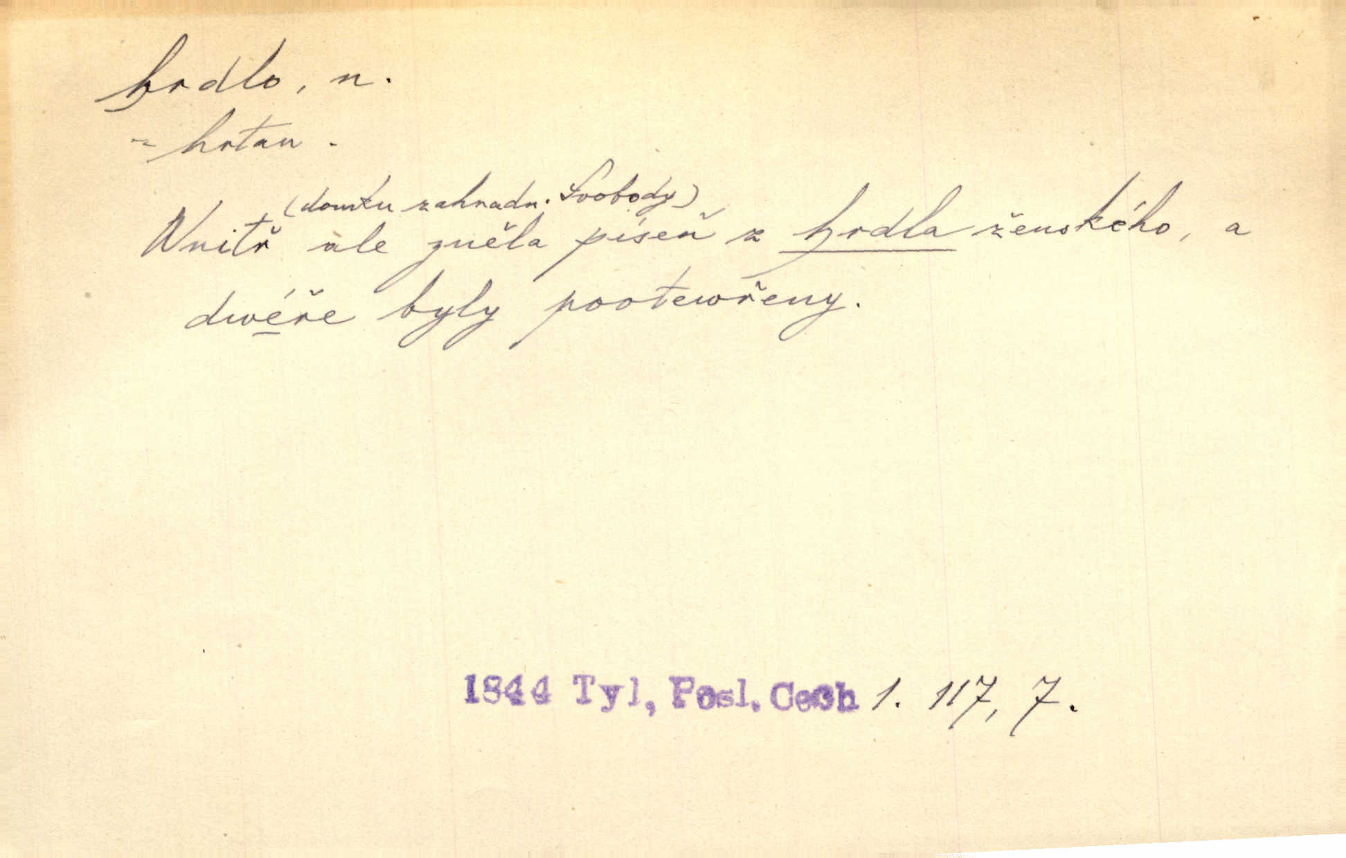 - hrdlo, -a n. hltan a hrtan. Lil nešťastnému člověku v hrdlo ocet. Win. Vypráhlo mi v hrdle. Dyk. Dřív propláchněte hrdlo. Hol. Ale počkejte, jak to potom půjde, jak se všecko prožene hrdlem projí a propije. Rais. Co jen hrdlo ráčí, dostaneš. Tyl. Bájili a lhali, co hrdlo ráčí. Přít. Z plna hrdla křičelo [dítě]. Erb. Začal z plného hrdla křičeti. Tyl. „On se červená,“ smál se plným hrdlem. Zey. Baron se smál, co mu hrdlo stačilo. Zey. Znělo z tisíce hrdel: Vyhráno. Purk. Padesát asi hrdel hulákalo „da capo, da capo“. Ner. Jedním hrdlem řvalo to moře lidí: „Nikdy! Nikdy!“ zároveň. Zey. Obě [ženy] chtěly křičet, ale slova jim v hrdle vázla. Praž. pos. Již mu v hrdle hrají. Za chvíli bude po něm. Jir. D přední část krku, krk. Černý Tatar ostří nože boří v beránka hrdlo bělavé. Mach. Synkové měli na hrdlech pestré mašle. Rais. Její hrdlo liliové sloupec kosti ze slonové. Jabl. Svíraje mu hrdlo, bil hlavou jeho o podlahu. Kam. V polích položil jsem Čehonovi přímo nůž na hrdlo. „Proč jsi vlastně zpíval rakouskou hymnu?“ Dyk. D život. Chceme hájiti práv těch, co naše síly stačí, nechť se stane cokoliv, až do těch hrdel a statků! Kar. kn. Schwarzenberg. Jinde za falešnou minci trestají i na hrdle smrtí. Třeb. Propadls’ mi hrdlem životem. Mah. Vsázím své hrdlo, že každá Anna je „líbezná“ život. Ner. Snad si chce sáhnouti na hrdlo spáchati sebevraždu. Prav. Svým hrdlem ručíte mi za ty věci! životem. Mach. V hrdlo lžete — nestoudný! drze, nestydatě. Štech. Ruku na to dával, že to v hrdlo lež drzá. Jir. D co je hrdlu podobné. Hrdlo kytary. Čech. Hrdlo láhve. Herrm. Džbán s dlouhým výčepním hrdlem. Ner. Zlomil jsem pušku, do hrdla nacpal náboj. V. Mrš. Tech. válcovité rozšíření na konci roury, do něhož se při spojování rour zastrkuje roura druhá. Hrdlo baňky, trouby. Anat. hrdlo děložní cervix uteri.