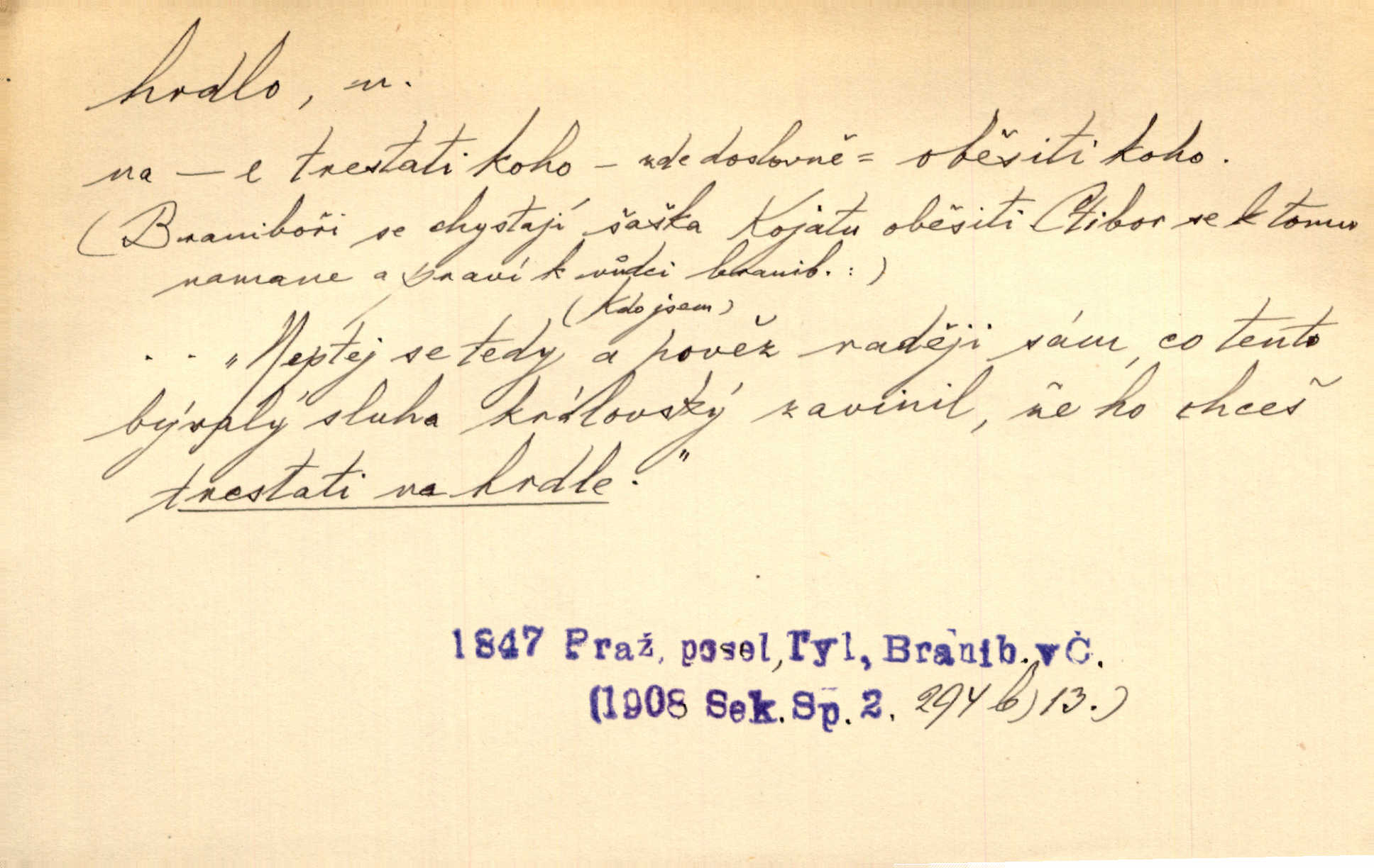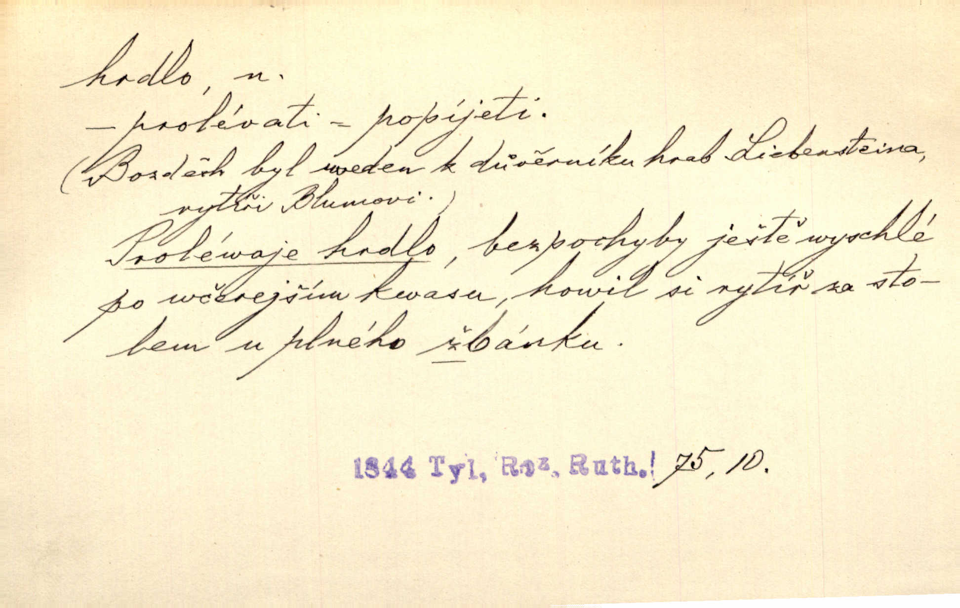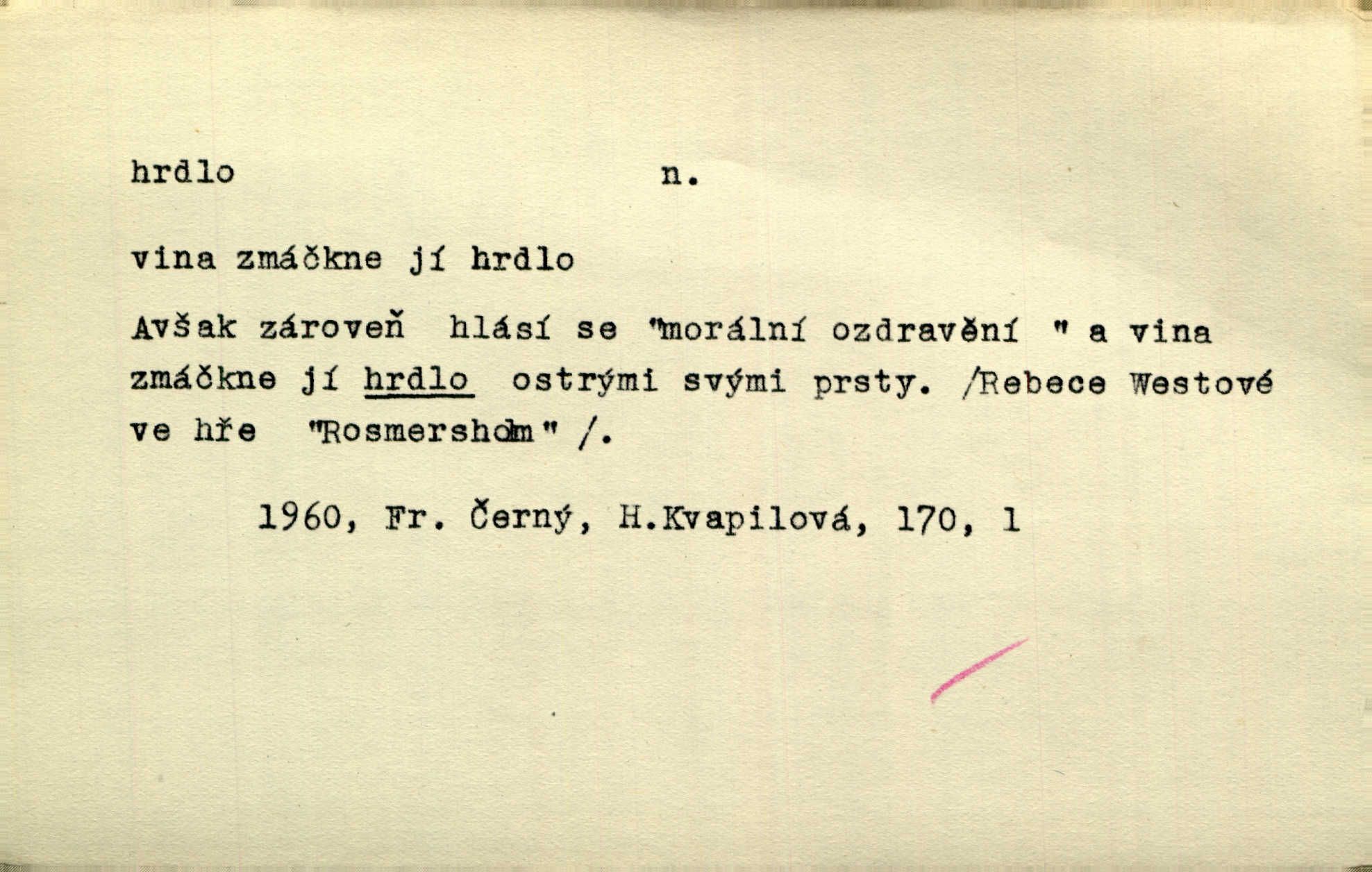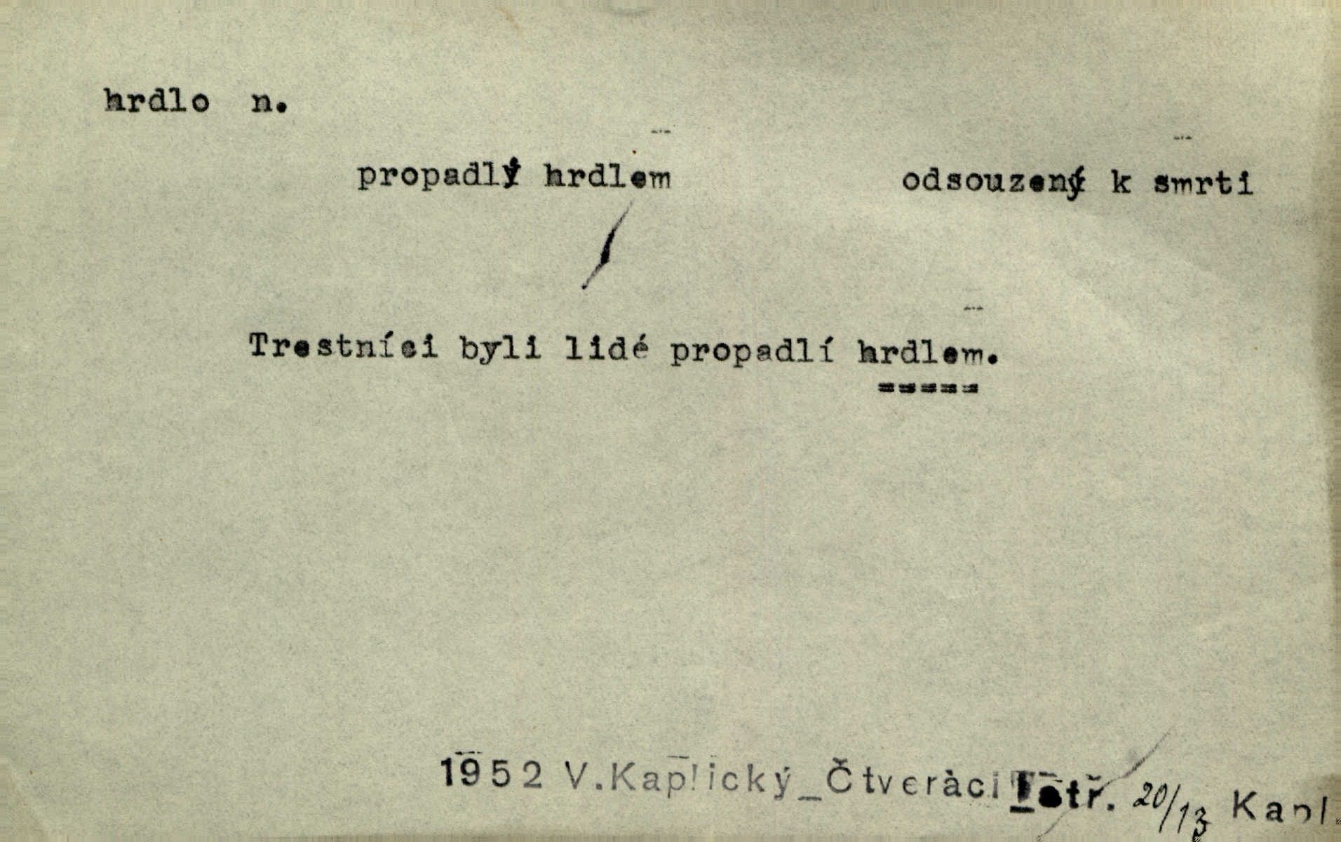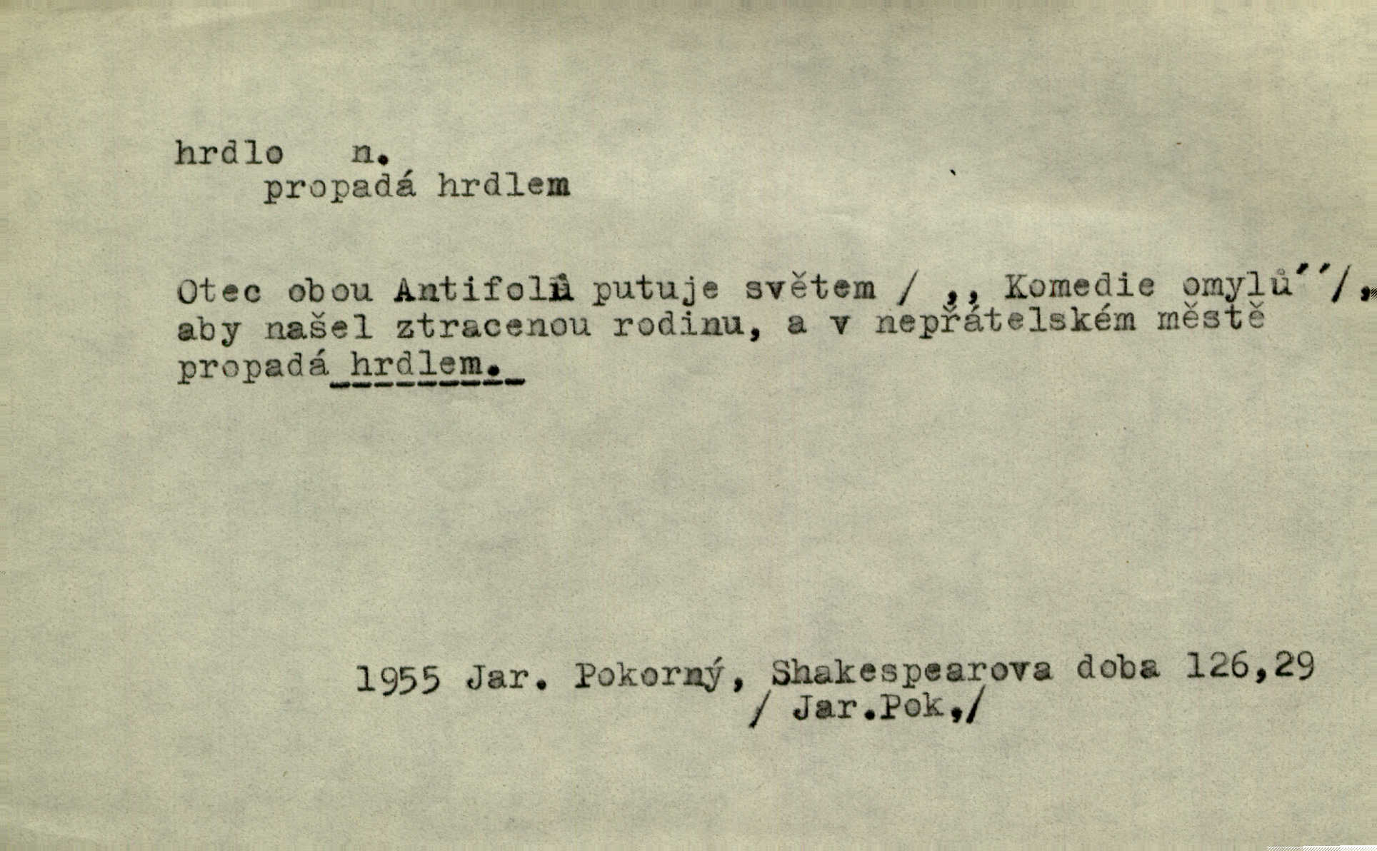 - hrdlo, -a n. hltan a hrtan. Lil nešťastnému člověku v hrdlo ocet. Win. Vypráhlo mi v hrdle. Dyk. Dřív propláchněte hrdlo. Hol. Ale počkejte, jak to potom půjde, jak se všecko prožene hrdlem projí a propije. Rais. Co jen hrdlo ráčí, dostaneš. Tyl. Bájili a lhali, co hrdlo ráčí. Přít. Z plna hrdla křičelo [dítě]. Erb. Začal z plného hrdla křičeti. Tyl. „On se červená,“ smál se plným hrdlem. Zey. Baron se smál, co mu hrdlo stačilo. Zey. Znělo z tisíce hrdel: Vyhráno. Purk. Padesát asi hrdel hulákalo „da capo, da capo“. Ner. Jedním hrdlem řvalo to moře lidí: „Nikdy! Nikdy!“ zároveň. Zey. Obě [ženy] chtěly křičet, ale slova jim v hrdle vázla. Praž. pos. Již mu v hrdle hrají. Za chvíli bude po něm. Jir. D přední část krku, krk. Černý Tatar ostří nože boří v beránka hrdlo bělavé. Mach. Synkové měli na hrdlech pestré mašle. Rais. Její hrdlo liliové sloupec kosti ze slonové. Jabl. Svíraje mu hrdlo, bil hlavou jeho o podlahu. Kam. V polích položil jsem Čehonovi přímo nůž na hrdlo. „Proč jsi vlastně zpíval rakouskou hymnu?“ Dyk. D život. Chceme hájiti práv těch, co naše síly stačí, nechť se stane cokoliv, až do těch hrdel a statků! Kar. kn. Schwarzenberg. Jinde za falešnou minci trestají i na hrdle smrtí. Třeb. Propadls’ mi hrdlem životem. Mah. Vsázím své hrdlo, že každá Anna je „líbezná“ život. Ner. Snad si chce sáhnouti na hrdlo spáchati sebevraždu. Prav. Svým hrdlem ručíte mi za ty věci! životem. Mach. V hrdlo lžete — nestoudný! drze, nestydatě. Štech. Ruku na to dával, že to v hrdlo lež drzá. Jir. D co je hrdlu podobné. Hrdlo kytary. Čech. Hrdlo láhve. Herrm. Džbán s dlouhým výčepním hrdlem. Ner. Zlomil jsem pušku, do hrdla nacpal náboj. V. Mrš. Tech. válcovité rozšíření na konci roury, do něhož se při spojování rour zastrkuje roura druhá. Hrdlo baňky, trouby. Anat. hrdlo děložní cervix uteri.