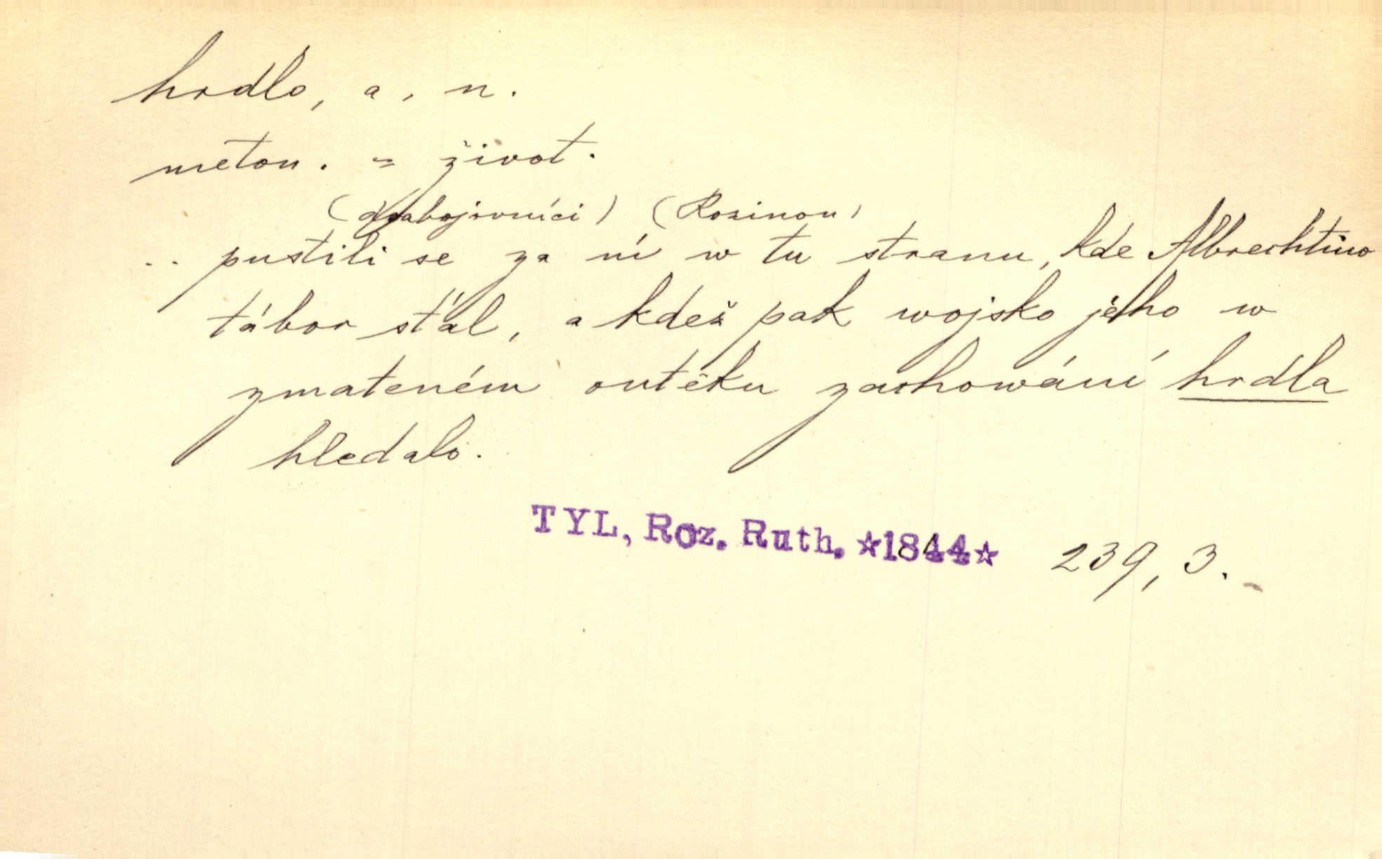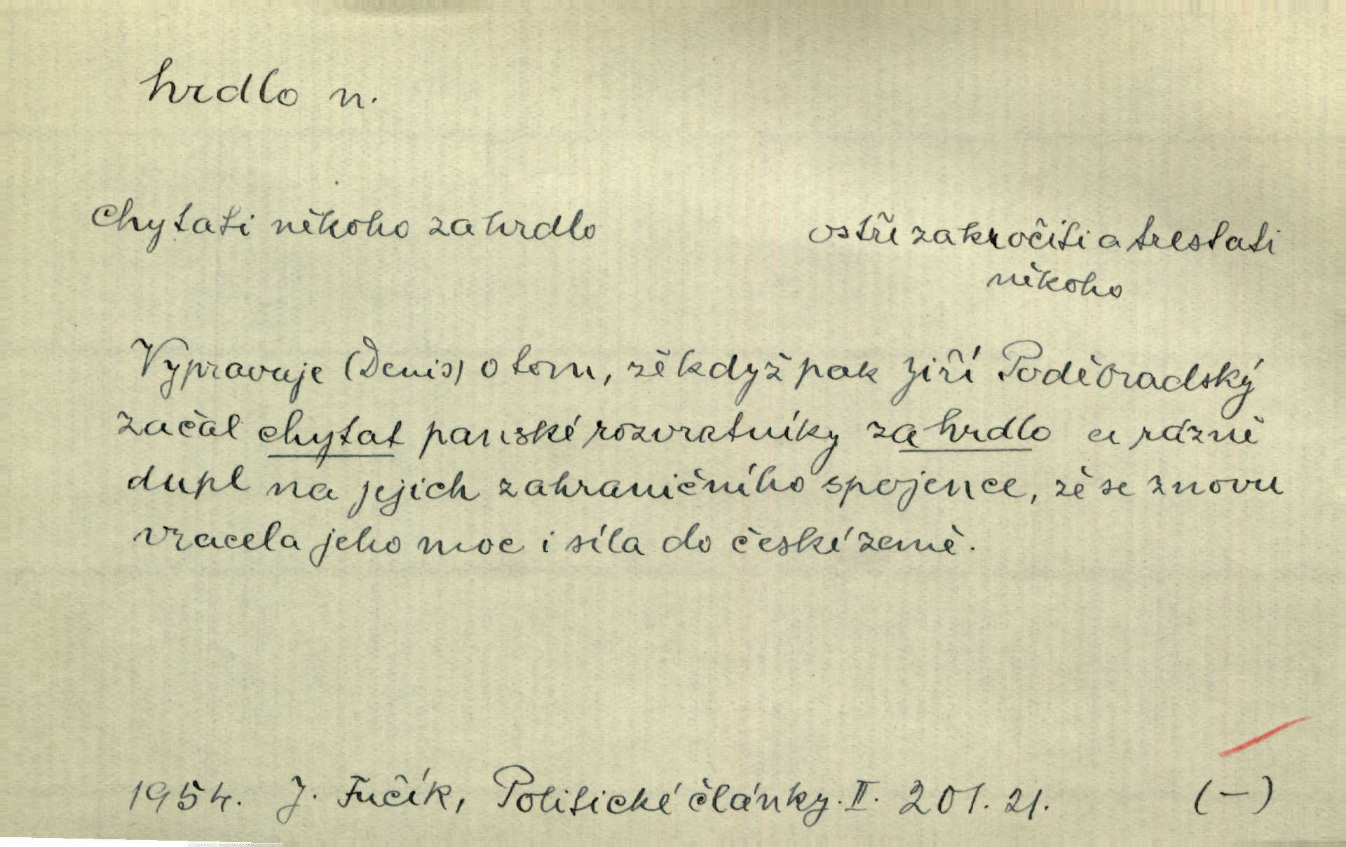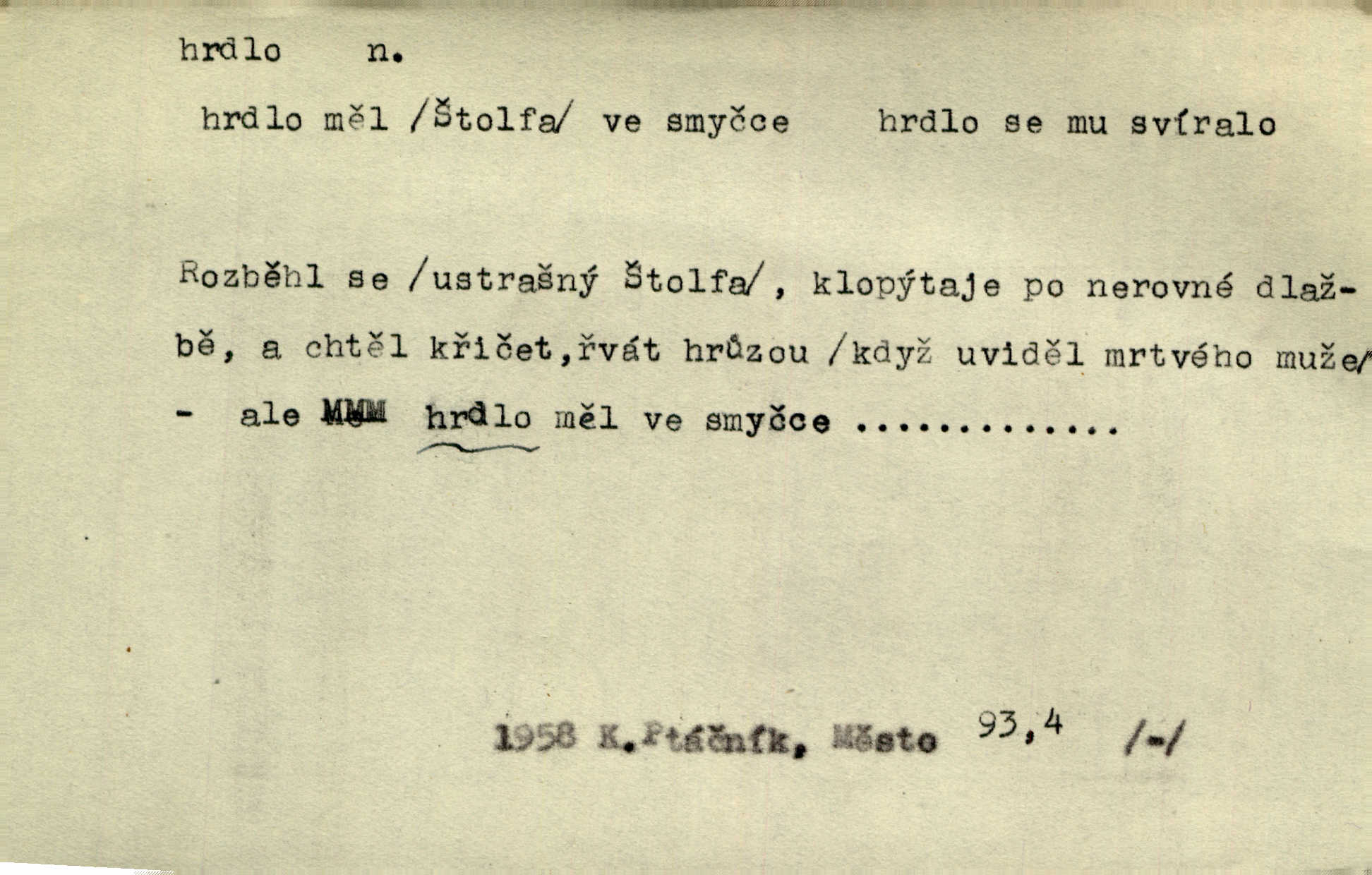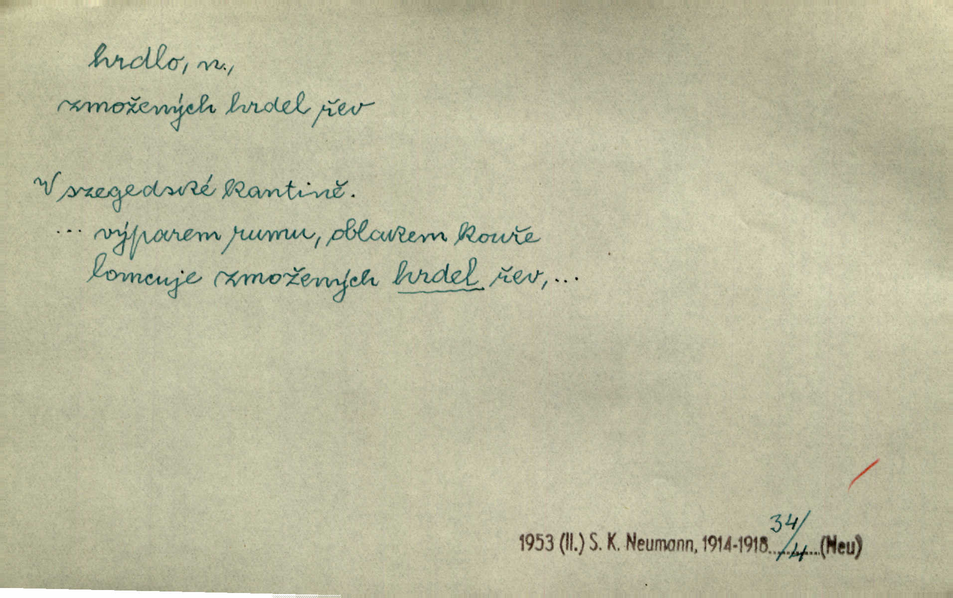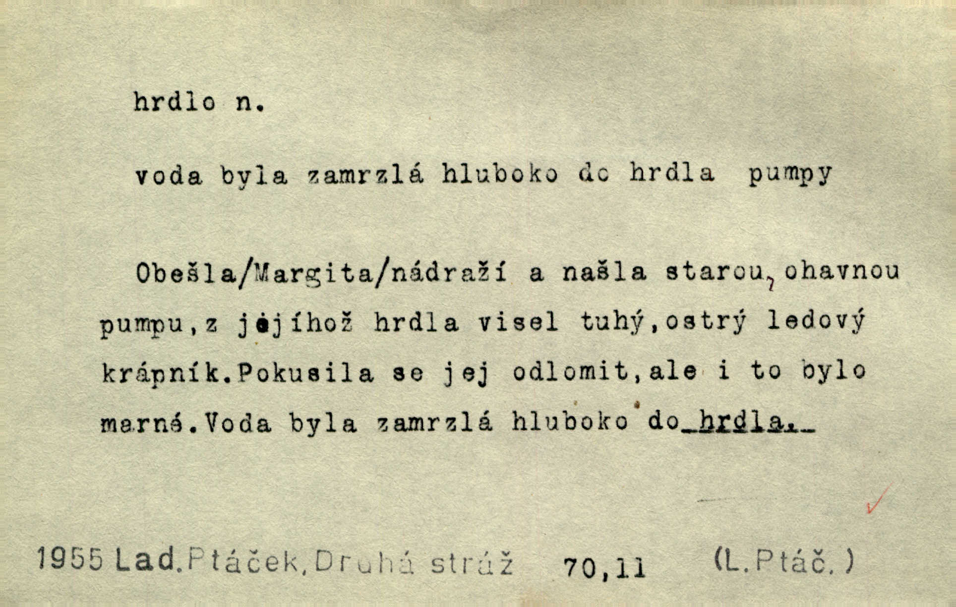- hrdlo, -a n. hltan a hrtan. Lil nešťastnému člověku v hrdlo ocet. Win. Vypráhlo mi v hrdle. Dyk. Dřív propláchněte hrdlo. Hol. Ale počkejte, jak to potom půjde, jak se všecko prožene hrdlem projí a propije. Rais. Co jen hrdlo ráčí, dostaneš. Tyl. Bájili a lhali, co hrdlo ráčí. Přít. Z plna hrdla křičelo [dítě]. Erb. Začal z plného hrdla křičeti. Tyl. „On se červená,“ smál se plným hrdlem. Zey. Baron se smál, co mu hrdlo stačilo. Zey. Znělo z tisíce hrdel: Vyhráno. Purk. Padesát asi hrdel hulákalo „da capo, da capo“. Ner. Jedním hrdlem řvalo to moře lidí: „Nikdy! Nikdy!“ zároveň. Zey. Obě [ženy] chtěly křičet, ale slova jim v hrdle vázla. Praž. pos. Již mu v hrdle hrají. Za chvíli bude po něm. Jir. D přední část krku, krk. Černý Tatar ostří nože boří v beránka hrdlo bělavé. Mach. Synkové měli na hrdlech pestré mašle. Rais. Její hrdlo liliové sloupec kosti ze slonové. Jabl. Svíraje mu hrdlo, bil hlavou jeho o podlahu. Kam. V polích položil jsem Čehonovi přímo nůž na hrdlo. „Proč jsi vlastně zpíval rakouskou hymnu?“ Dyk. D život. Chceme hájiti práv těch, co naše síly stačí, nechť se stane cokoliv, až do těch hrdel a statků! Kar. kn. Schwarzenberg. Jinde za falešnou minci trestají i na hrdle smrtí. Třeb. Propadls’ mi hrdlem životem. Mah. Vsázím své hrdlo, že každá Anna je „líbezná“ život. Ner. Snad si chce sáhnouti na hrdlo spáchati sebevraždu. Prav. Svým hrdlem ručíte mi za ty věci! životem. Mach. V hrdlo lžete — nestoudný! drze, nestydatě. Štech. Ruku na to dával, že to v hrdlo lež drzá. Jir. D co je hrdlu podobné. Hrdlo kytary. Čech. Hrdlo láhve. Herrm. Džbán s dlouhým výčepním hrdlem. Ner. Zlomil jsem pušku, do hrdla nacpal náboj. V. Mrš. Tech. válcovité rozšíření na konci roury, do něhož se při spojování rour zastrkuje roura druhá. Hrdlo baňky, trouby. Anat. hrdlo děložní cervix uteri.