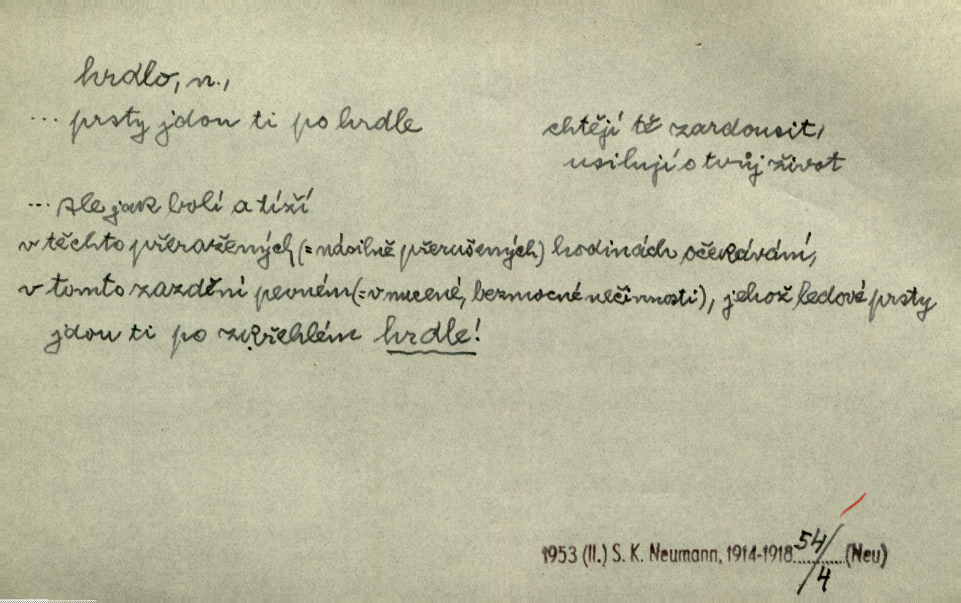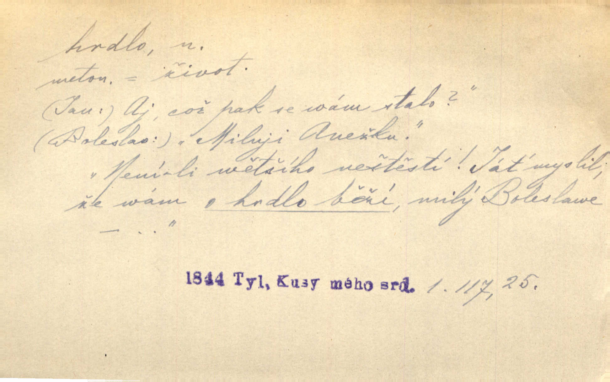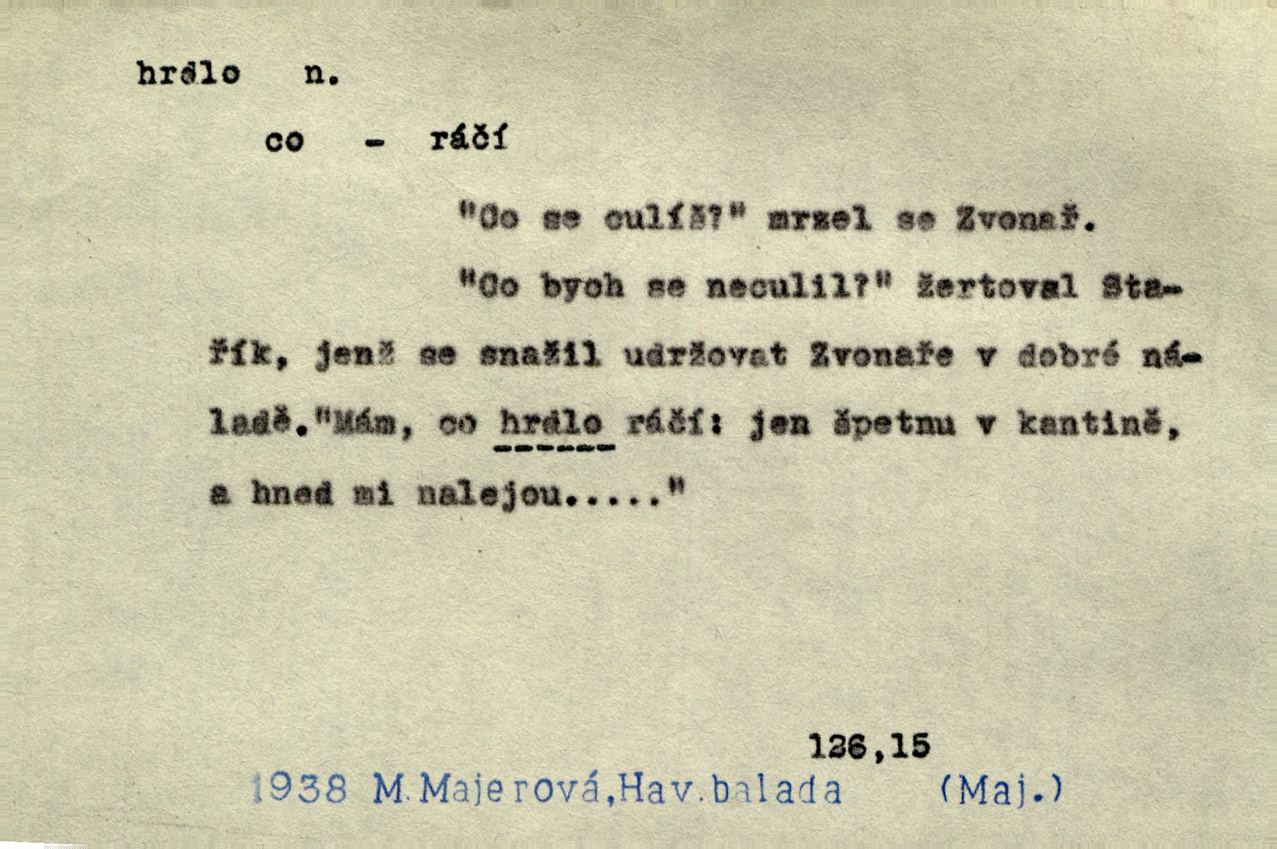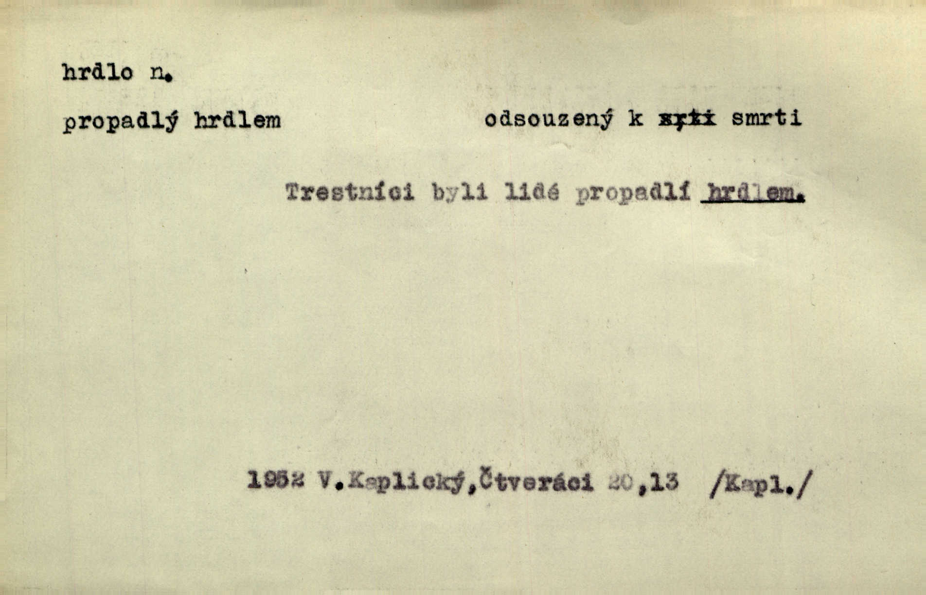 - hrdlo, -a n. hltan a hrtan. Lil nešťastnému člověku v hrdlo ocet. Win. Vypráhlo mi v hrdle. Dyk. Dřív propláchněte hrdlo. Hol. Ale počkejte, jak to potom půjde, jak se všecko prožene hrdlem projí a propije. Rais. Co jen hrdlo ráčí, dostaneš. Tyl. Bájili a lhali, co hrdlo ráčí. Přít. Z plna hrdla křičelo [dítě]. Erb. Začal z plného hrdla křičeti. Tyl. „On se červená,“ smál se plným hrdlem. Zey. Baron se smál, co mu hrdlo stačilo. Zey. Znělo z tisíce hrdel: Vyhráno. Purk. Padesát asi hrdel hulákalo „da capo, da capo“. Ner. Jedním hrdlem řvalo to moře lidí: „Nikdy! Nikdy!“ zároveň. Zey. Obě [ženy] chtěly křičet, ale slova jim v hrdle vázla. Praž. pos. Již mu v hrdle hrají. Za chvíli bude po něm. Jir. D přední část krku, krk. Černý Tatar ostří nože boří v beránka hrdlo bělavé. Mach. Synkové měli na hrdlech pestré mašle. Rais. Její hrdlo liliové sloupec kosti ze slonové. Jabl. Svíraje mu hrdlo, bil hlavou jeho o podlahu. Kam. V polích položil jsem Čehonovi přímo nůž na hrdlo. „Proč jsi vlastně zpíval rakouskou hymnu?“ Dyk. D život. Chceme hájiti práv těch, co naše síly stačí, nechť se stane cokoliv, až do těch hrdel a statků! Kar. kn. Schwarzenberg. Jinde za falešnou minci trestají i na hrdle smrtí. Třeb. Propadls’ mi hrdlem životem. Mah. Vsázím své hrdlo, že každá Anna je „líbezná“ život. Ner. Snad si chce sáhnouti na hrdlo spáchati sebevraždu. Prav. Svým hrdlem ručíte mi za ty věci! životem. Mach. V hrdlo lžete — nestoudný! drze, nestydatě. Štech. Ruku na to dával, že to v hrdlo lež drzá. Jir. D co je hrdlu podobné. Hrdlo kytary. Čech. Hrdlo láhve. Herrm. Džbán s dlouhým výčepním hrdlem. Ner. Zlomil jsem pušku, do hrdla nacpal náboj. V. Mrš. Tech. válcovité rozšíření na konci roury, do něhož se při spojování rour zastrkuje roura druhá. Hrdlo baňky, trouby. Anat. hrdlo děložní cervix uteri.