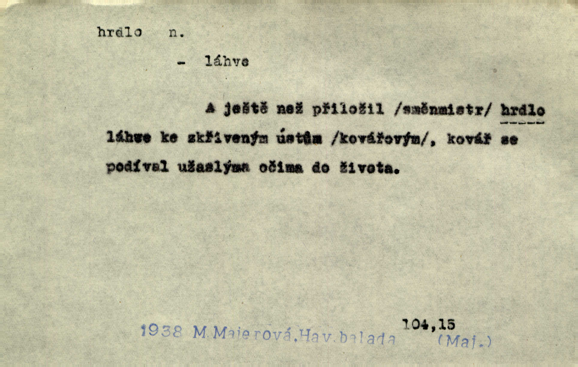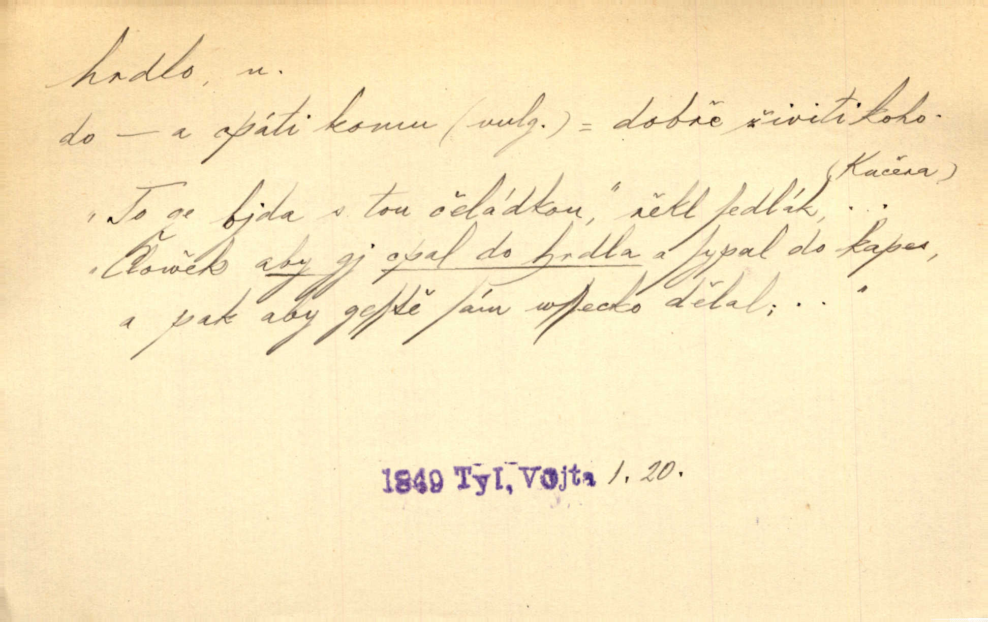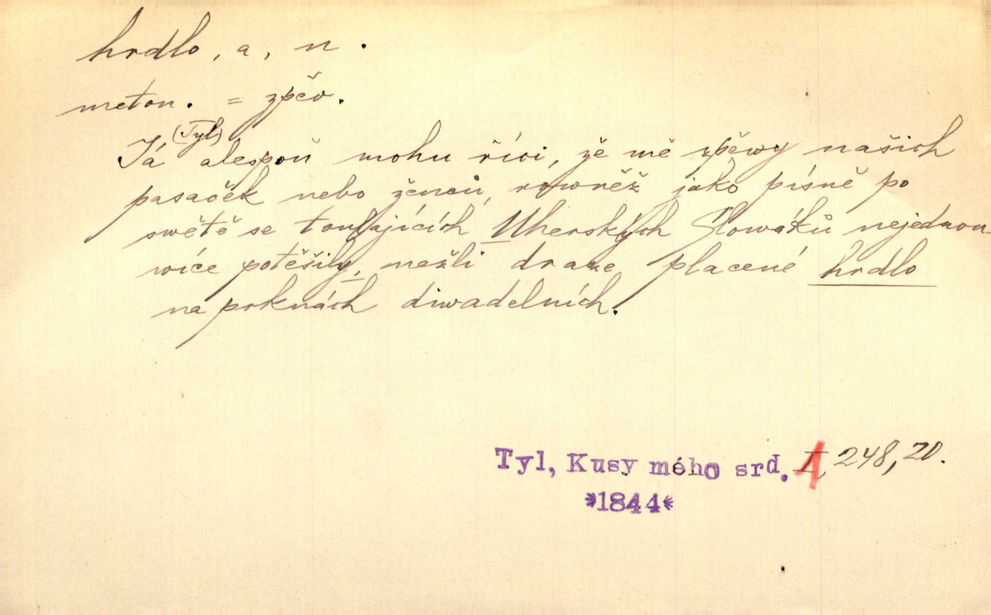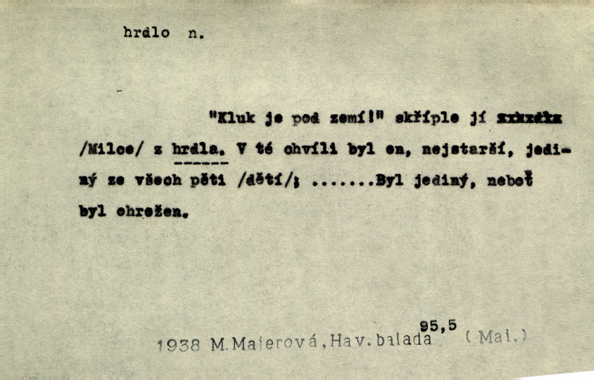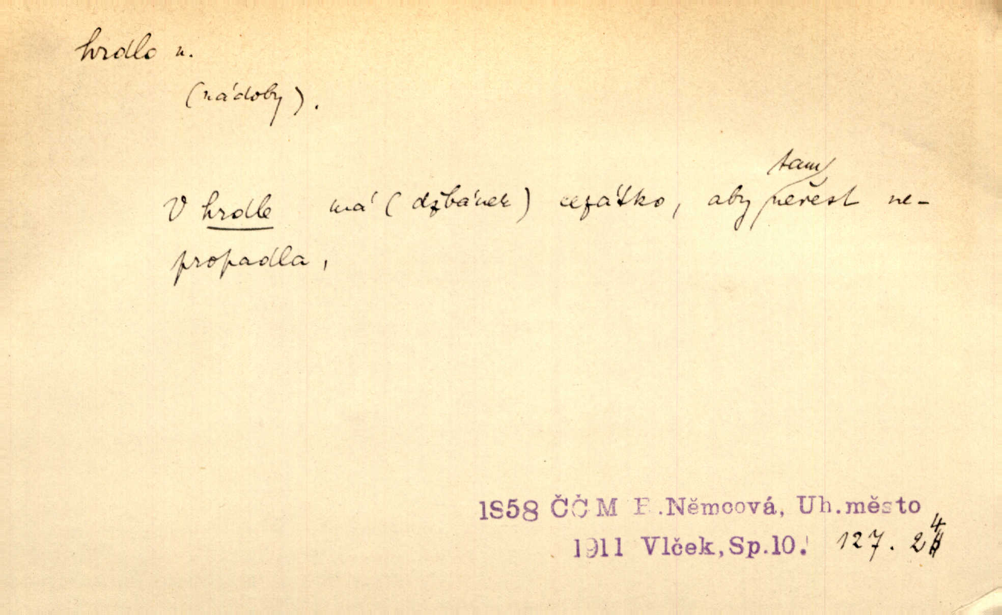 - hrdlo, -a n. hltan a hrtan. Lil nešťastnému člověku v hrdlo ocet. Win. Vypráhlo mi v hrdle. Dyk. Dřív propláchněte hrdlo. Hol. Ale počkejte, jak to potom půjde, jak se všecko prožene hrdlem projí a propije. Rais. Co jen hrdlo ráčí, dostaneš. Tyl. Bájili a lhali, co hrdlo ráčí. Přít. Z plna hrdla křičelo [dítě]. Erb. Začal z plného hrdla křičeti. Tyl. „On se červená,“ smál se plným hrdlem. Zey. Baron se smál, co mu hrdlo stačilo. Zey. Znělo z tisíce hrdel: Vyhráno. Purk. Padesát asi hrdel hulákalo „da capo, da capo“. Ner. Jedním hrdlem řvalo to moře lidí: „Nikdy! Nikdy!“ zároveň. Zey. Obě [ženy] chtěly křičet, ale slova jim v hrdle vázla. Praž. pos. Již mu v hrdle hrají. Za chvíli bude po něm. Jir. D přední část krku, krk. Černý Tatar ostří nože boří v beránka hrdlo bělavé. Mach. Synkové měli na hrdlech pestré mašle. Rais. Její hrdlo liliové sloupec kosti ze slonové. Jabl. Svíraje mu hrdlo, bil hlavou jeho o podlahu. Kam. V polích položil jsem Čehonovi přímo nůž na hrdlo. „Proč jsi vlastně zpíval rakouskou hymnu?“ Dyk. D život. Chceme hájiti práv těch, co naše síly stačí, nechť se stane cokoliv, až do těch hrdel a statků! Kar. kn. Schwarzenberg. Jinde za falešnou minci trestají i na hrdle smrtí. Třeb. Propadls’ mi hrdlem životem. Mah. Vsázím své hrdlo, že každá Anna je „líbezná“ život. Ner. Snad si chce sáhnouti na hrdlo spáchati sebevraždu. Prav. Svým hrdlem ručíte mi za ty věci! životem. Mach. V hrdlo lžete — nestoudný! drze, nestydatě. Štech. Ruku na to dával, že to v hrdlo lež drzá. Jir. D co je hrdlu podobné. Hrdlo kytary. Čech. Hrdlo láhve. Herrm. Džbán s dlouhým výčepním hrdlem. Ner. Zlomil jsem pušku, do hrdla nacpal náboj. V. Mrš. Tech. válcovité rozšíření na konci roury, do něhož se při spojování rour zastrkuje roura druhá. Hrdlo baňky, trouby. Anat. hrdlo děložní cervix uteri.