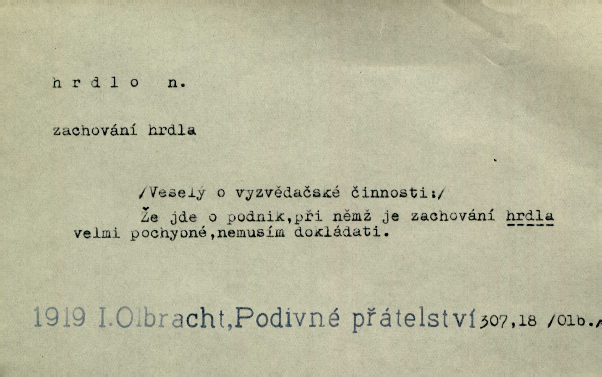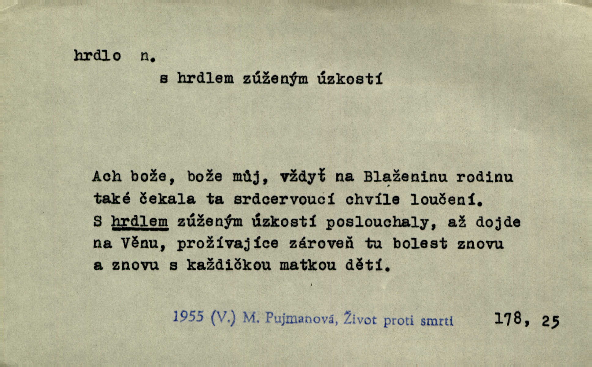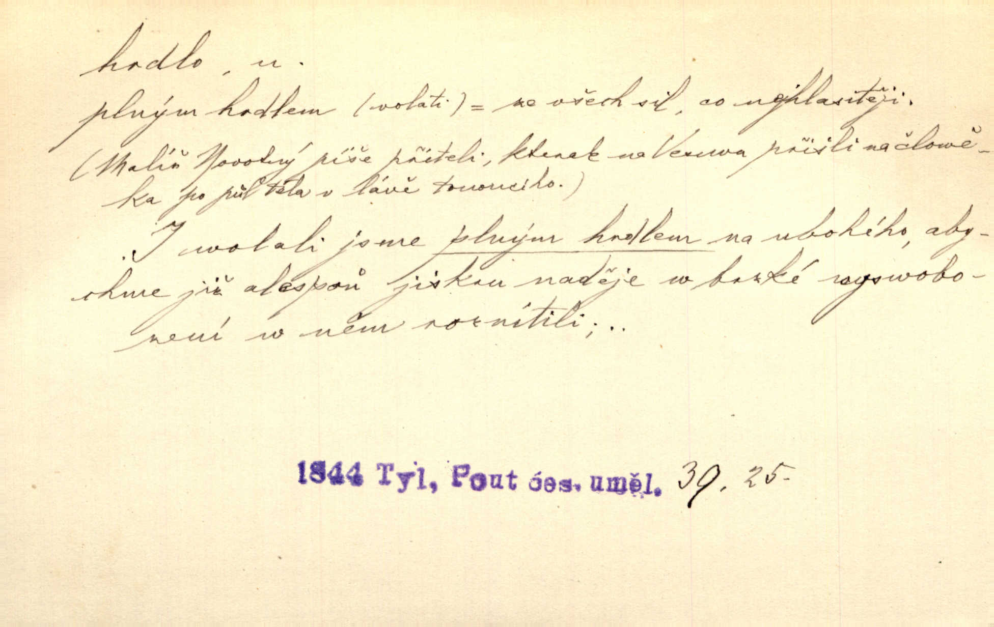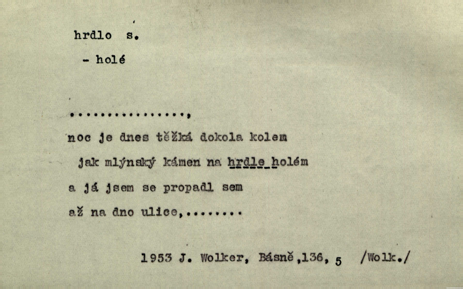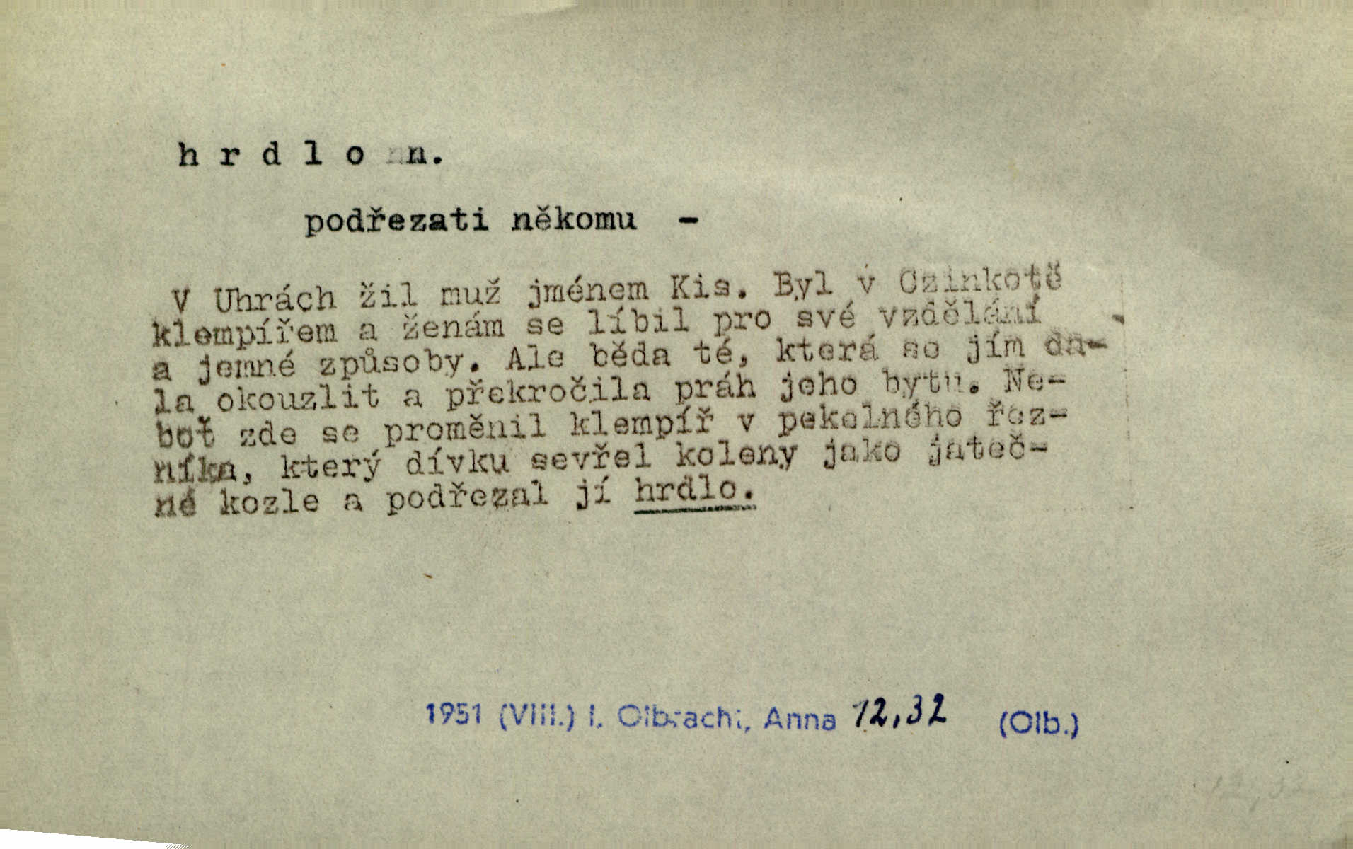 - hrdlo, -a n. hltan a hrtan. Lil nešťastnému člověku v hrdlo ocet. Win. Vypráhlo mi v hrdle. Dyk. Dřív propláchněte hrdlo. Hol. Ale počkejte, jak to potom půjde, jak se všecko prožene hrdlem projí a propije. Rais. Co jen hrdlo ráčí, dostaneš. Tyl. Bájili a lhali, co hrdlo ráčí. Přít. Z plna hrdla křičelo [dítě]. Erb. Začal z plného hrdla křičeti. Tyl. „On se červená,“ smál se plným hrdlem. Zey. Baron se smál, co mu hrdlo stačilo. Zey. Znělo z tisíce hrdel: Vyhráno. Purk. Padesát asi hrdel hulákalo „da capo, da capo“. Ner. Jedním hrdlem řvalo to moře lidí: „Nikdy! Nikdy!“ zároveň. Zey. Obě [ženy] chtěly křičet, ale slova jim v hrdle vázla. Praž. pos. Již mu v hrdle hrají. Za chvíli bude po něm. Jir. D přední část krku, krk. Černý Tatar ostří nože boří v beránka hrdlo bělavé. Mach. Synkové měli na hrdlech pestré mašle. Rais. Její hrdlo liliové sloupec kosti ze slonové. Jabl. Svíraje mu hrdlo, bil hlavou jeho o podlahu. Kam. V polích položil jsem Čehonovi přímo nůž na hrdlo. „Proč jsi vlastně zpíval rakouskou hymnu?“ Dyk. D život. Chceme hájiti práv těch, co naše síly stačí, nechť se stane cokoliv, až do těch hrdel a statků! Kar. kn. Schwarzenberg. Jinde za falešnou minci trestají i na hrdle smrtí. Třeb. Propadls’ mi hrdlem životem. Mah. Vsázím své hrdlo, že každá Anna je „líbezná“ život. Ner. Snad si chce sáhnouti na hrdlo spáchati sebevraždu. Prav. Svým hrdlem ručíte mi za ty věci! životem. Mach. V hrdlo lžete — nestoudný! drze, nestydatě. Štech. Ruku na to dával, že to v hrdlo lež drzá. Jir. D co je hrdlu podobné. Hrdlo kytary. Čech. Hrdlo láhve. Herrm. Džbán s dlouhým výčepním hrdlem. Ner. Zlomil jsem pušku, do hrdla nacpal náboj. V. Mrš. Tech. válcovité rozšíření na konci roury, do něhož se při spojování rour zastrkuje roura druhá. Hrdlo baňky, trouby. Anat. hrdlo děložní cervix uteri.