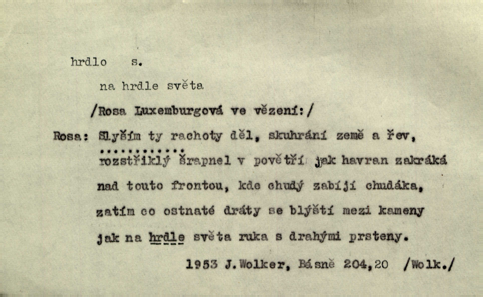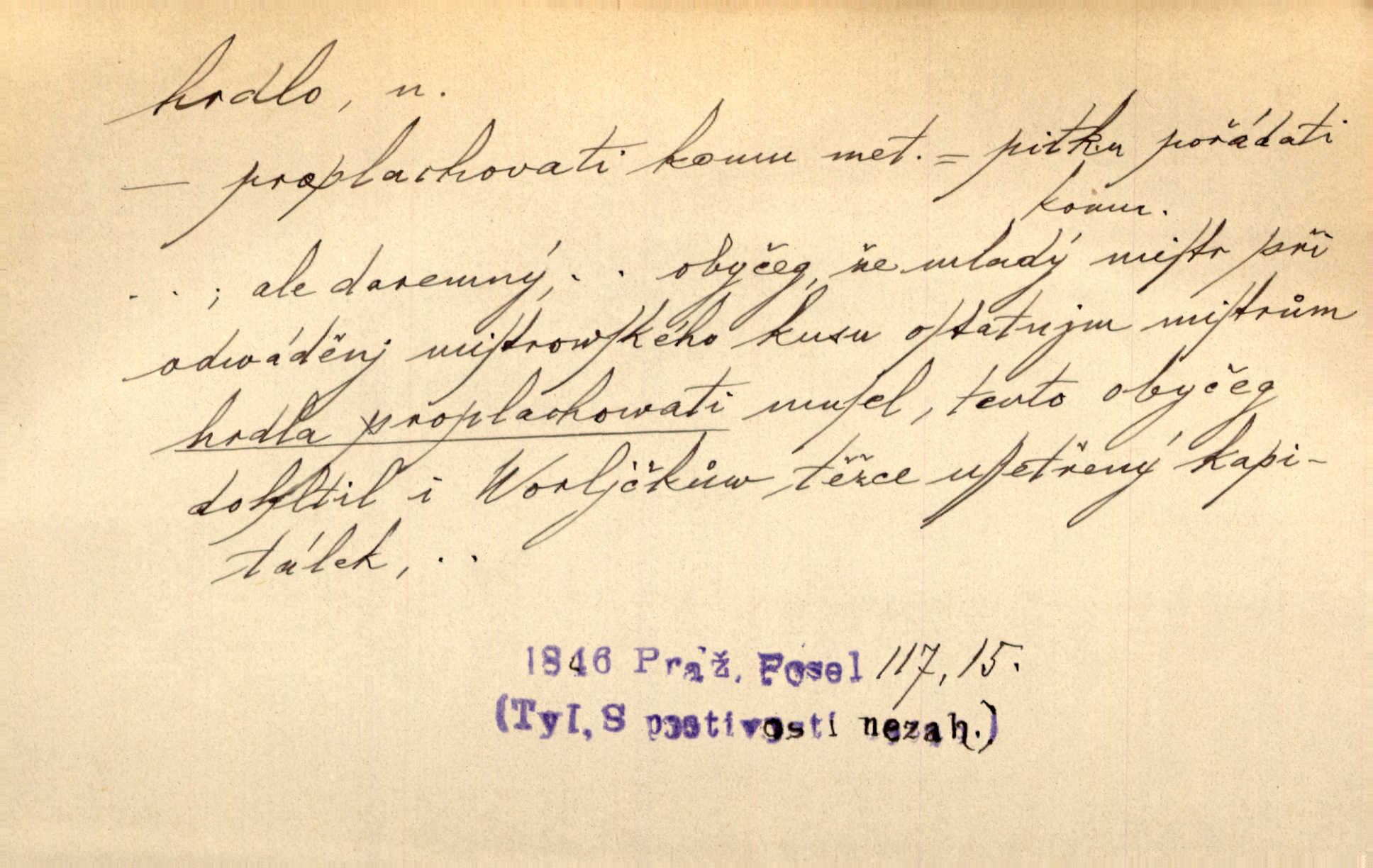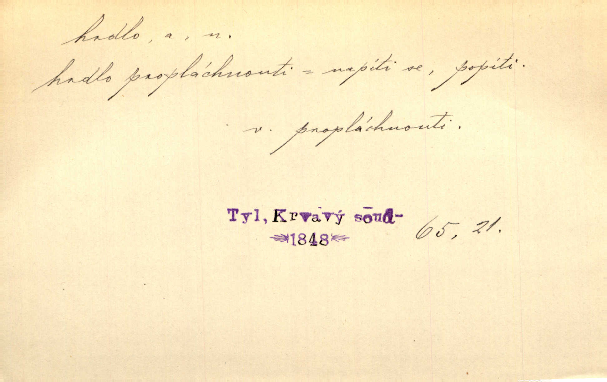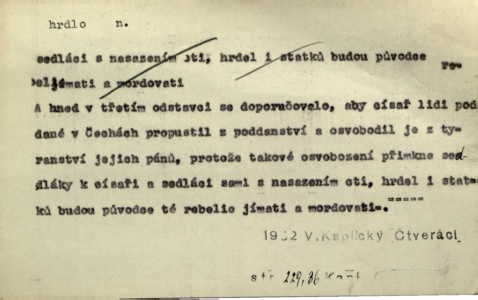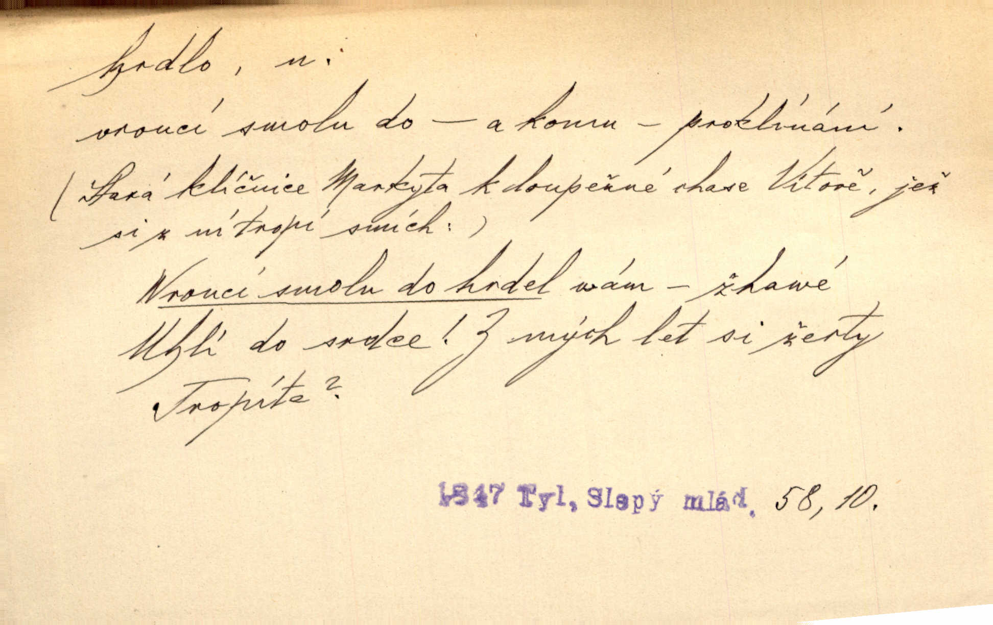 - hrdlo, -a n. hltan a hrtan. Lil nešťastnému člověku v hrdlo ocet. Win. Vypráhlo mi v hrdle. Dyk. Dřív propláchněte hrdlo. Hol. Ale počkejte, jak to potom půjde, jak se všecko prožene hrdlem projí a propije. Rais. Co jen hrdlo ráčí, dostaneš. Tyl. Bájili a lhali, co hrdlo ráčí. Přít. Z plna hrdla křičelo [dítě]. Erb. Začal z plného hrdla křičeti. Tyl. „On se červená,“ smál se plným hrdlem. Zey. Baron se smál, co mu hrdlo stačilo. Zey. Znělo z tisíce hrdel: Vyhráno. Purk. Padesát asi hrdel hulákalo „da capo, da capo“. Ner. Jedním hrdlem řvalo to moře lidí: „Nikdy! Nikdy!“ zároveň. Zey. Obě [ženy] chtěly křičet, ale slova jim v hrdle vázla. Praž. pos. Již mu v hrdle hrají. Za chvíli bude po něm. Jir. D přední část krku, krk. Černý Tatar ostří nože boří v beránka hrdlo bělavé. Mach. Synkové měli na hrdlech pestré mašle. Rais. Její hrdlo liliové sloupec kosti ze slonové. Jabl. Svíraje mu hrdlo, bil hlavou jeho o podlahu. Kam. V polích položil jsem Čehonovi přímo nůž na hrdlo. „Proč jsi vlastně zpíval rakouskou hymnu?“ Dyk. D život. Chceme hájiti práv těch, co naše síly stačí, nechť se stane cokoliv, až do těch hrdel a statků! Kar. kn. Schwarzenberg. Jinde za falešnou minci trestají i na hrdle smrtí. Třeb. Propadls’ mi hrdlem životem. Mah. Vsázím své hrdlo, že každá Anna je „líbezná“ život. Ner. Snad si chce sáhnouti na hrdlo spáchati sebevraždu. Prav. Svým hrdlem ručíte mi za ty věci! životem. Mach. V hrdlo lžete — nestoudný! drze, nestydatě. Štech. Ruku na to dával, že to v hrdlo lež drzá. Jir. D co je hrdlu podobné. Hrdlo kytary. Čech. Hrdlo láhve. Herrm. Džbán s dlouhým výčepním hrdlem. Ner. Zlomil jsem pušku, do hrdla nacpal náboj. V. Mrš. Tech. válcovité rozšíření na konci roury, do něhož se při spojování rour zastrkuje roura druhá. Hrdlo baňky, trouby. Anat. hrdlo děložní cervix uteri.