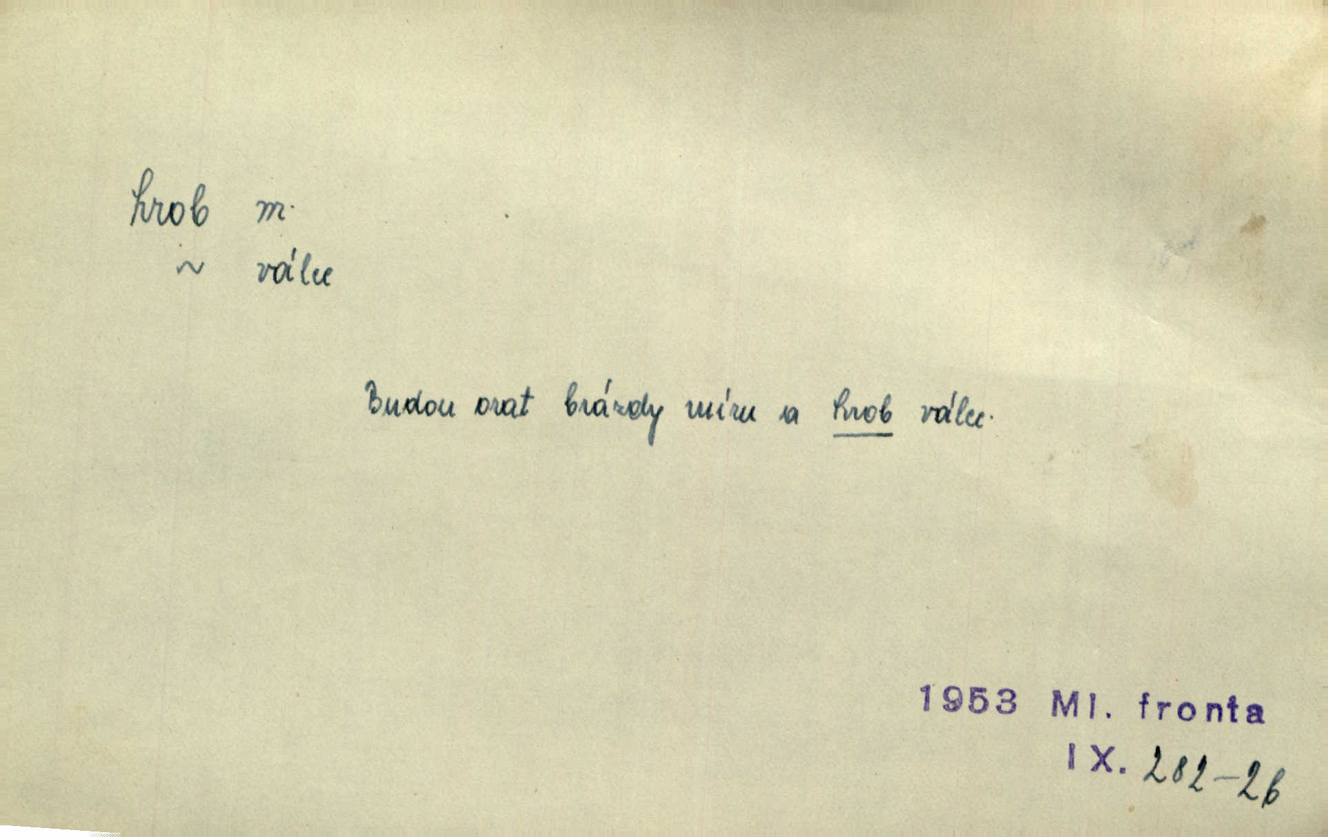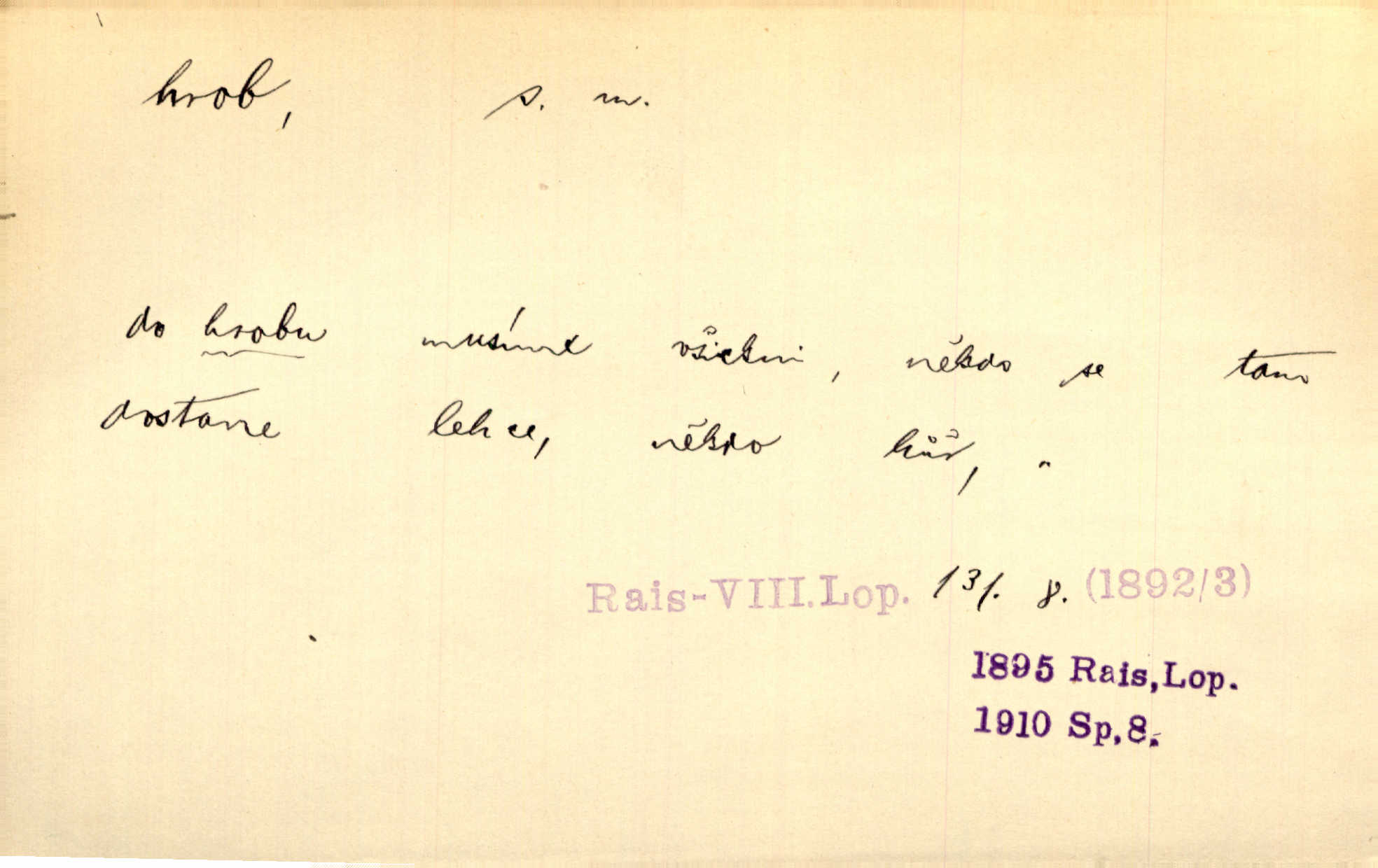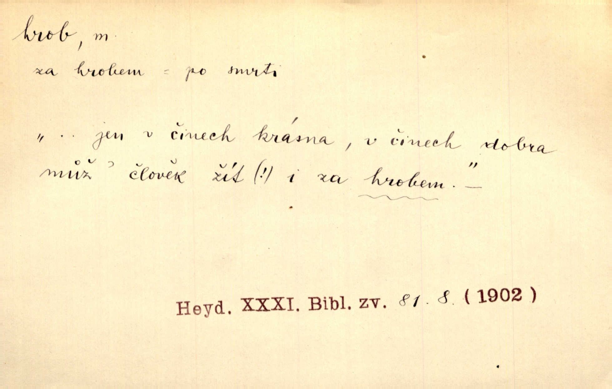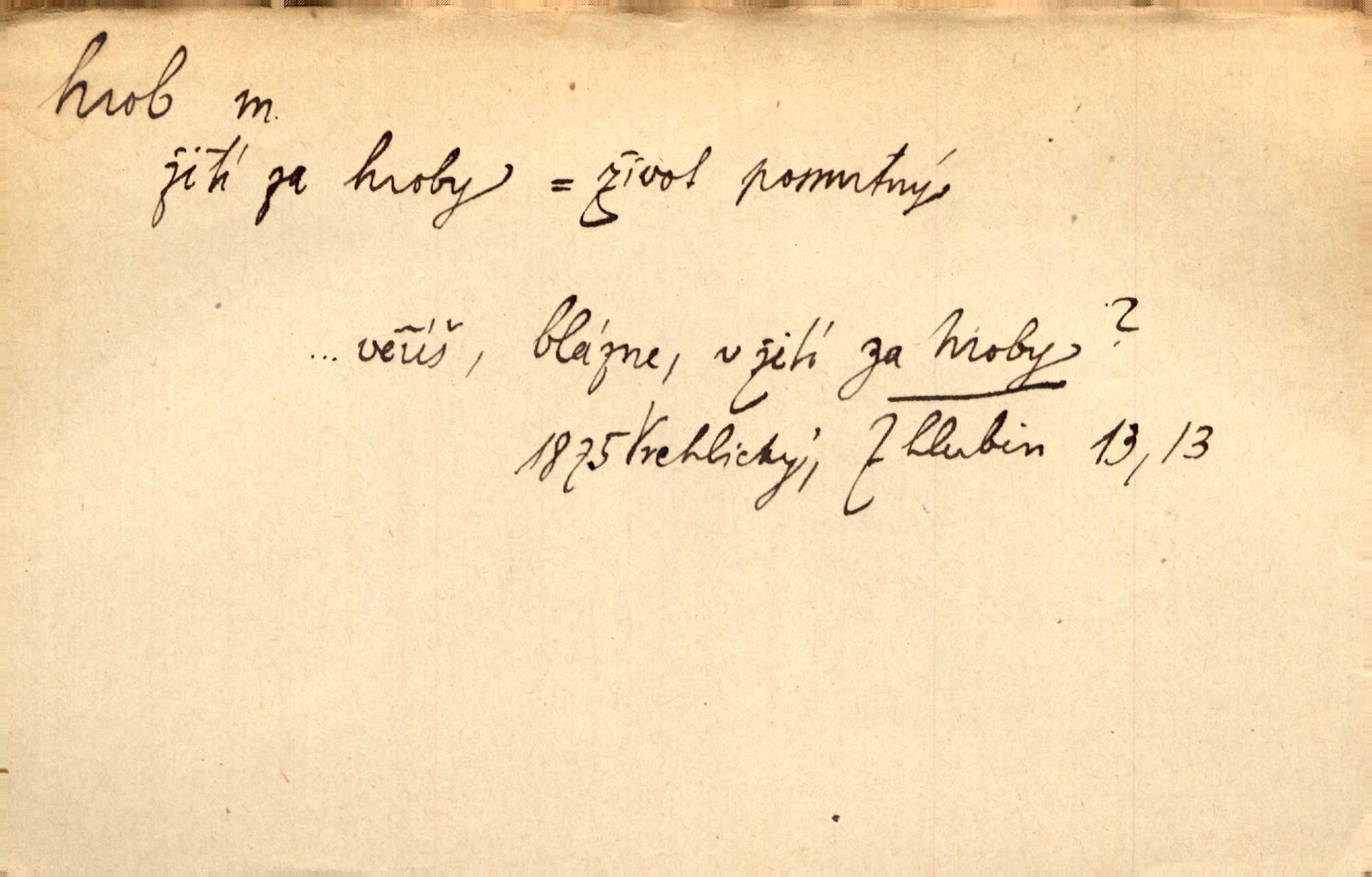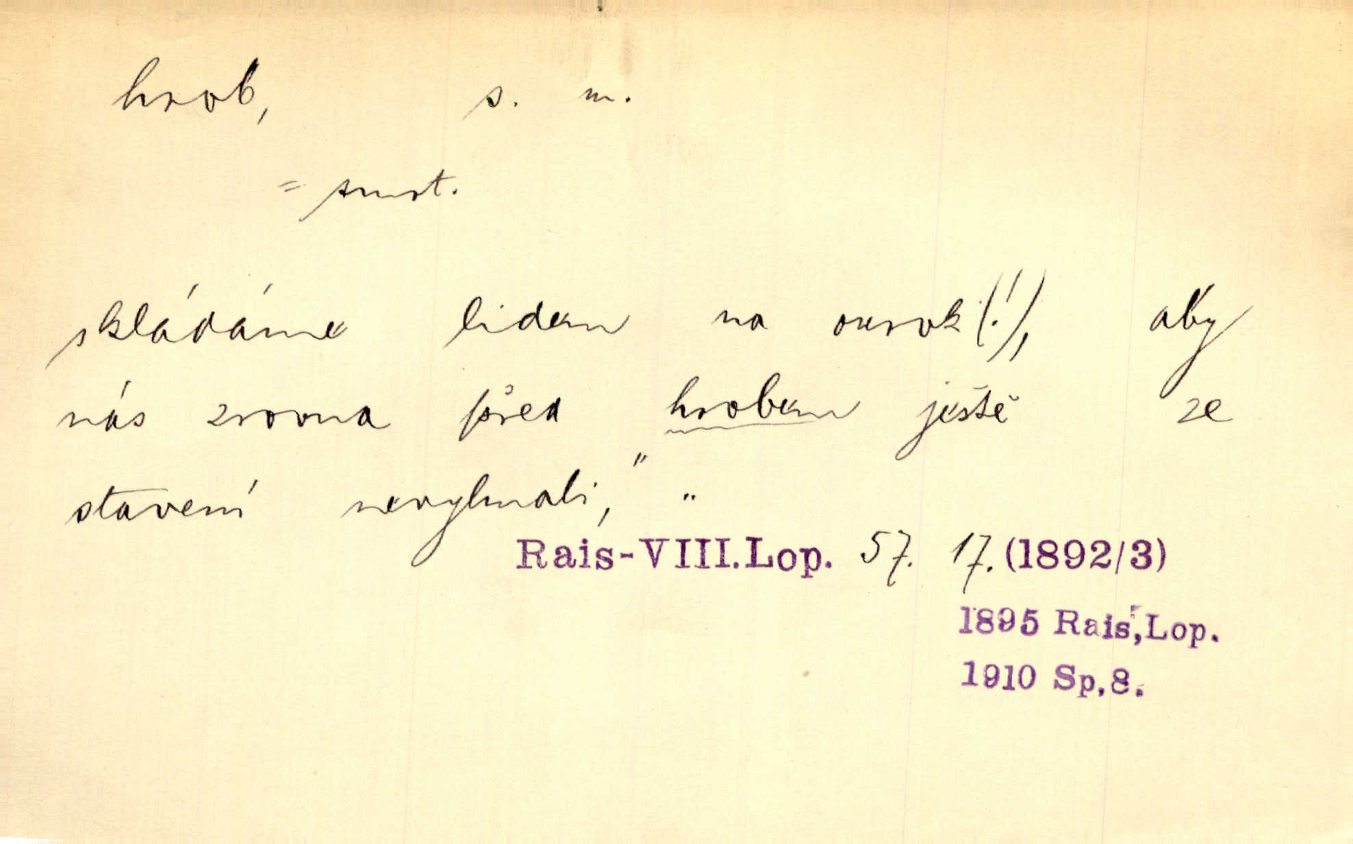 - hrob, -u m. místo, kam se pochovávají mrtví, obyč. jáma vykopaná v zemi; pahrbek z hlíny navršený na hrobě, rov; kamenná deska kryjící hrob; přen. smrt, záhuba, zánik. Zemřela matka a do hrobu dána. Erb. Dlouho-li to může trvat a budou i jí kopat hrob zemře. Rais. Lehotský chodíval se modlit na Jiříkův hrob otčenášek. Něm. A na těch hrobech leží plno květů. Mach. Ty žij a v prsou svých nos její hrob vzpomínku na zemřelou. Ner. Círk. boží hrob napodobení skalního hrobu Kristova (o velikonočních pobožnostech). Chrám božího hrobu v Jeruzalémě Kristova. Ner. Poutník od svatého hrobu vracející se z Jerusalema. Heyd. Obílený hrob co je hezké, mravné atd. jen vnějškem, na oko, ale ve skutečnosti špatné, zkažené, zcela jinaké. Jsme trpnou částí „morální fasády“, nalíčené tváře společnosti, která jako obílený hrob kryje v sobě hnilobu a neřád. Šal. Přirov. o hluboké tmě a tichu n. naprosté mlčenlivosti. Tma jako v hrobě, mráz v okna duje. Erb. Ve světnici bylo ticho jako v hrobě. Rais. Tichá noc kol a němá jako hrob. Wenz. Víš, že jsem jako hrob dovedu mlčeti, zachovati tajemství. Štol. Býti, ležeti v hrobě býti mrtev. Býti, státi na pokraji, kraji hrobu, u hrobu, jednou nohou v hrobě, nad hrobem, kloniti se, chýliti se do hrobu, k hrobu, dívati se do hrobu býti blízek smrti. Stařec nad hrobem — ubožák, sotva nohama pletl. Jir. Už do hrobu se chýlí příroda připravuje se k zimnímu spánku. Zey. Stará soustava absolutistická klesla r. 1848 v zasloužilý hrob vzala za své. I. Klicp. Do hrobu se dívám — se světem se loučím. Baar. Žena nešťastnice hrob si řekou hledá jde se utopit. Erb. Ten starý blázen přivede mne ještě do časného hrobu! Šmil. Hořem sklátíš [otce] do hrobu. Tyl. Horlivé jeho vystoupení ve Vídni uvrhlo jej v brzký hrob. Sab. Chceš svou matku do hrobu připravit? Štěp. Kopati hrob svému štěstí, jednotě národa atd. připravovati zkázu, ničiti. Ten by už rád viděl jemnostpána v hrobě, aby mohl dědit přeje si jeho smrti. Baar. Smutná a bledá, jakoby vstala z hrobu. Erb. V nitru mém zas staré dumy z hrobu vstávaly. Zey. Celá minulost jakoby rázem z hrobu zapomenutí povstala. Baar. Hrob mě nechtěl nemohl jsem zemříti. Zey. Lid. dívati se za někým do hrobu přežíti někoho. Kosm. Chalupu ani pole do robu si nevemete vaší smrtí se skončí vaše vlastnictví. Nov. Čisté ruce vzal do hrobu, ale bídu tady nechal zemřel jako poctivec. Šim. Byl jeden z těch spravedlivých, který nebéře žádnou vinu za hrob. Podl. Ach což ta láska mateřská přes časy, přes hrob hoří… nekončí smrtí. Ner. Od kolébky do hrobu od narození až do smrti, po celý život. Věrný až do hrobu. Se svým otcem jste se soudil až po jeho hrob smrt. Hál. Jestli se Pánu Bohu zráčí vzít ho k sobě, já mu posloužím do hrobu až k smrti. Rais. Jen v činech krásna, v činech dobra můž’ člověk žít i za hrobem. Heyd. Skládáme na ourok, aby nás zrovna před hrobem ještě ze stavení nevyhnali. Rais. Nenávist až za hrob. Přen. Různost míněni teprve po svatbě vyšla na světlo, a byla hrobem jejich rodinného míru. Jir. [Trhan] zabručí, když se mu přiděluje práce, která se mu po trhanovském výrazu zdá být „hrobem“ ničivě namáhavou. Ner. Archeol. kostrové, žárové hroby.