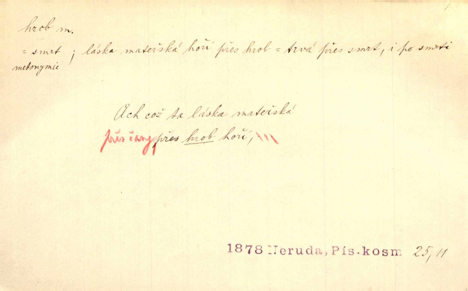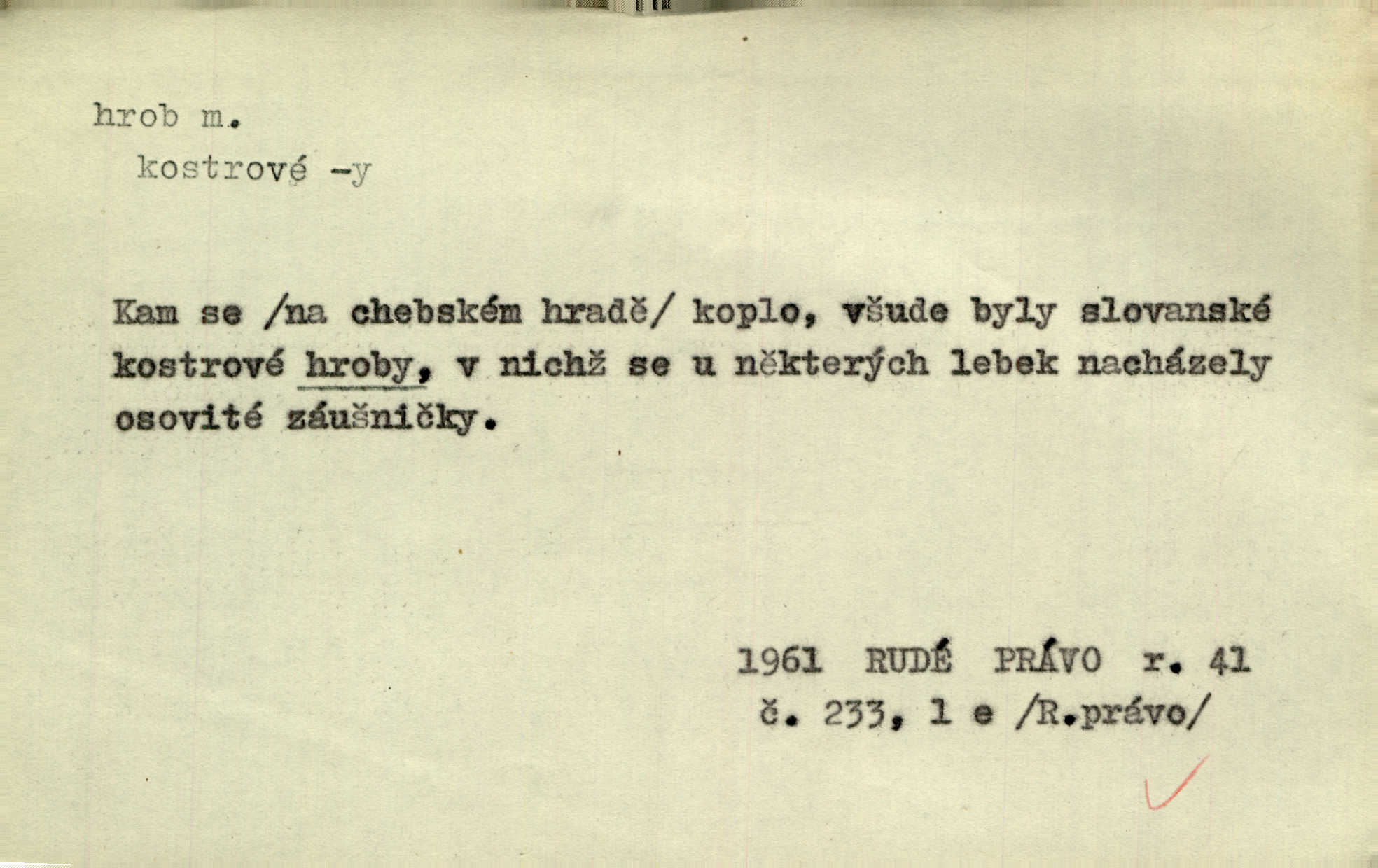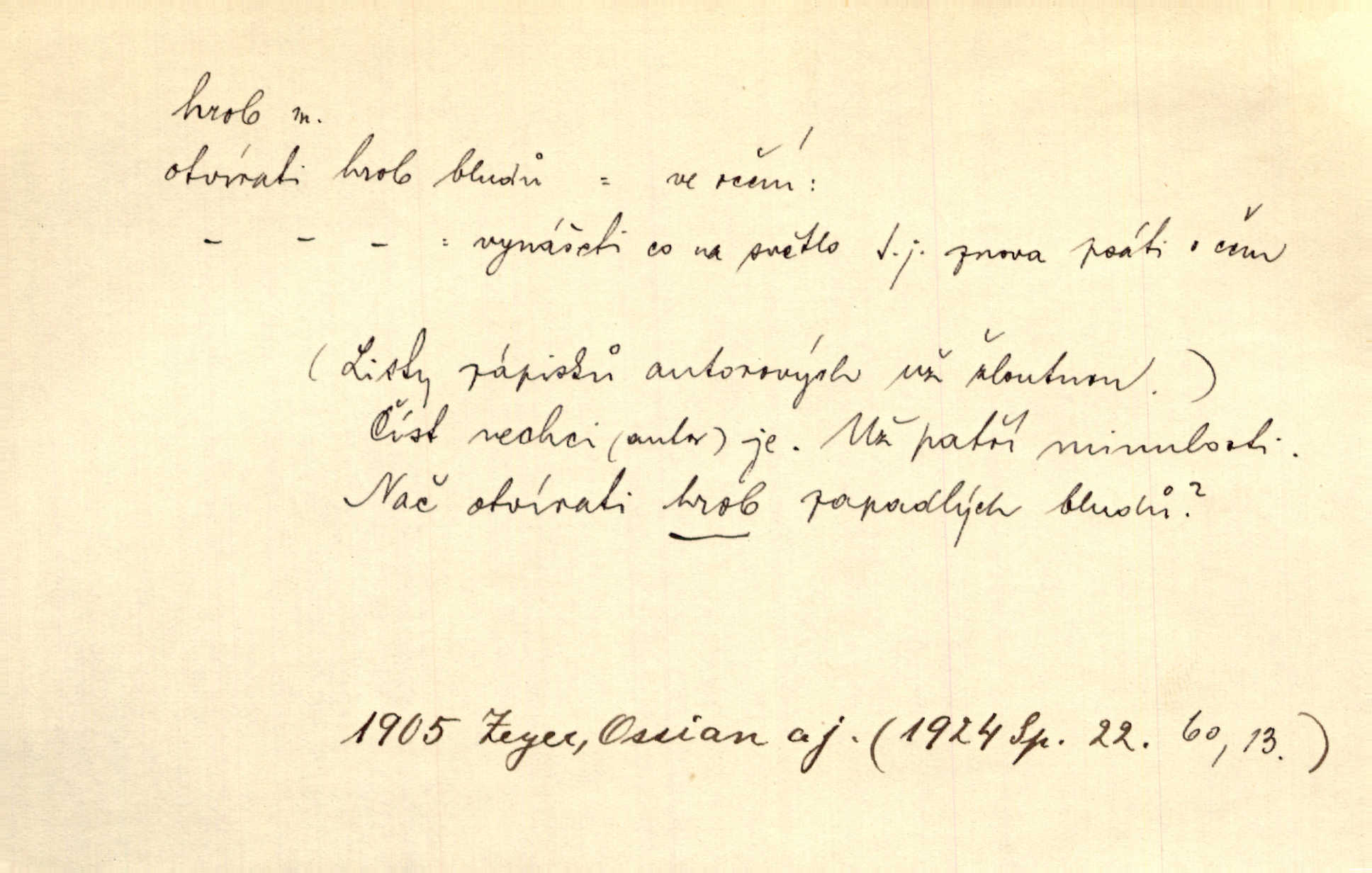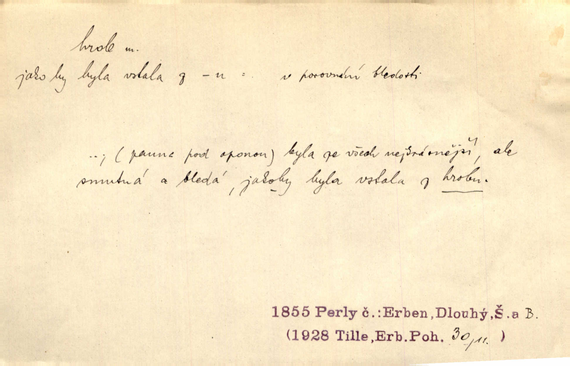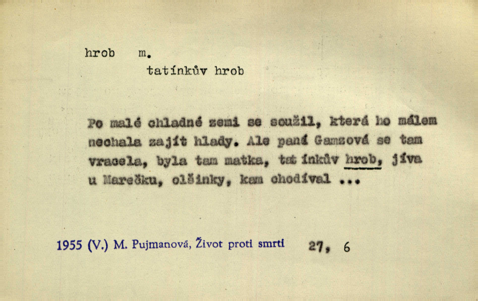 - hrob, -u m. místo, kam se pochovávají mrtví, obyč. jáma vykopaná v zemi; pahrbek z hlíny navršený na hrobě, rov; kamenná deska kryjící hrob; přen. smrt, záhuba, zánik. Zemřela matka a do hrobu dána. Erb. Dlouho-li to může trvat a budou i jí kopat hrob zemře. Rais. Lehotský chodíval se modlit na Jiříkův hrob otčenášek. Něm. A na těch hrobech leží plno květů. Mach. Ty žij a v prsou svých nos její hrob vzpomínku na zemřelou. Ner. Círk. boží hrob napodobení skalního hrobu Kristova (o velikonočních pobožnostech). Chrám božího hrobu v Jeruzalémě Kristova. Ner. Poutník od svatého hrobu vracející se z Jerusalema. Heyd. Obílený hrob co je hezké, mravné atd. jen vnějškem, na oko, ale ve skutečnosti špatné, zkažené, zcela jinaké. Jsme trpnou částí „morální fasády“, nalíčené tváře společnosti, která jako obílený hrob kryje v sobě hnilobu a neřád. Šal. Přirov. o hluboké tmě a tichu n. naprosté mlčenlivosti. Tma jako v hrobě, mráz v okna duje. Erb. Ve světnici bylo ticho jako v hrobě. Rais. Tichá noc kol a němá jako hrob. Wenz. Víš, že jsem jako hrob dovedu mlčeti, zachovati tajemství. Štol. Býti, ležeti v hrobě býti mrtev. Býti, státi na pokraji, kraji hrobu, u hrobu, jednou nohou v hrobě, nad hrobem, kloniti se, chýliti se do hrobu, k hrobu, dívati se do hrobu býti blízek smrti. Stařec nad hrobem — ubožák, sotva nohama pletl. Jir. Už do hrobu se chýlí příroda připravuje se k zimnímu spánku. Zey. Stará soustava absolutistická klesla r. 1848 v zasloužilý hrob vzala za své. I. Klicp. Do hrobu se dívám — se světem se loučím. Baar. Žena nešťastnice hrob si řekou hledá jde se utopit. Erb. Ten starý blázen přivede mne ještě do časného hrobu! Šmil. Hořem sklátíš [otce] do hrobu. Tyl. Horlivé jeho vystoupení ve Vídni uvrhlo jej v brzký hrob. Sab. Chceš svou matku do hrobu připravit? Štěp. Kopati hrob svému štěstí, jednotě národa atd. připravovati zkázu, ničiti. Ten by už rád viděl jemnostpána v hrobě, aby mohl dědit přeje si jeho smrti. Baar. Smutná a bledá, jakoby vstala z hrobu. Erb. V nitru mém zas staré dumy z hrobu vstávaly. Zey. Celá minulost jakoby rázem z hrobu zapomenutí povstala. Baar. Hrob mě nechtěl nemohl jsem zemříti. Zey. Lid. dívati se za někým do hrobu přežíti někoho. Kosm. Chalupu ani pole do robu si nevemete vaší smrtí se skončí vaše vlastnictví. Nov. Čisté ruce vzal do hrobu, ale bídu tady nechal zemřel jako poctivec. Šim. Byl jeden z těch spravedlivých, který nebéře žádnou vinu za hrob. Podl. Ach což ta láska mateřská přes časy, přes hrob hoří… nekončí smrtí. Ner. Od kolébky do hrobu od narození až do smrti, po celý život. Věrný až do hrobu. Se svým otcem jste se soudil až po jeho hrob smrt. Hál. Jestli se Pánu Bohu zráčí vzít ho k sobě, já mu posloužím do hrobu až k smrti. Rais. Jen v činech krásna, v činech dobra můž’ člověk žít i za hrobem. Heyd. Skládáme na ourok, aby nás zrovna před hrobem ještě ze stavení nevyhnali. Rais. Nenávist až za hrob. Přen. Různost míněni teprve po svatbě vyšla na světlo, a byla hrobem jejich rodinného míru. Jir. [Trhan] zabručí, když se mu přiděluje práce, která se mu po trhanovském výrazu zdá být „hrobem“ ničivě namáhavou. Ner. Archeol. kostrové, žárové hroby.