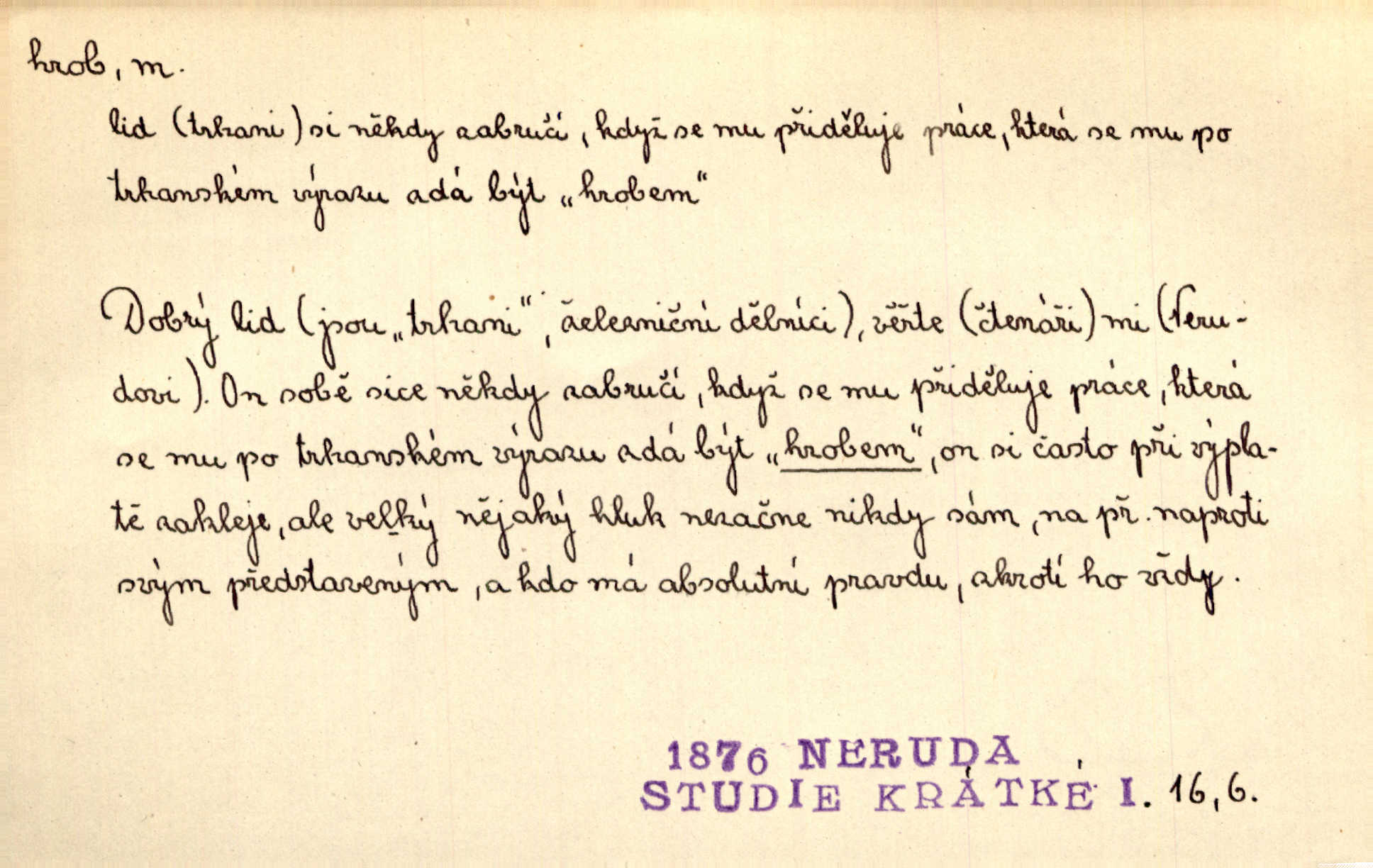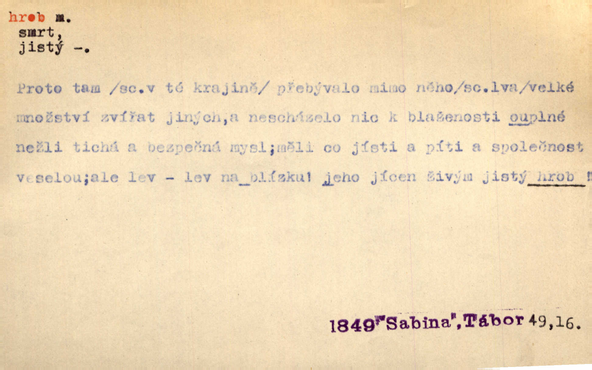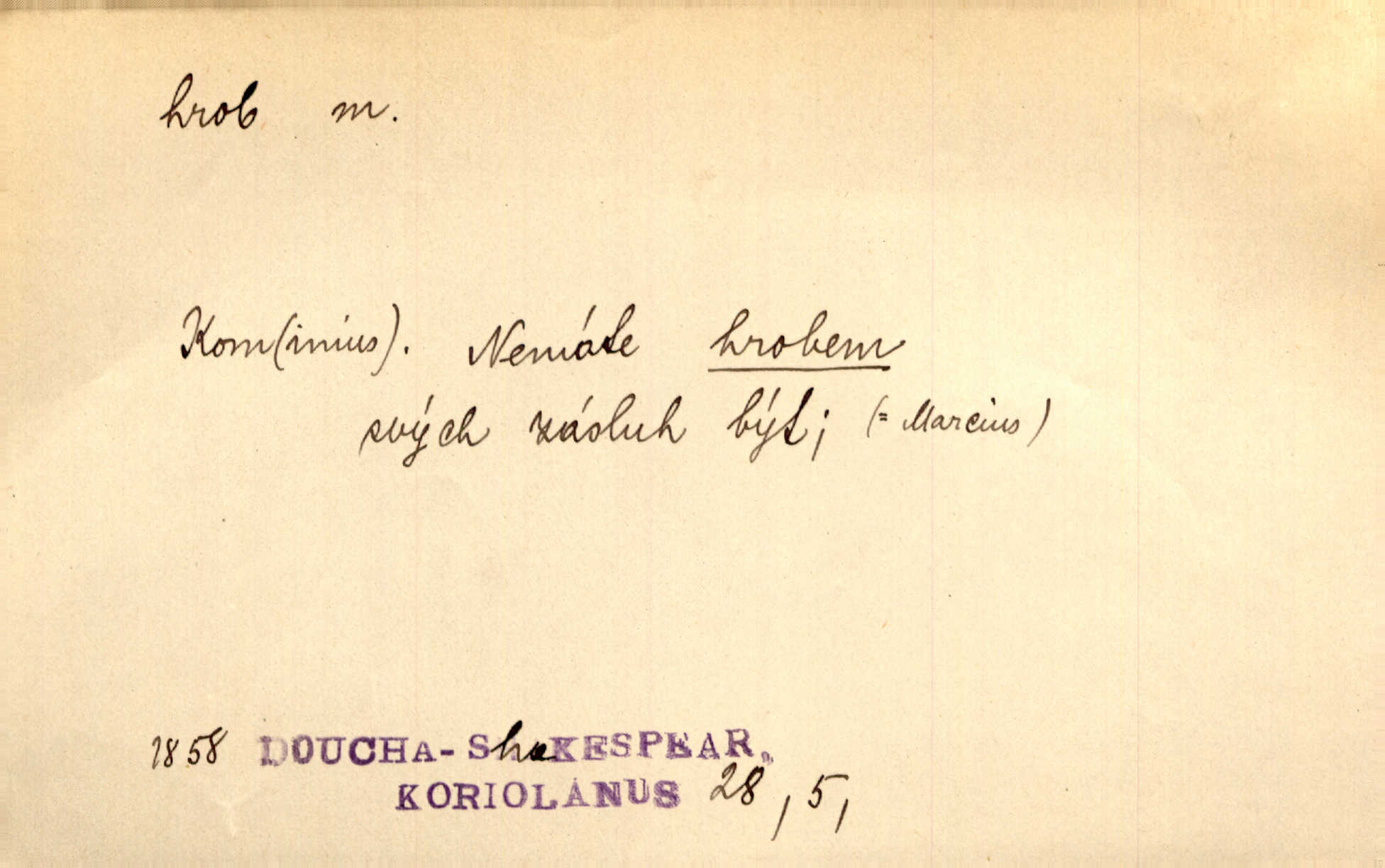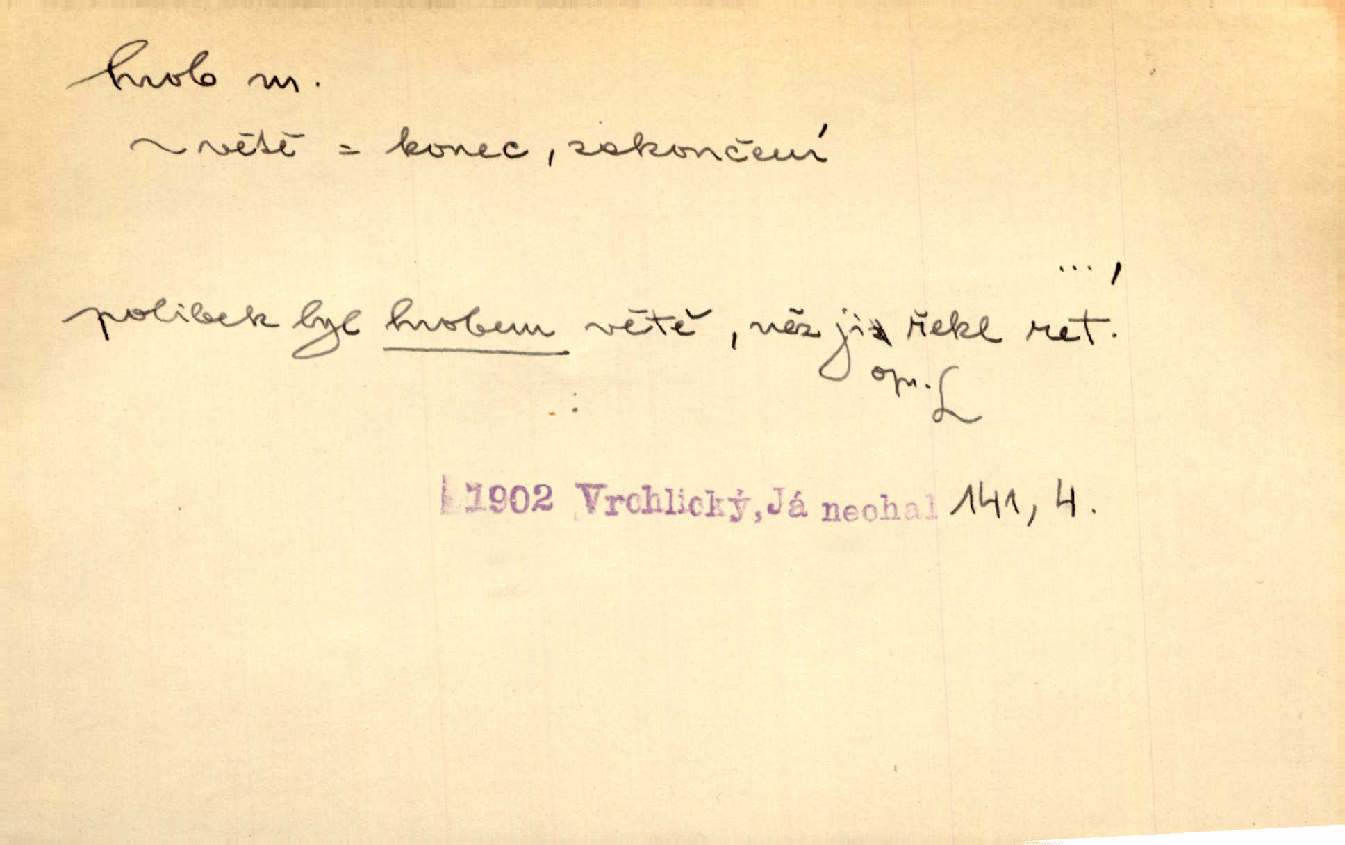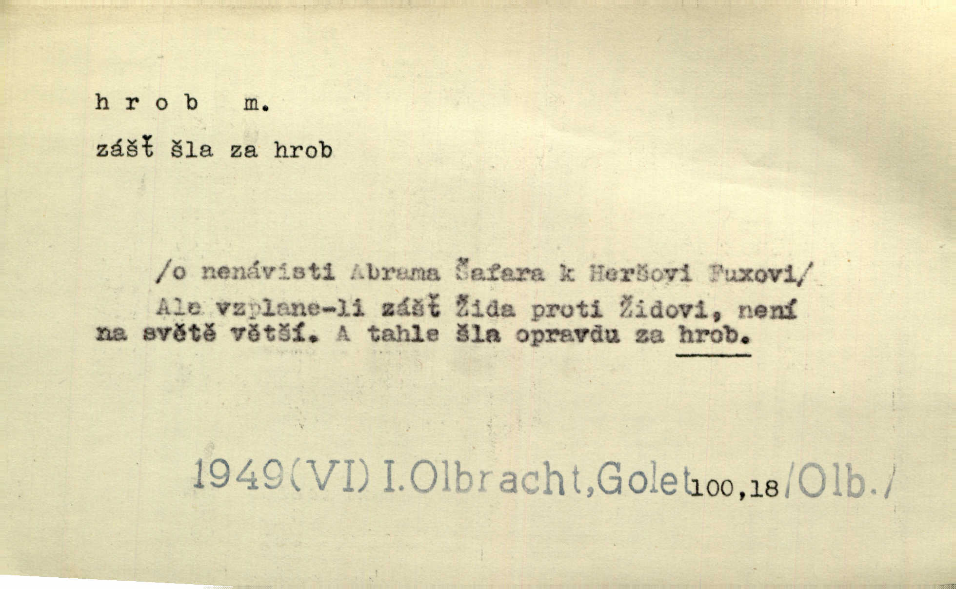 - hrob, -u m. místo, kam se pochovávají mrtví, obyč. jáma vykopaná v zemi; pahrbek z hlíny navršený na hrobě, rov; kamenná deska kryjící hrob; přen. smrt, záhuba, zánik. Zemřela matka a do hrobu dána. Erb. Dlouho-li to může trvat a budou i jí kopat hrob zemře. Rais. Lehotský chodíval se modlit na Jiříkův hrob otčenášek. Něm. A na těch hrobech leží plno květů. Mach. Ty žij a v prsou svých nos její hrob vzpomínku na zemřelou. Ner. Círk. boží hrob napodobení skalního hrobu Kristova (o velikonočních pobožnostech). Chrám božího hrobu v Jeruzalémě Kristova. Ner. Poutník od svatého hrobu vracející se z Jerusalema. Heyd. Obílený hrob co je hezké, mravné atd. jen vnějškem, na oko, ale ve skutečnosti špatné, zkažené, zcela jinaké. Jsme trpnou částí „morální fasády“, nalíčené tváře společnosti, která jako obílený hrob kryje v sobě hnilobu a neřád. Šal. Přirov. o hluboké tmě a tichu n. naprosté mlčenlivosti. Tma jako v hrobě, mráz v okna duje. Erb. Ve světnici bylo ticho jako v hrobě. Rais. Tichá noc kol a němá jako hrob. Wenz. Víš, že jsem jako hrob dovedu mlčeti, zachovati tajemství. Štol. Býti, ležeti v hrobě býti mrtev. Býti, státi na pokraji, kraji hrobu, u hrobu, jednou nohou v hrobě, nad hrobem, kloniti se, chýliti se do hrobu, k hrobu, dívati se do hrobu býti blízek smrti. Stařec nad hrobem — ubožák, sotva nohama pletl. Jir. Už do hrobu se chýlí příroda připravuje se k zimnímu spánku. Zey. Stará soustava absolutistická klesla r. 1848 v zasloužilý hrob vzala za své. I. Klicp. Do hrobu se dívám — se světem se loučím. Baar. Žena nešťastnice hrob si řekou hledá jde se utopit. Erb. Ten starý blázen přivede mne ještě do časného hrobu! Šmil. Hořem sklátíš [otce] do hrobu. Tyl. Horlivé jeho vystoupení ve Vídni uvrhlo jej v brzký hrob. Sab. Chceš svou matku do hrobu připravit? Štěp. Kopati hrob svému štěstí, jednotě národa atd. připravovati zkázu, ničiti. Ten by už rád viděl jemnostpána v hrobě, aby mohl dědit přeje si jeho smrti. Baar. Smutná a bledá, jakoby vstala z hrobu. Erb. V nitru mém zas staré dumy z hrobu vstávaly. Zey. Celá minulost jakoby rázem z hrobu zapomenutí povstala. Baar. Hrob mě nechtěl nemohl jsem zemříti. Zey. Lid. dívati se za někým do hrobu přežíti někoho. Kosm. Chalupu ani pole do robu si nevemete vaší smrtí se skončí vaše vlastnictví. Nov. Čisté ruce vzal do hrobu, ale bídu tady nechal zemřel jako poctivec. Šim. Byl jeden z těch spravedlivých, který nebéře žádnou vinu za hrob. Podl. Ach což ta láska mateřská přes časy, přes hrob hoří… nekončí smrtí. Ner. Od kolébky do hrobu od narození až do smrti, po celý život. Věrný až do hrobu. Se svým otcem jste se soudil až po jeho hrob smrt. Hál. Jestli se Pánu Bohu zráčí vzít ho k sobě, já mu posloužím do hrobu až k smrti. Rais. Jen v činech krásna, v činech dobra můž’ člověk žít i za hrobem. Heyd. Skládáme na ourok, aby nás zrovna před hrobem ještě ze stavení nevyhnali. Rais. Nenávist až za hrob. Přen. Různost míněni teprve po svatbě vyšla na světlo, a byla hrobem jejich rodinného míru. Jir. [Trhan] zabručí, když se mu přiděluje práce, která se mu po trhanovském výrazu zdá být „hrobem“ ničivě namáhavou. Ner. Archeol. kostrové, žárové hroby.