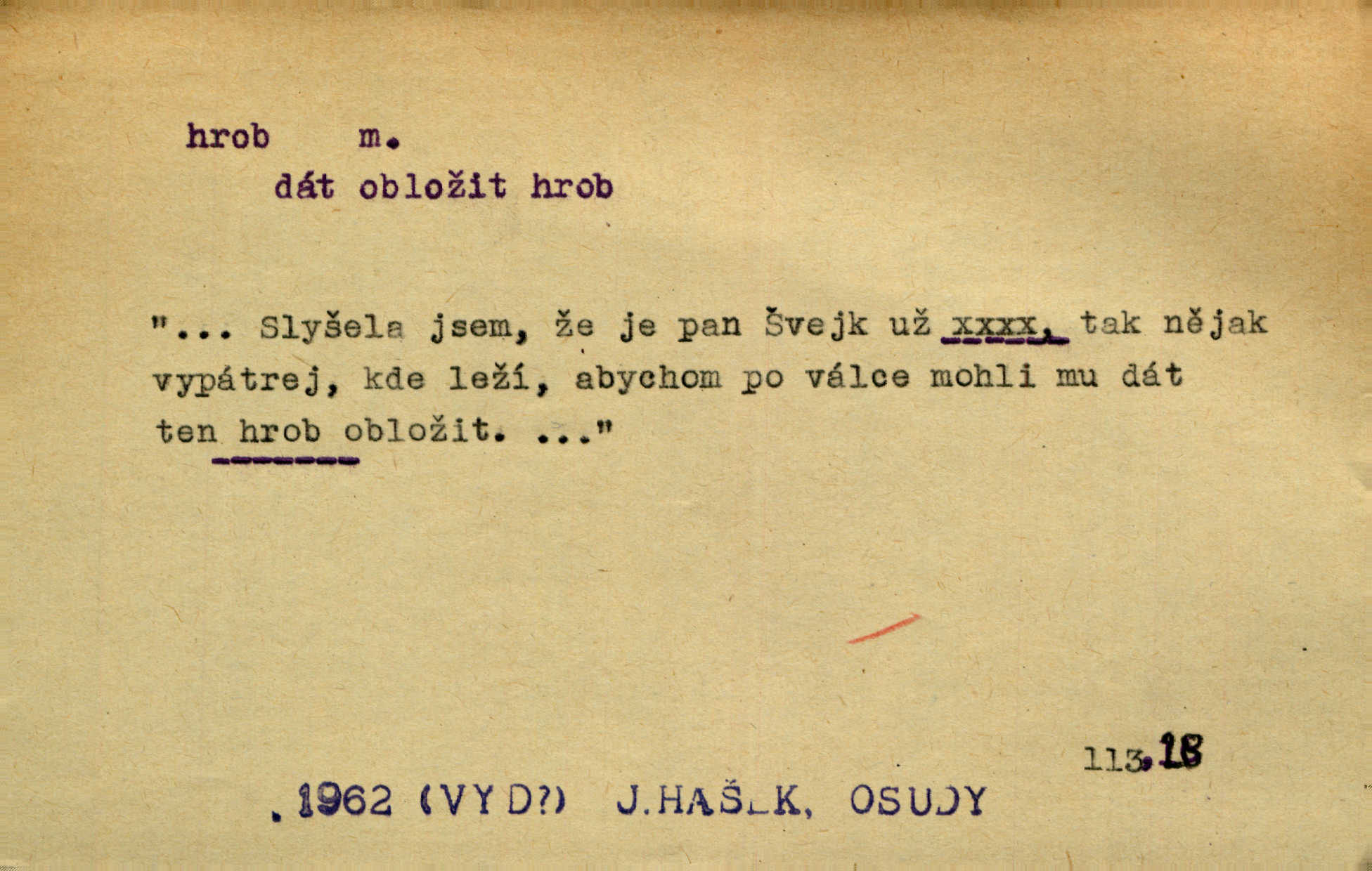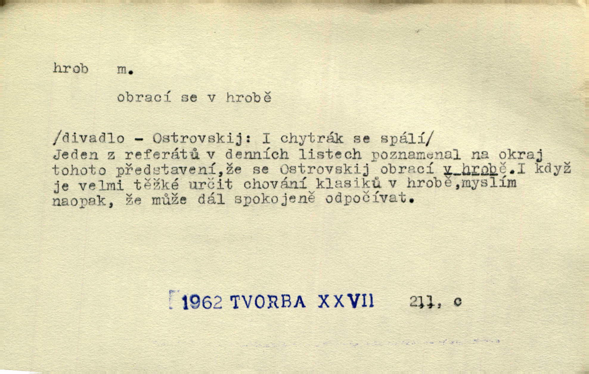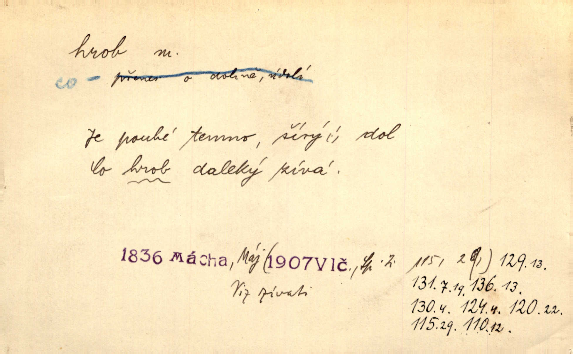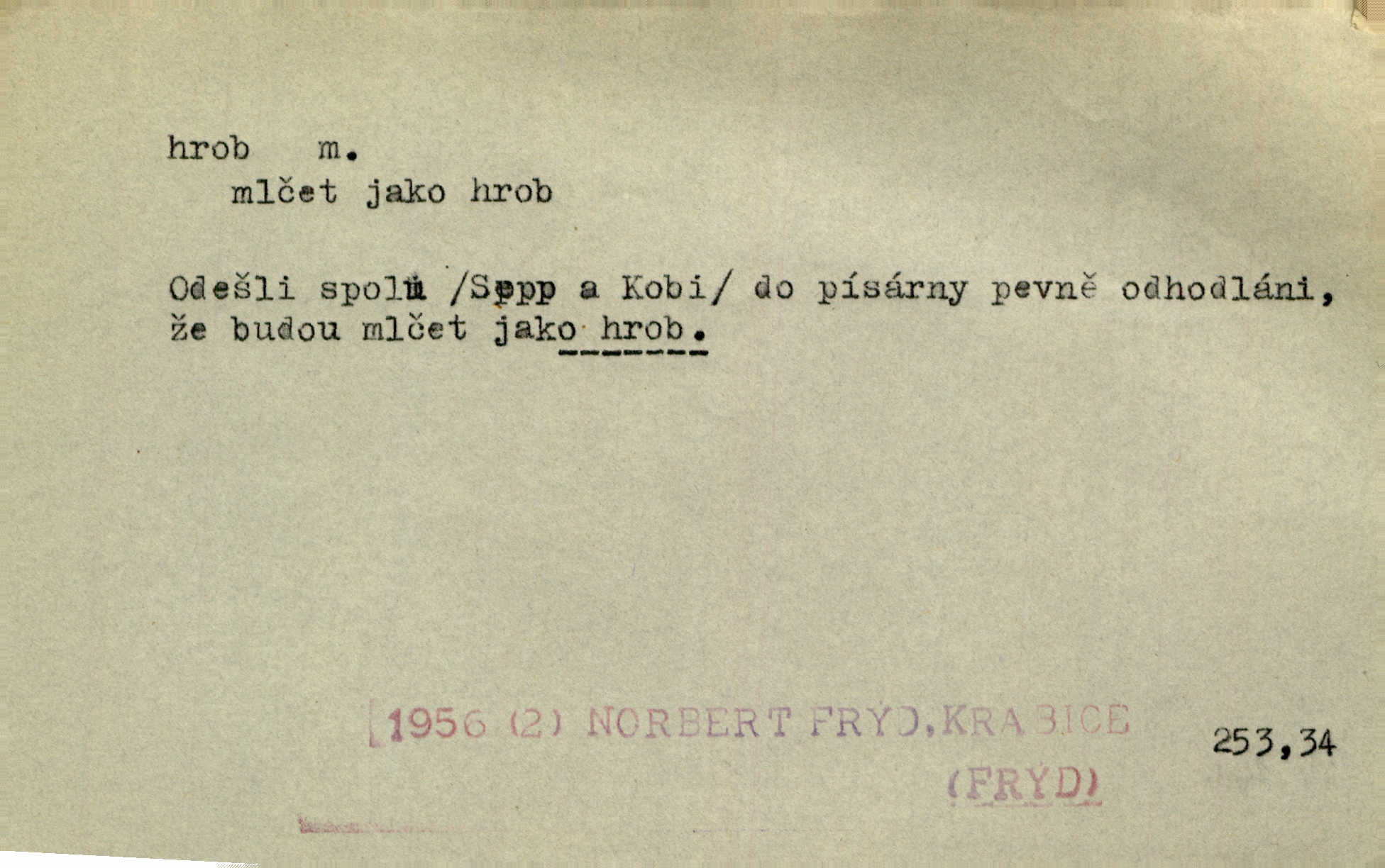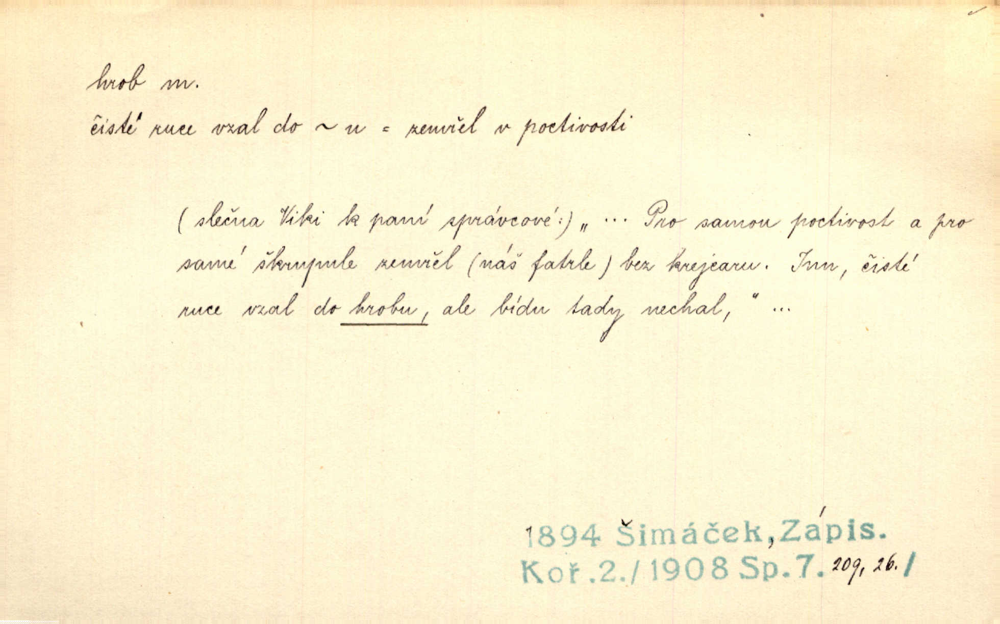 - hrob, -u m. místo, kam se pochovávají mrtví, obyč. jáma vykopaná v zemi; pahrbek z hlíny navršený na hrobě, rov; kamenná deska kryjící hrob; přen. smrt, záhuba, zánik. Zemřela matka a do hrobu dána. Erb. Dlouho-li to může trvat a budou i jí kopat hrob zemře. Rais. Lehotský chodíval se modlit na Jiříkův hrob otčenášek. Něm. A na těch hrobech leží plno květů. Mach. Ty žij a v prsou svých nos její hrob vzpomínku na zemřelou. Ner. Círk. boží hrob napodobení skalního hrobu Kristova (o velikonočních pobožnostech). Chrám božího hrobu v Jeruzalémě Kristova. Ner. Poutník od svatého hrobu vracející se z Jerusalema. Heyd. Obílený hrob co je hezké, mravné atd. jen vnějškem, na oko, ale ve skutečnosti špatné, zkažené, zcela jinaké. Jsme trpnou částí „morální fasády“, nalíčené tváře společnosti, která jako obílený hrob kryje v sobě hnilobu a neřád. Šal. Přirov. o hluboké tmě a tichu n. naprosté mlčenlivosti. Tma jako v hrobě, mráz v okna duje. Erb. Ve světnici bylo ticho jako v hrobě. Rais. Tichá noc kol a němá jako hrob. Wenz. Víš, že jsem jako hrob dovedu mlčeti, zachovati tajemství. Štol. Býti, ležeti v hrobě býti mrtev. Býti, státi na pokraji, kraji hrobu, u hrobu, jednou nohou v hrobě, nad hrobem, kloniti se, chýliti se do hrobu, k hrobu, dívati se do hrobu býti blízek smrti. Stařec nad hrobem — ubožák, sotva nohama pletl. Jir. Už do hrobu se chýlí příroda připravuje se k zimnímu spánku. Zey. Stará soustava absolutistická klesla r. 1848 v zasloužilý hrob vzala za své. I. Klicp. Do hrobu se dívám — se světem se loučím. Baar. Žena nešťastnice hrob si řekou hledá jde se utopit. Erb. Ten starý blázen přivede mne ještě do časného hrobu! Šmil. Hořem sklátíš [otce] do hrobu. Tyl. Horlivé jeho vystoupení ve Vídni uvrhlo jej v brzký hrob. Sab. Chceš svou matku do hrobu připravit? Štěp. Kopati hrob svému štěstí, jednotě národa atd. připravovati zkázu, ničiti. Ten by už rád viděl jemnostpána v hrobě, aby mohl dědit přeje si jeho smrti. Baar. Smutná a bledá, jakoby vstala z hrobu. Erb. V nitru mém zas staré dumy z hrobu vstávaly. Zey. Celá minulost jakoby rázem z hrobu zapomenutí povstala. Baar. Hrob mě nechtěl nemohl jsem zemříti. Zey. Lid. dívati se za někým do hrobu přežíti někoho. Kosm. Chalupu ani pole do robu si nevemete vaší smrtí se skončí vaše vlastnictví. Nov. Čisté ruce vzal do hrobu, ale bídu tady nechal zemřel jako poctivec. Šim. Byl jeden z těch spravedlivých, který nebéře žádnou vinu za hrob. Podl. Ach což ta láska mateřská přes časy, přes hrob hoří… nekončí smrtí. Ner. Od kolébky do hrobu od narození až do smrti, po celý život. Věrný až do hrobu. Se svým otcem jste se soudil až po jeho hrob smrt. Hál. Jestli se Pánu Bohu zráčí vzít ho k sobě, já mu posloužím do hrobu až k smrti. Rais. Jen v činech krásna, v činech dobra můž’ člověk žít i za hrobem. Heyd. Skládáme na ourok, aby nás zrovna před hrobem ještě ze stavení nevyhnali. Rais. Nenávist až za hrob. Přen. Různost míněni teprve po svatbě vyšla na světlo, a byla hrobem jejich rodinného míru. Jir. [Trhan] zabručí, když se mu přiděluje práce, která se mu po trhanovském výrazu zdá být „hrobem“ ničivě namáhavou. Ner. Archeol. kostrové, žárové hroby.