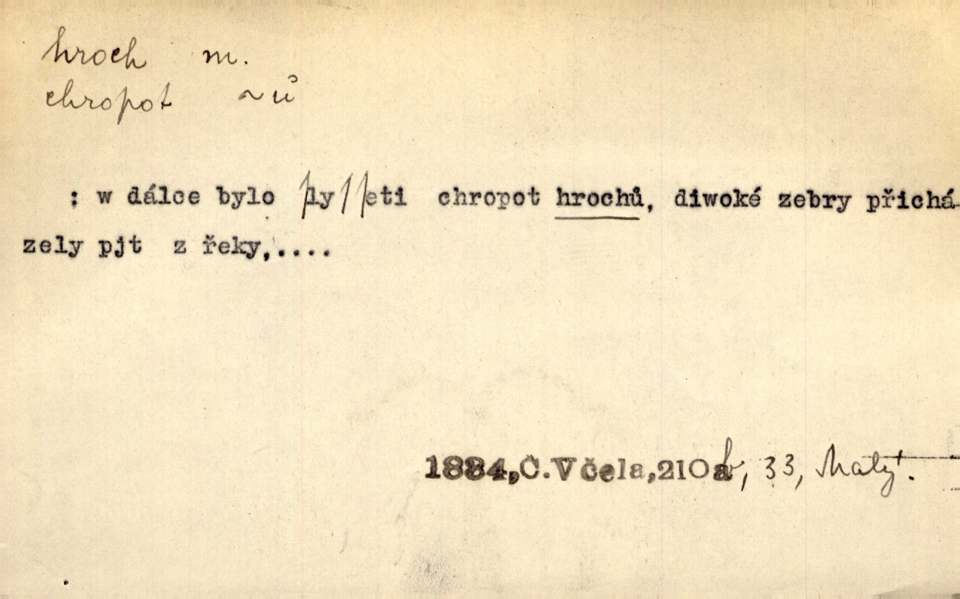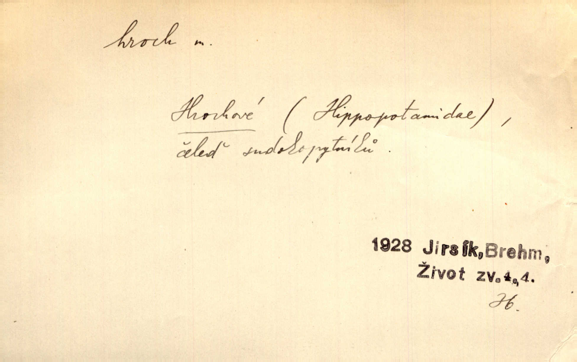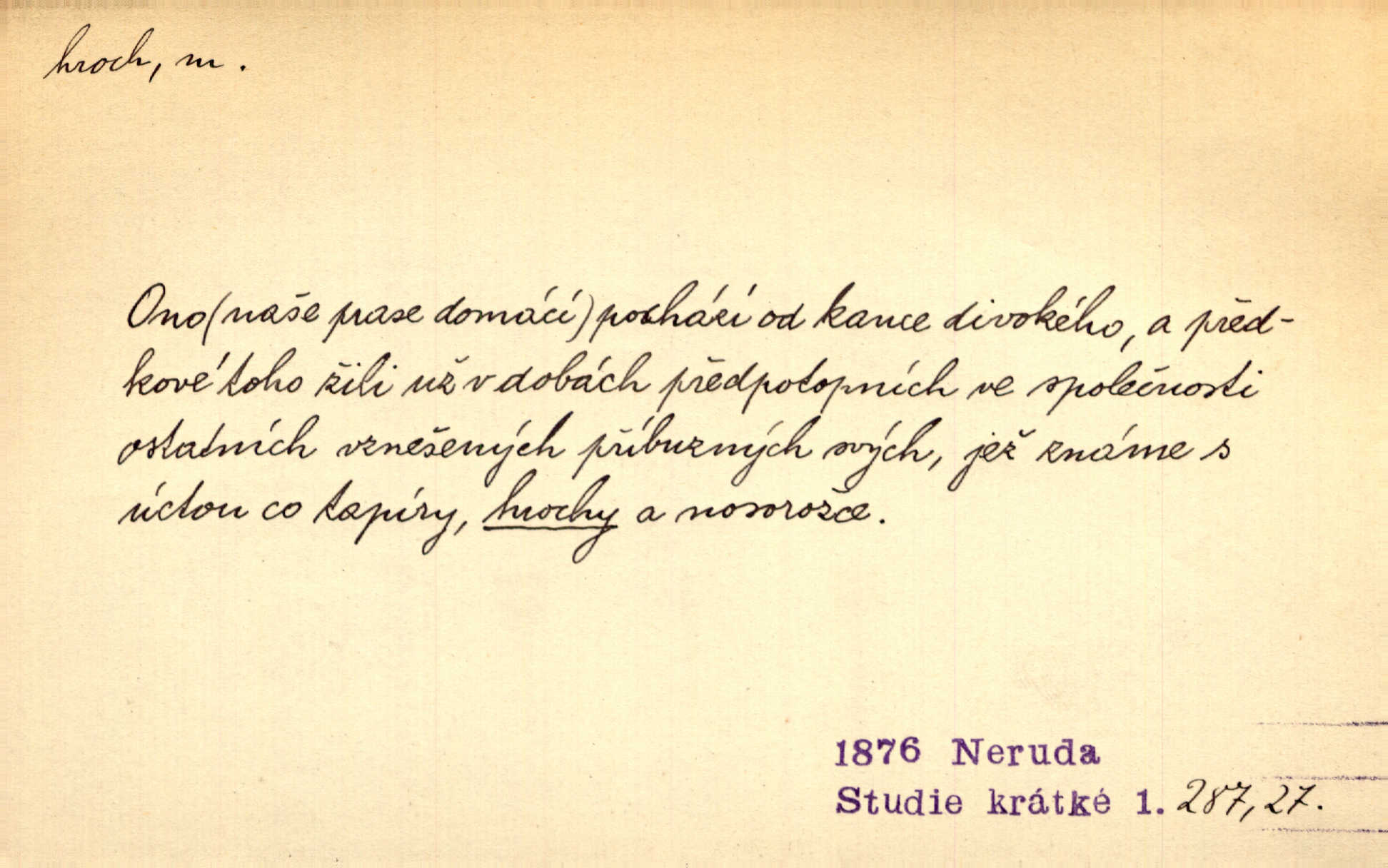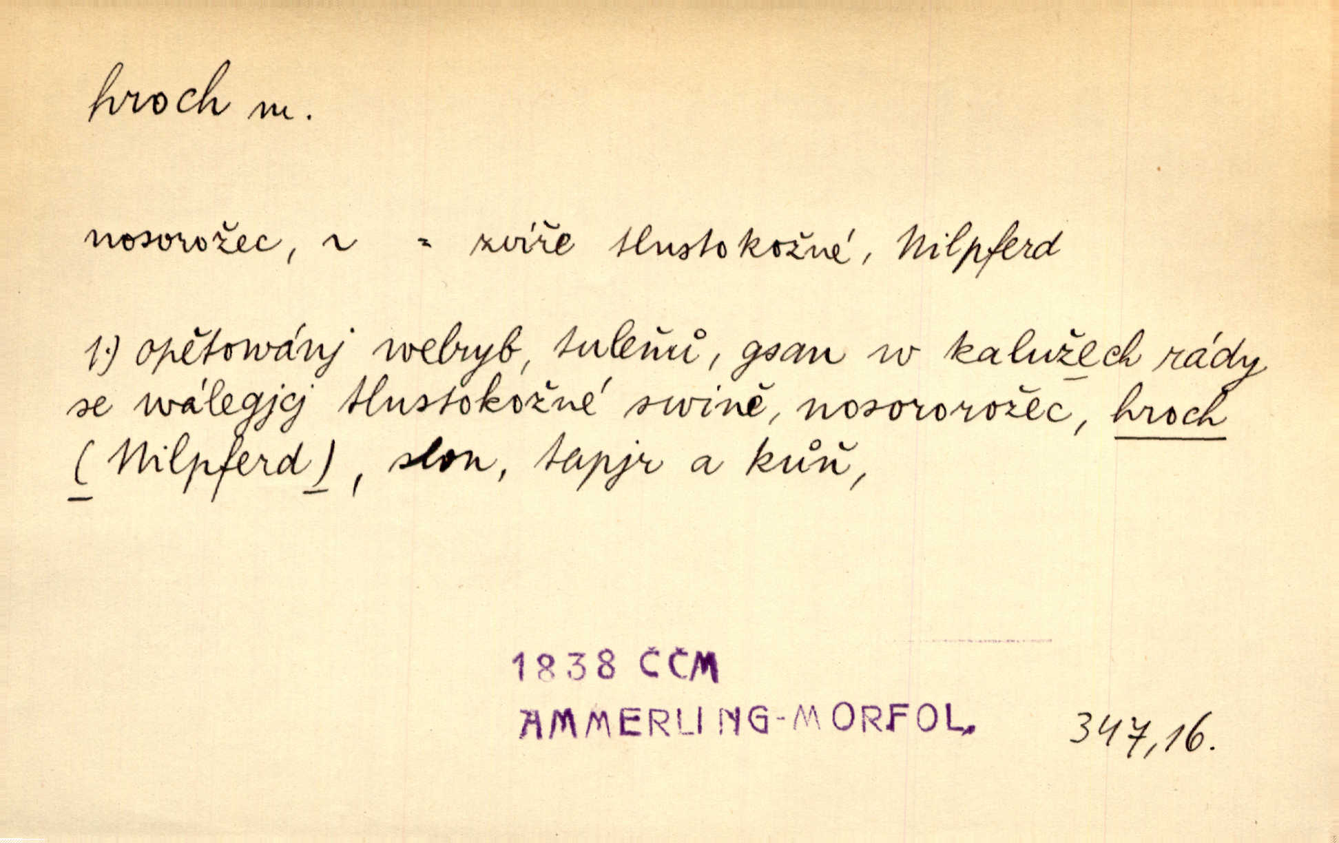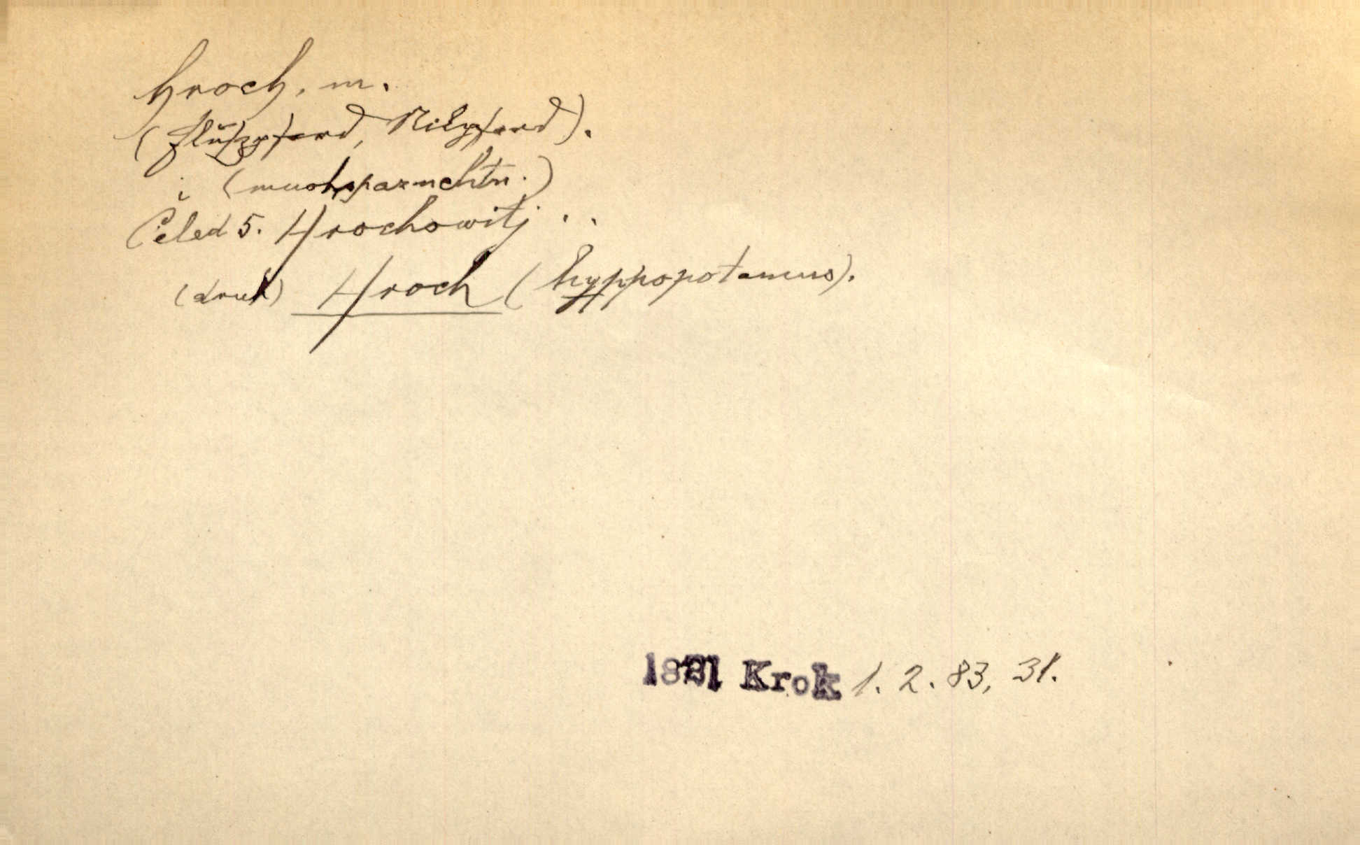 - hroch, -a m. středoafrický sudokopytník (Hippopotamus). Supí vedrem jako hroch. Herrm. Naříkal si na teplo, žízeň a sotva že se hýbal jako hroch. V. Mrš. D jm. psa. Čeští psi mají jména: hroch, hrom, hromizvěř. Květy.