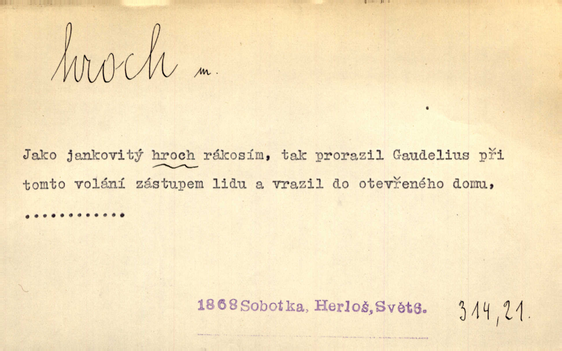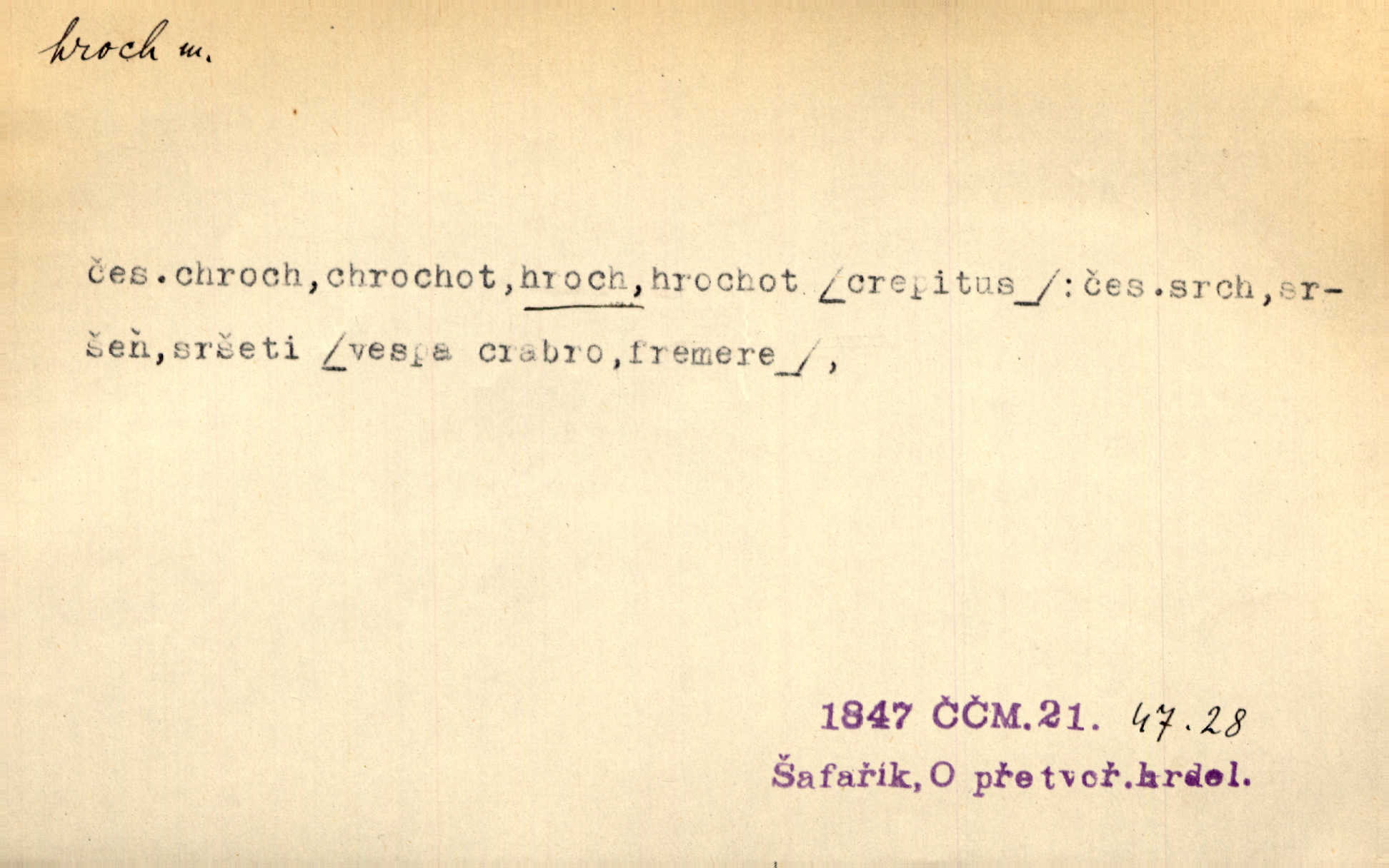 - †hroch, -u m. rachocení, rána z děla a p. Ze hrochu, kterýž slyším, poznávám, že z děla vystřeleno bylo. A. Mar.