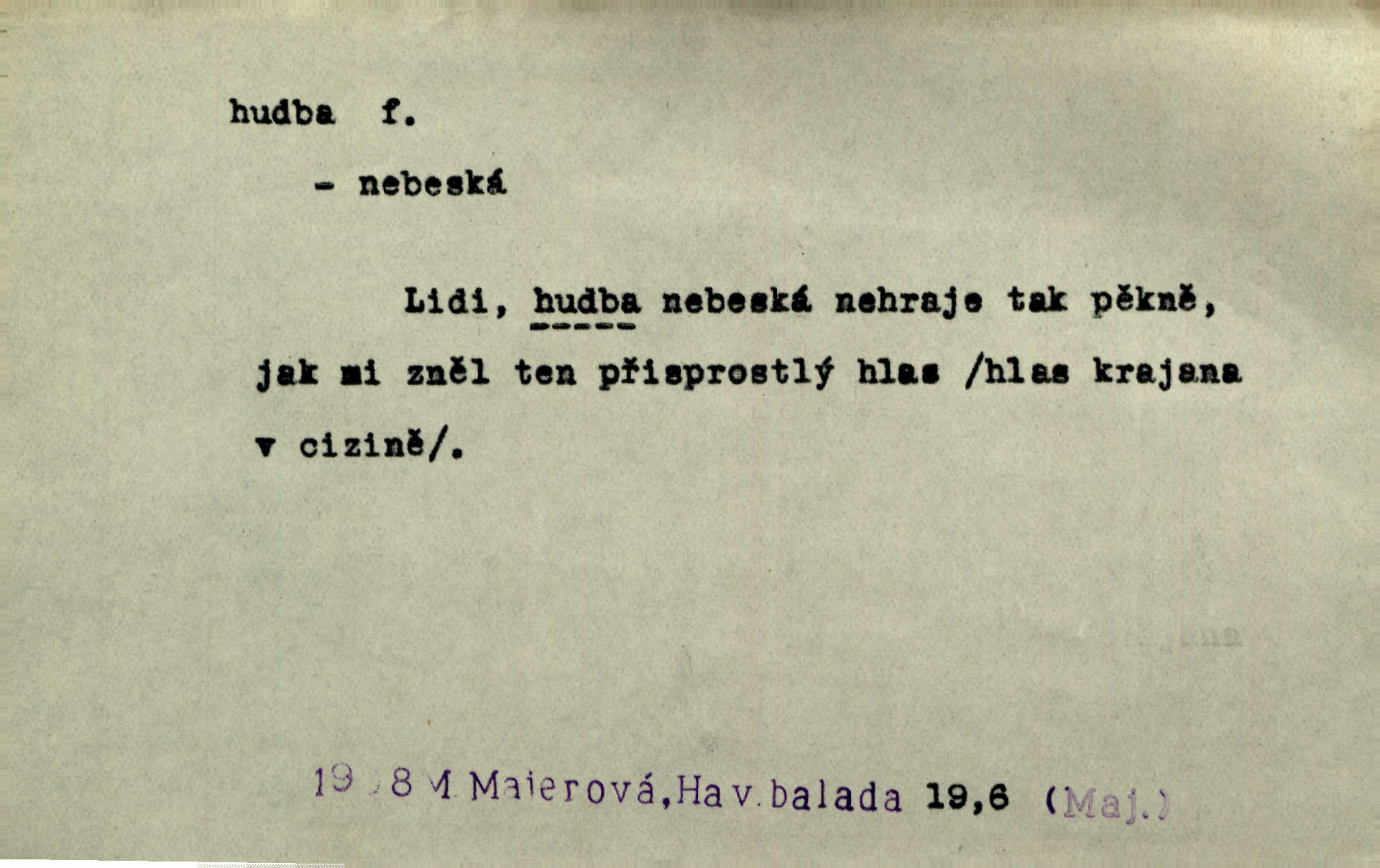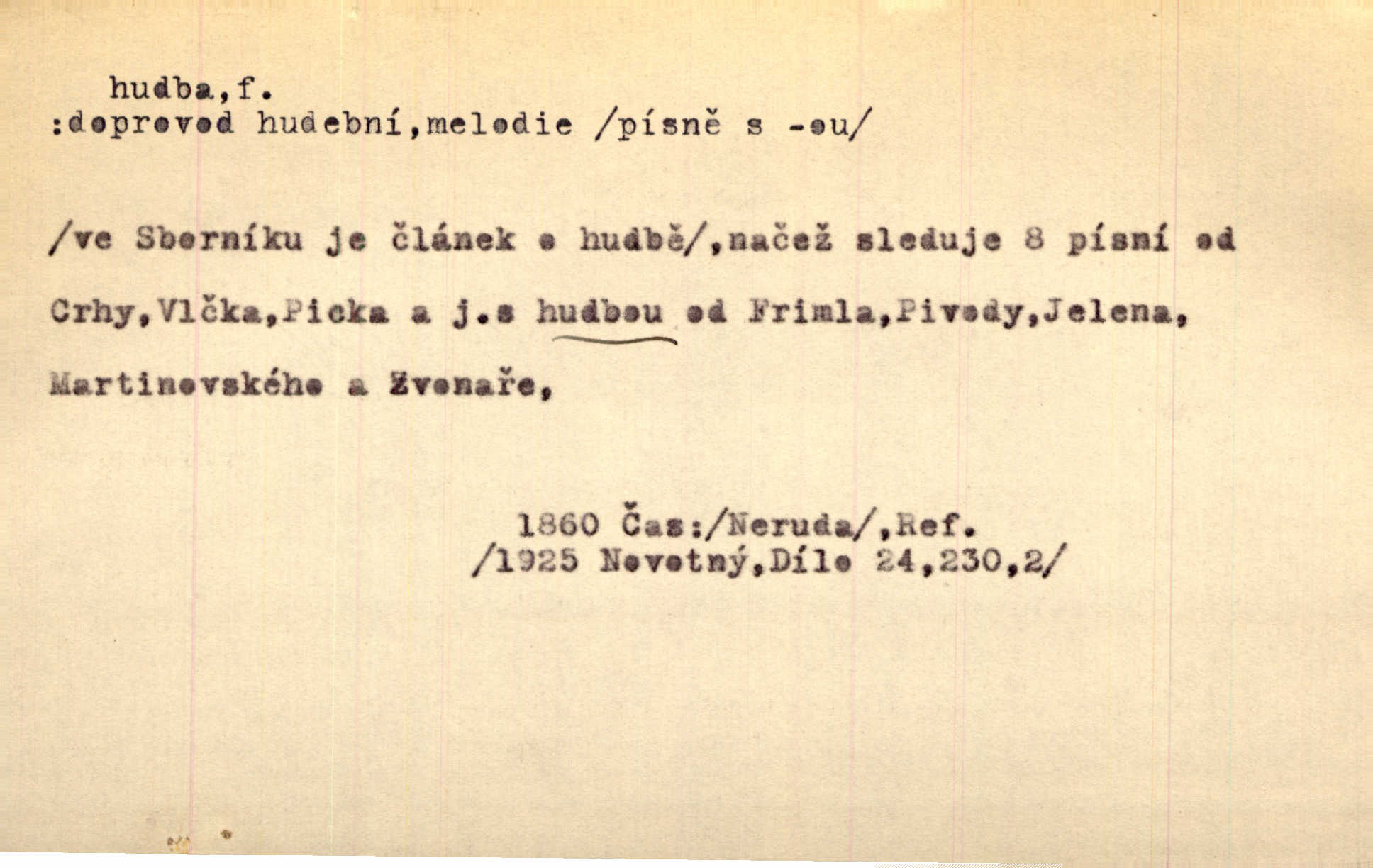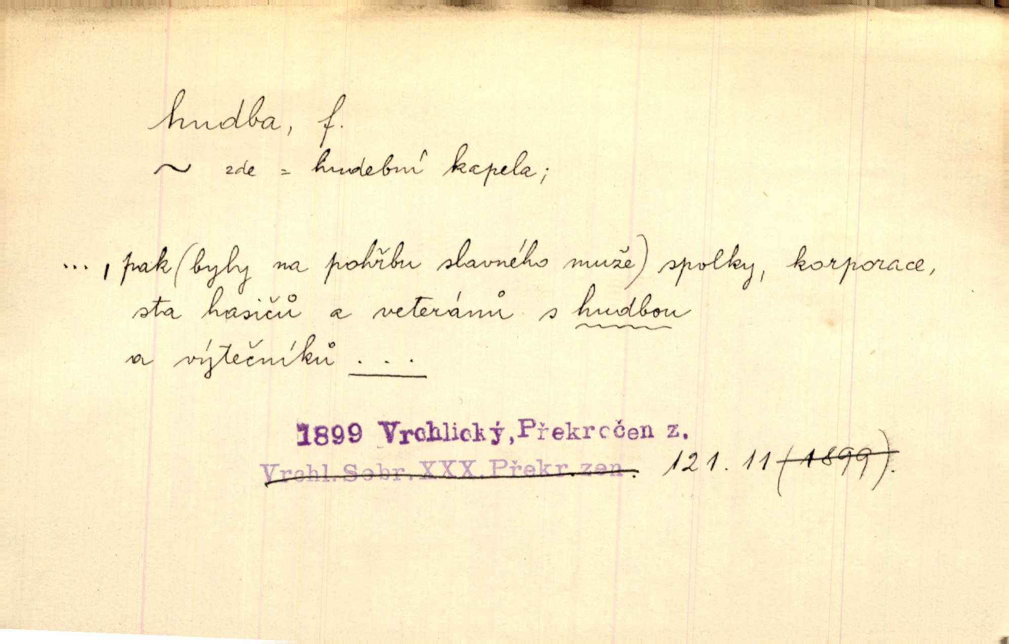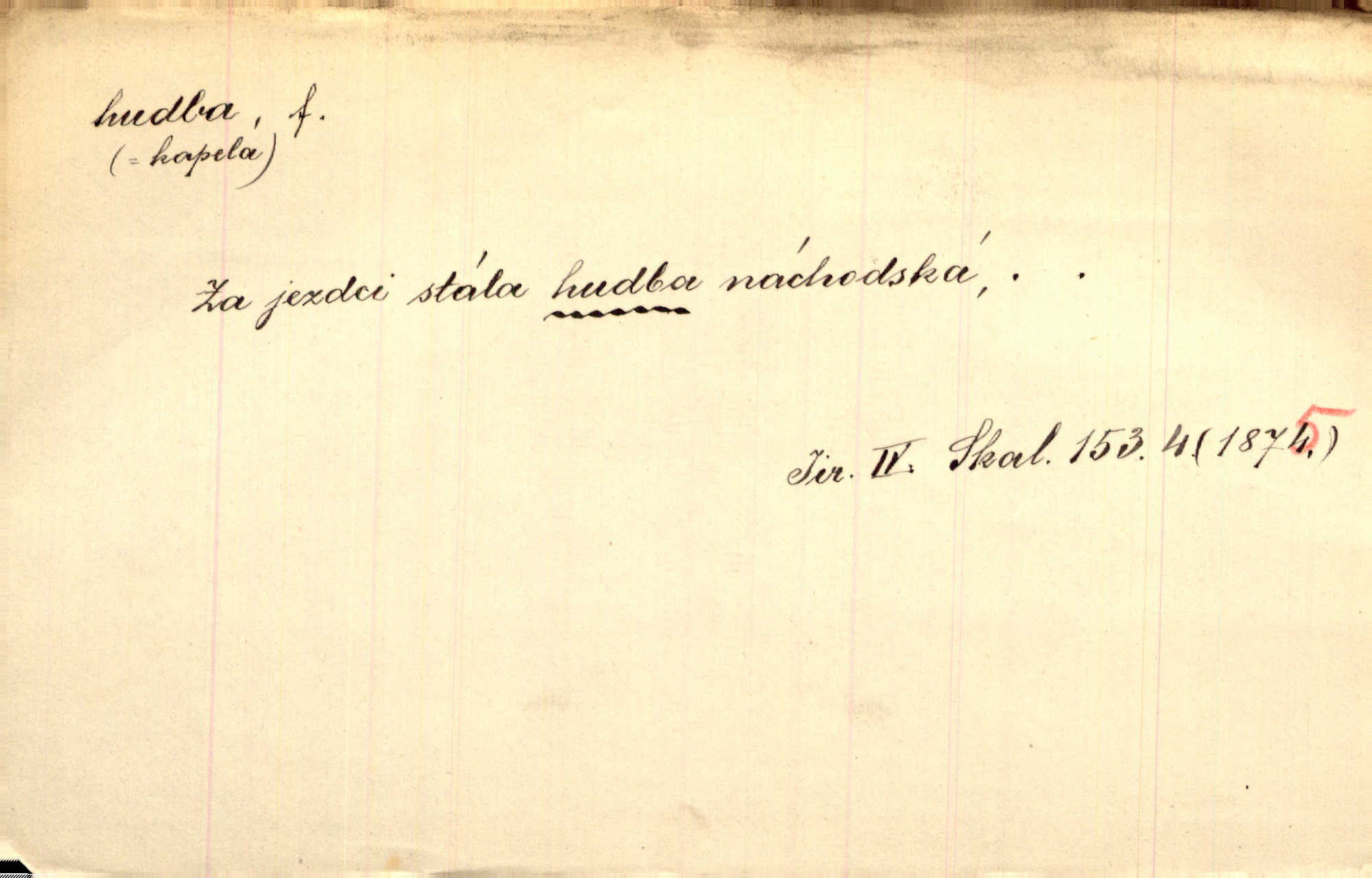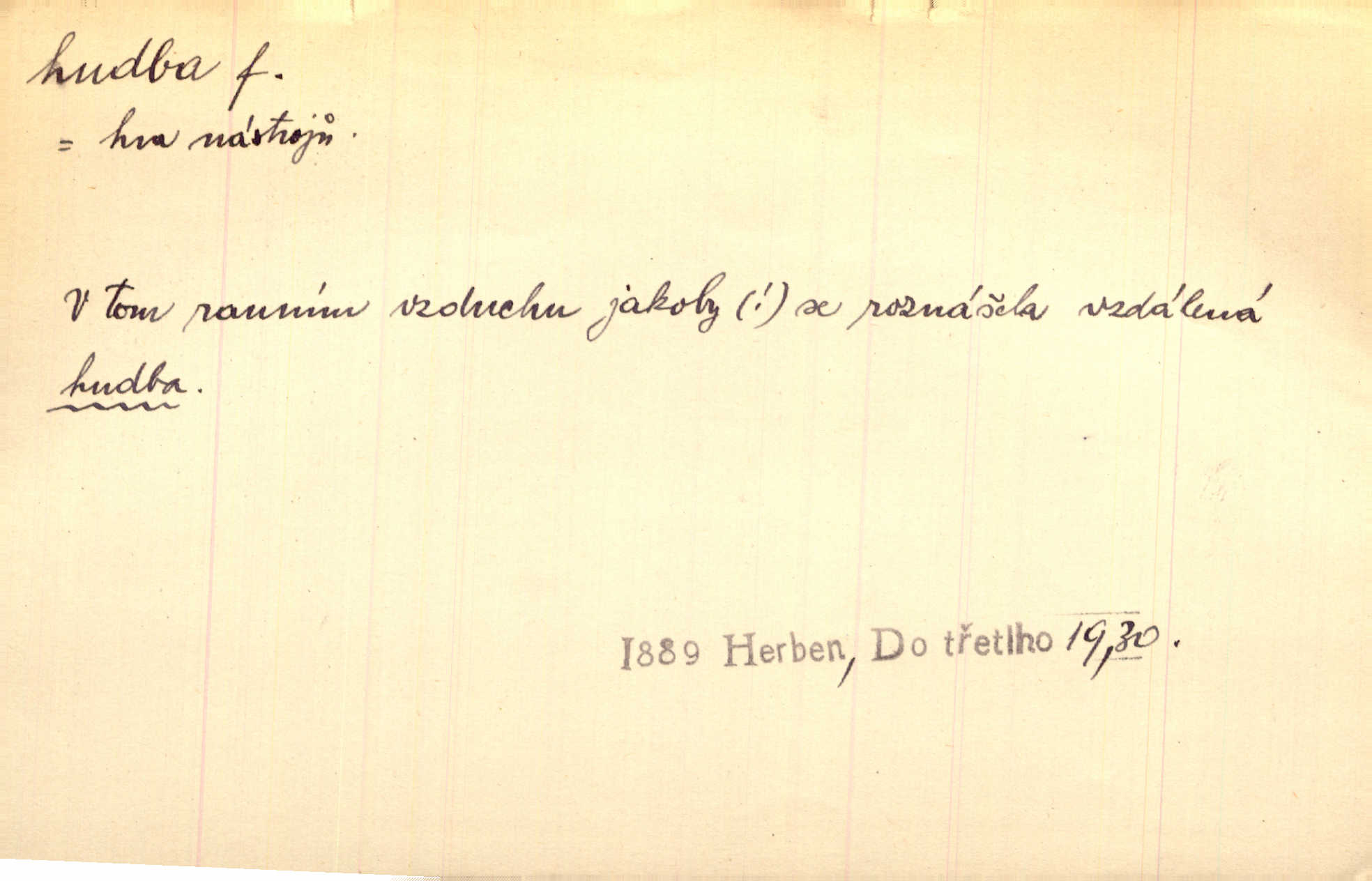 - hudba, -y f. umění tvořící svá díla z tónů. Hudba lidová, umělá, vážná, veselá. Hudba církevní, světská. Hudba dramatická, koncertní, komorní; instrumentální, vokální. Hudba absolutní, programní. Hudba jednohlasá, vícehlasá; homofonní, polyfonní. Přen. Hudba budoucnosti něco krásného, co leží v daleké budoucnosti. D hra na hudební nástroj. V krčmě zazní skočná hudba. Bezr. Přen. Po pekelné hudbě šrapnelů a strojních pušek v zákopech bylo tak nezvyklé ticho. Leg. D hudební skladba, doprovod. Následuje 8 písní od Crhy, Vlčka a j. s hudbou od Frimla, Pivody. Ner. D Arch. hudebniny. Beethoven si stěžuje, že při vyhledávání hudby ve Vídni setkal se s jakýmsi odporem u vrchního hofmistra. Smet. D hudebnost, melodičnost, libozvuk. Pro hudbu slova nemá [básník] valného smyslu. Kar. Kochal se hudbou jejího hlasu. Zey. D sbor hudebníků, kapela. Za jezdci stála hudba náchodská. Jir.