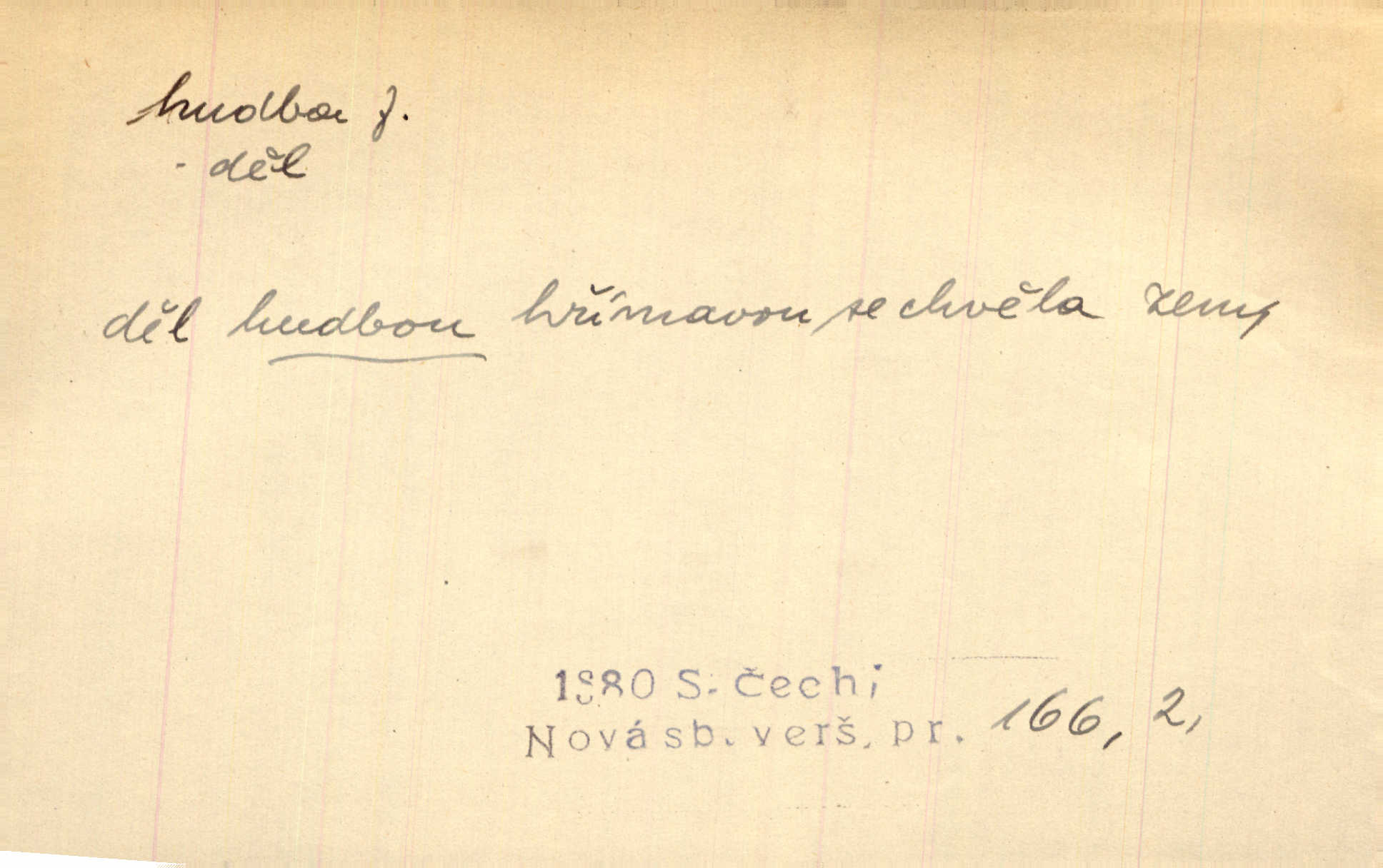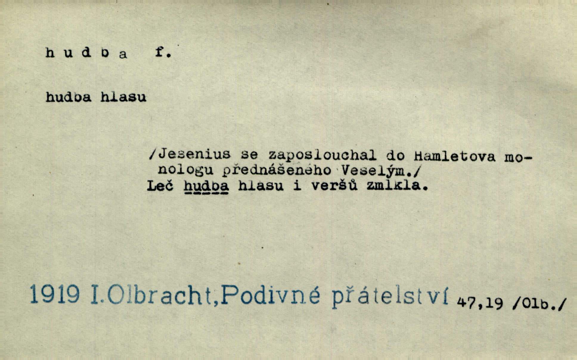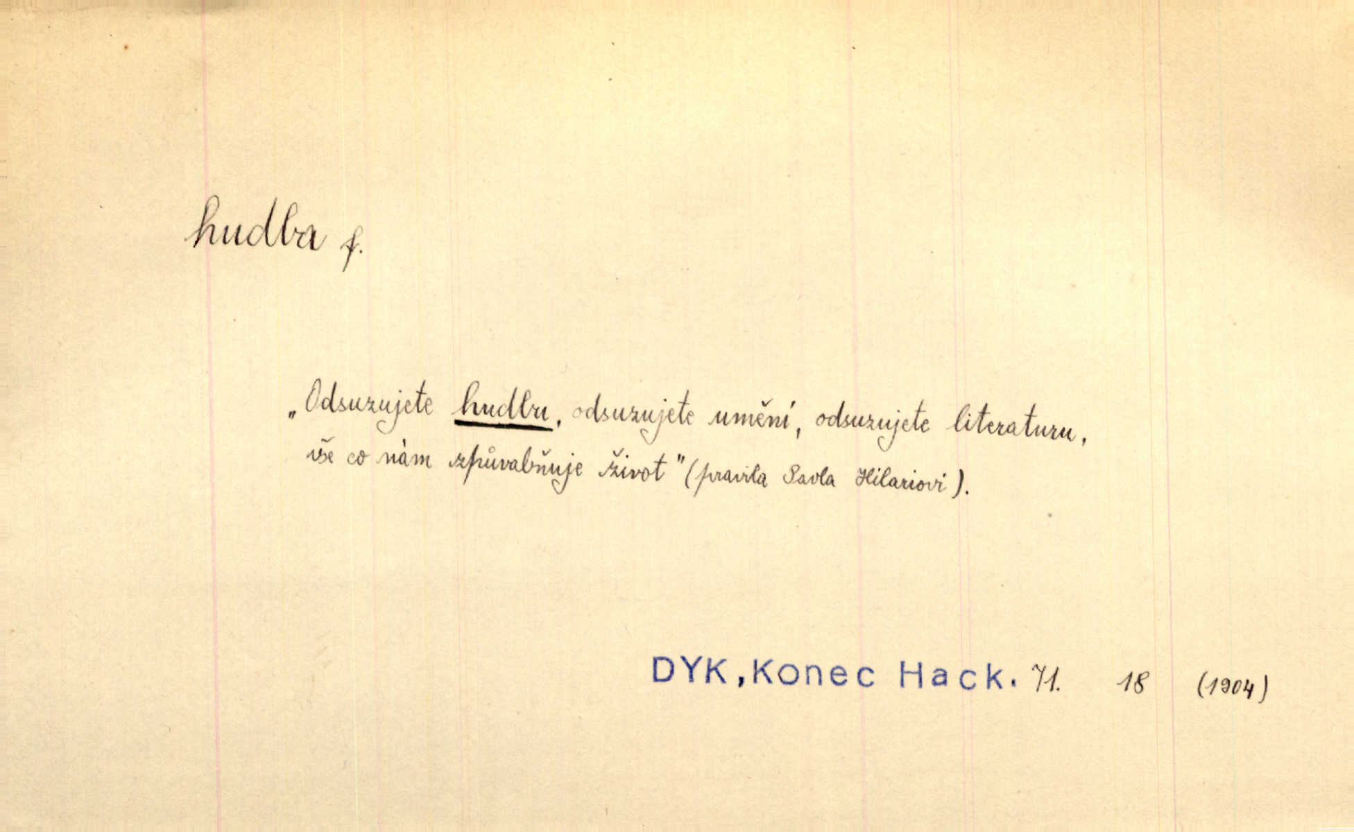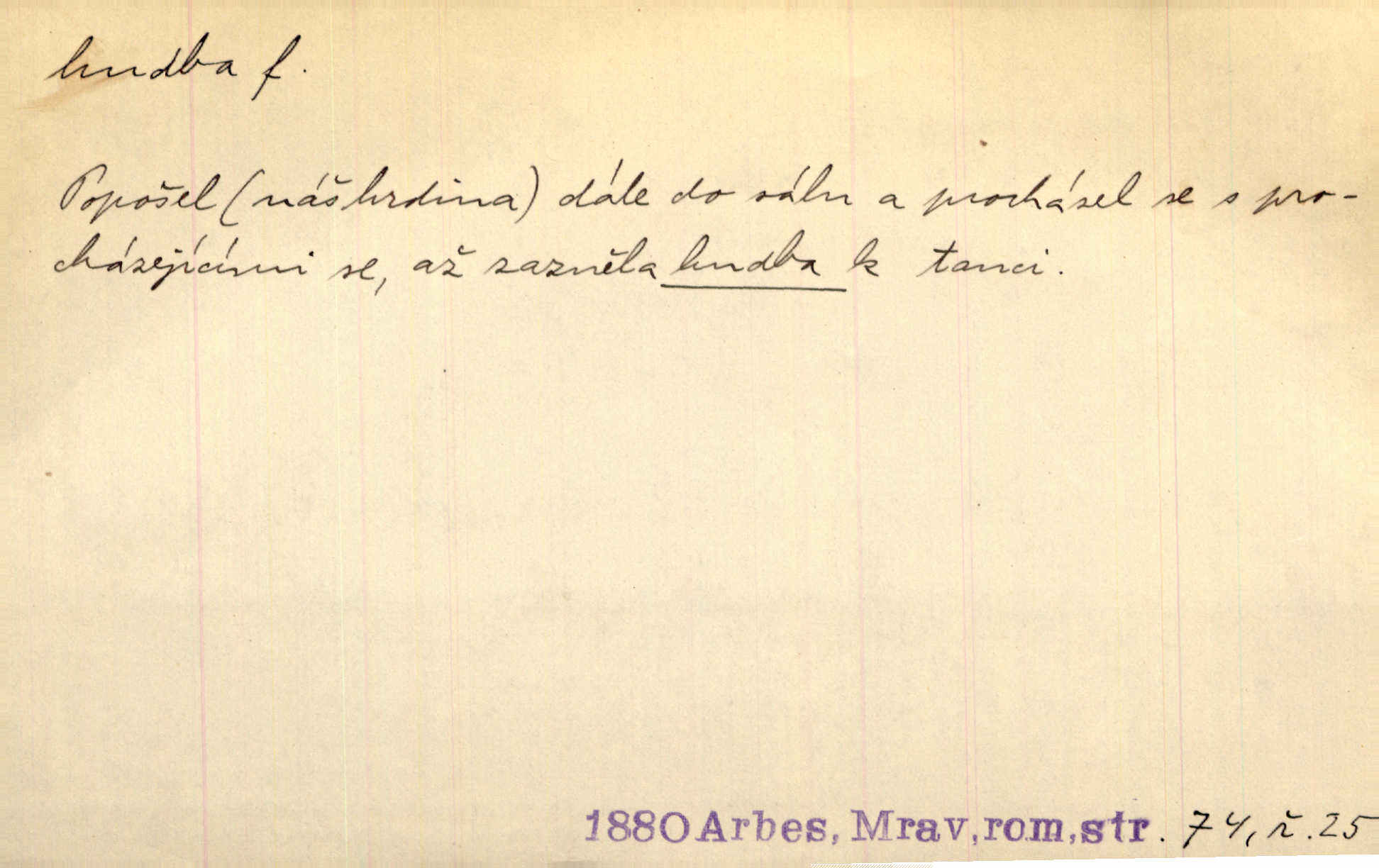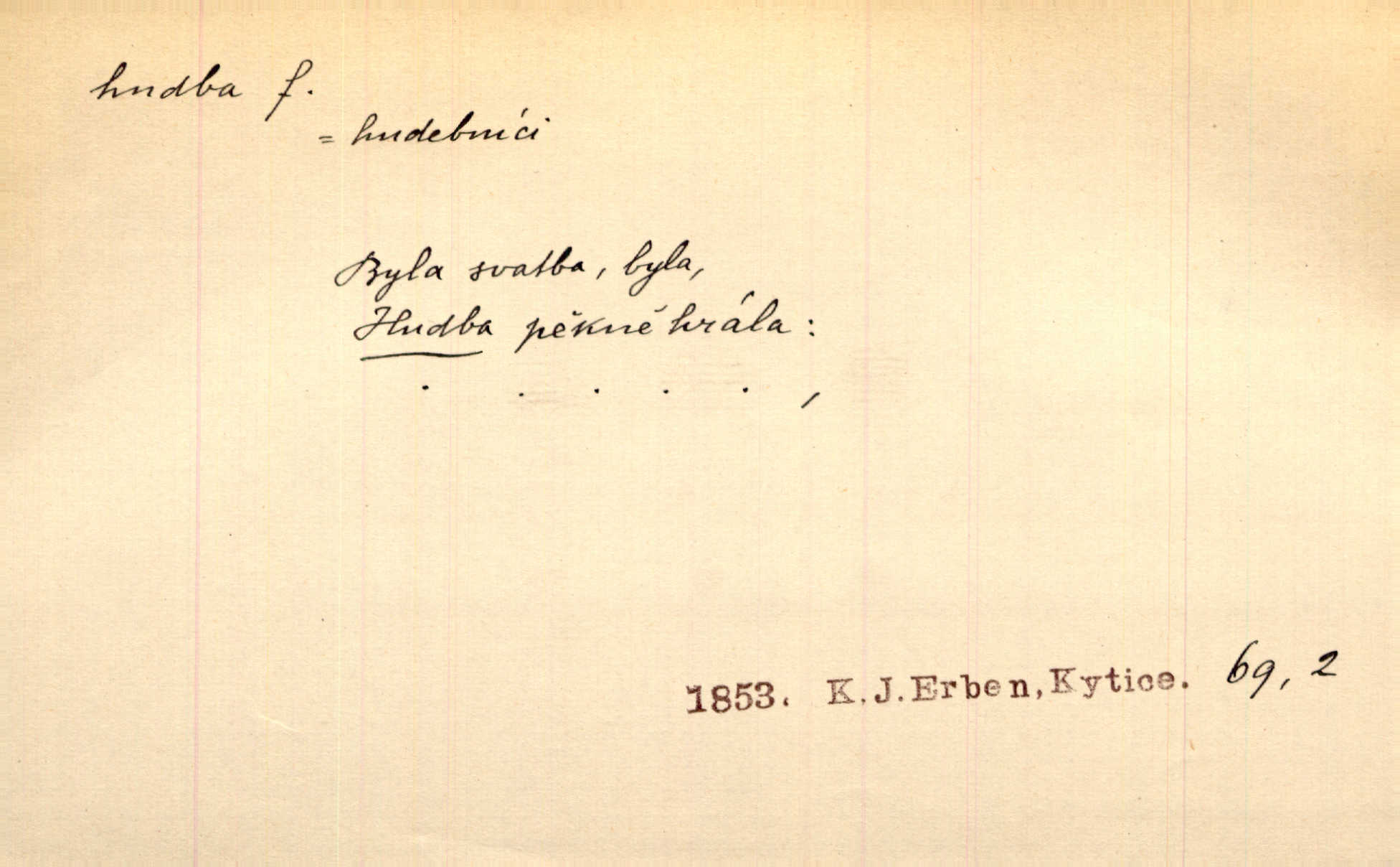 - hudba, -y f. umění tvořící svá díla z tónů. Hudba lidová, umělá, vážná, veselá. Hudba církevní, světská. Hudba dramatická, koncertní, komorní; instrumentální, vokální. Hudba absolutní, programní. Hudba jednohlasá, vícehlasá; homofonní, polyfonní. Přen. Hudba budoucnosti něco krásného, co leží v daleké budoucnosti. D hra na hudební nástroj. V krčmě zazní skočná hudba. Bezr. Přen. Po pekelné hudbě šrapnelů a strojních pušek v zákopech bylo tak nezvyklé ticho. Leg. D hudební skladba, doprovod. Následuje 8 písní od Crhy, Vlčka a j. s hudbou od Frimla, Pivody. Ner. D Arch. hudebniny. Beethoven si stěžuje, že při vyhledávání hudby ve Vídni setkal se s jakýmsi odporem u vrchního hofmistra. Smet. D hudebnost, melodičnost, libozvuk. Pro hudbu slova nemá [básník] valného smyslu. Kar. Kochal se hudbou jejího hlasu. Zey. D sbor hudebníků, kapela. Za jezdci stála hudba náchodská. Jir.