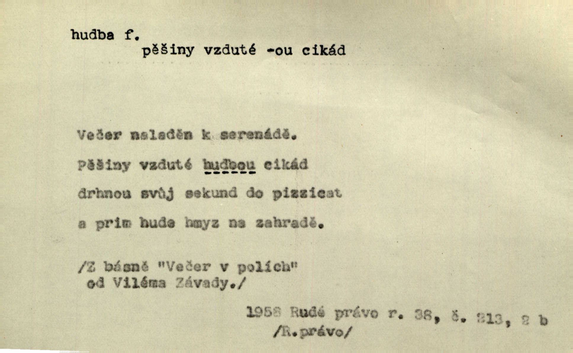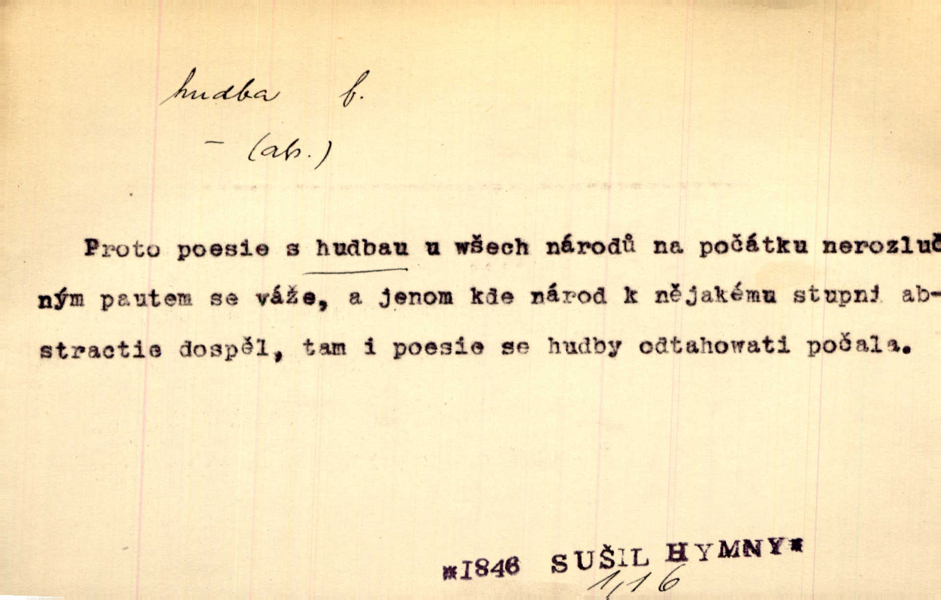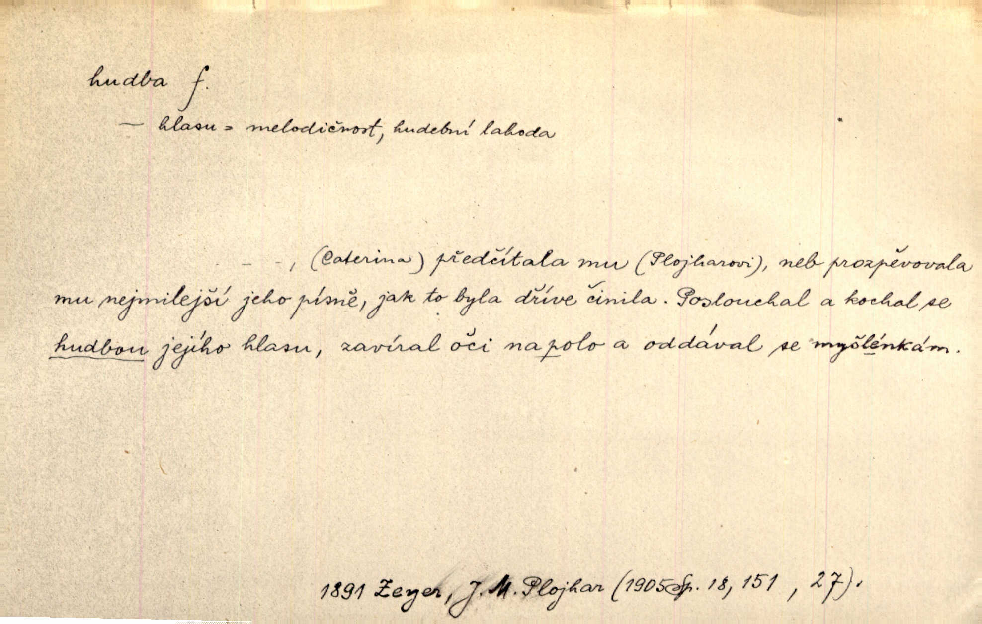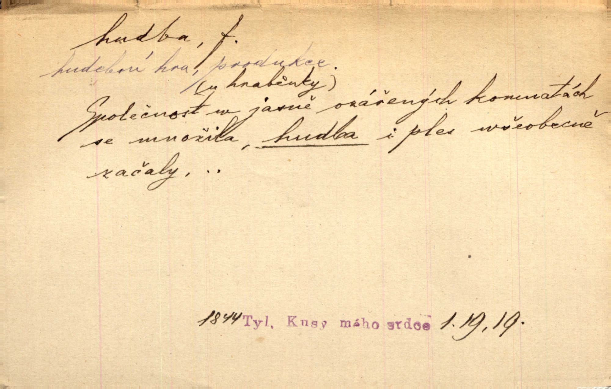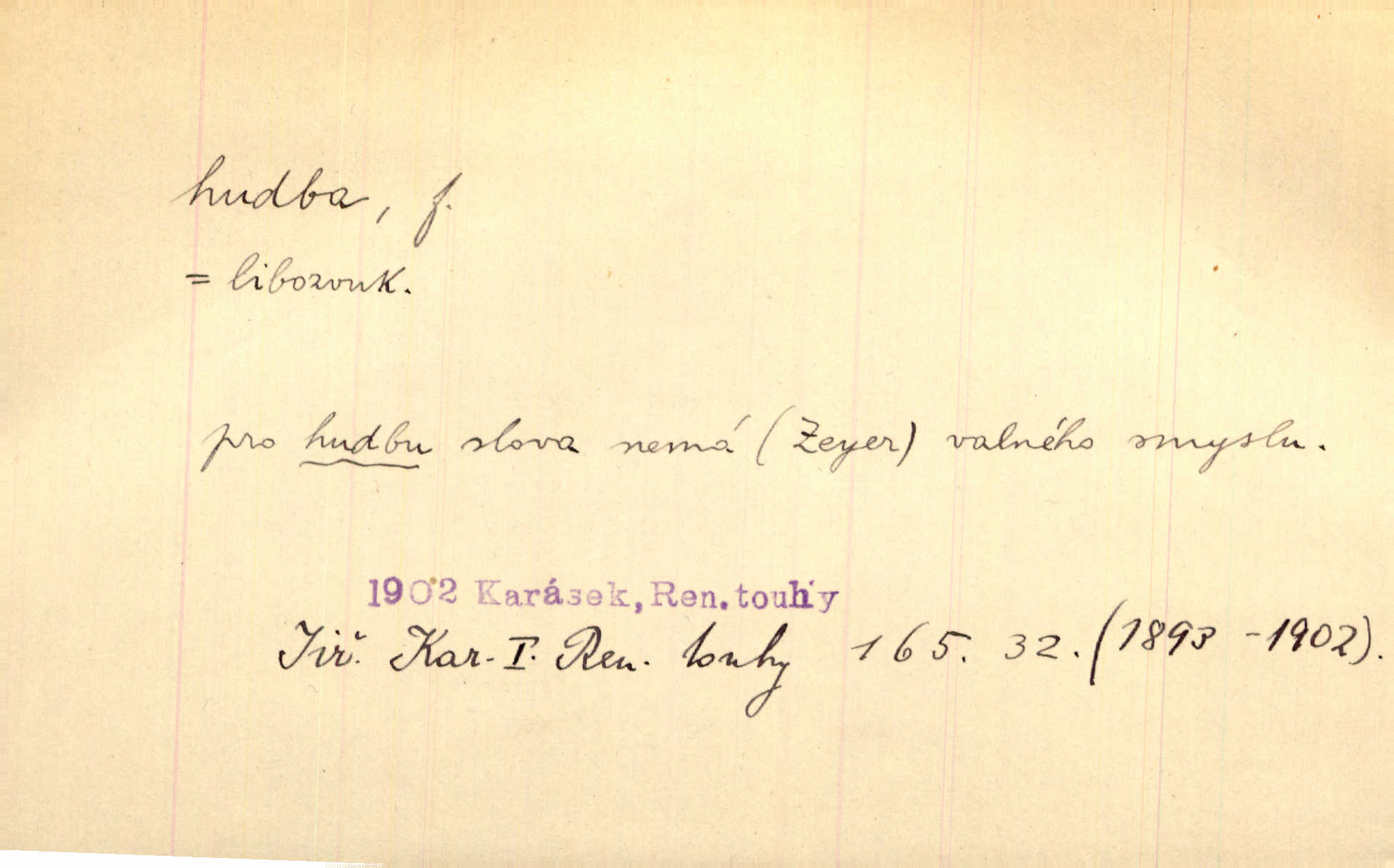 - hudba, -y f. umění tvořící svá díla z tónů. Hudba lidová, umělá, vážná, veselá. Hudba církevní, světská. Hudba dramatická, koncertní, komorní; instrumentální, vokální. Hudba absolutní, programní. Hudba jednohlasá, vícehlasá; homofonní, polyfonní. Přen. Hudba budoucnosti něco krásného, co leží v daleké budoucnosti. D hra na hudební nástroj. V krčmě zazní skočná hudba. Bezr. Přen. Po pekelné hudbě šrapnelů a strojních pušek v zákopech bylo tak nezvyklé ticho. Leg. D hudební skladba, doprovod. Následuje 8 písní od Crhy, Vlčka a j. s hudbou od Frimla, Pivody. Ner. D Arch. hudebniny. Beethoven si stěžuje, že při vyhledávání hudby ve Vídni setkal se s jakýmsi odporem u vrchního hofmistra. Smet. D hudebnost, melodičnost, libozvuk. Pro hudbu slova nemá [básník] valného smyslu. Kar. Kochal se hudbou jejího hlasu. Zey. D sbor hudebníků, kapela. Za jezdci stála hudba náchodská. Jir.