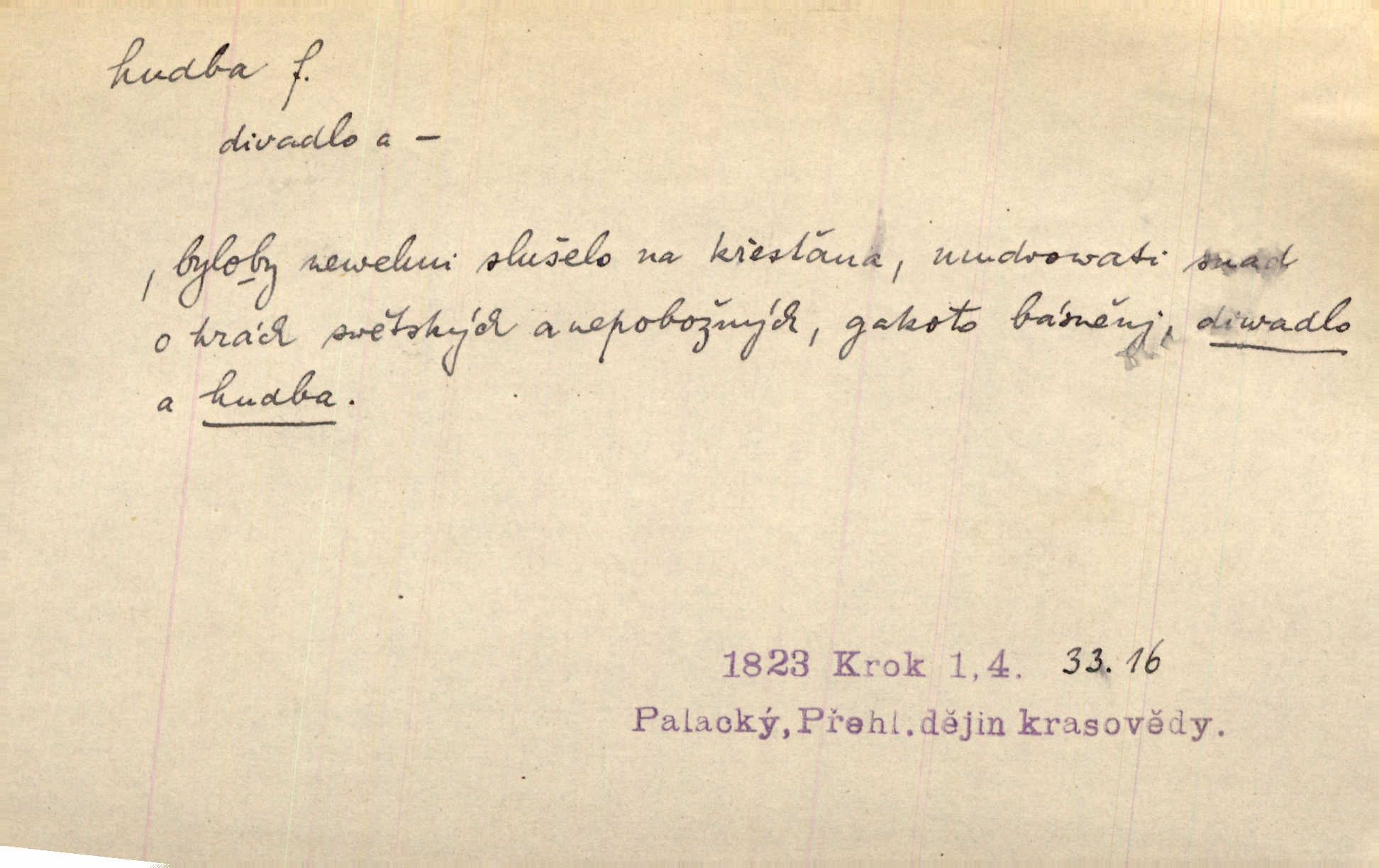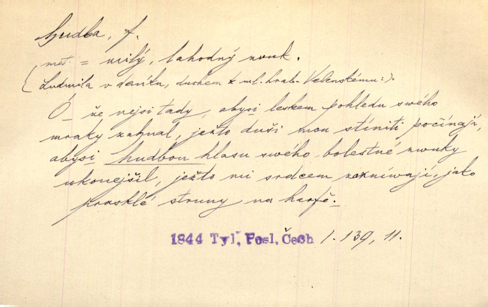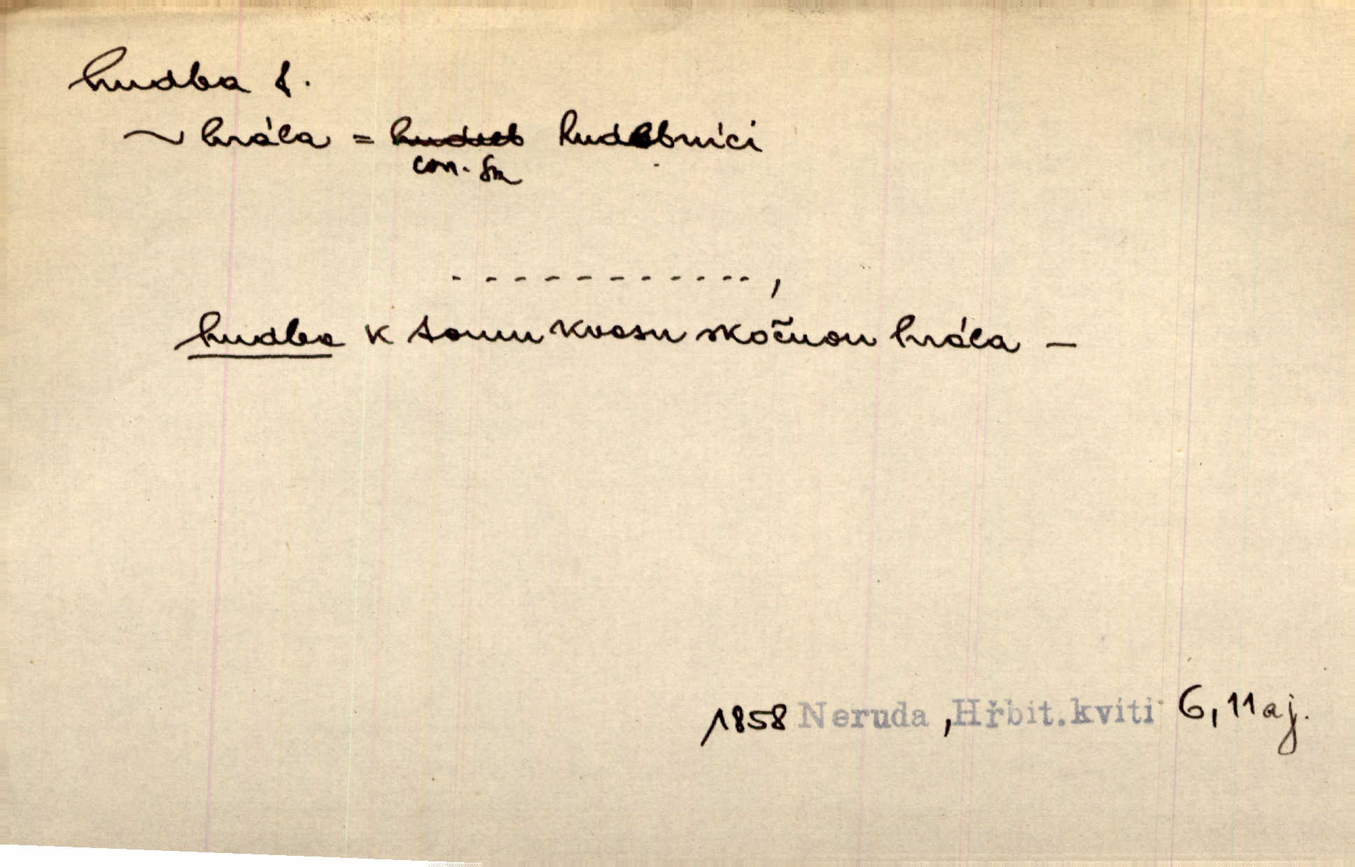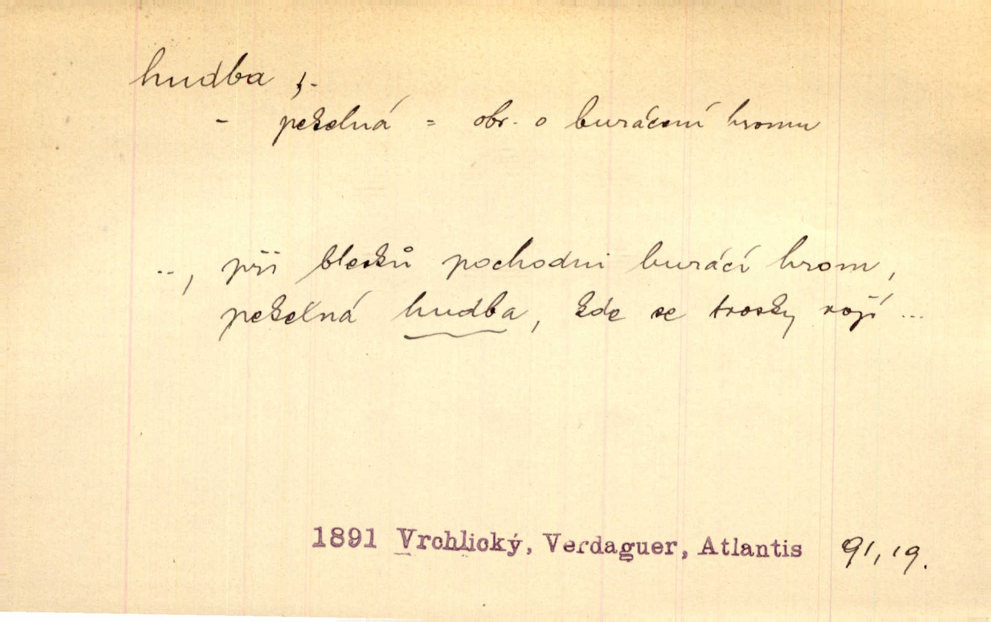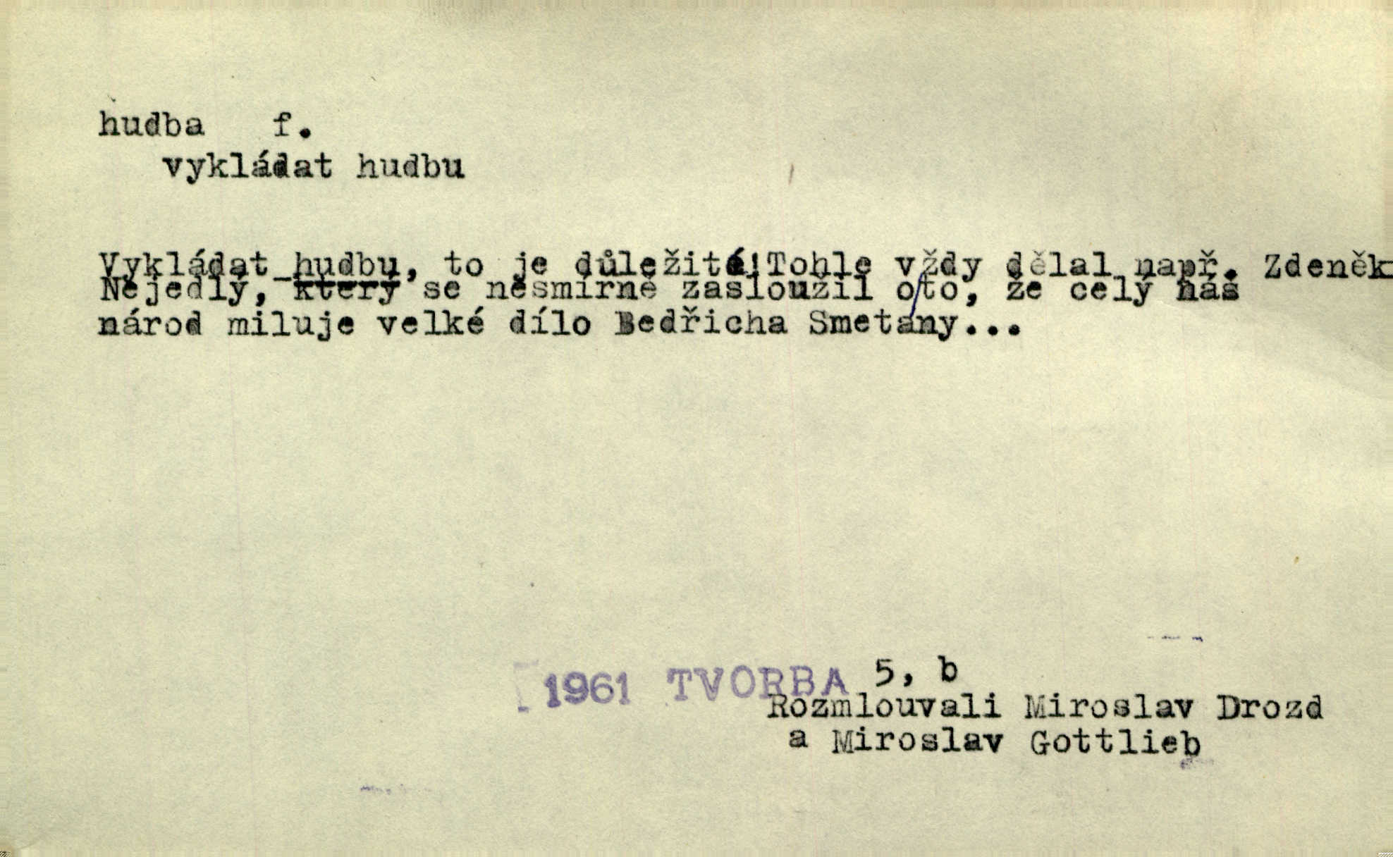 - hudba, -y f. umění tvořící svá díla z tónů. Hudba lidová, umělá, vážná, veselá. Hudba církevní, světská. Hudba dramatická, koncertní, komorní; instrumentální, vokální. Hudba absolutní, programní. Hudba jednohlasá, vícehlasá; homofonní, polyfonní. Přen. Hudba budoucnosti něco krásného, co leží v daleké budoucnosti. D hra na hudební nástroj. V krčmě zazní skočná hudba. Bezr. Přen. Po pekelné hudbě šrapnelů a strojních pušek v zákopech bylo tak nezvyklé ticho. Leg. D hudební skladba, doprovod. Následuje 8 písní od Crhy, Vlčka a j. s hudbou od Frimla, Pivody. Ner. D Arch. hudebniny. Beethoven si stěžuje, že při vyhledávání hudby ve Vídni setkal se s jakýmsi odporem u vrchního hofmistra. Smet. D hudebnost, melodičnost, libozvuk. Pro hudbu slova nemá [básník] valného smyslu. Kar. Kochal se hudbou jejího hlasu. Zey. D sbor hudebníků, kapela. Za jezdci stála hudba náchodská. Jir.