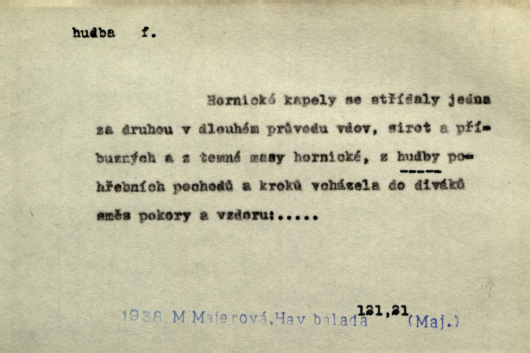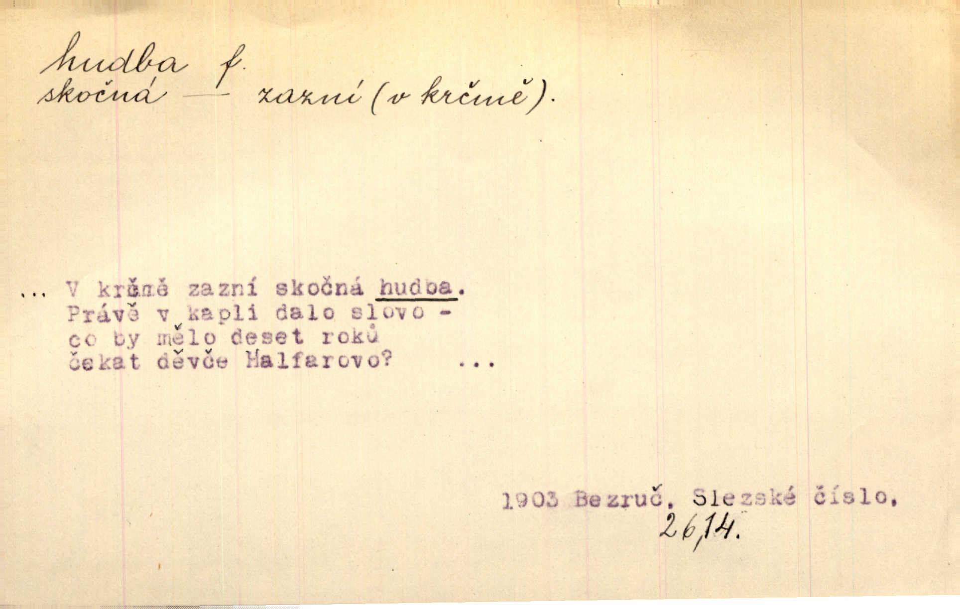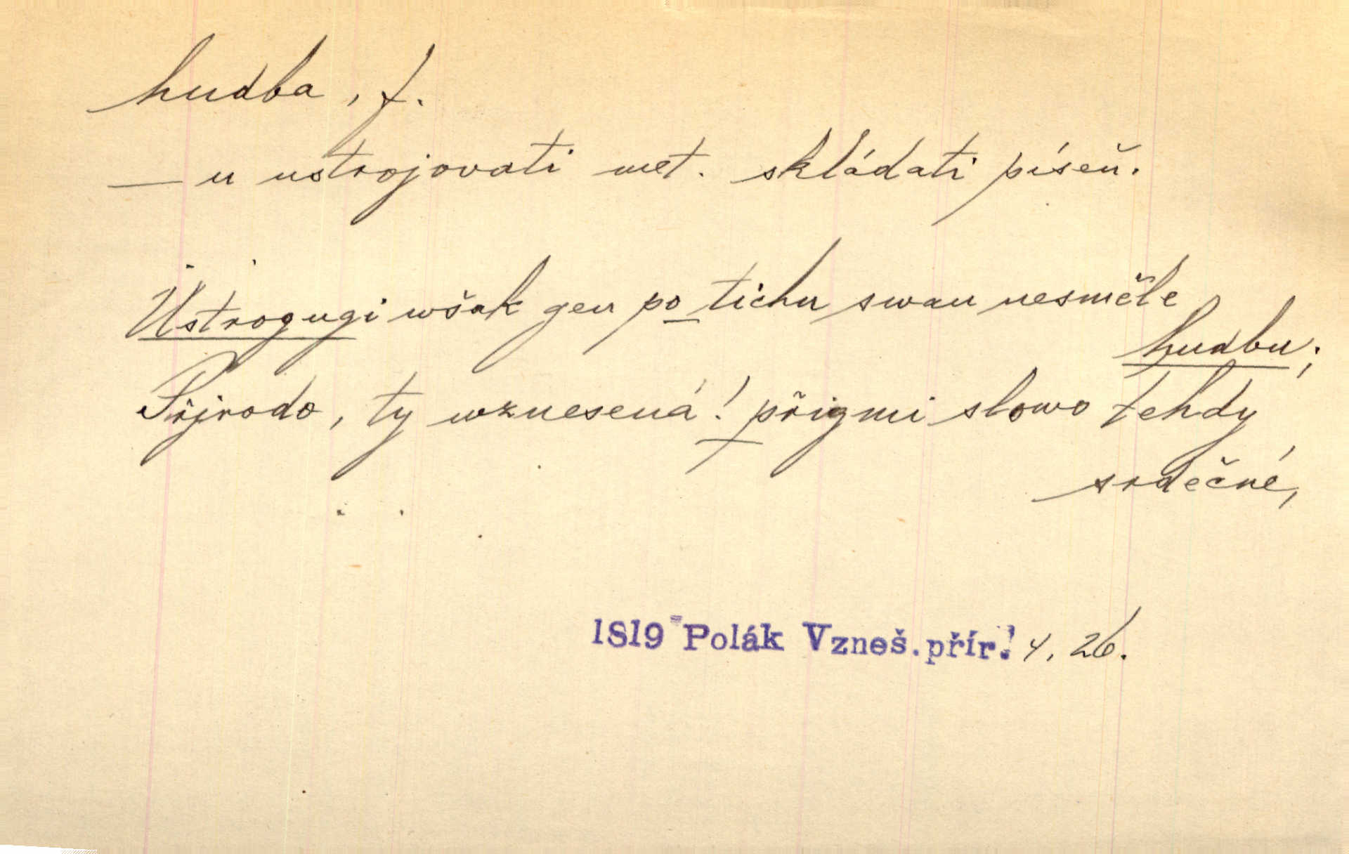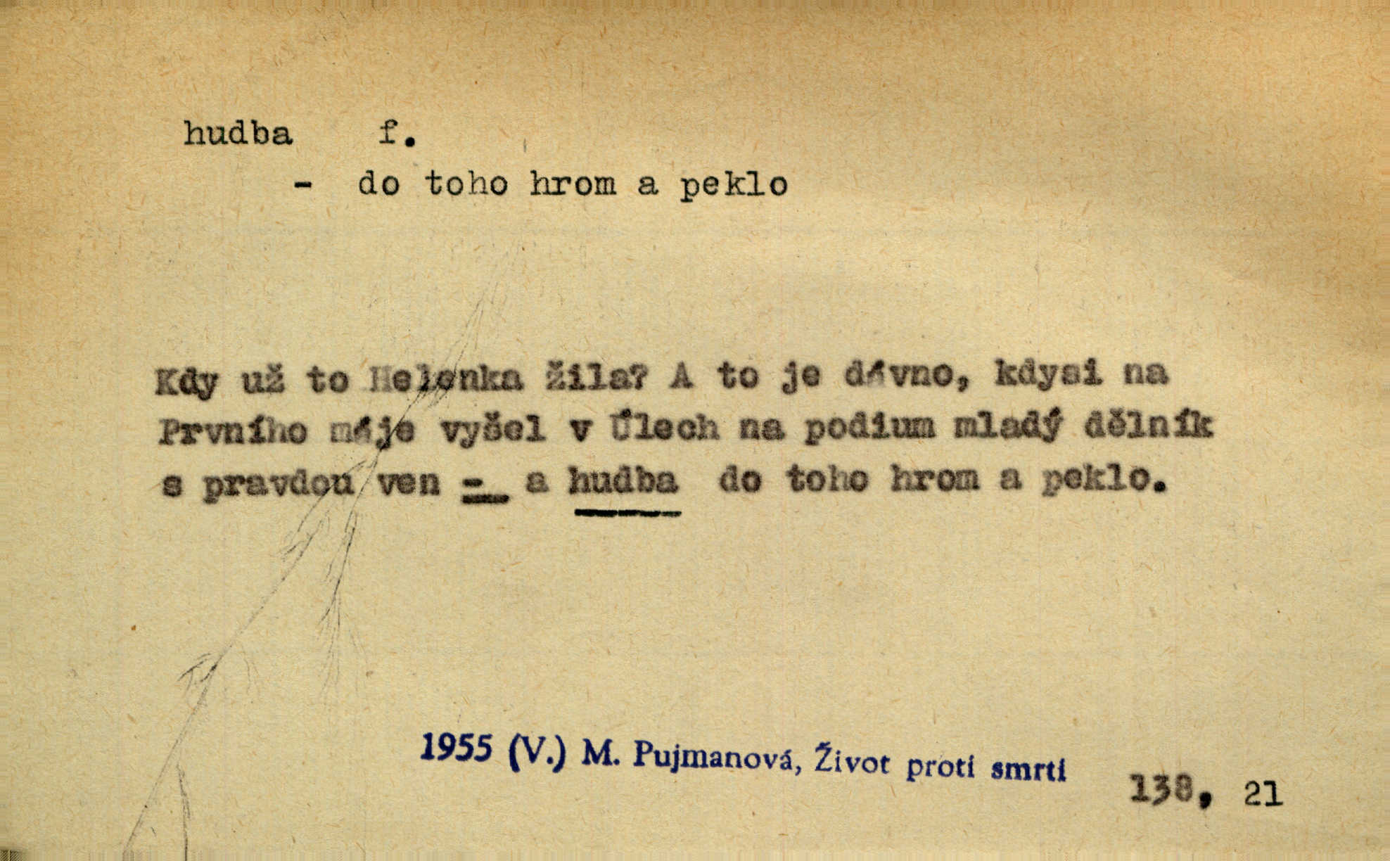 - hudba, -y f. umění tvořící svá díla z tónů. Hudba lidová, umělá, vážná, veselá. Hudba církevní, světská. Hudba dramatická, koncertní, komorní; instrumentální, vokální. Hudba absolutní, programní. Hudba jednohlasá, vícehlasá; homofonní, polyfonní. Přen. Hudba budoucnosti něco krásného, co leží v daleké budoucnosti. D hra na hudební nástroj. V krčmě zazní skočná hudba. Bezr. Přen. Po pekelné hudbě šrapnelů a strojních pušek v zákopech bylo tak nezvyklé ticho. Leg. D hudební skladba, doprovod. Následuje 8 písní od Crhy, Vlčka a j. s hudbou od Frimla, Pivody. Ner. D Arch. hudebniny. Beethoven si stěžuje, že při vyhledávání hudby ve Vídni setkal se s jakýmsi odporem u vrchního hofmistra. Smet. D hudebnost, melodičnost, libozvuk. Pro hudbu slova nemá [básník] valného smyslu. Kar. Kochal se hudbou jejího hlasu. Zey. D sbor hudebníků, kapela. Za jezdci stála hudba náchodská. Jir.