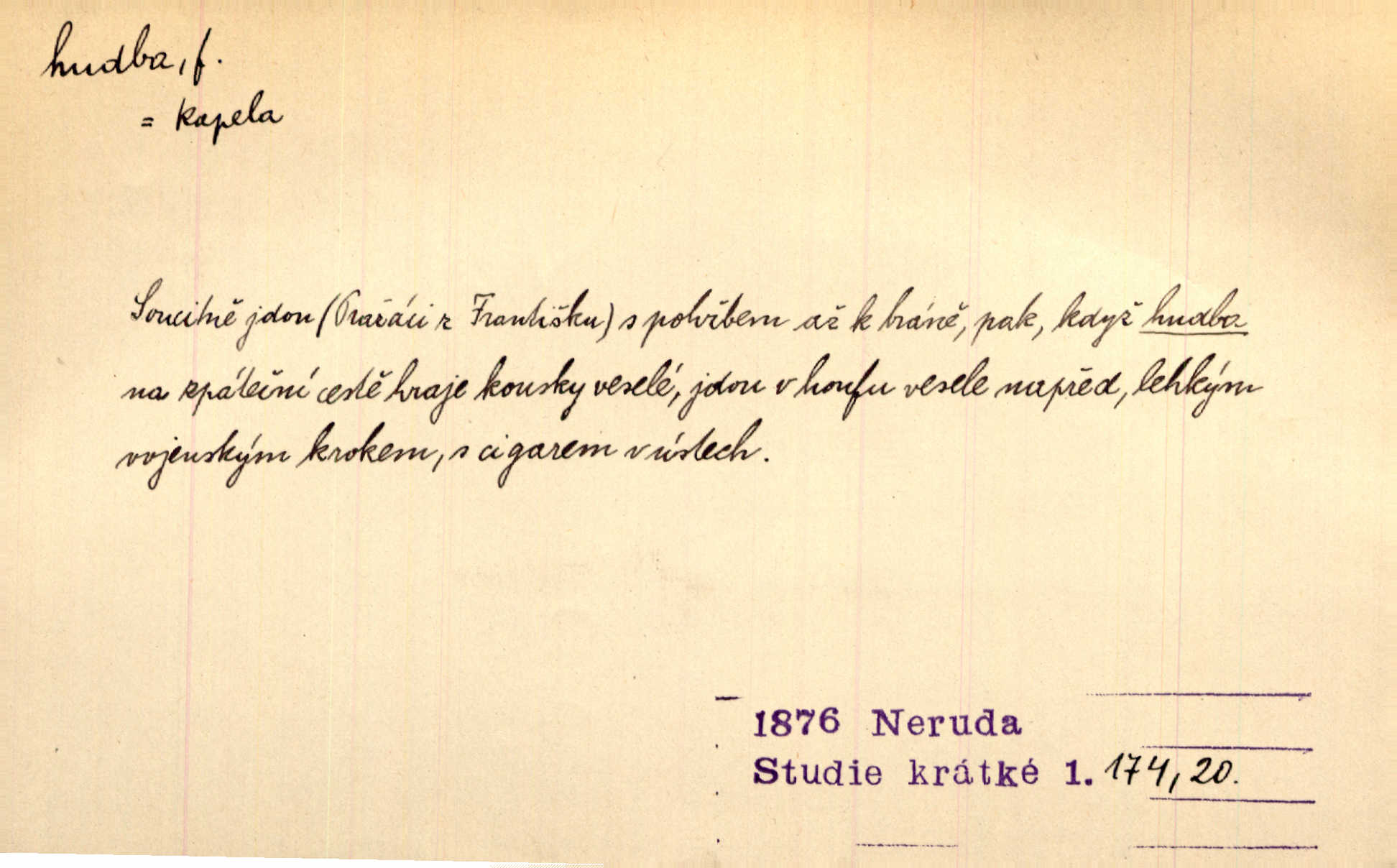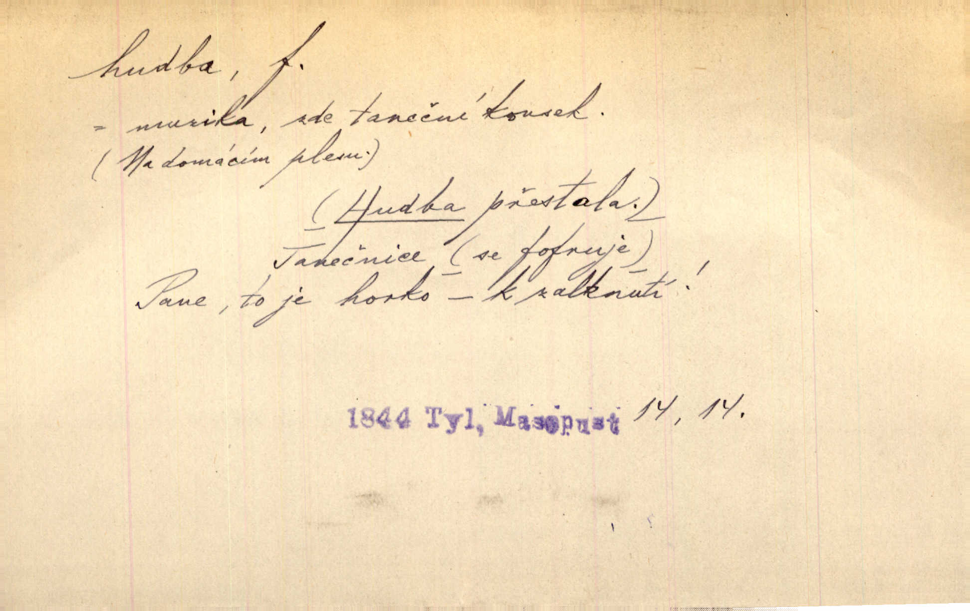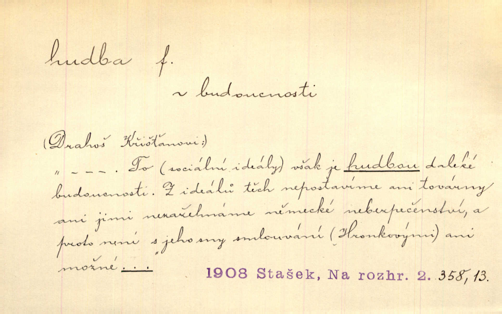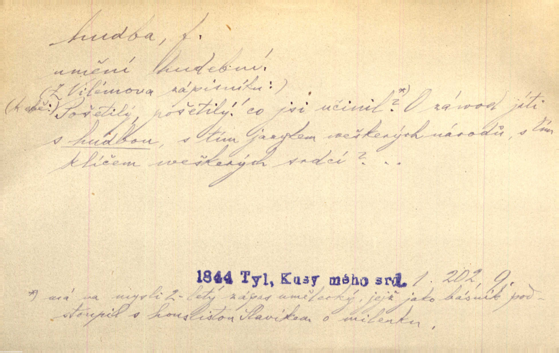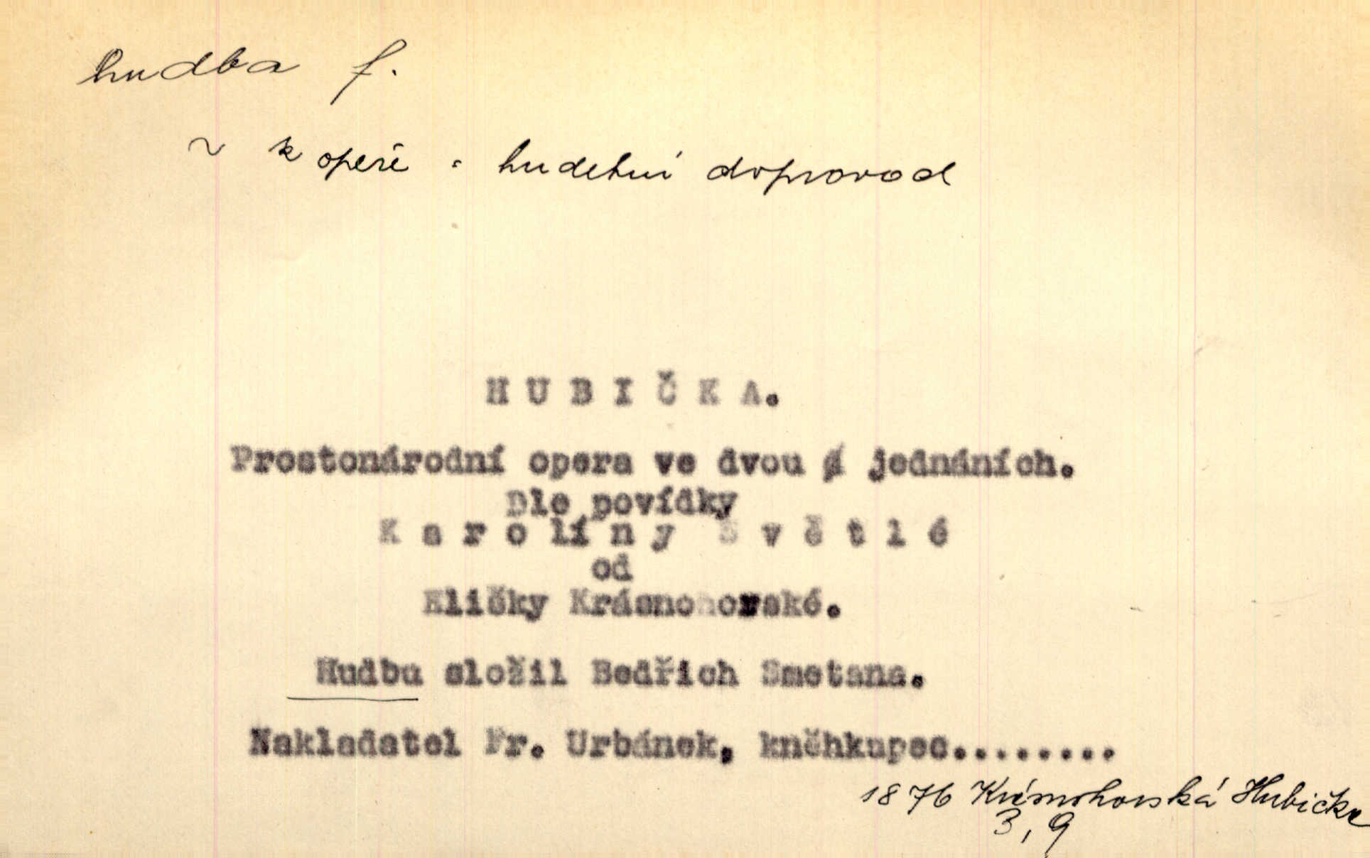 - hudba, -y f. umění tvořící svá díla z tónů. Hudba lidová, umělá, vážná, veselá. Hudba církevní, světská. Hudba dramatická, koncertní, komorní; instrumentální, vokální. Hudba absolutní, programní. Hudba jednohlasá, vícehlasá; homofonní, polyfonní. Přen. Hudba budoucnosti něco krásného, co leží v daleké budoucnosti. D hra na hudební nástroj. V krčmě zazní skočná hudba. Bezr. Přen. Po pekelné hudbě šrapnelů a strojních pušek v zákopech bylo tak nezvyklé ticho. Leg. D hudební skladba, doprovod. Následuje 8 písní od Crhy, Vlčka a j. s hudbou od Frimla, Pivody. Ner. D Arch. hudebniny. Beethoven si stěžuje, že při vyhledávání hudby ve Vídni setkal se s jakýmsi odporem u vrchního hofmistra. Smet. D hudebnost, melodičnost, libozvuk. Pro hudbu slova nemá [básník] valného smyslu. Kar. Kochal se hudbou jejího hlasu. Zey. D sbor hudebníků, kapela. Za jezdci stála hudba náchodská. Jir.
