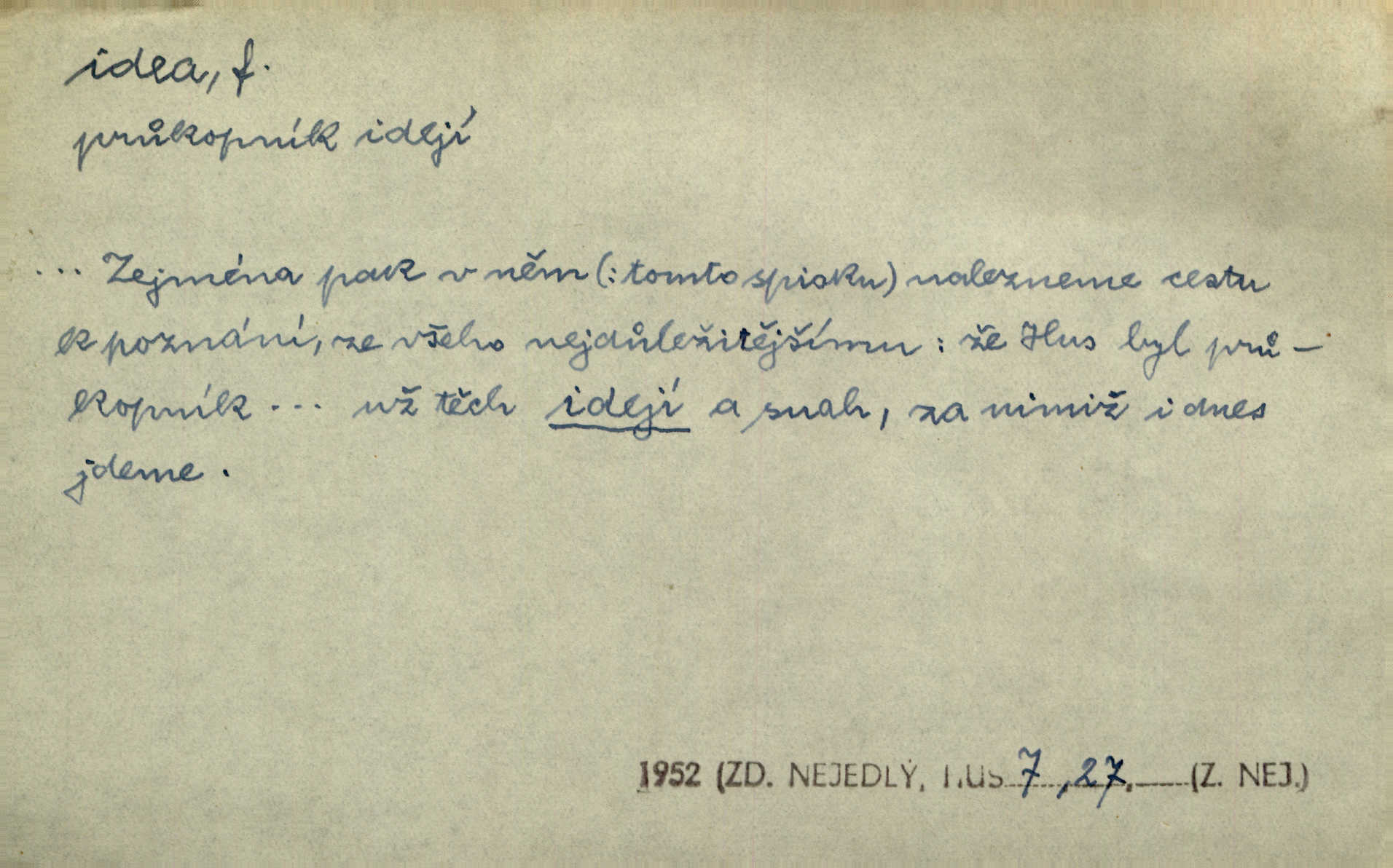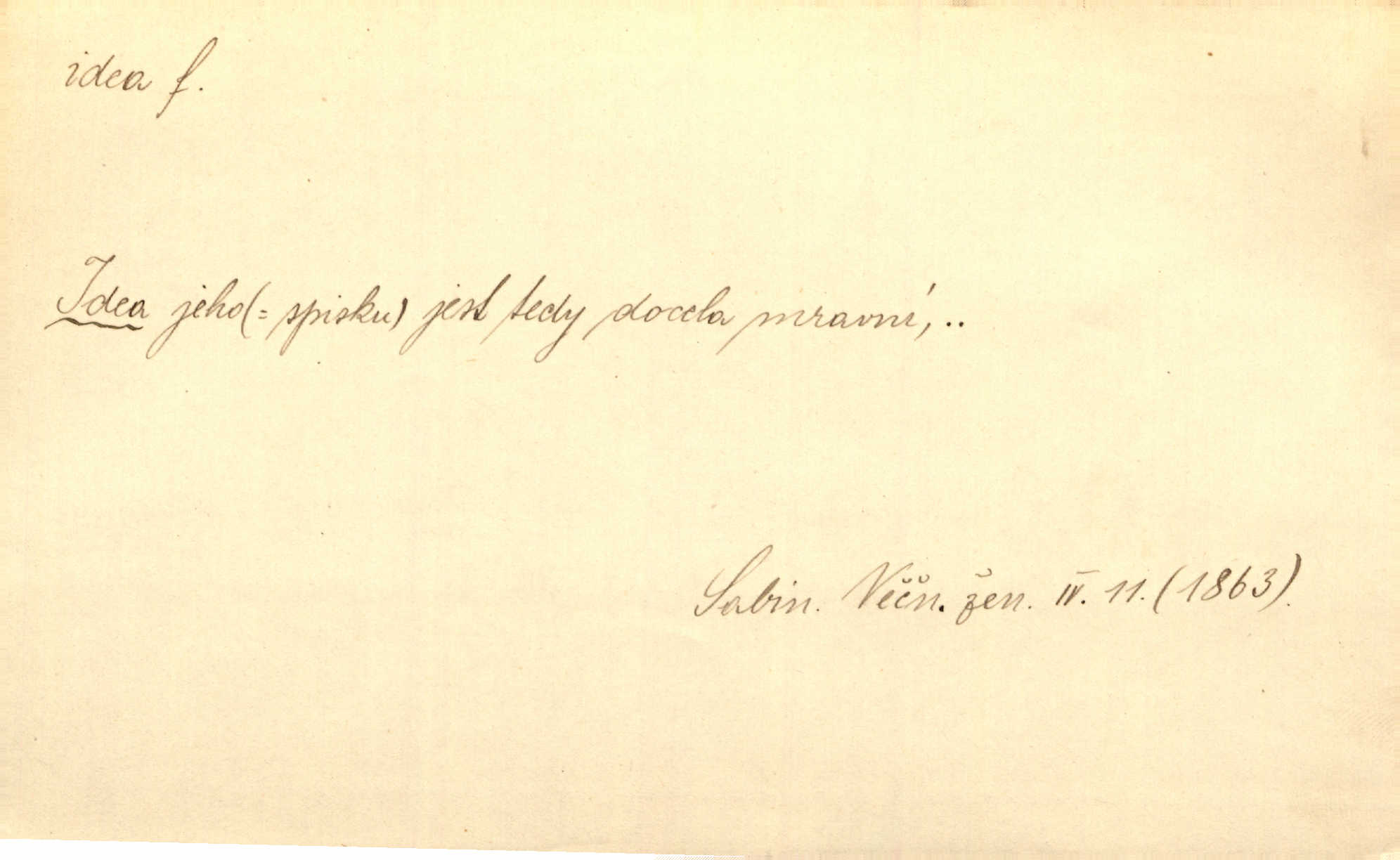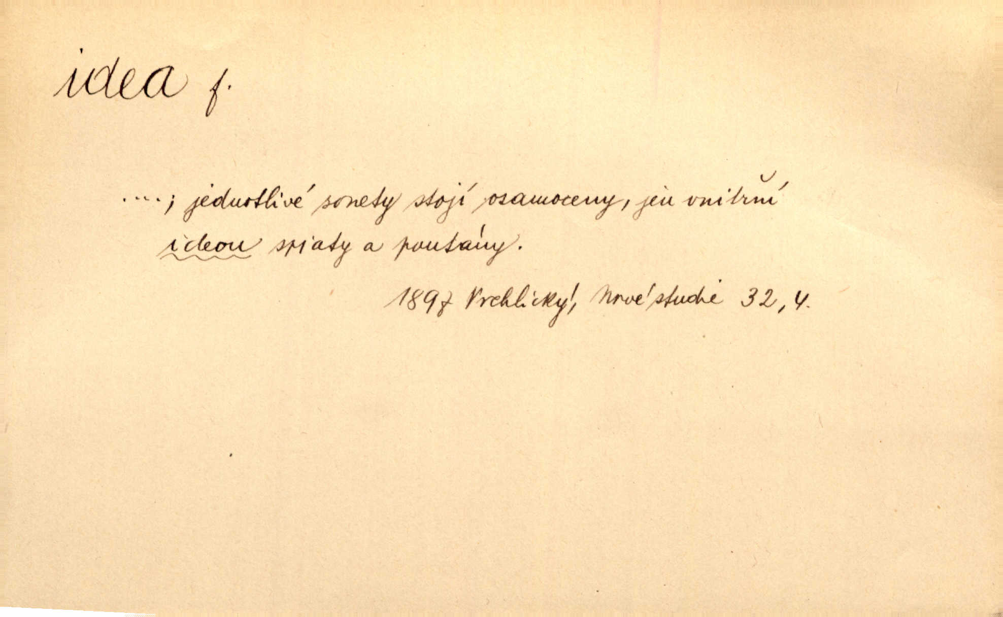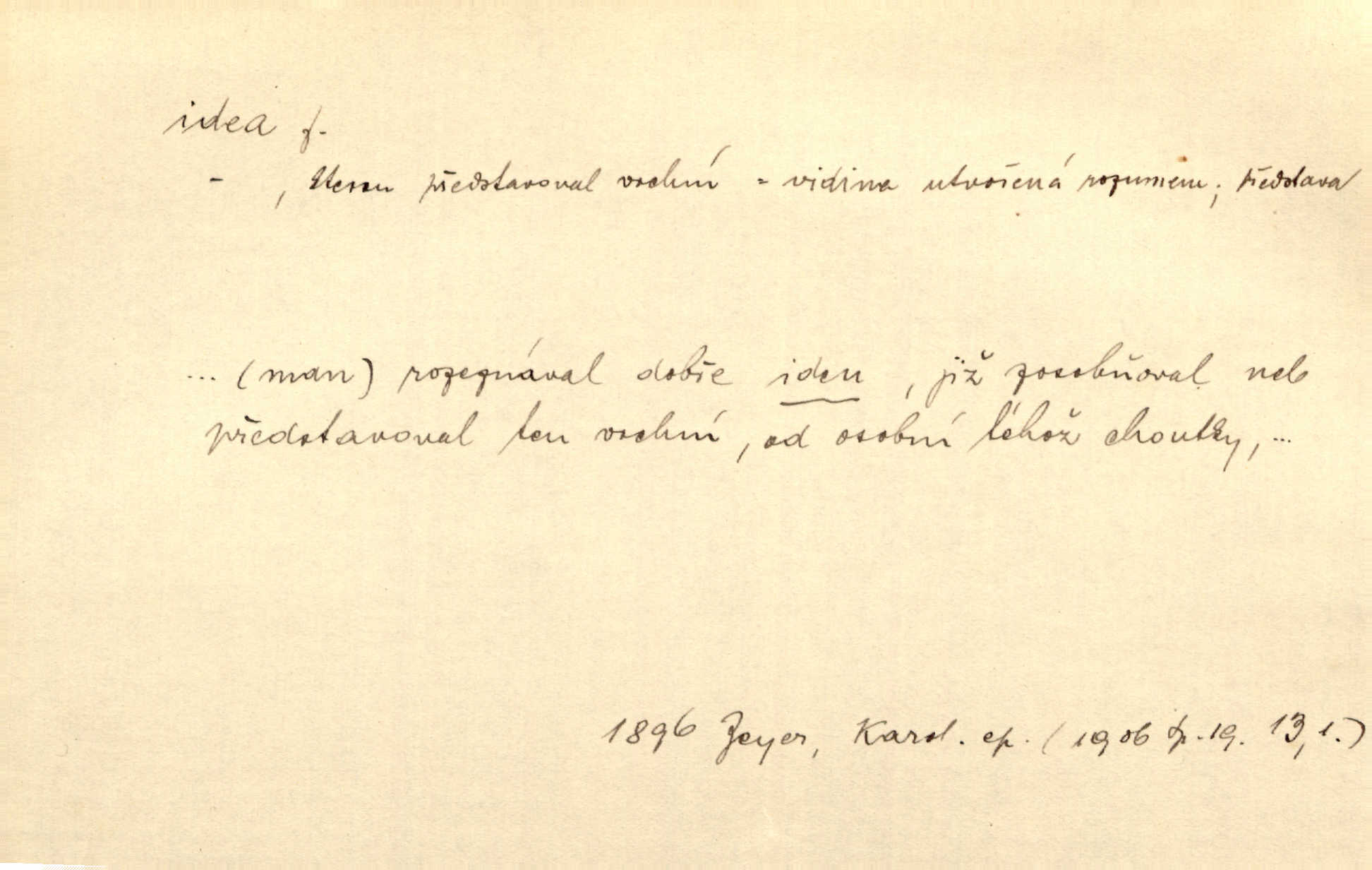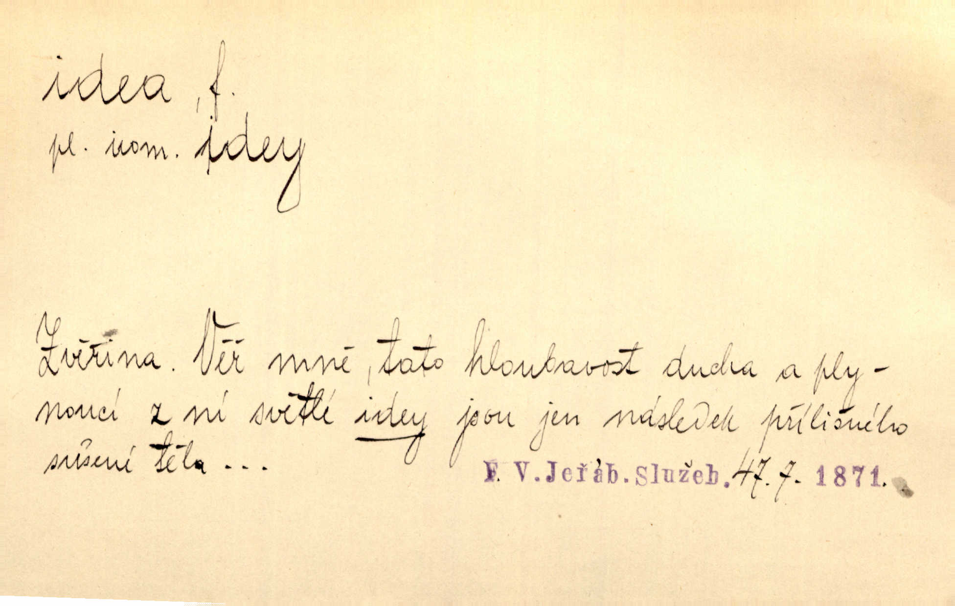 - idea, idey n. ideje f. (sg. dat. a lok. idei, ideji, ak. ideu, ideji, instr. ideou, idejí; pl. nom. ak. idey n. ideje, gen. ideí, idejí, dat. ideám, idejím atd.) základní, vůdčí myšlenka. Bít se za krásnou a dobrou ideu — neznám vábnějšího života. V. Mrš. Ideje francouzské revoluce měly u nás mnoho vyznavačův. Jir. Vondrejc býval vždycky jen theoretikem, hlasatelem ideí, ale když došlo k propagandě činu, selhal. Čap. Ch. Chiliasmus také na světlo vynesl mnohé idee politické i sociální. Goll. Juž tenkrát pučela v hlavě Jacintově idea jeho básně o Atlantidě. Vrch. D Filos. pojmová podstata poznaného předmětu v lidském duchu, nepodmíněný pojem. Idea pravdy, dobra, krásy. D myšlenka, nápad. Výborná idea, nemám právě co dělat, půjdu vyhledat dceru. Vrch. Byla to náhlá úzkost, že se nemoc vrátí, anebo že se ulomená klika stane mou fixní ideou utkvělou myšlenkou. Čap. Ch.
